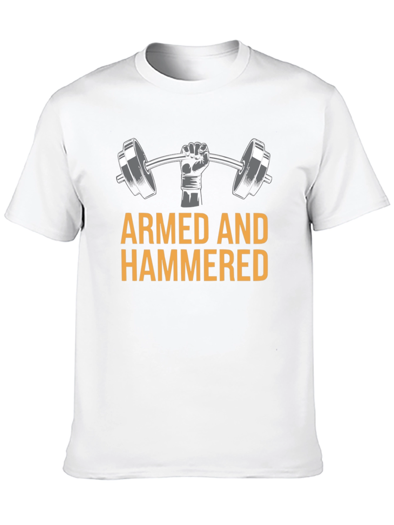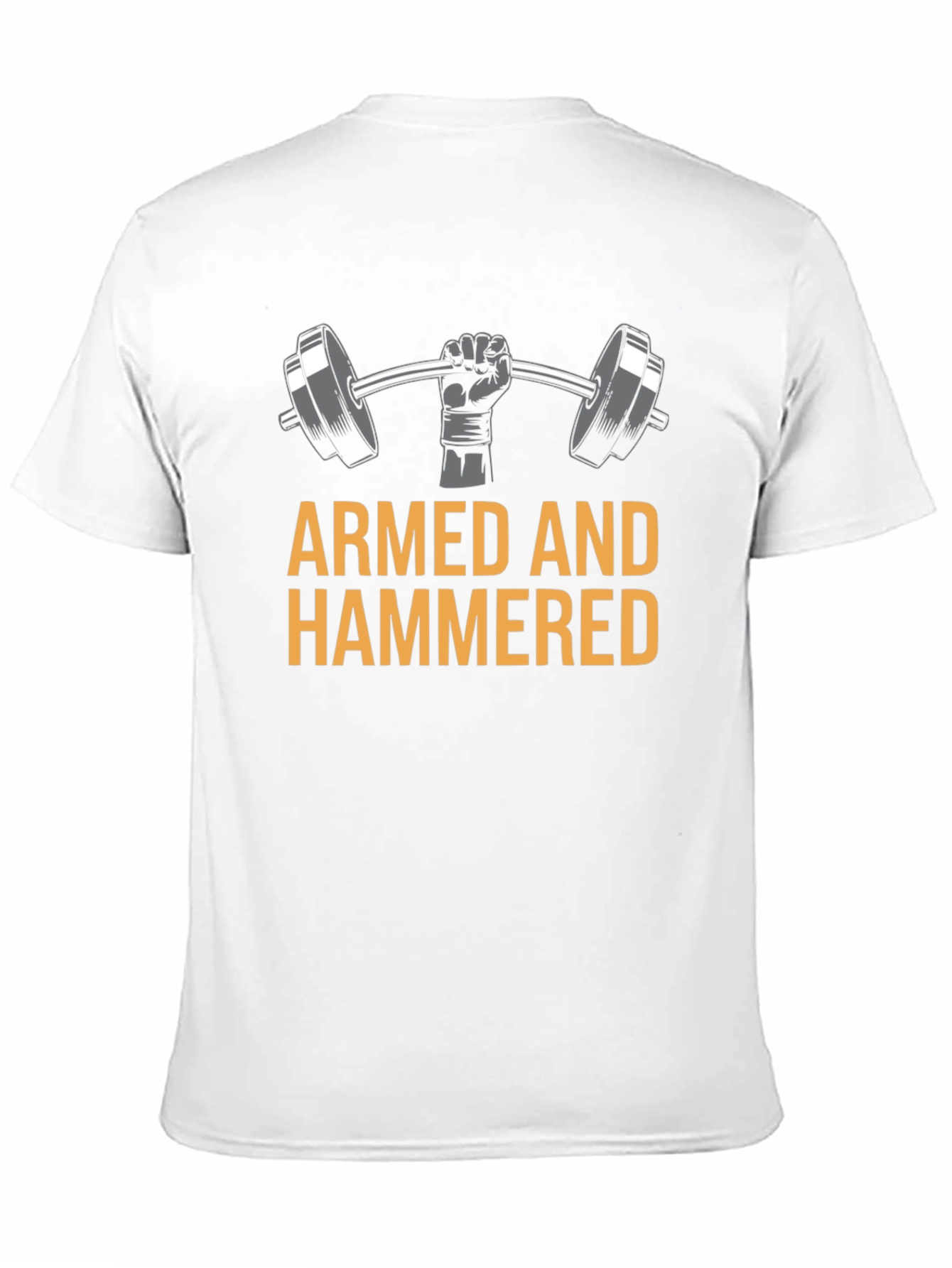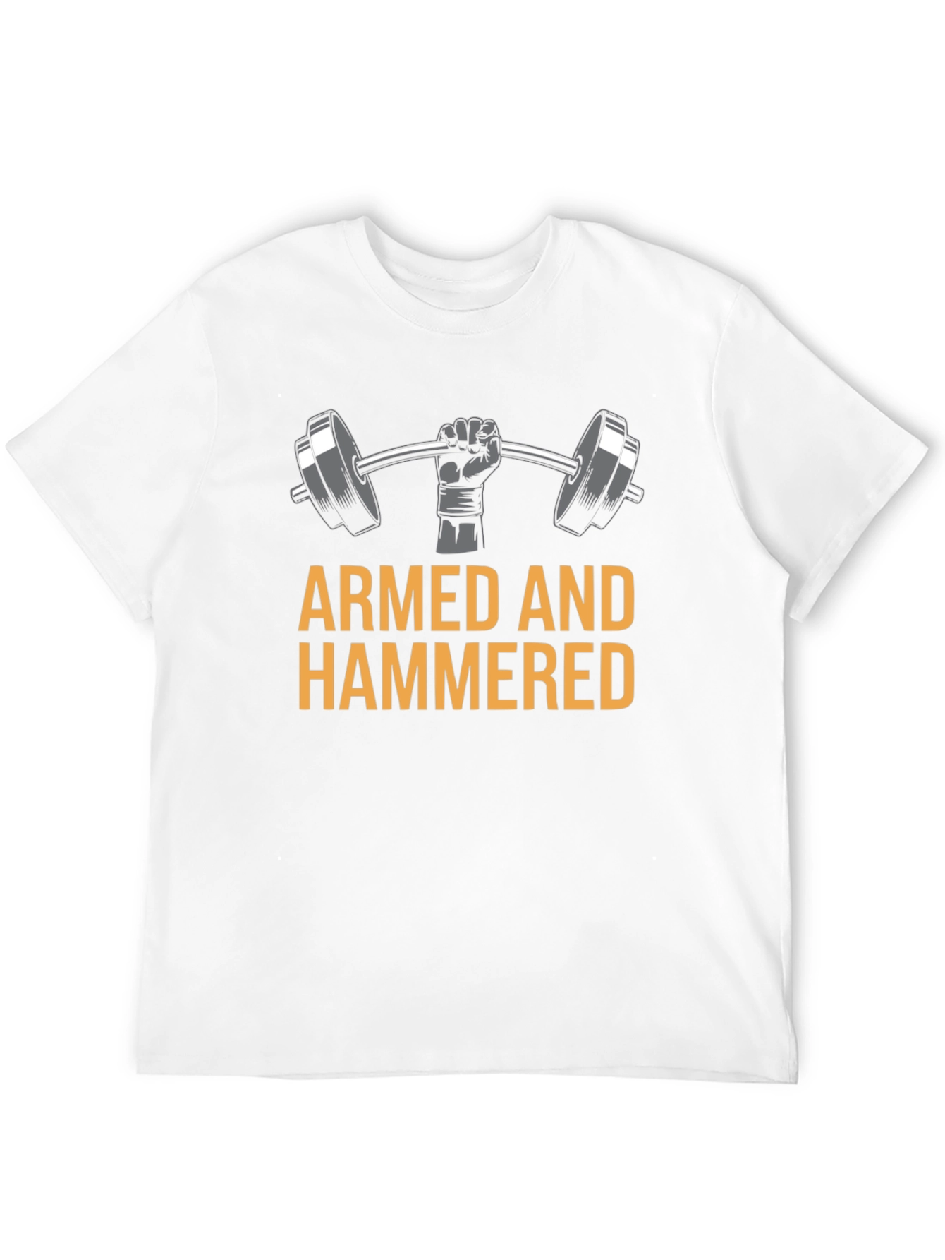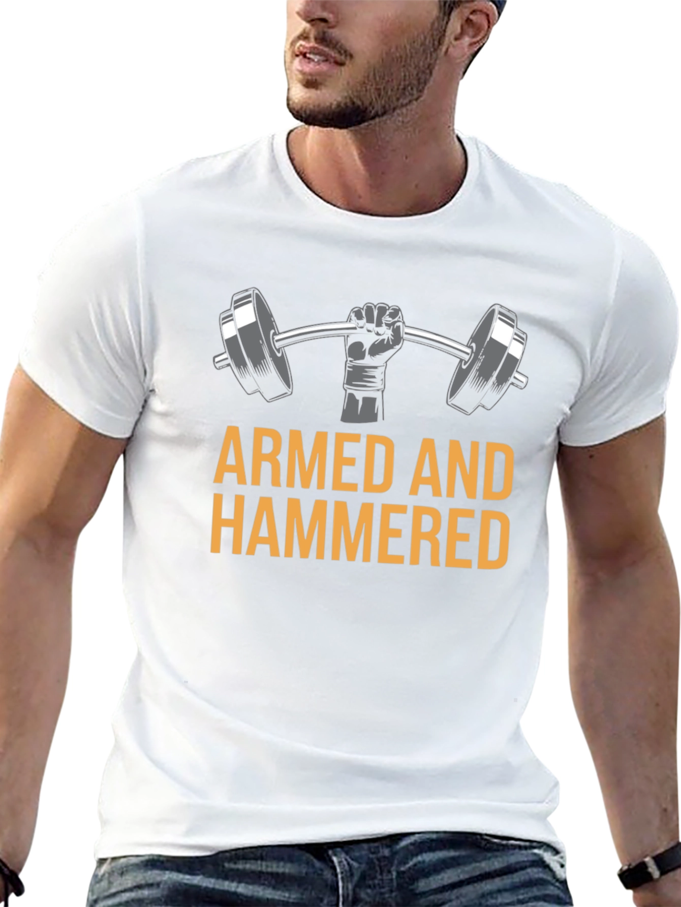 Muestra tu pasión por el gimnasio con esta camiseta negra de diseño único. Presenta un estampado llamativo de una mano sosteniendo una barra con pesas, acompañado del texto 'ARMED AND HAMMERED' en color dorado, ideal para motivarte en tus entrenamientos. Fabricada con materiales suaves y cómodos, esta camiseta es perfecta para sesiones intensas en el gimnasio o para un estilo casual. Su corte clásico y ajuste cómodo la hacen una prenda versátil para cualquier ocasión. Ideal para aquellos que aman levantar pesas y quieren lucir un estilo atlético y moderno.