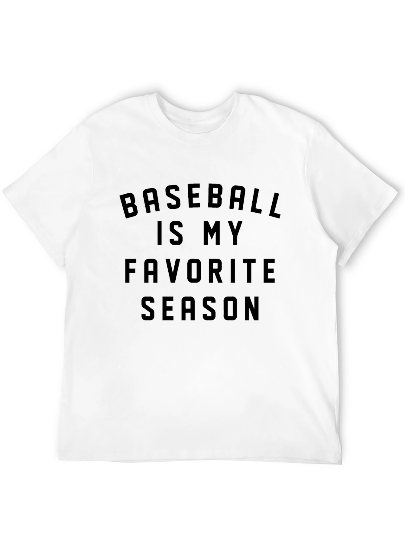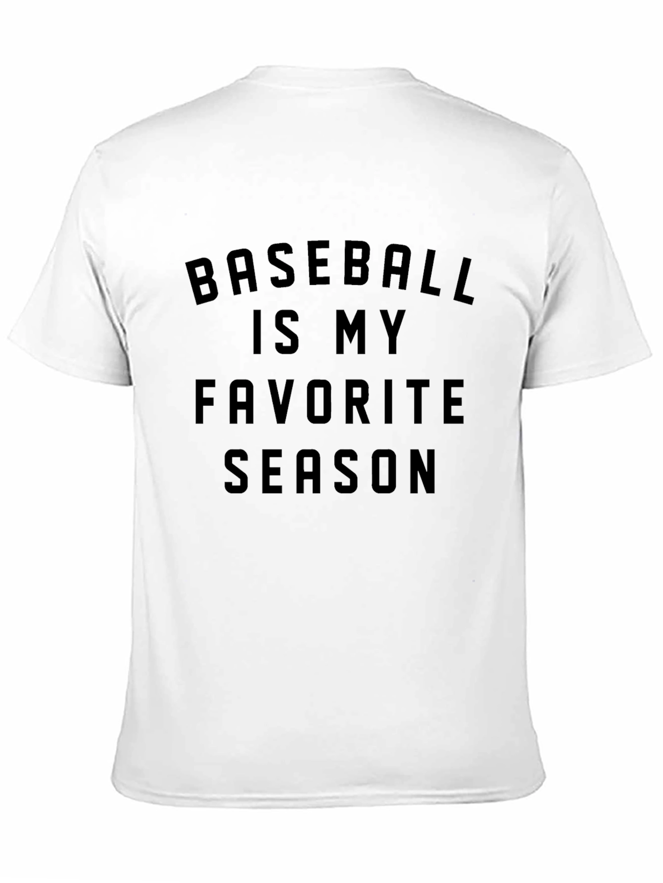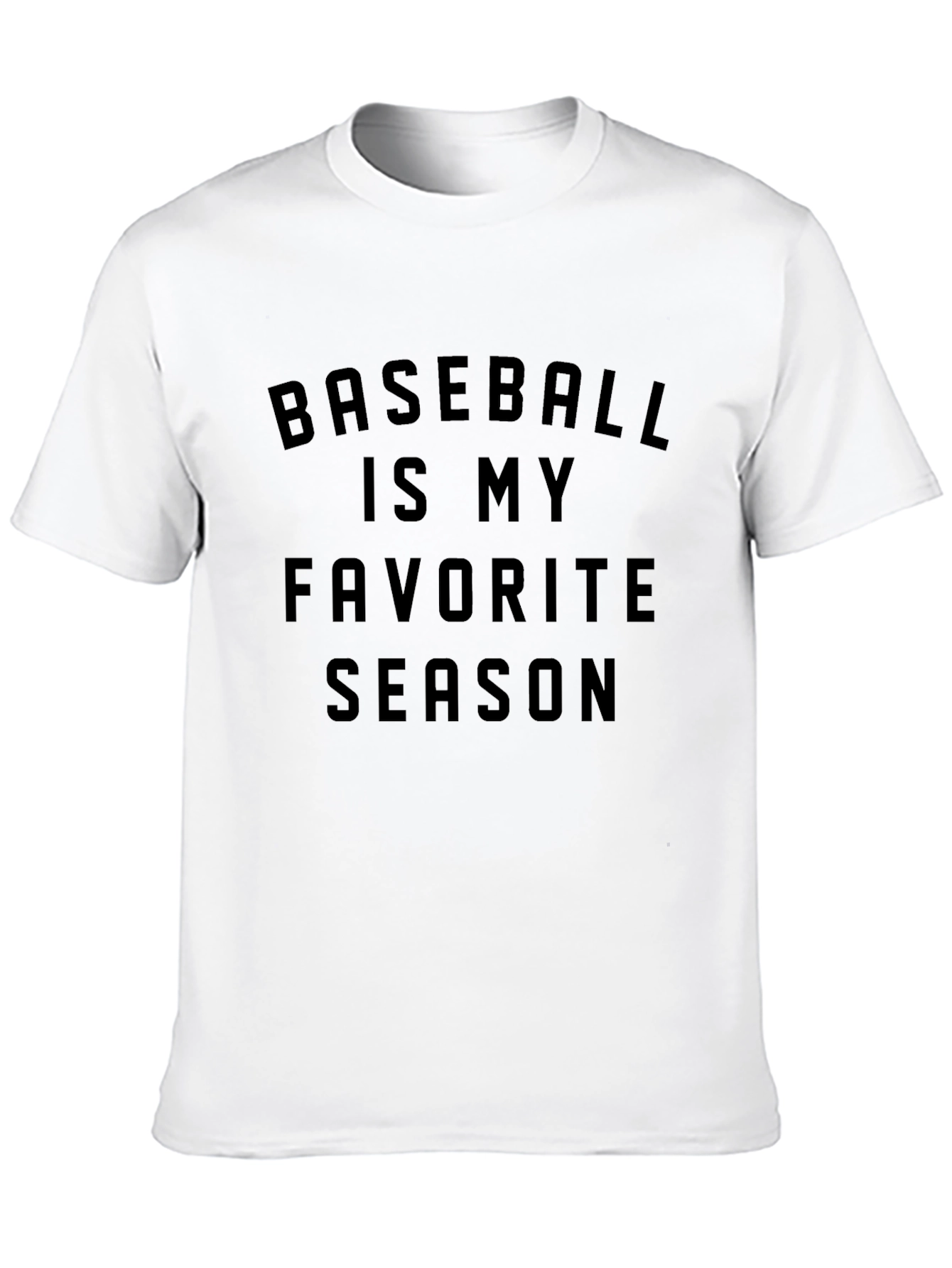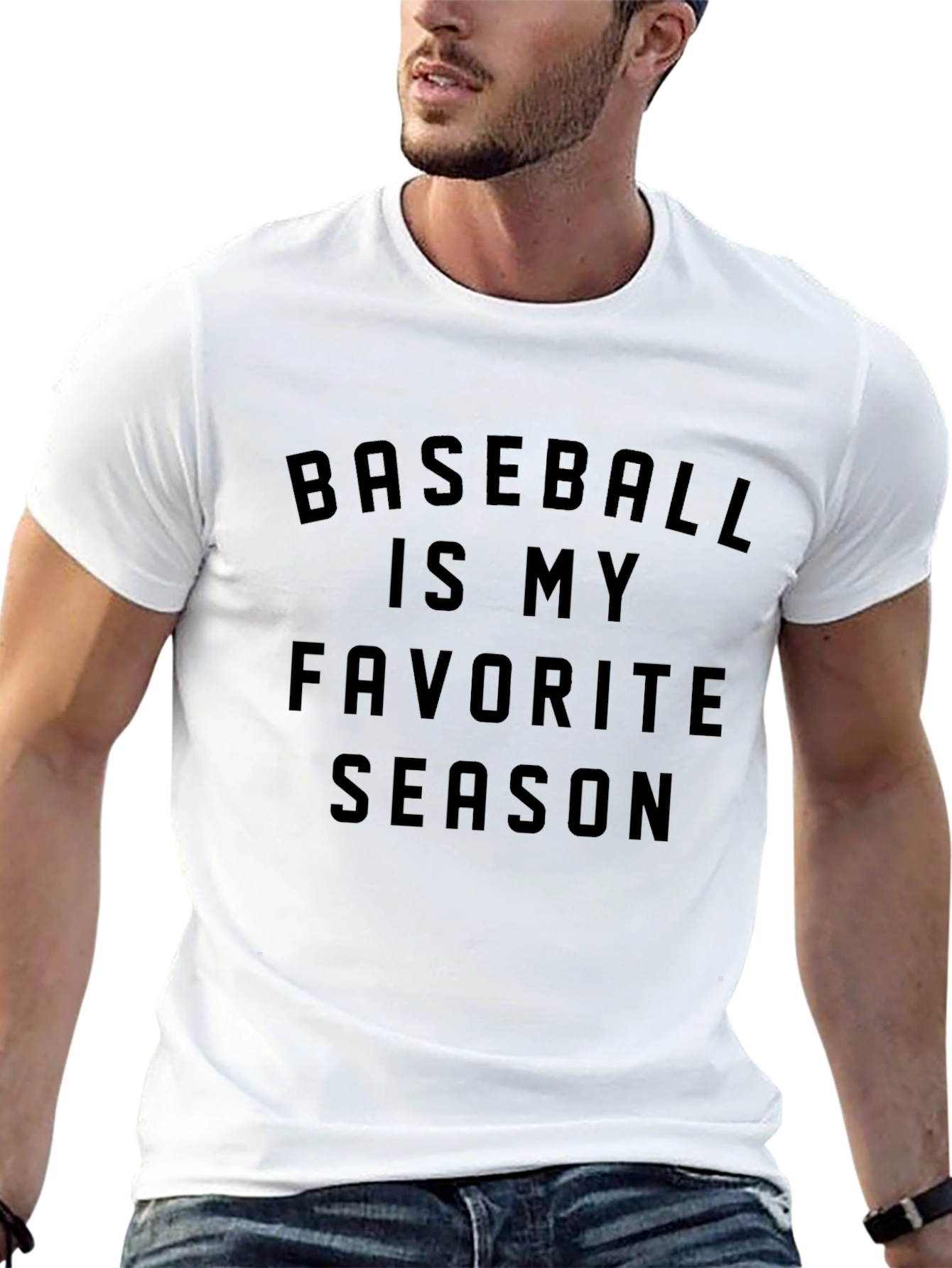 Luce tu pasión por el béisbol con esta camiseta negra de manga corta. Presenta un diseño llamativo con la frase "Baseball Is My Favorite Season" estampada en letras mayúsculas y robustas en la parte delantera, que declara tu amor por este deporte. Ideal para fanáticos del béisbol, esta camiseta es perfecta para usar en partidos, entrenamientos o simplemente para mostrar tu apoyo al equipo. Con un estilo casual y moderno, esta camiseta de color sólido combina fácilmente con jeans, pantalones cortos o cualquier atuendo informal. Fabricada con materiales suaves y cómodos, esta camiseta te mantendrá fresco y relajado durante todo el día. ¡Demuestra tu afición por el béisbol con esta camiseta imprescindible!