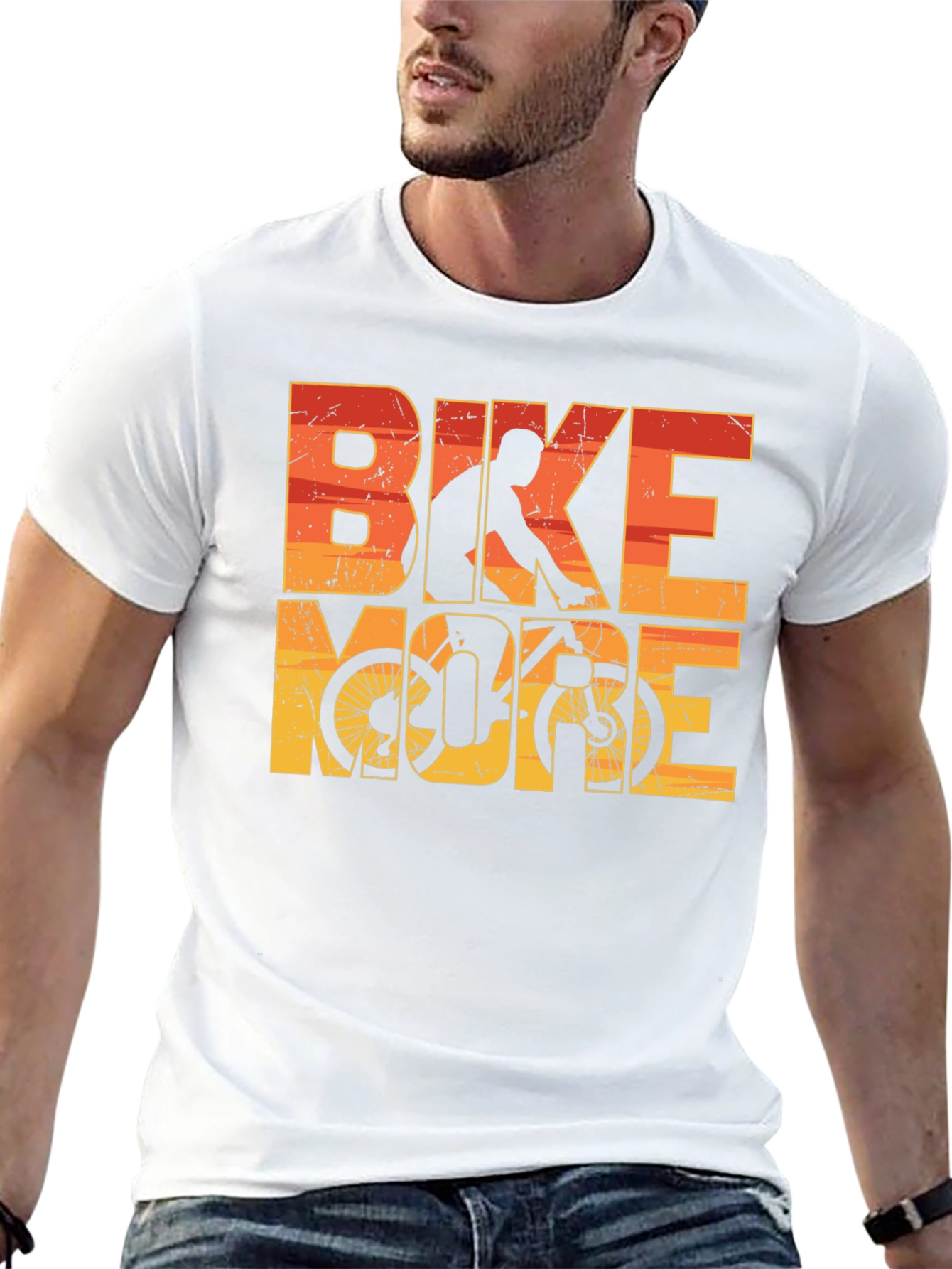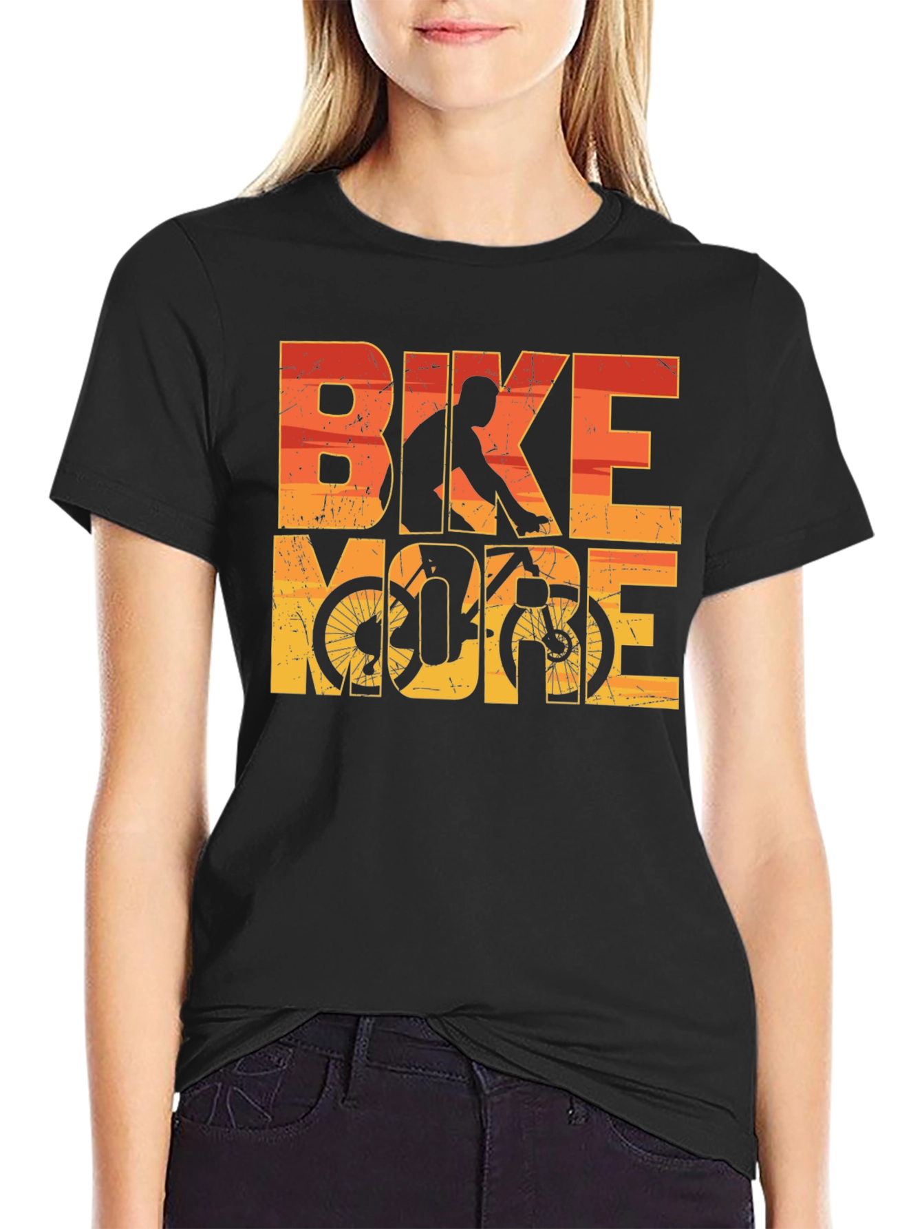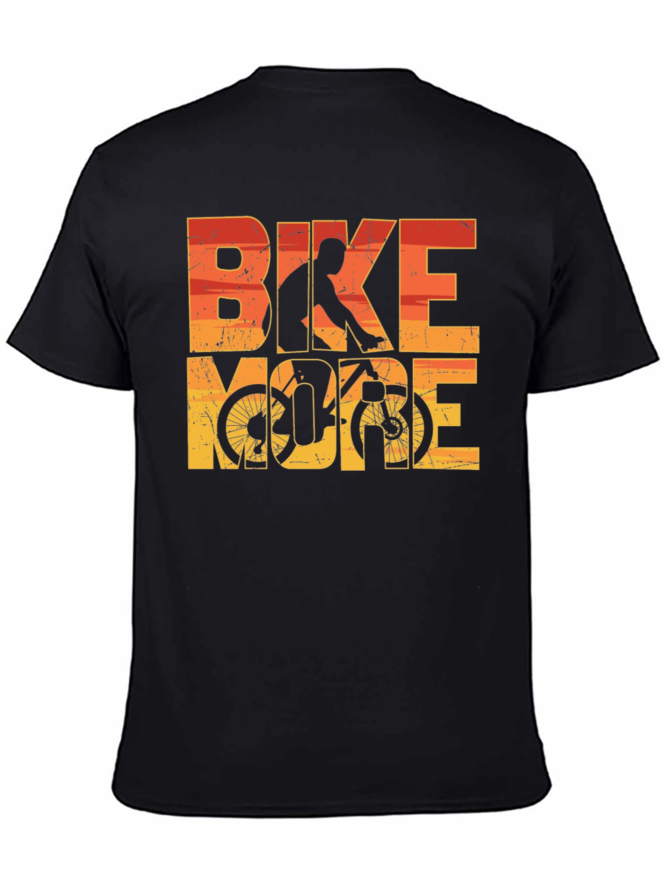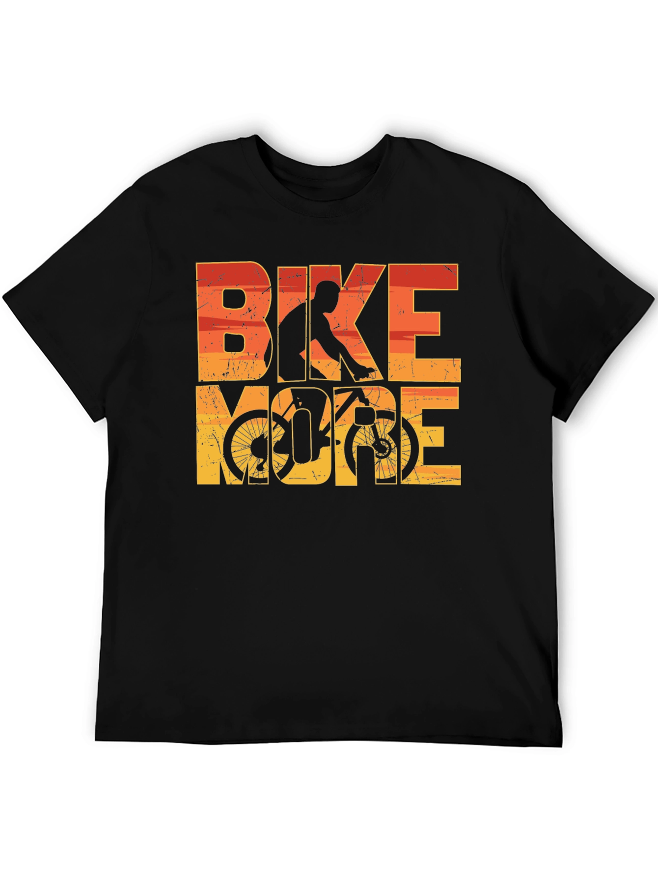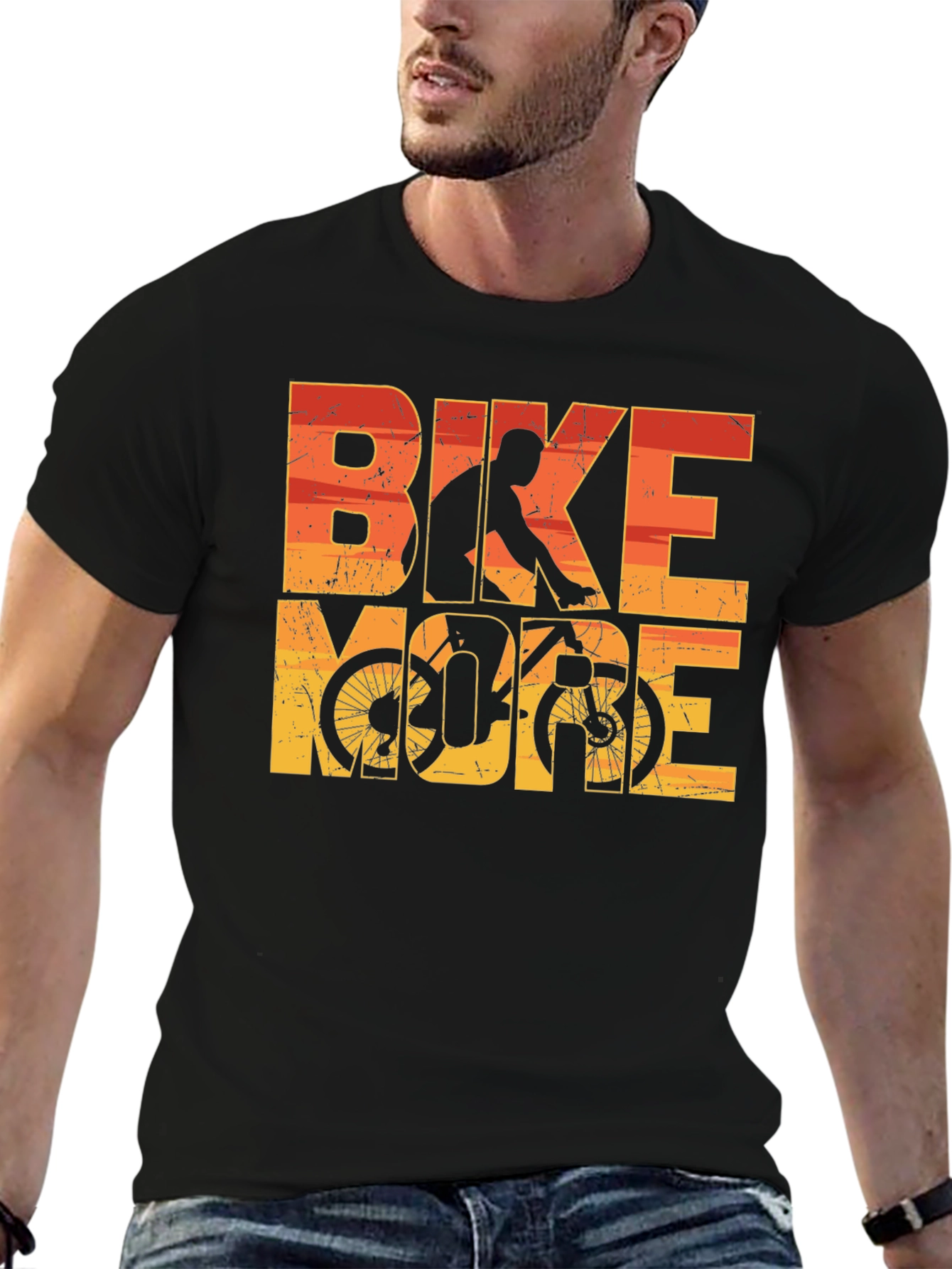 Esta camiseta negra de manga corta presenta un diseño llamativo y moderno, ideal para los amantes del ciclismo. La inscripción "Bike More" en letras grandes, con degradado de color desde naranja a amarillo, y la silueta de un ciclista y su bicicleta integrados en el texto, le dan un toque original y deportivo. Fabricada en un tejido suave y cómodo, parece ser de algodón o una mezcla similar. Perfecta para usar en salidas informales, entrenamientos o simplemente para mostrar tu pasión por las bicicletas. Combina fácilmente con jeans, pantalones cortos o ropa deportiva.