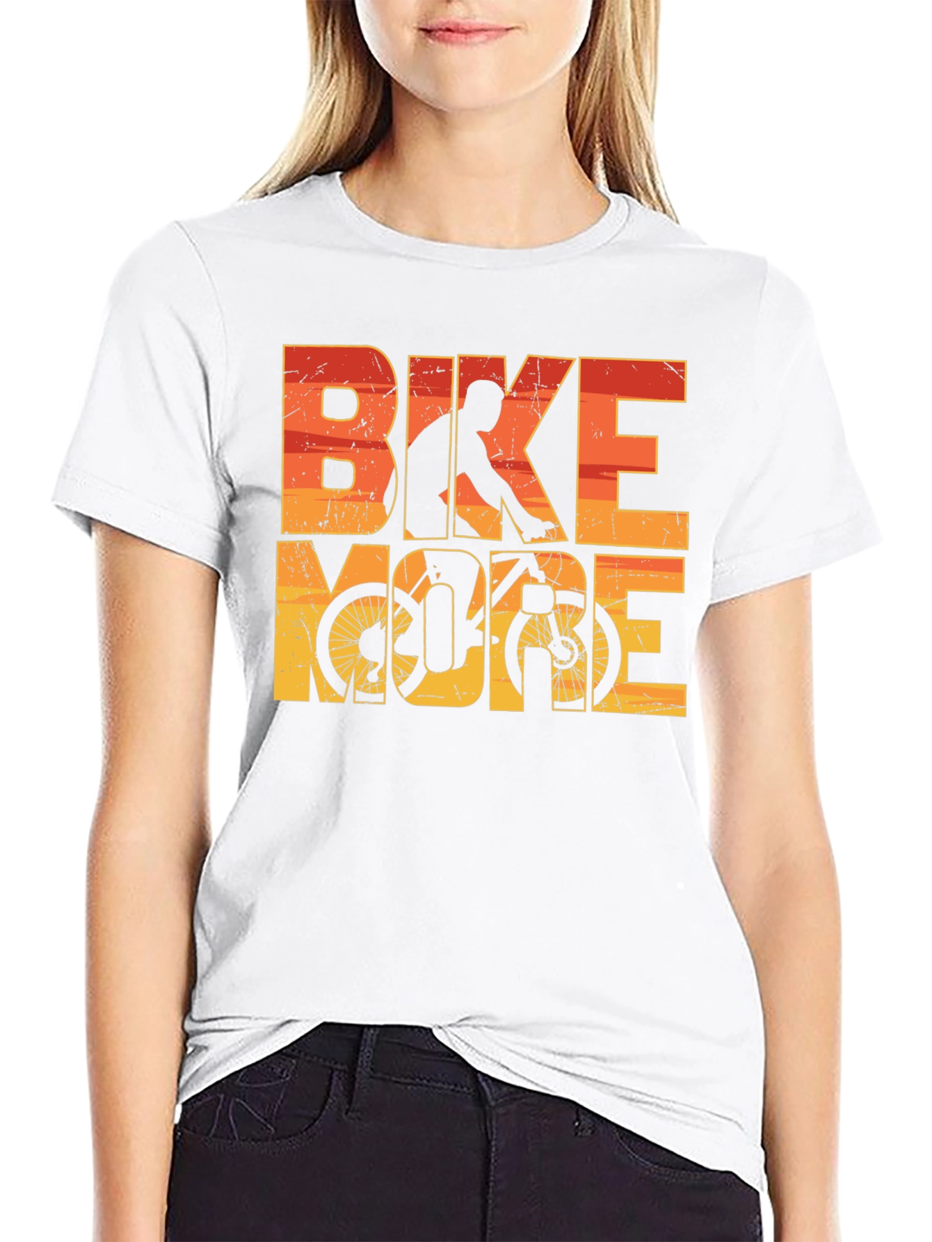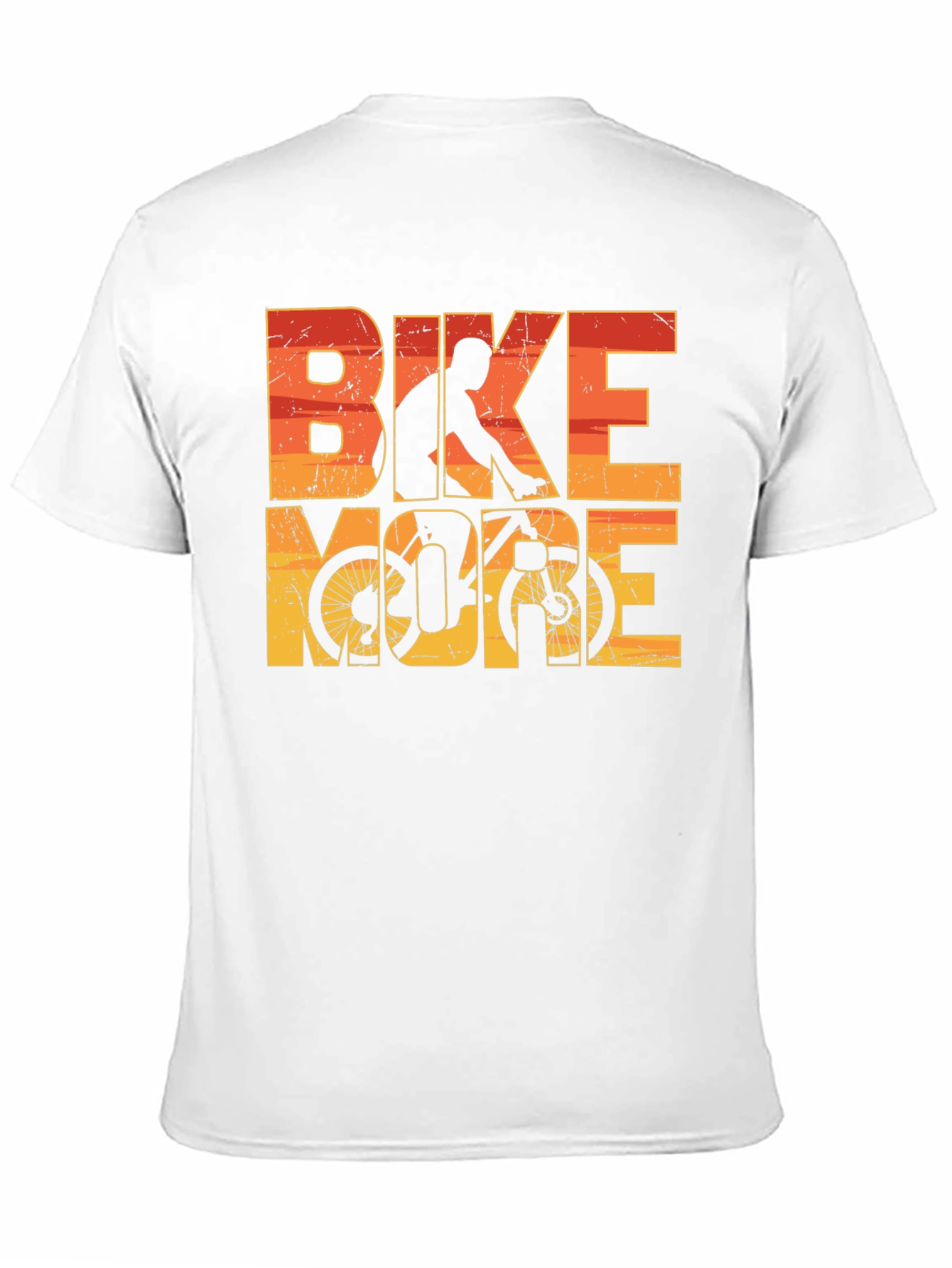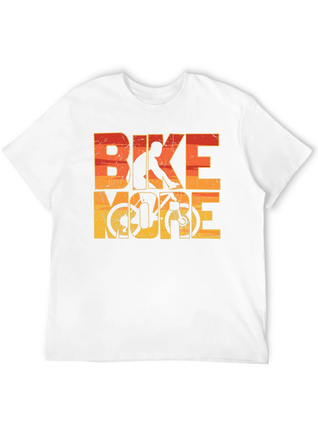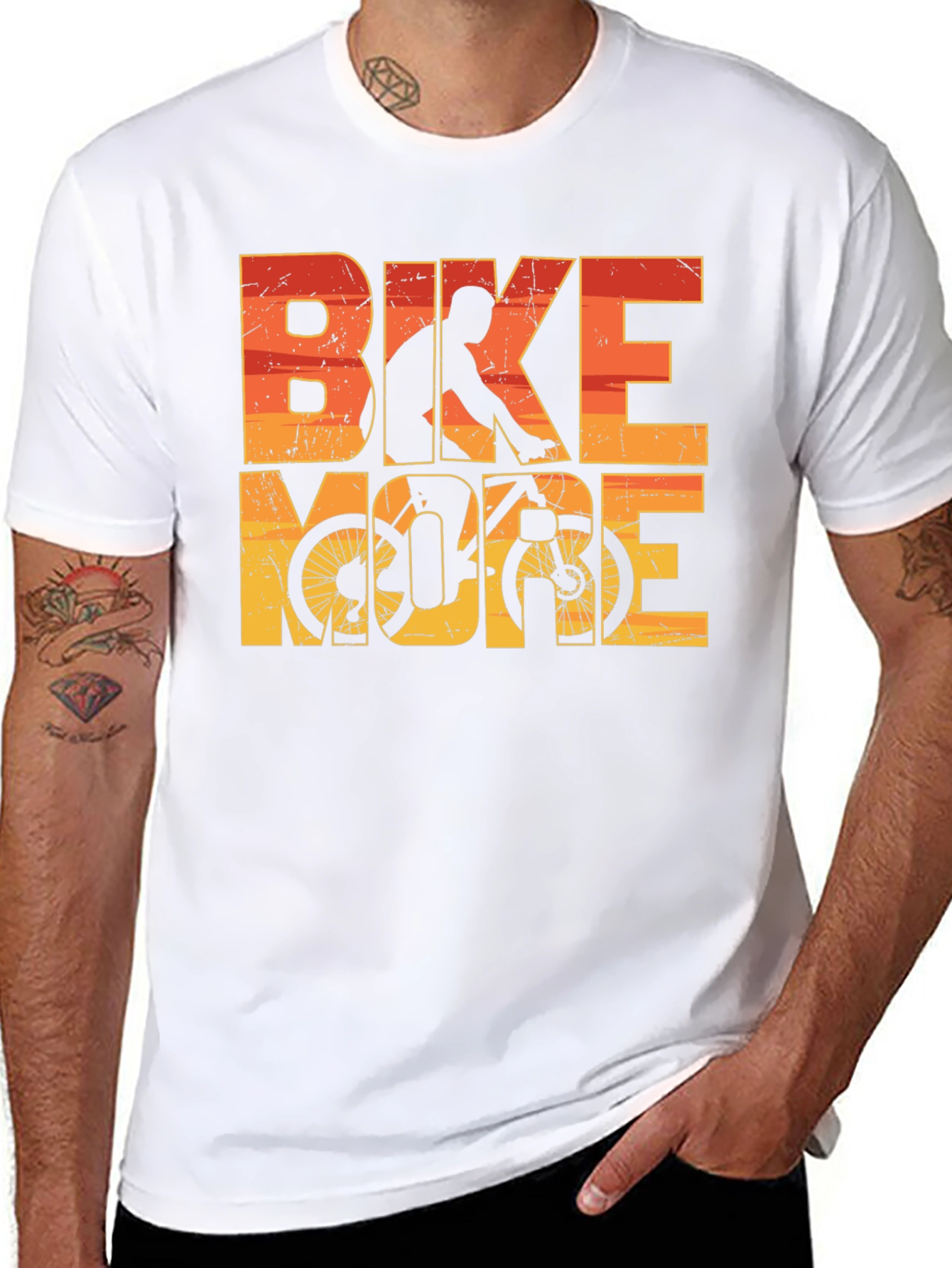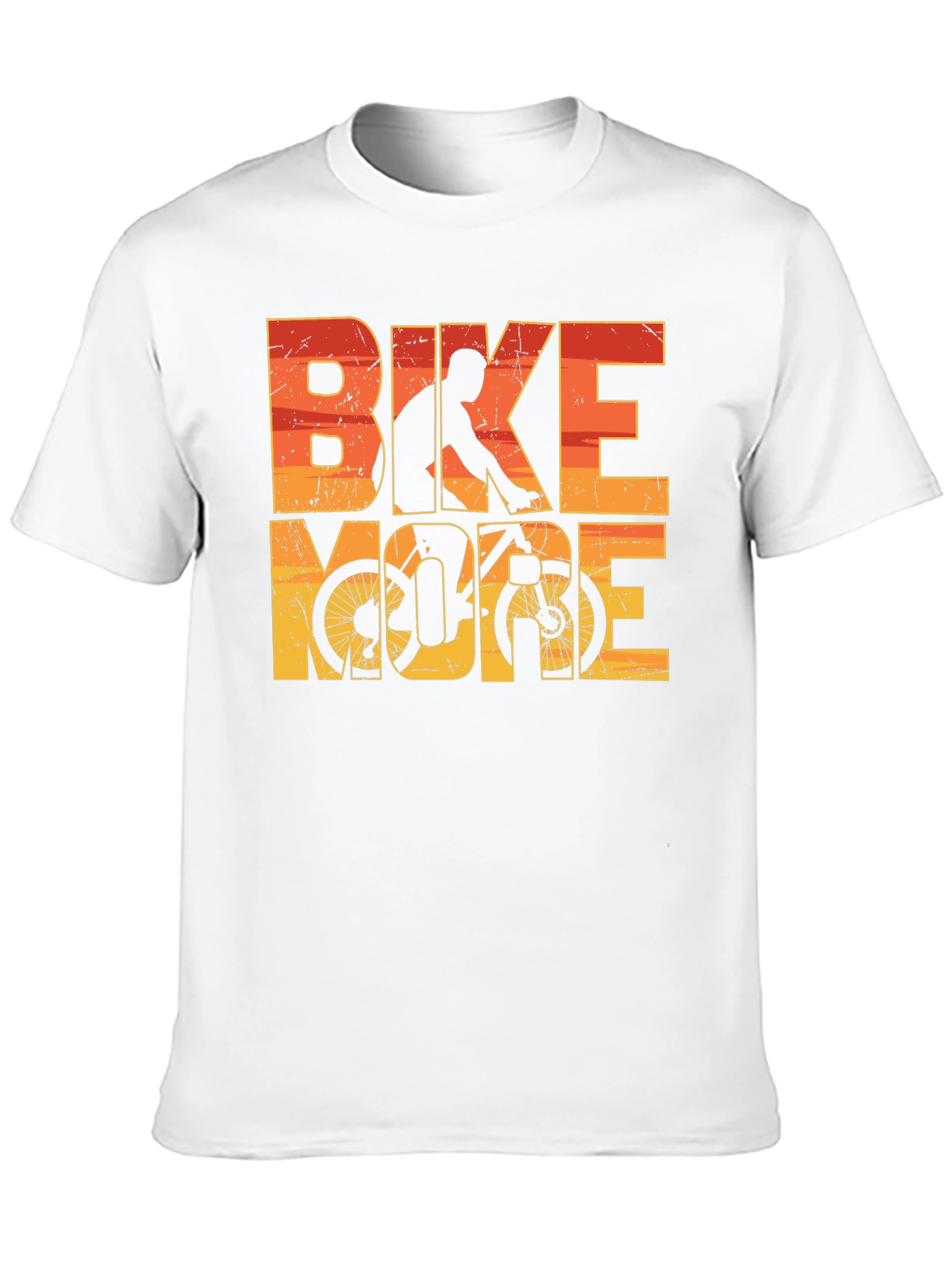 Esta camiseta negra de manga corta presenta un diseño llamativo y moderno, ideal para los amantes del ciclismo. La inscripción "Bike More" en letras grandes, con degradado de color desde naranja a amarillo, y la silueta de un ciclista y su bicicleta integrados en el texto, le dan un toque original y deportivo. Fabricada en un tejido suave y cómodo, parece ser de algodón o una mezcla similar. Perfecta para usar en salidas informales, entrenamientos o simplemente para mostrar tu pasión por las bicicletas. Combina fácilmente con jeans, pantalones cortos o ropa deportiva.