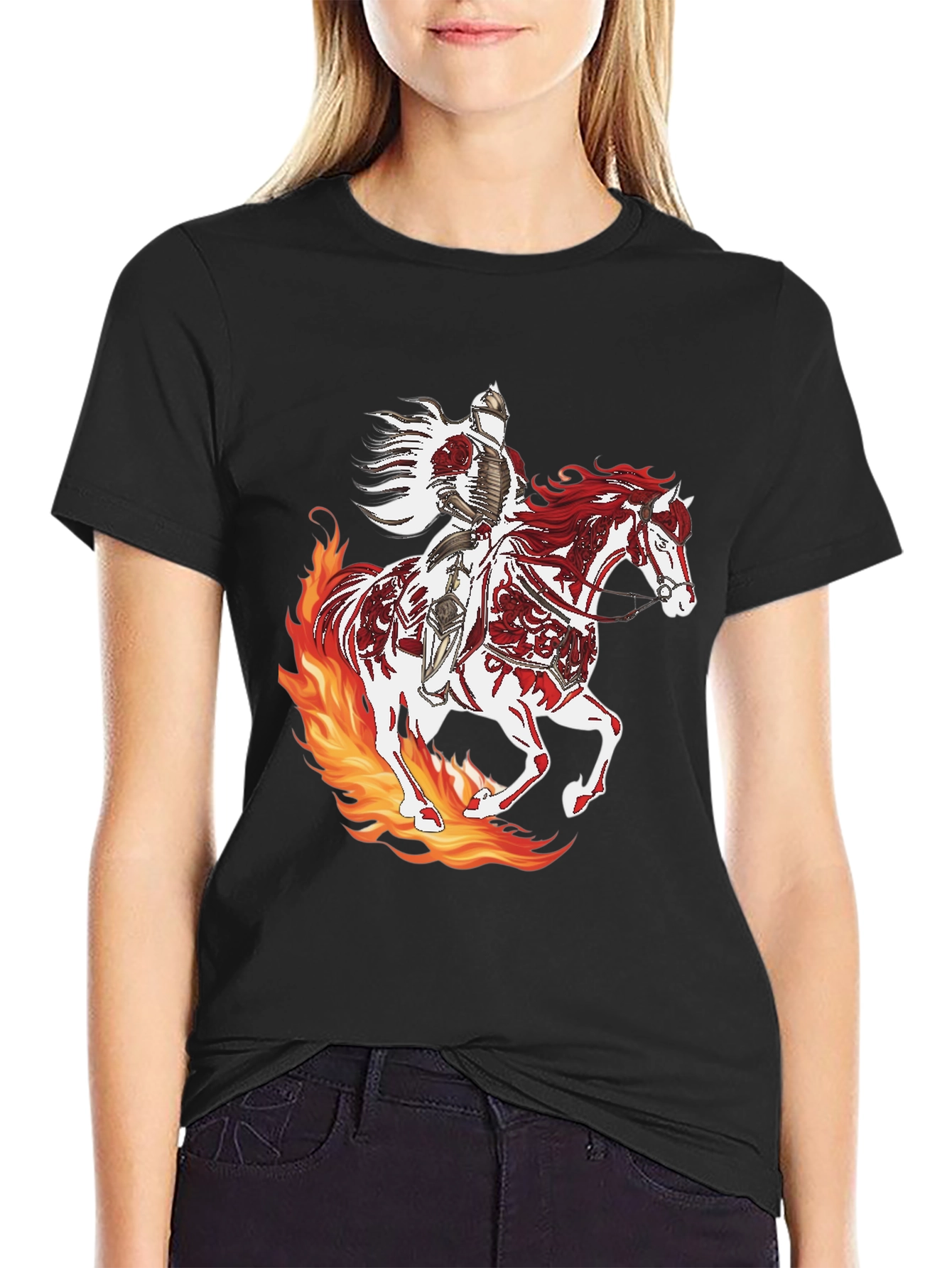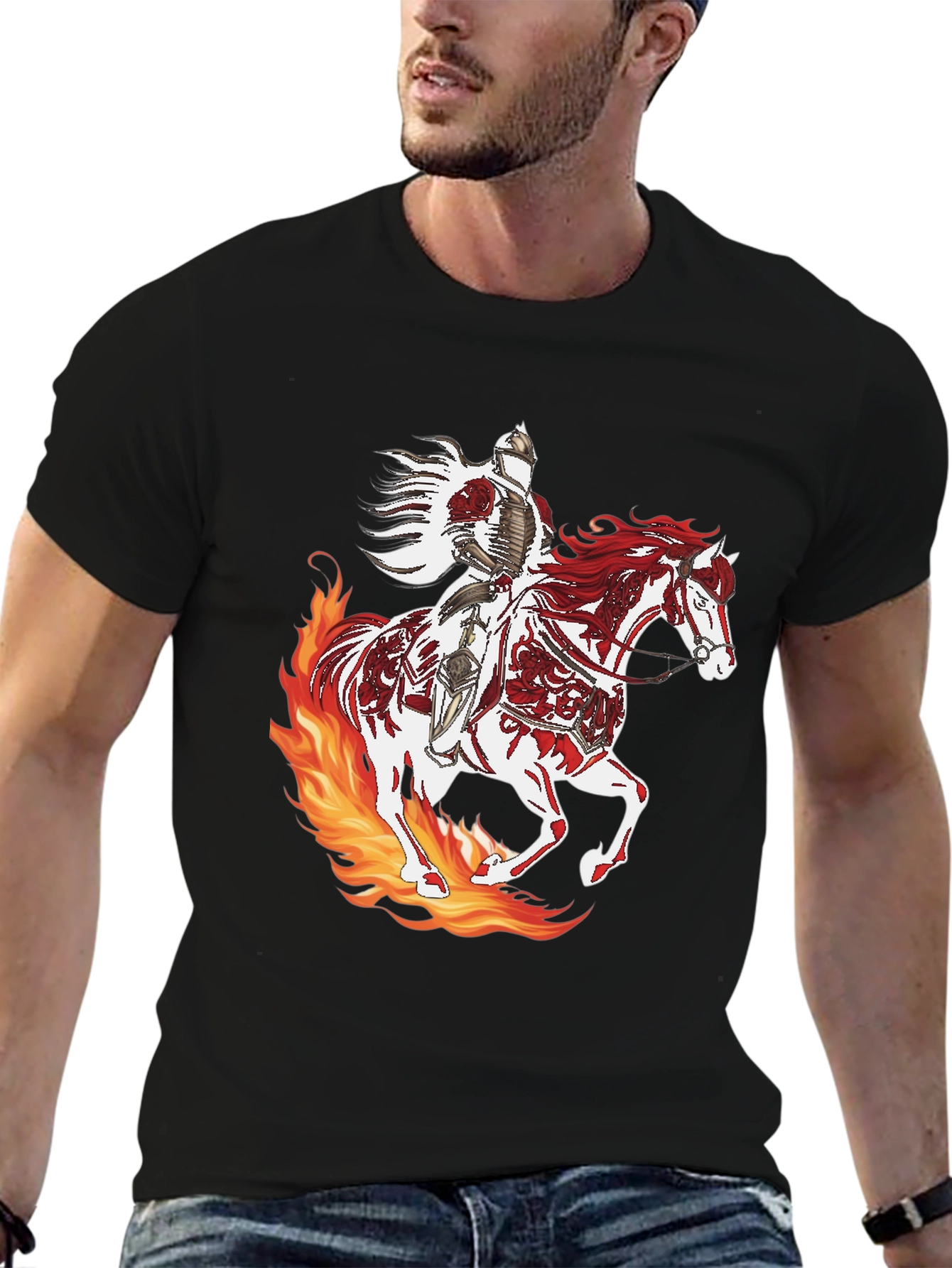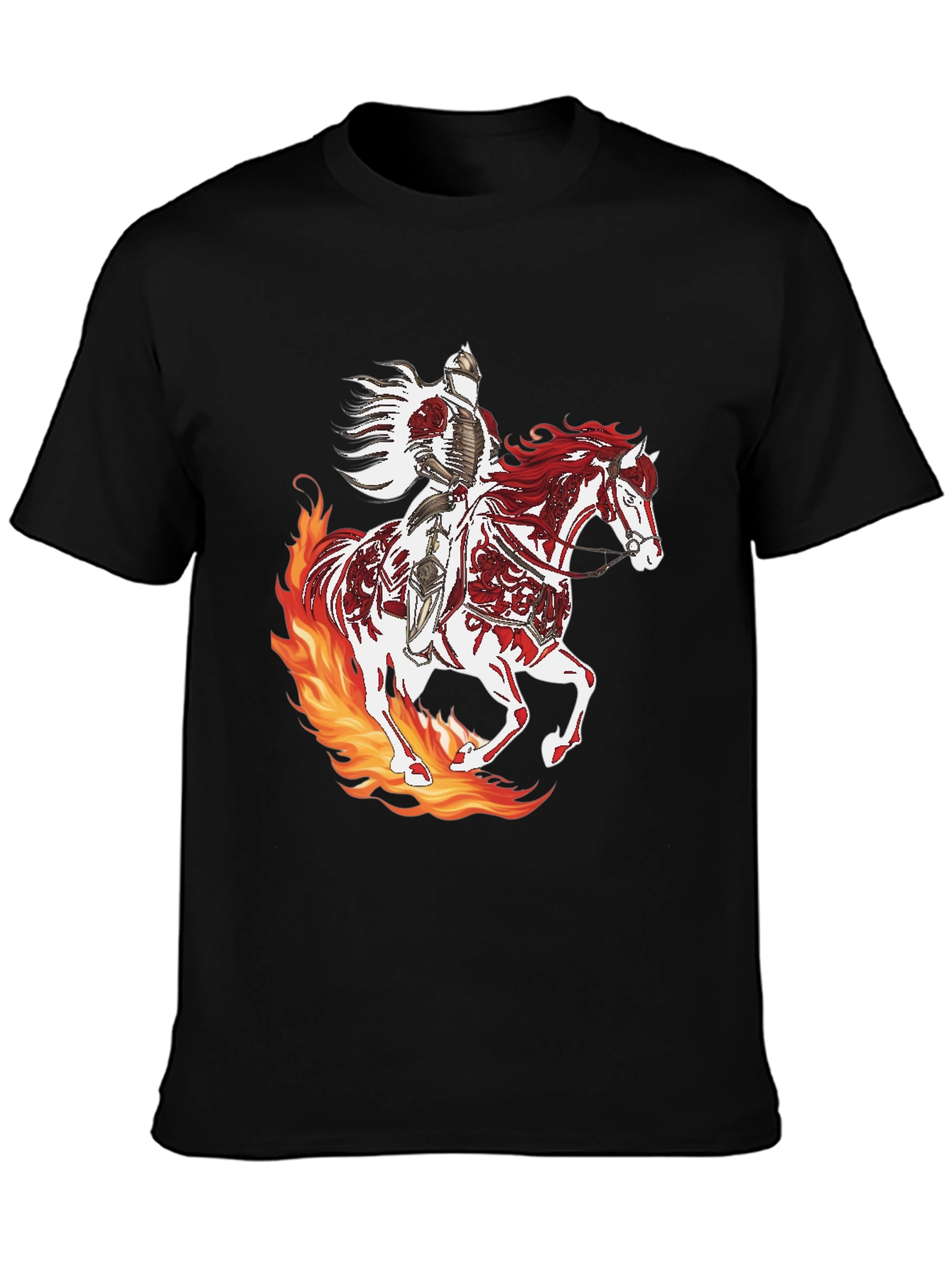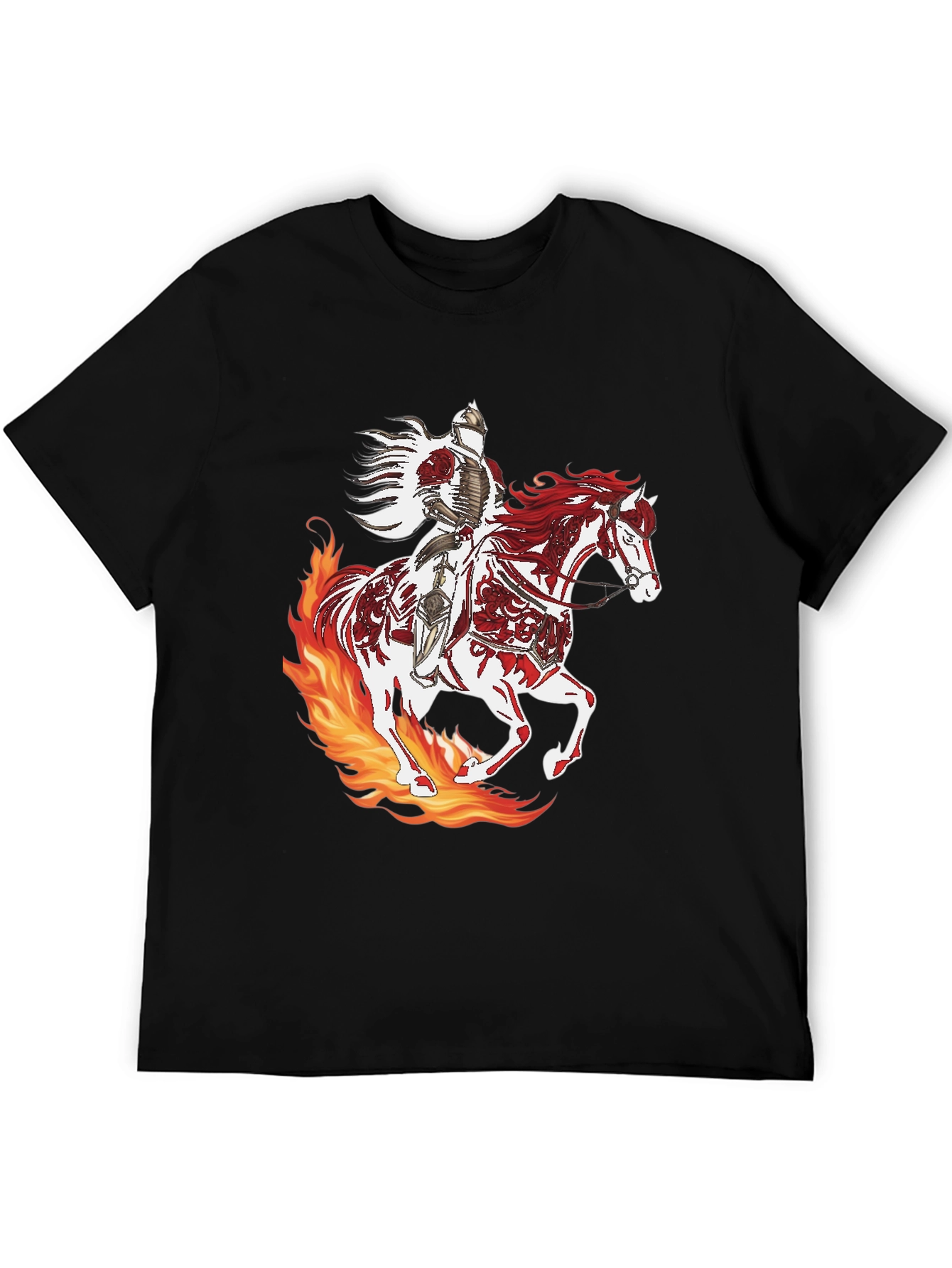 Destaca con esta camiseta negra de manga corta con un diseño impactante. Presenta un caballero medieval montado en un caballo blanco con detalles florales rojos, ambos envueltos en llamas naranjas y amarillas. Ideal para los amantes de la fantasía y la historia. El tejido parece ser de algodón, ofreciendo comodidad y transpirabilidad. Perfecta para uso diario, eventos casuales o para expresar tu estilo único. Un diseño llamativo que seguro atraerá miradas. ¡Añade un toque de originalidad a tu guardarropa con esta prenda única!
