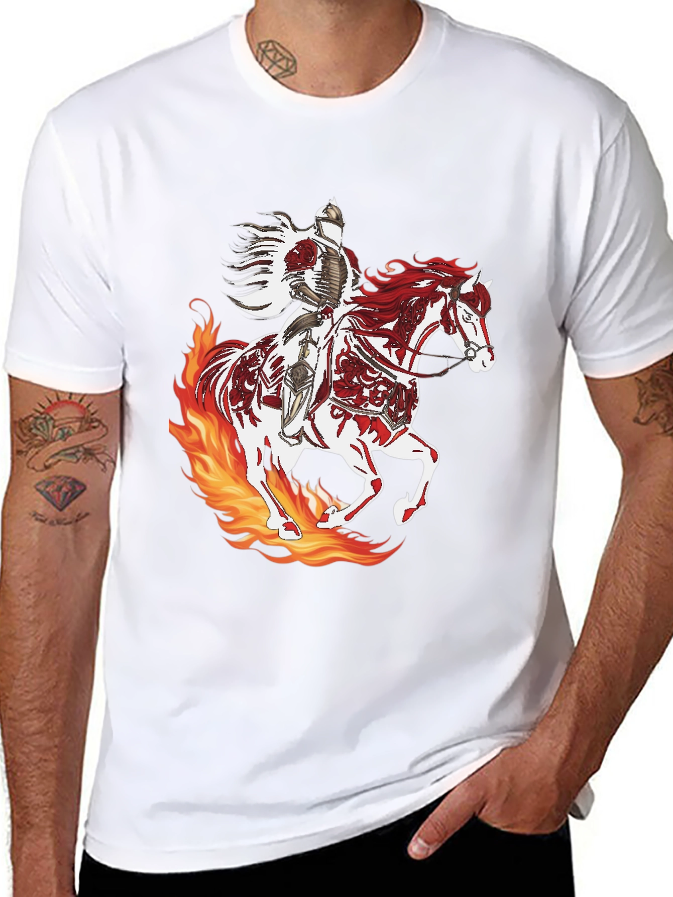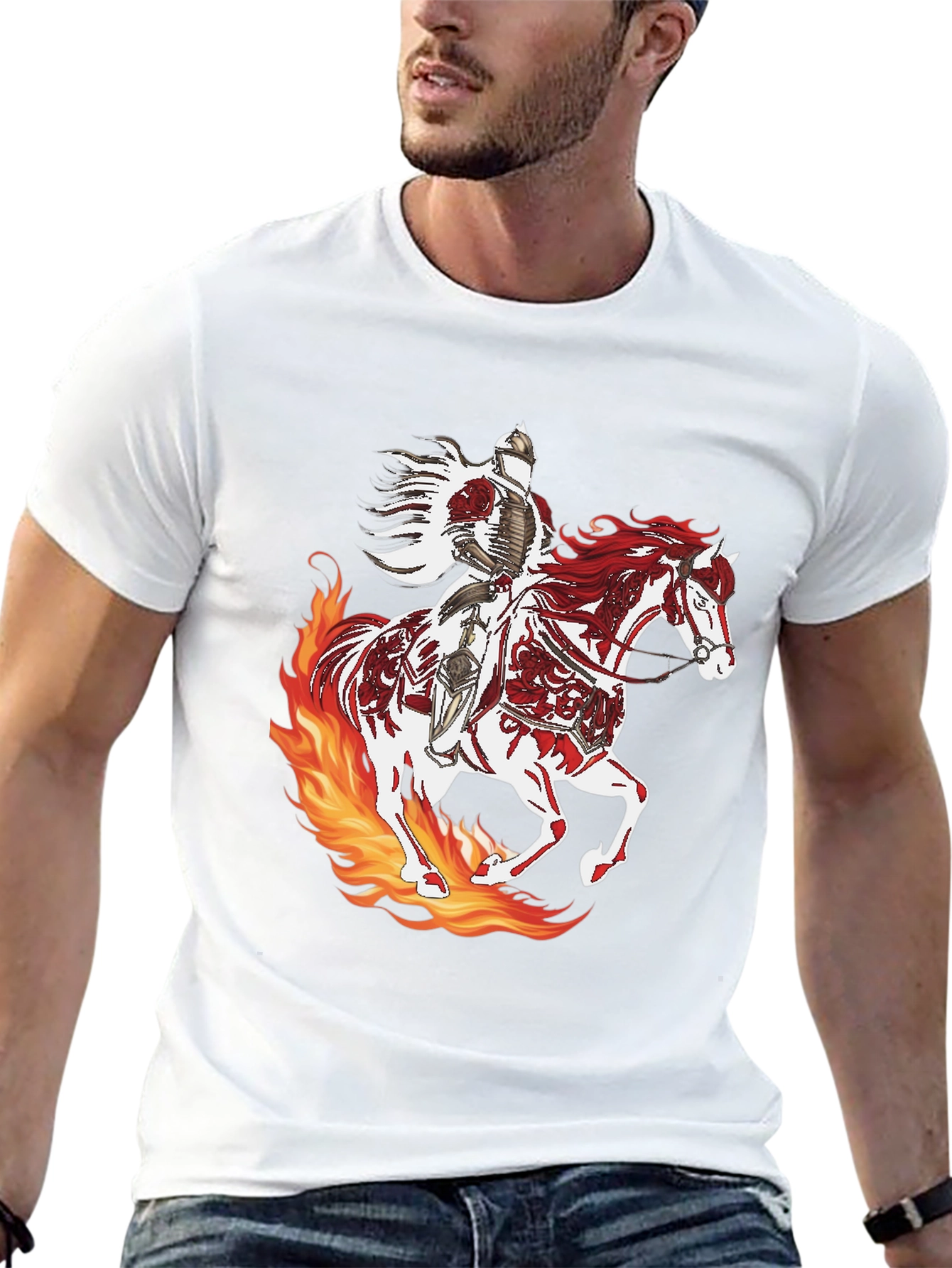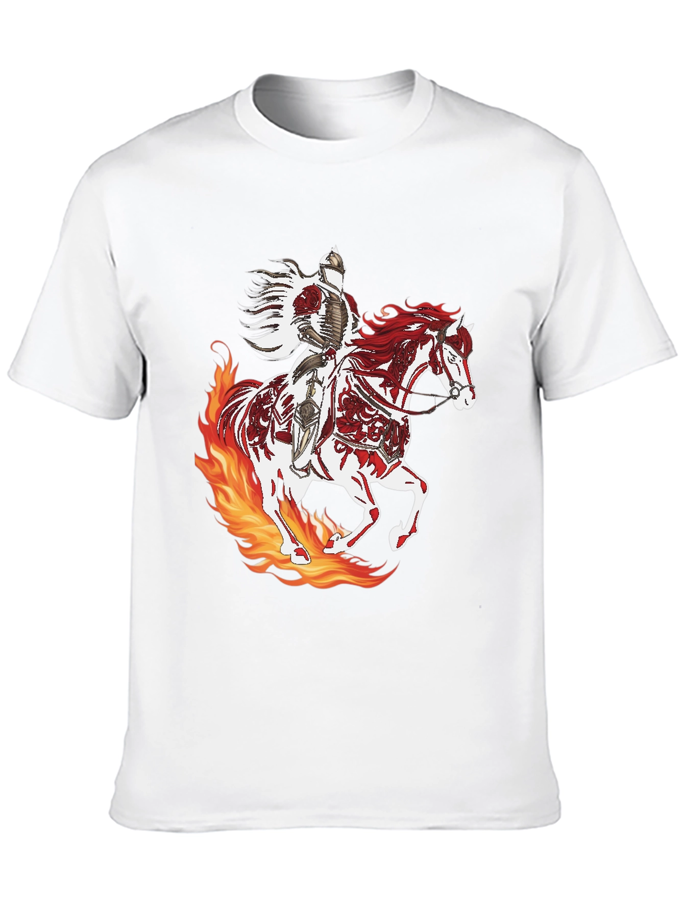 Destaca con esta camiseta negra de manga corta con un diseño impactante. Presenta un caballero medieval montado en un caballo blanco con detalles florales rojos, ambos envueltos en llamas naranjas y amarillas. Ideal para los amantes de la fantasía y la historia. El tejido parece ser de algodón, ofreciendo comodidad y transpirabilidad. Perfecta para uso diario, eventos casuales o para expresar tu estilo único. Un diseño llamativo que seguro atraerá miradas. ¡Añade un toque de originalidad a tu guardarropa con esta prenda única!