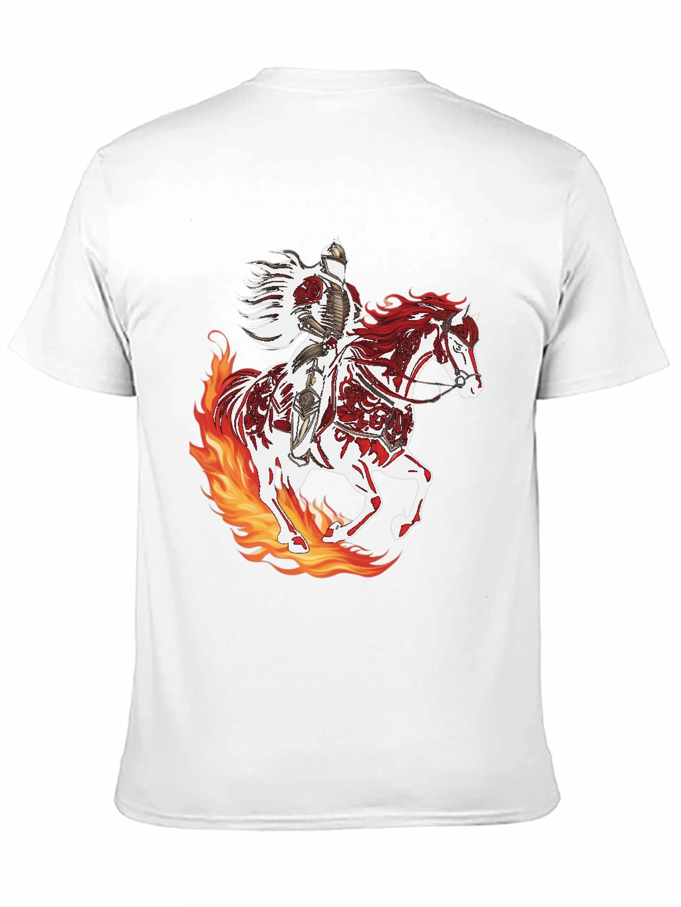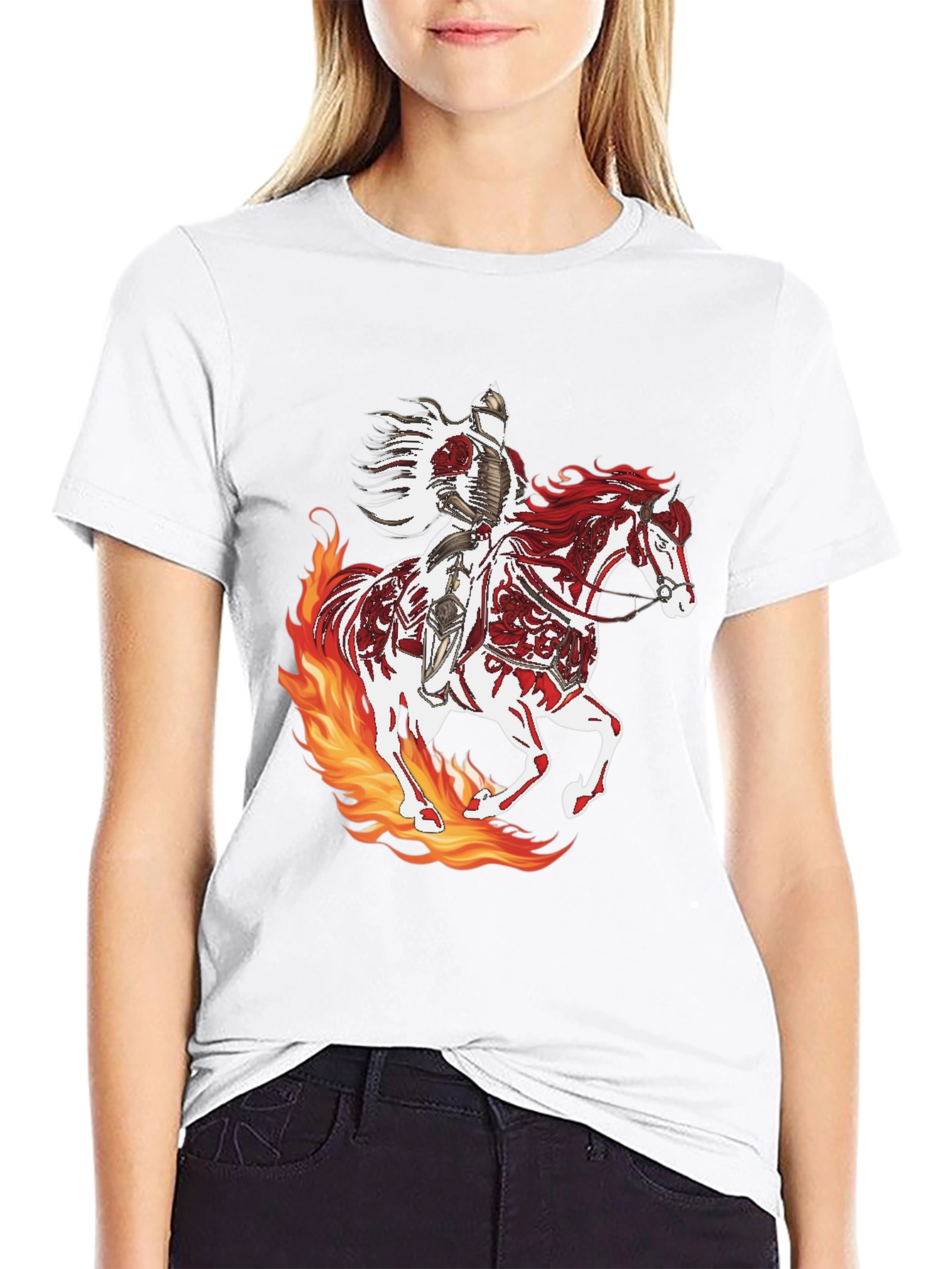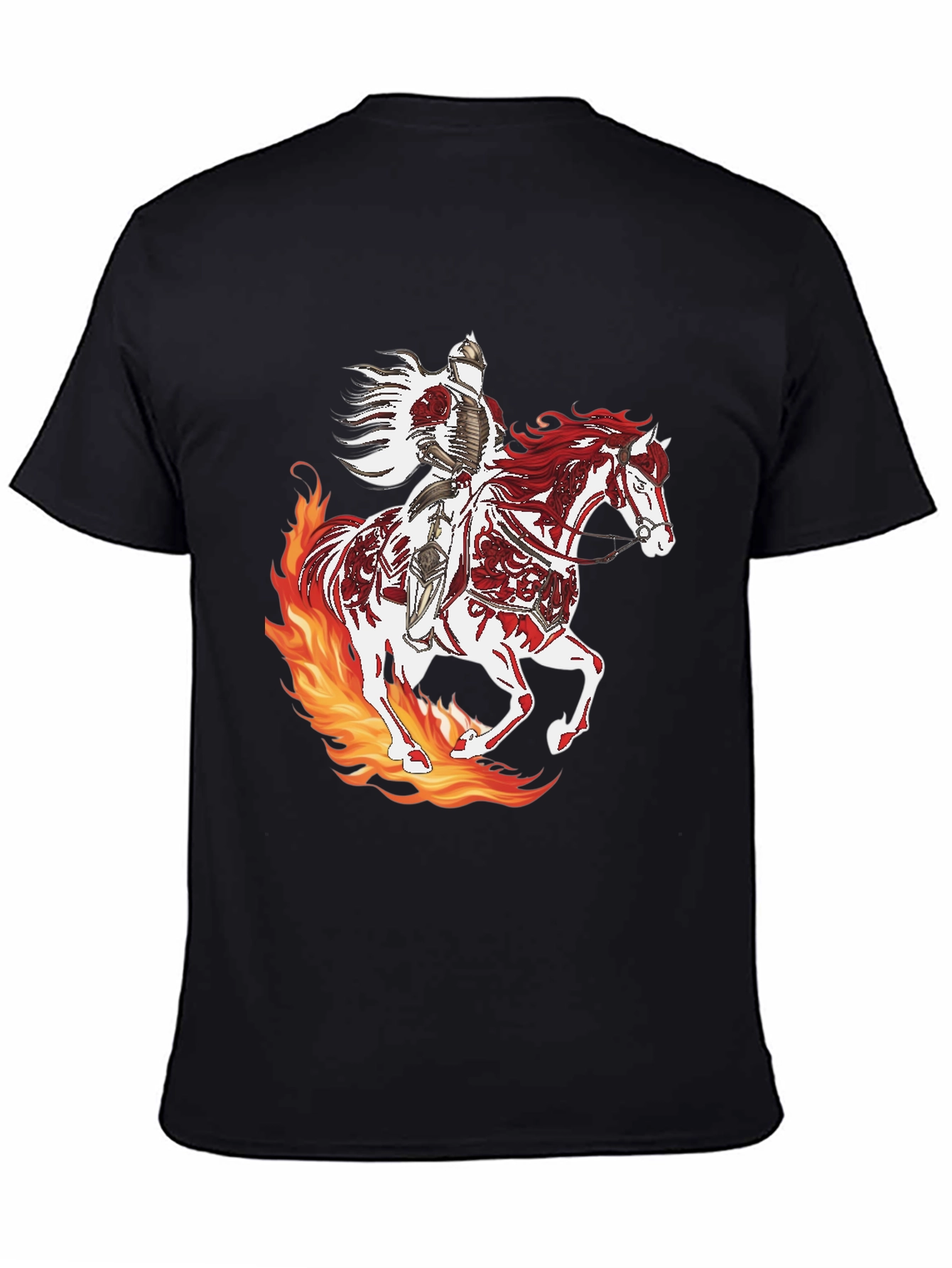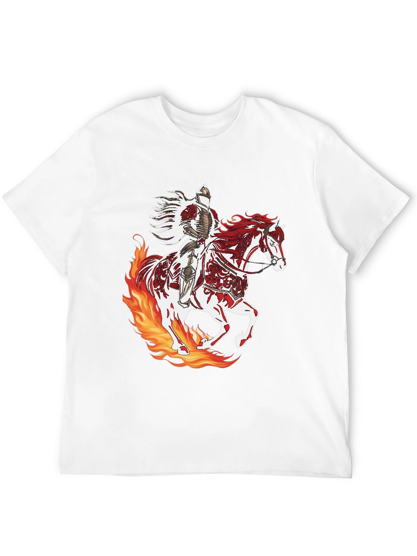 Destaca con esta camiseta negra de manga corta con un diseño impactante. Presenta un caballero medieval montado en un caballo blanco con detalles florales rojos, ambos envueltos en llamas naranjas y amarillas. Ideal para los amantes de la fantasía y la historia. El tejido parece ser de algodón, ofreciendo comodidad y transpirabilidad. Perfecta para uso diario, eventos casuales o para expresar tu estilo único. Un diseño llamativo que seguro atraerá miradas. ¡Añade un toque de originalidad a tu guardarropa con esta prenda única!