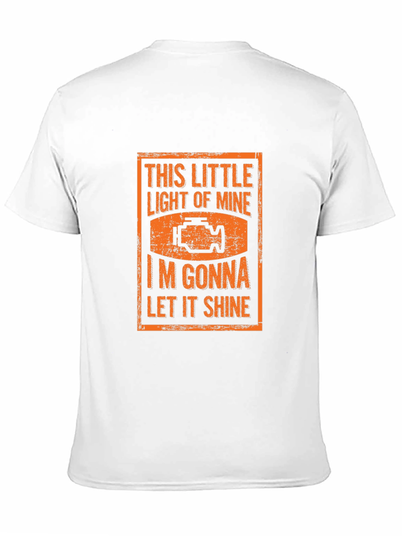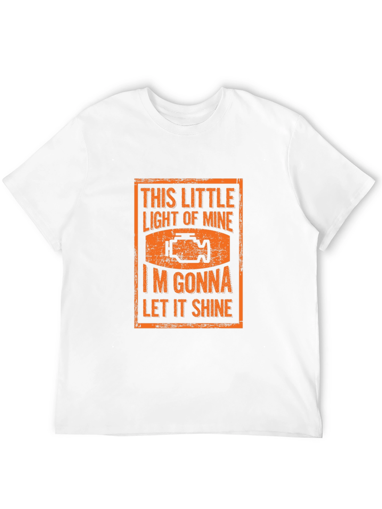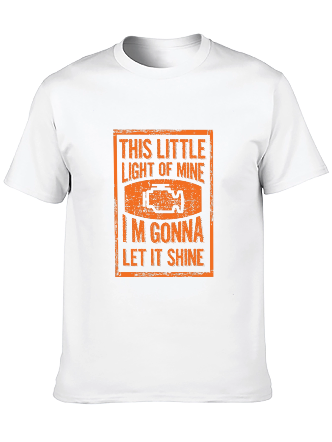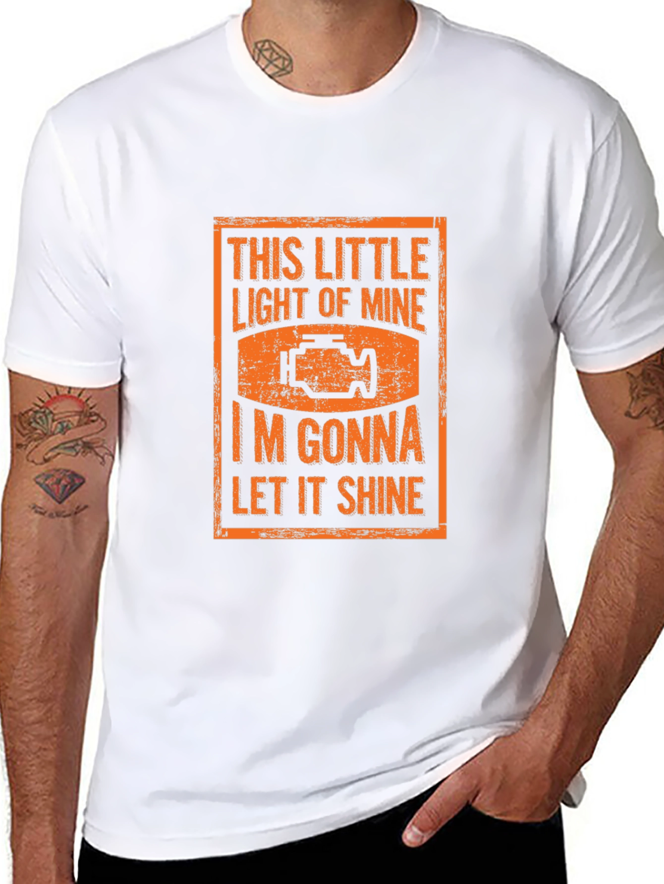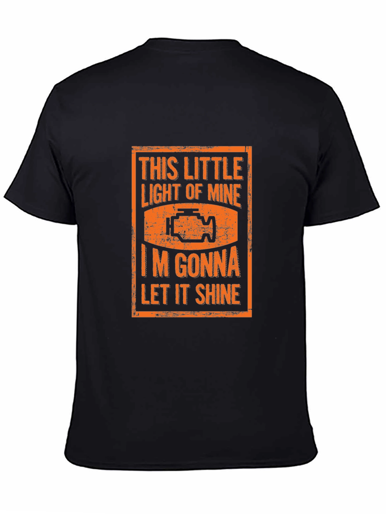 Luce un estilo único con esta camiseta negra de manga corta que presenta un diseño llamativo en color naranja. El diseño muestra la frase "This Little Light of Mine I'm Gonna Let It Shine", acompañado de un dibujo que simula el icono de "Check Engine" de un automóvil, aportando un toque de humor y originalidad. Perfecta para los amantes de los coches o para aquellos con un sentido del humor peculiar. Fabricada en un material suave y cómodo, esta camiseta es ideal para usar en el día a día, en salidas casuales o simplemente para relajarse en casa. ¡Muestra tu personalidad con esta prenda que no pasará desapercibida!