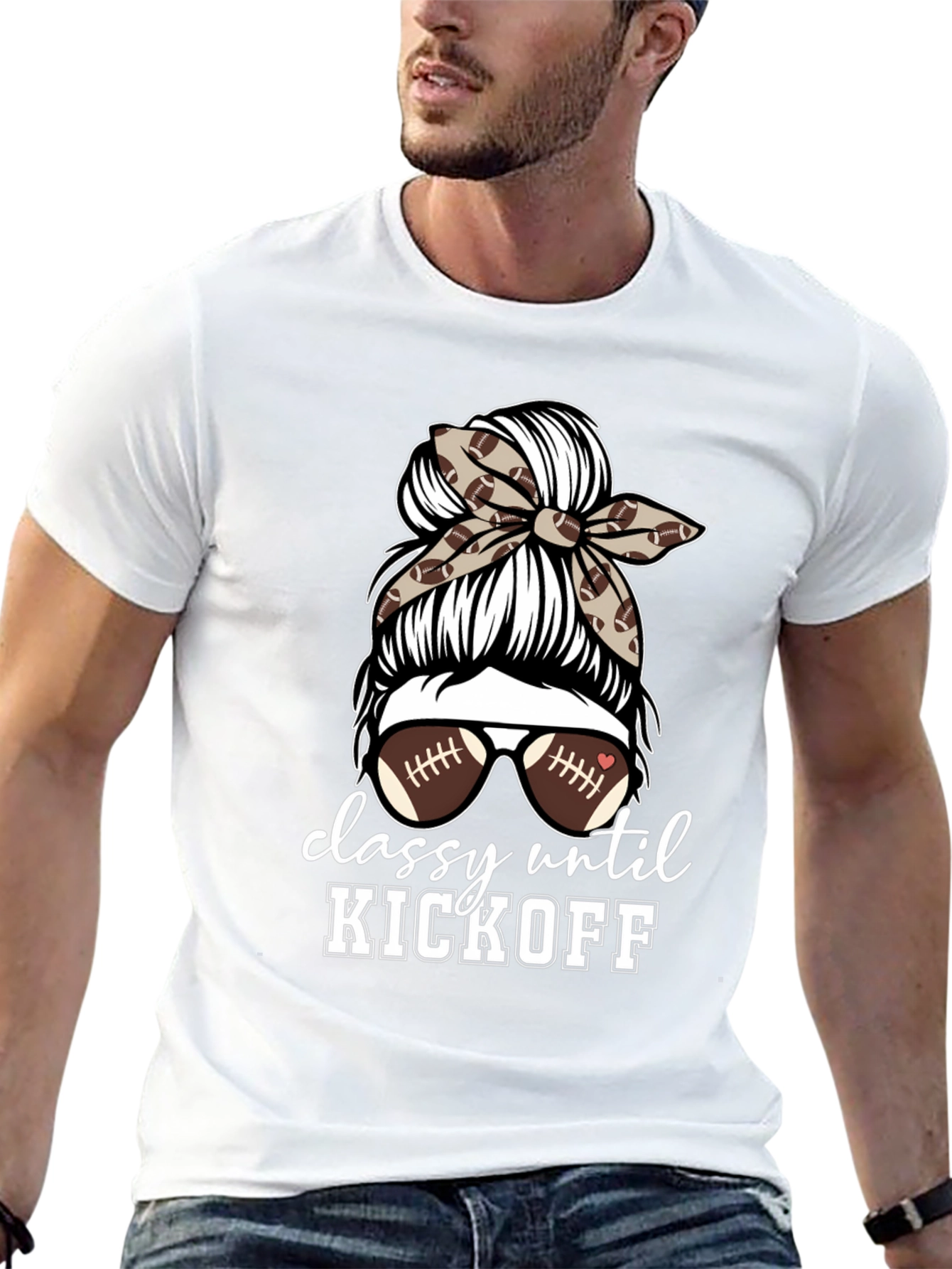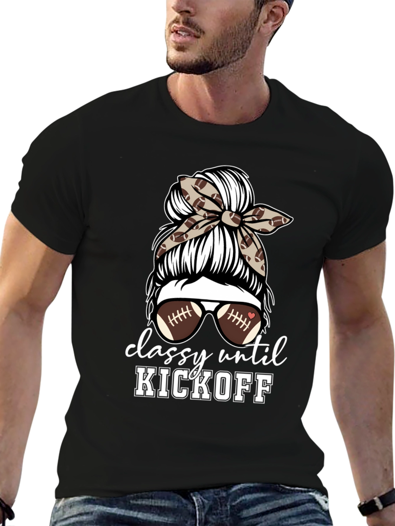 Muestra tu espíritu deportivo con esta camiseta negra de diseño único. Presenta un gráfico llamativo de una mujer con gafas de sol con forma de balón de fútbol y un moño estampado con balones, ideal para las fanáticas del fútbol americano. La frase "Classy Until Kickoff" (Con clase hasta el saque inicial) está estampada en letras blancas contrastantes. Confeccionada con materiales cómodos, esta camiseta es perfecta para usar en días de partido, salidas casuales o simplemente para mostrar tu amor por el deporte. Luce un look deportivo y elegante con esta prenda imprescindible en tu guardarropa.