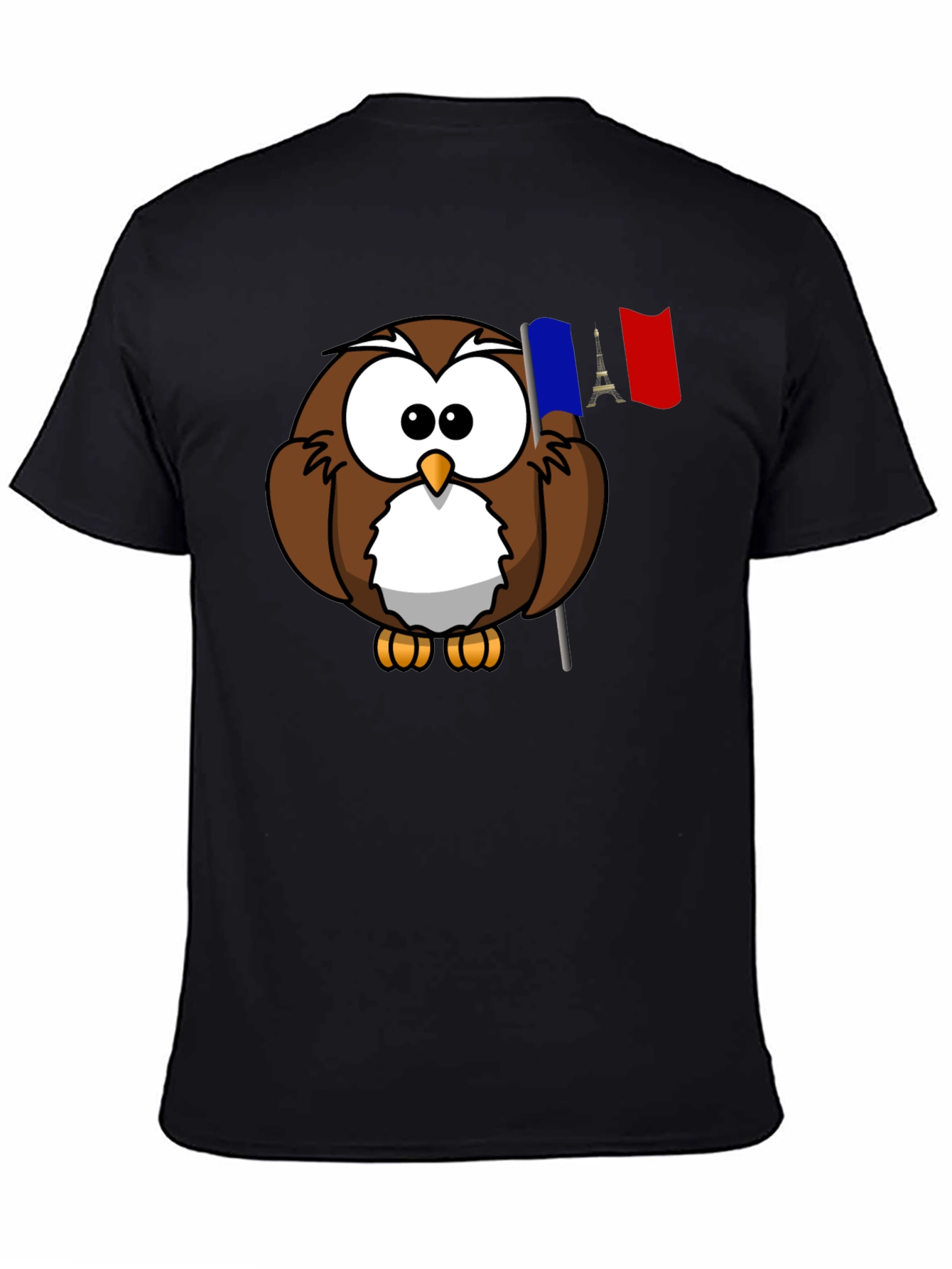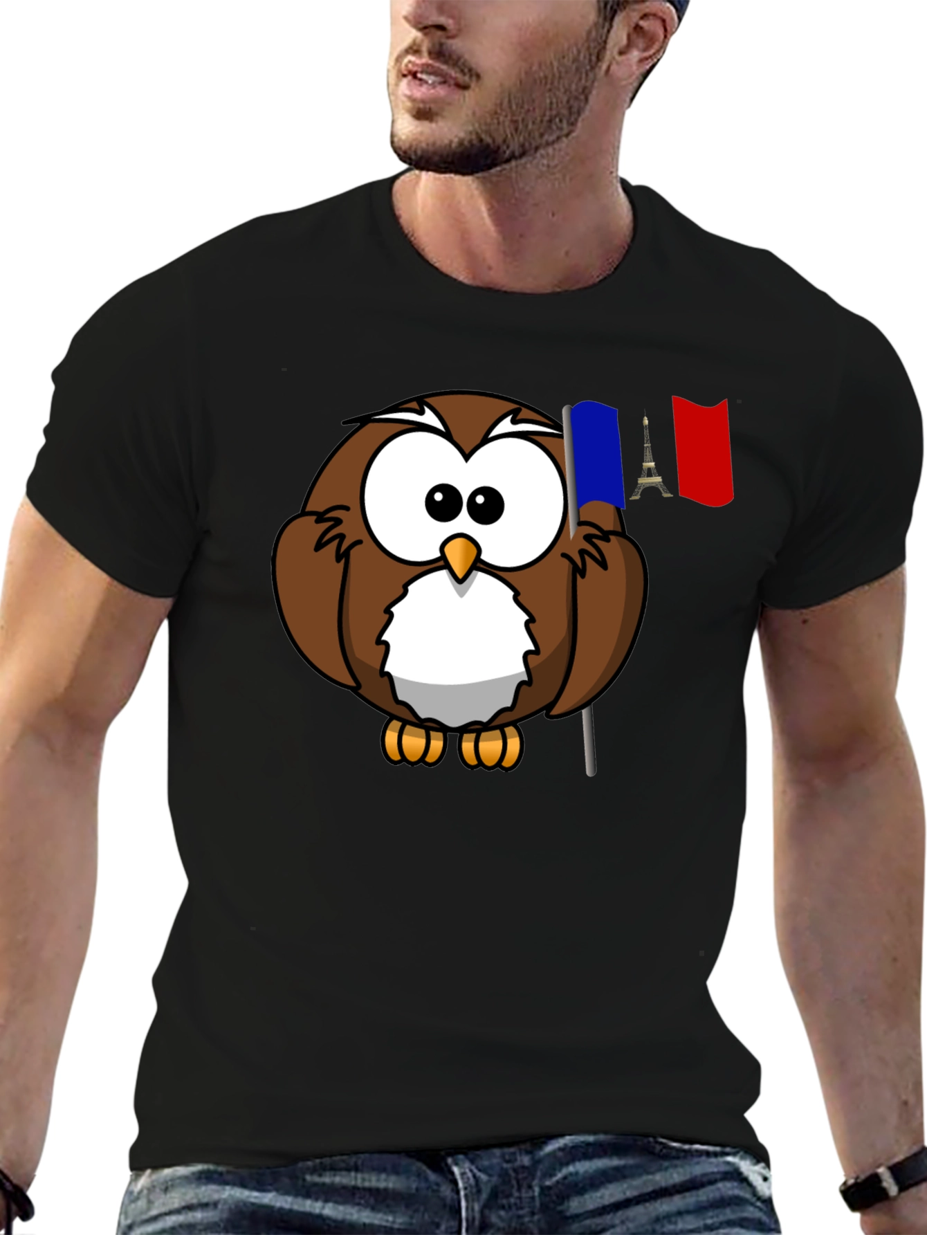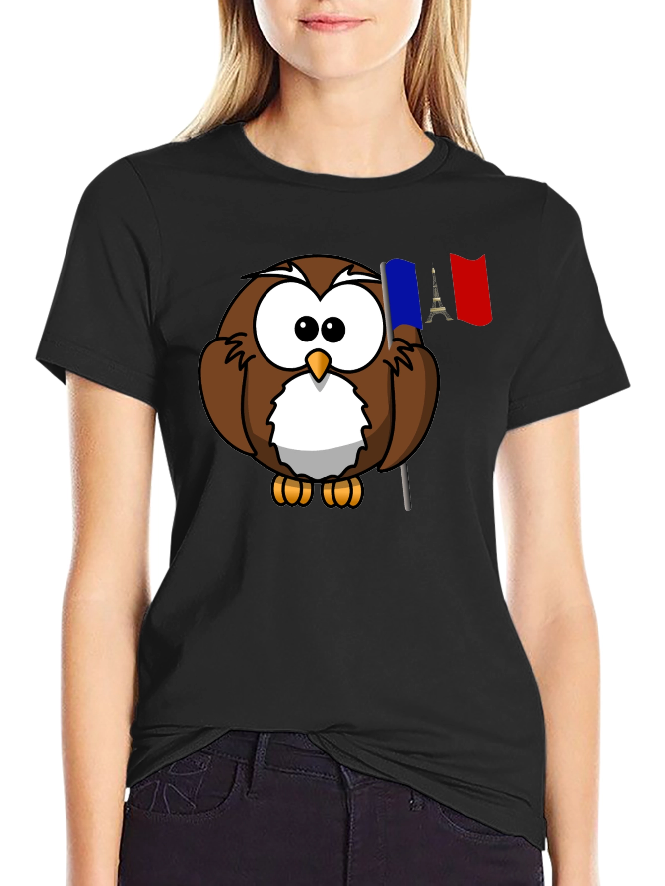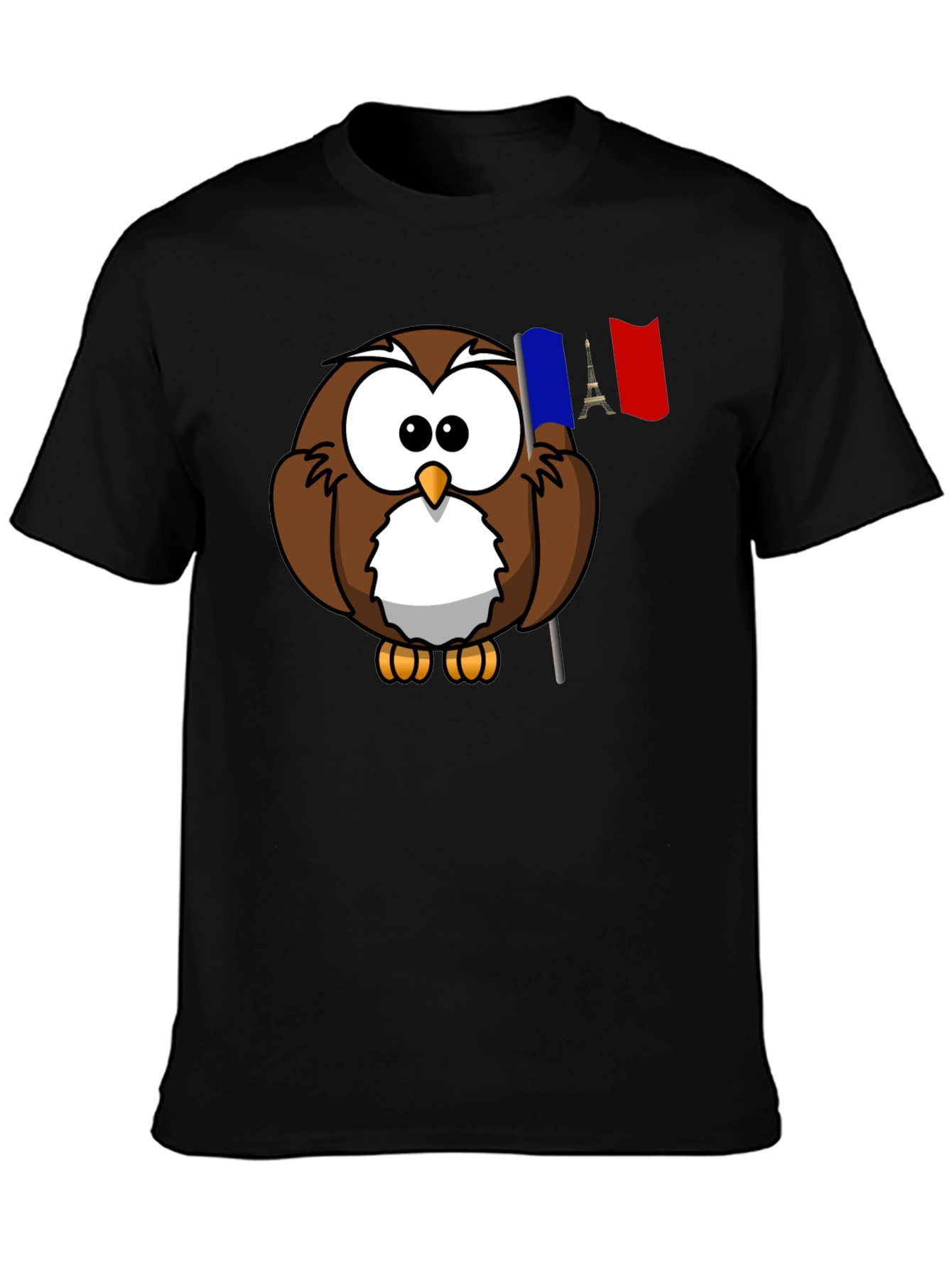 Luce esta original camiseta negra con un divertido diseño de un búho caricaturizado. El búho, en tonos marrones y blancos, sostiene una pequeña bandera francesa, aportando un toque único y cultural. Perfecta para expresar tu personalidad y amor por Francia con un estilo desenfadado. Fabricada con materiales suaves y cómodos, esta camiseta es ideal para el uso diario. Combina fácilmente con jeans, pantalones cortos o faldas, convirtiéndola en una prenda versátil para cualquier ocasión casual. Un regalo perfecto para amantes de los animales y la cultura francesa.
