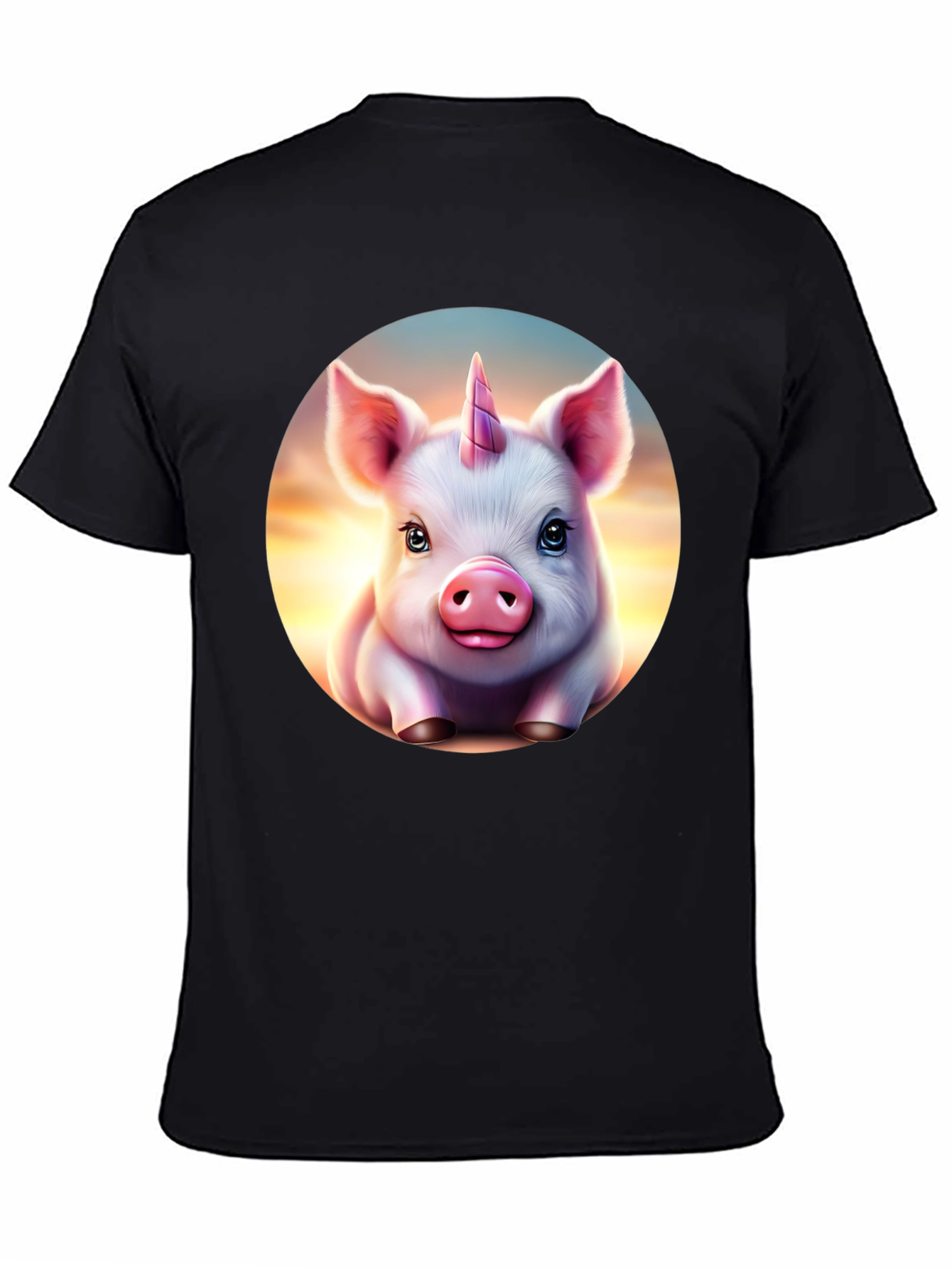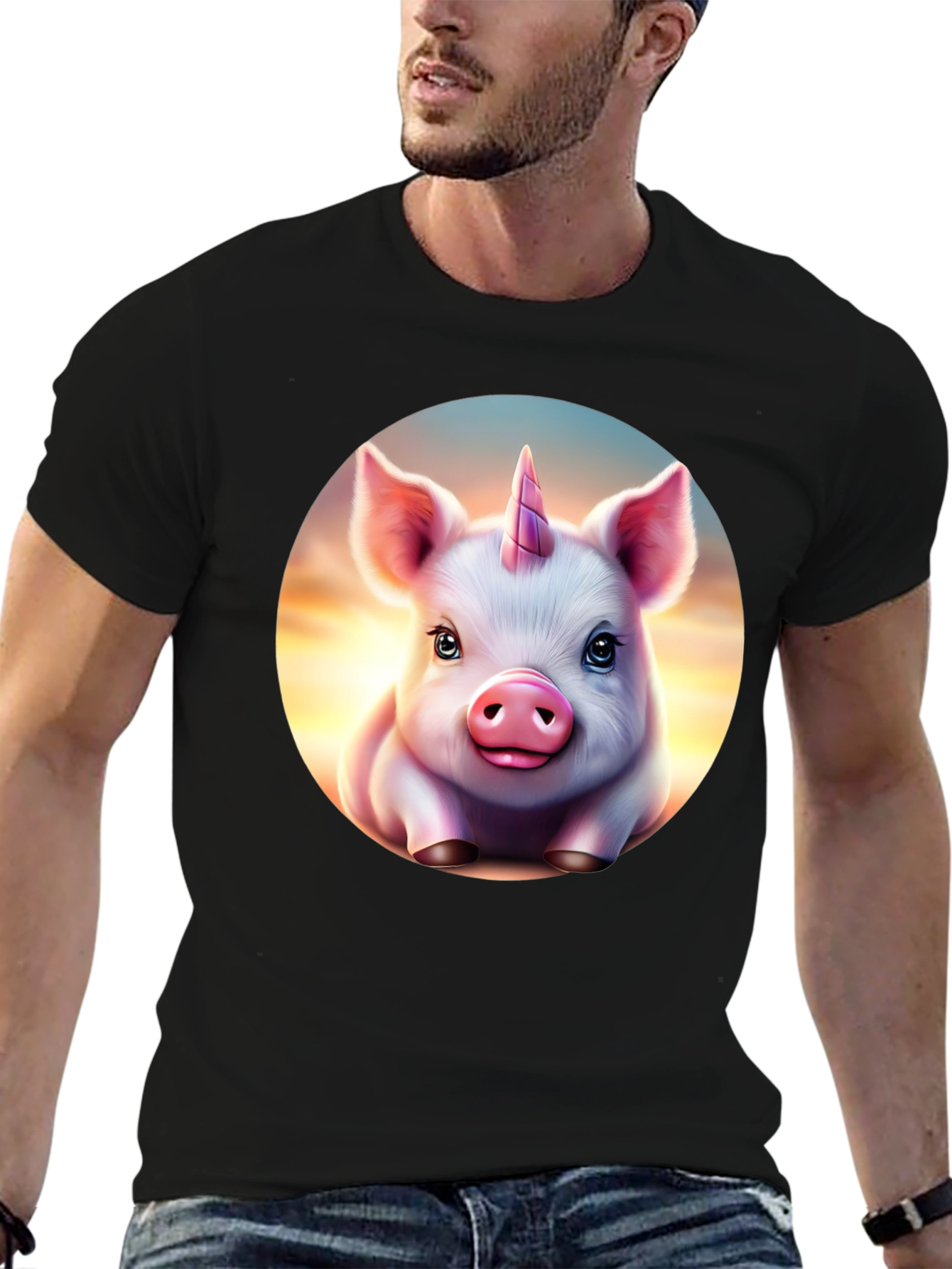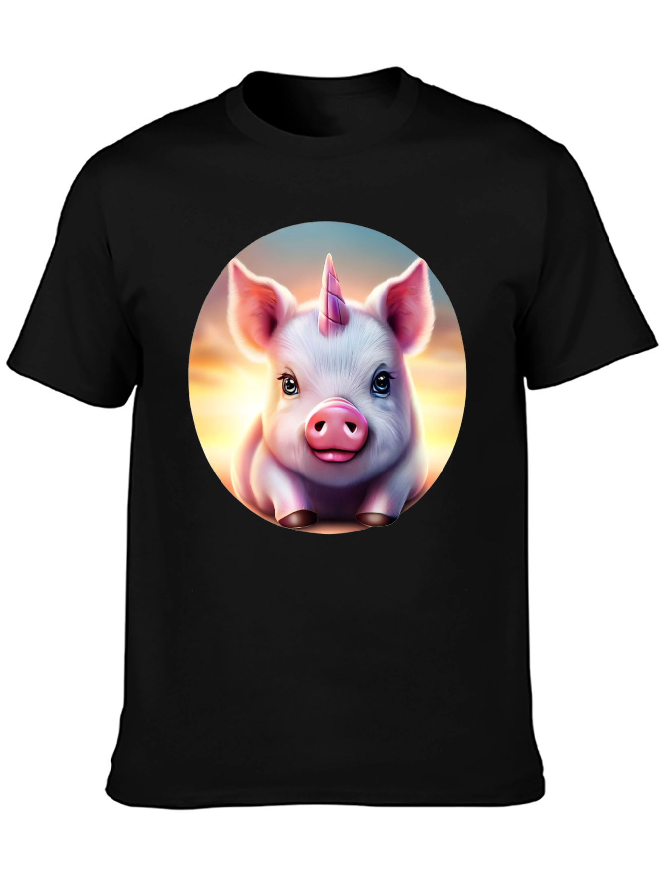 Luce esta llamativa camiseta negra de manga corta con un diseño adorable de un cerdito unicornio animado. La ilustración, centrada en el pecho, presenta un tierno cerdito con un cuerno de unicornio en tonos pastel, sobre un fondo circular difuminado con colores cálidos. Perfecta para quienes aman los diseños originales y divertidos, esta camiseta es ideal para uso casual, ya sea para salir con amigos, ir al parque o simplemente relajarte en casa. El diseño capta la atención y añade un toque de fantasía a tu vestuario diario. Fabricada con materiales que parecen ser suaves y cómodos, esta camiseta es una excelente adición a cualquier guardarropa.