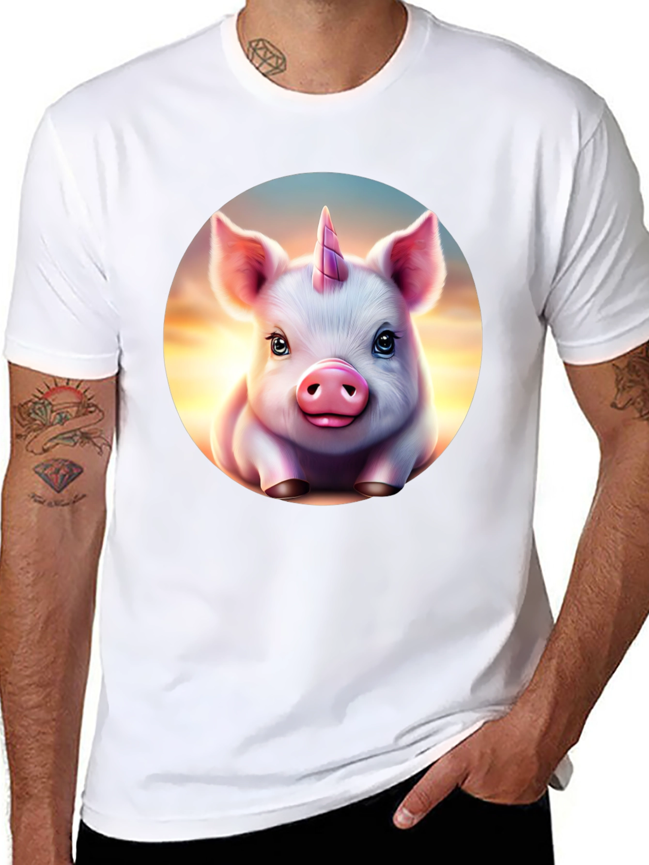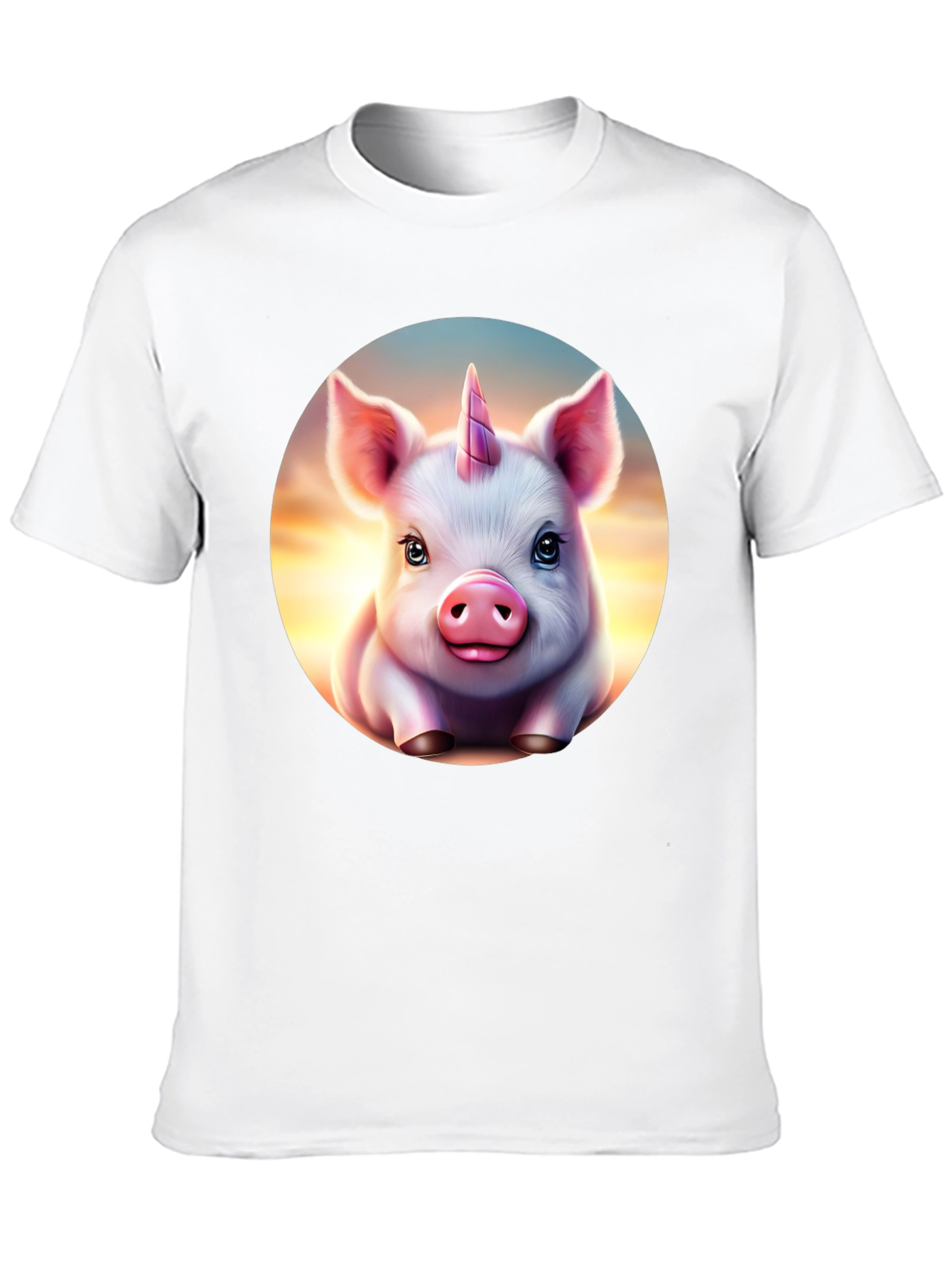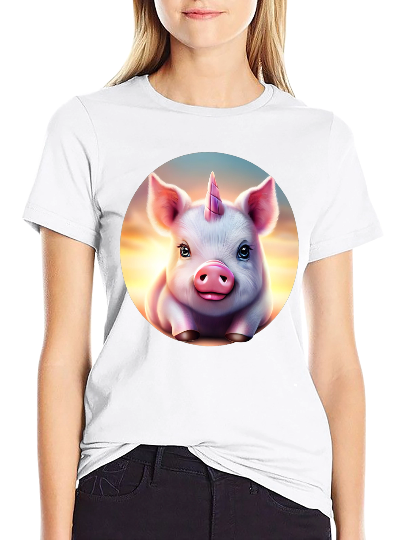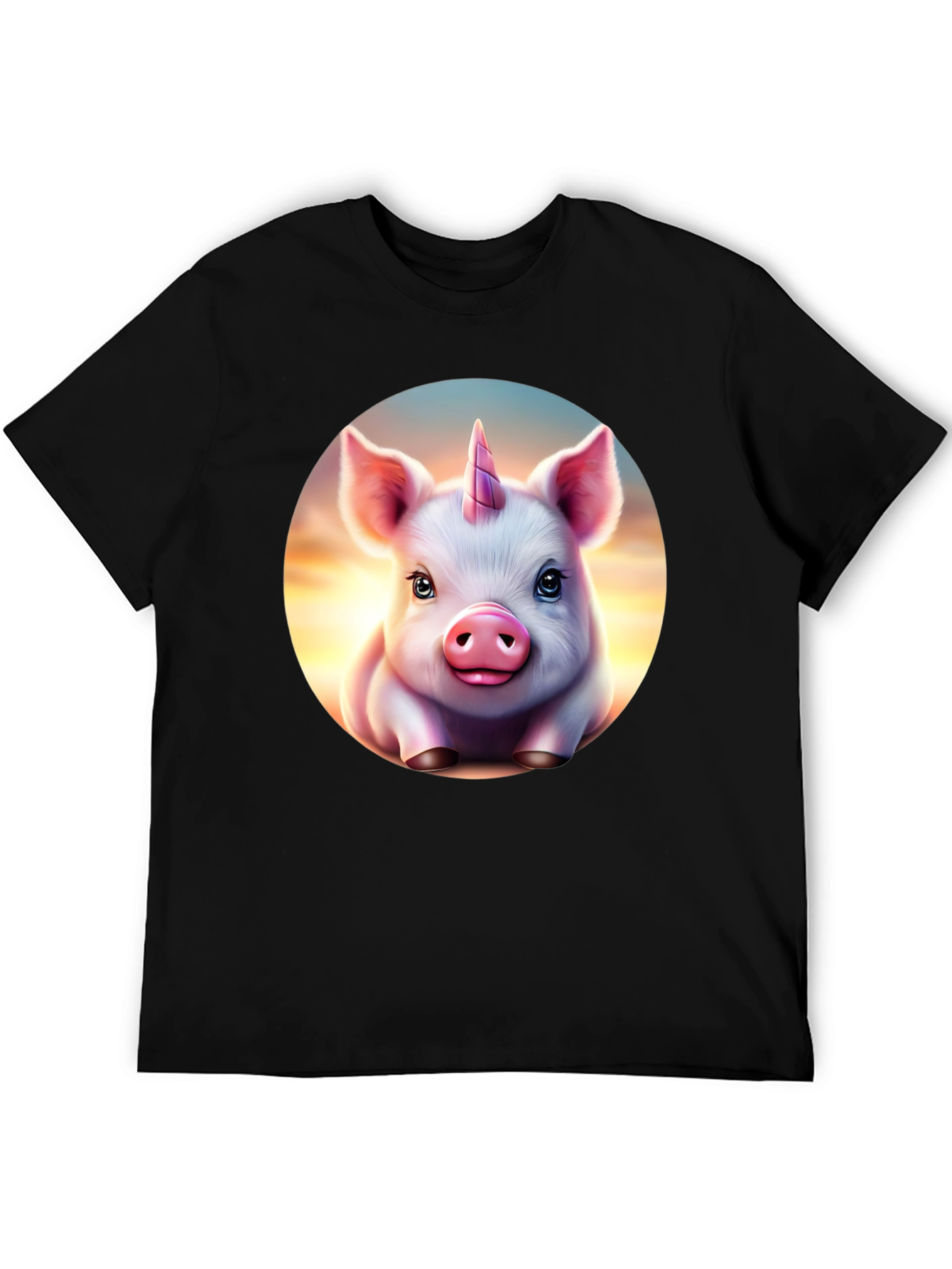 Luce esta llamativa camiseta negra de manga corta con un diseño adorable de un cerdito unicornio animado. La ilustración, centrada en el pecho, presenta un tierno cerdito con un cuerno de unicornio en tonos pastel, sobre un fondo circular difuminado con colores cálidos. Perfecta para quienes aman los diseños originales y divertidos, esta camiseta es ideal para uso casual, ya sea para salir con amigos, ir al parque o simplemente relajarte en casa. El diseño capta la atención y añade un toque de fantasía a tu vestuario diario. Fabricada con materiales que parecen ser suaves y cómodos, esta camiseta es una excelente adición a cualquier guardarropa.