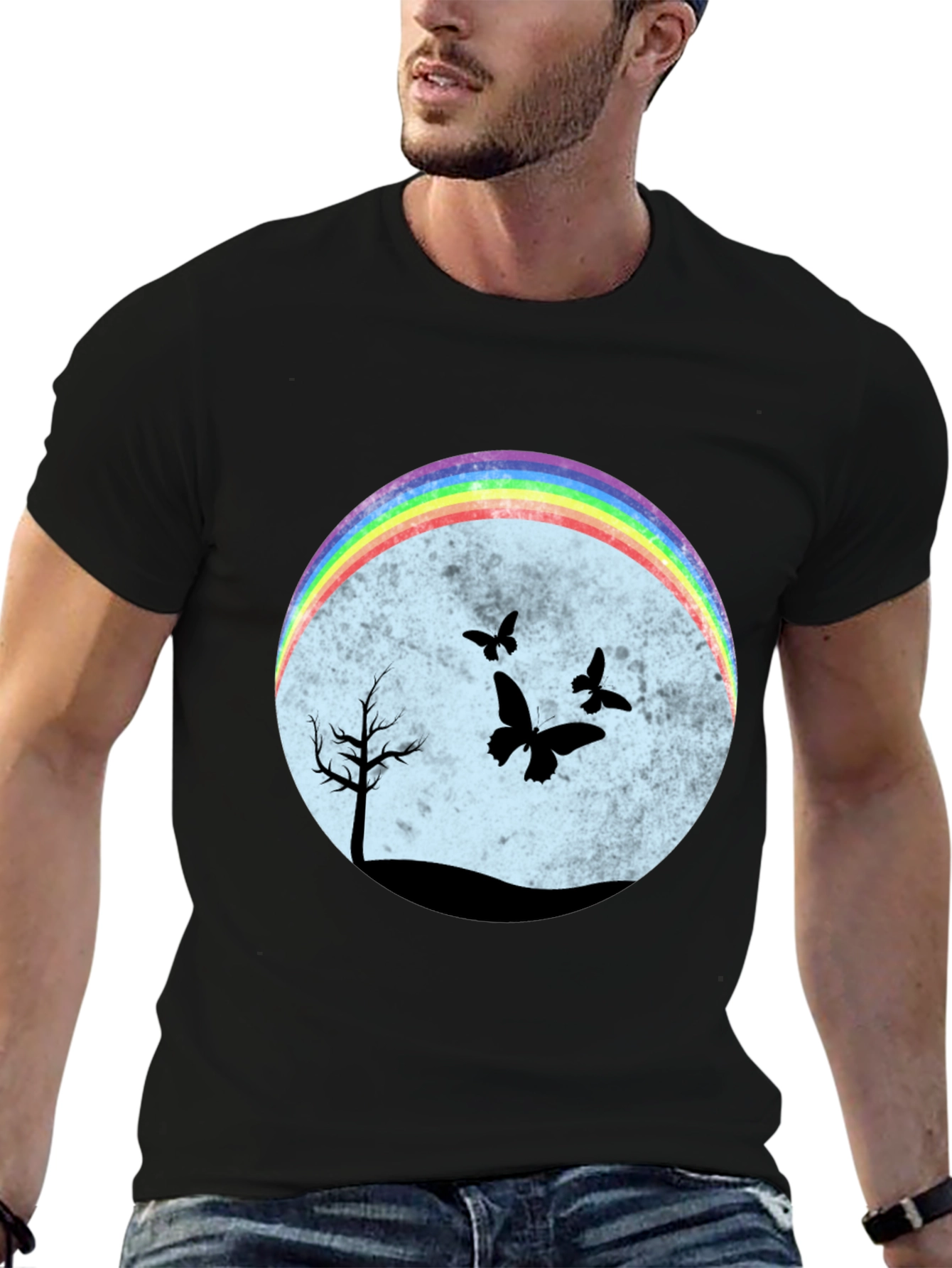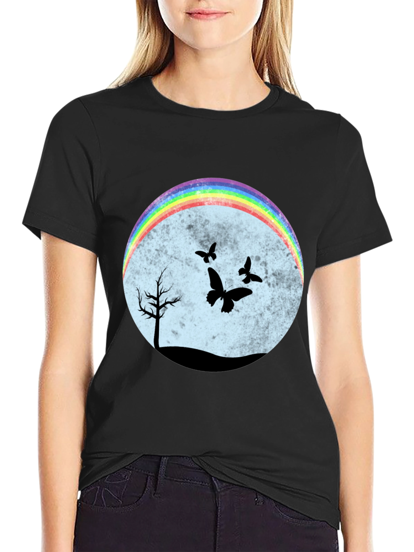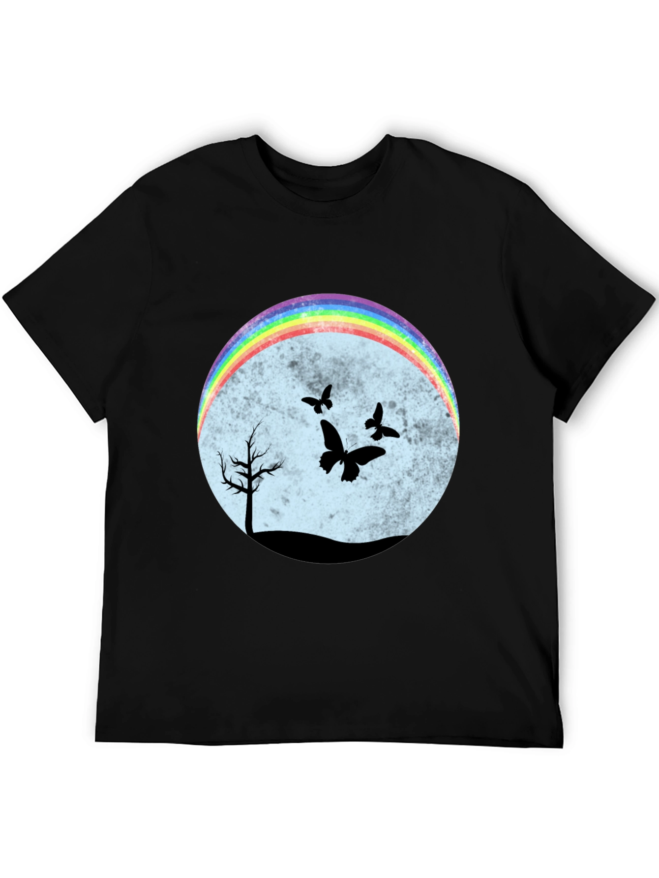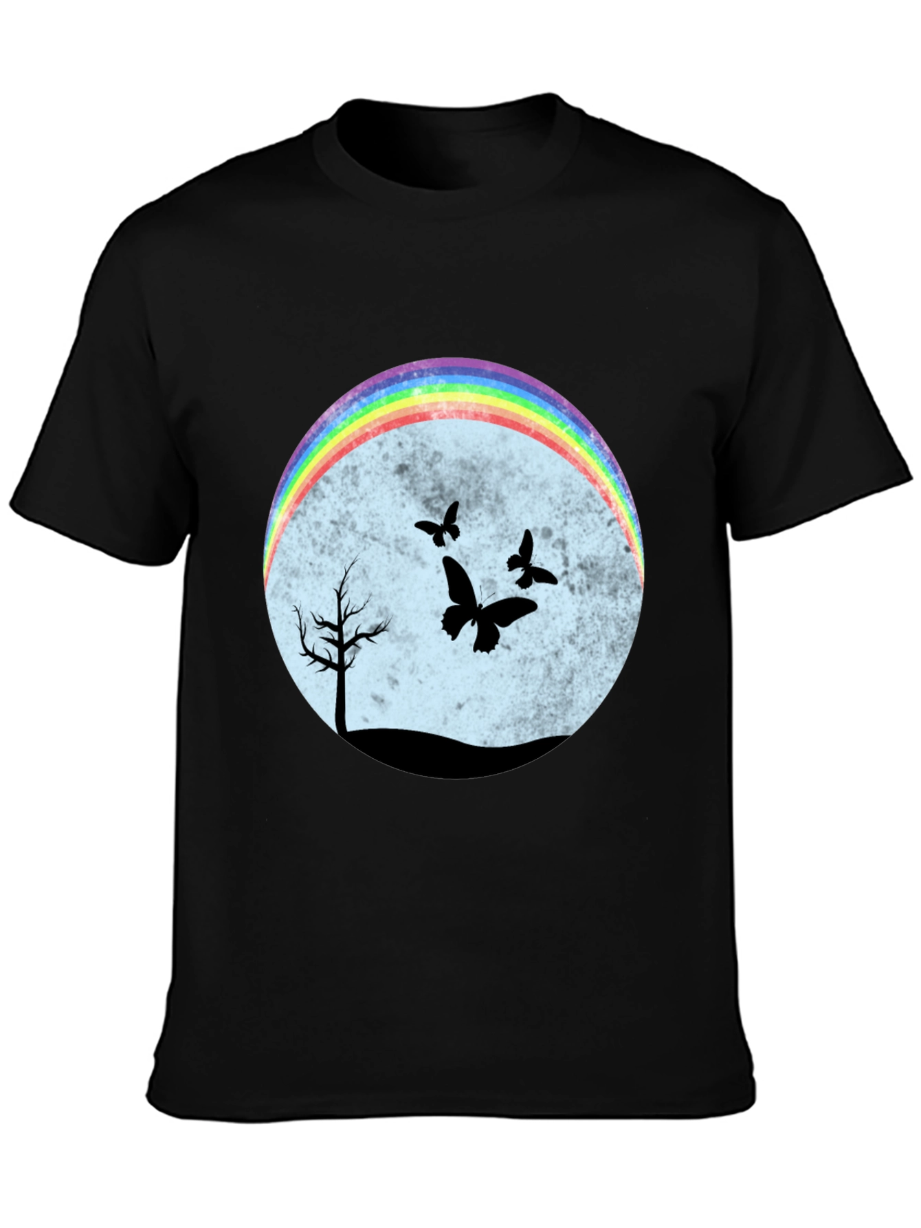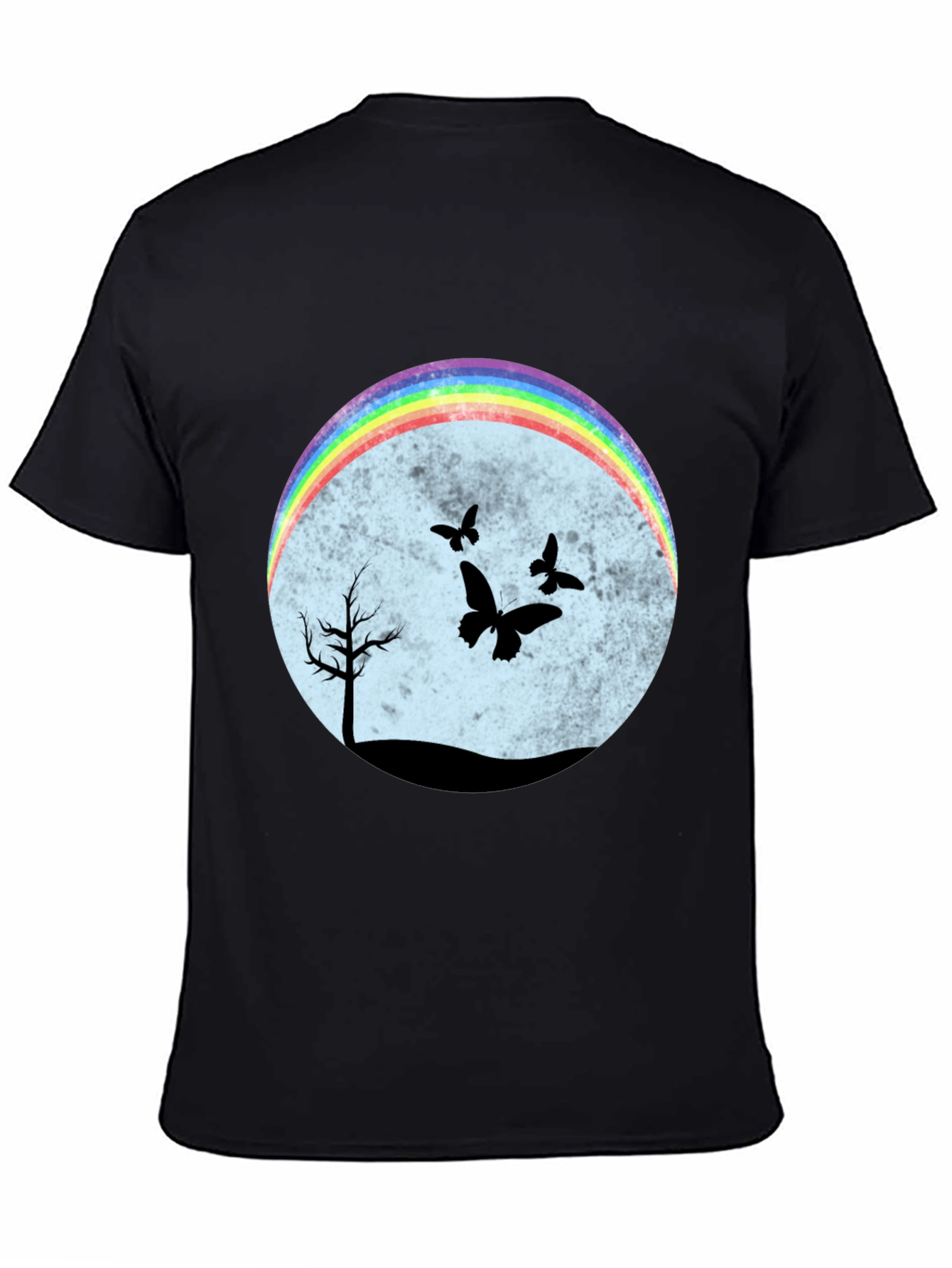 Esta camiseta negra presenta un diseño llamativo y original. En el centro, un círculo difuminado en tonos pastel sirve de fondo para una escena nocturna con siluetas negras de un árbol solitario y mariposas revoloteando. Un arcoíris brillante en la parte superior del círculo añade un toque de color y alegría al diseño. El corte clásico de la camiseta la hace ideal para un uso casual y cómodo. Perfecta para expresar tu individualidad y estilo único. Combínala con jeans, shorts o faldas para un look relajado pero con personalidad. Ideal para amantes de la naturaleza y la originalidad.