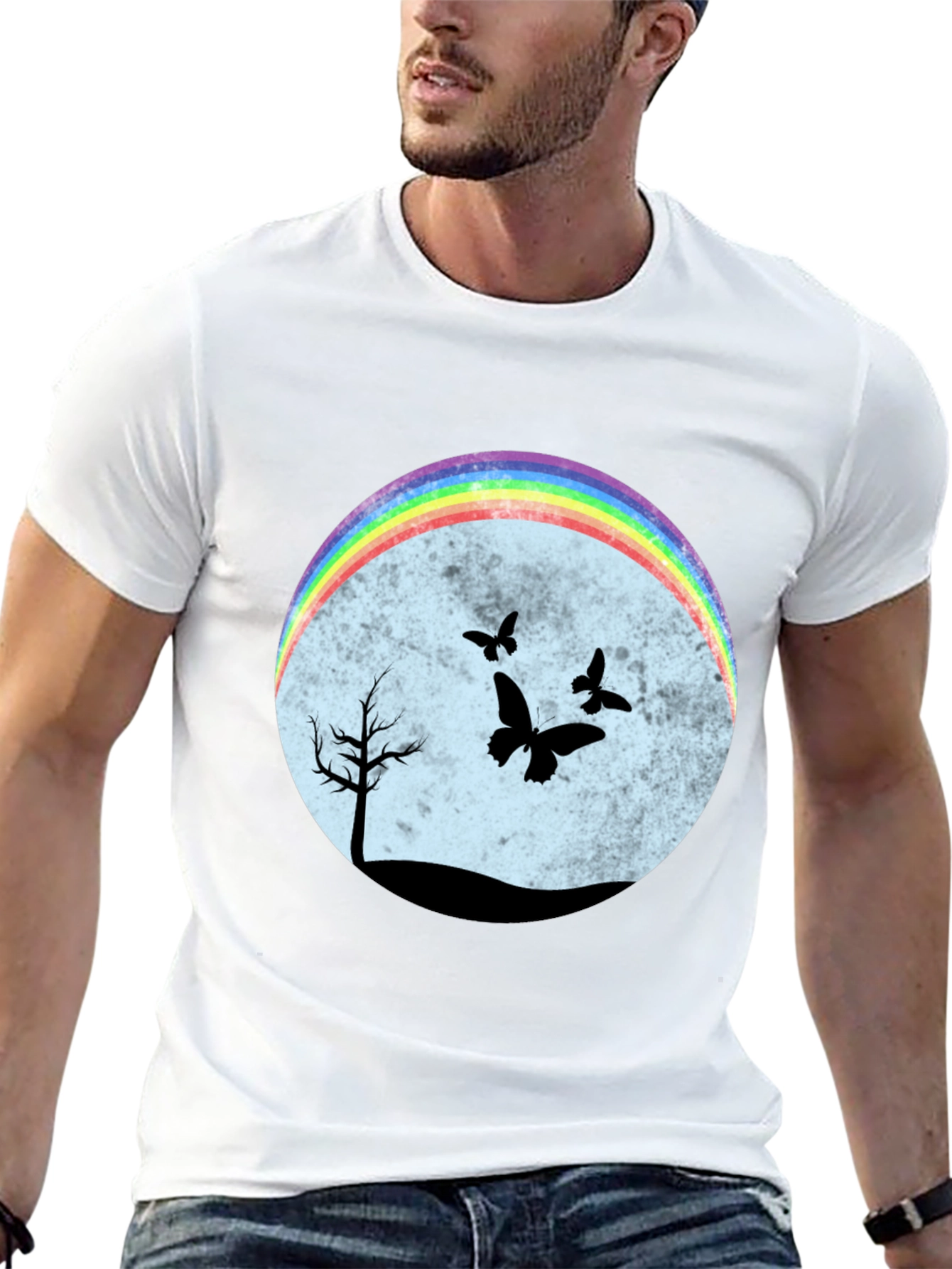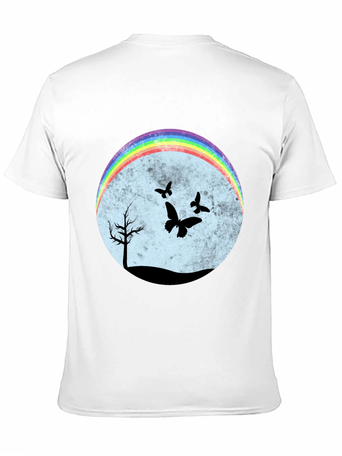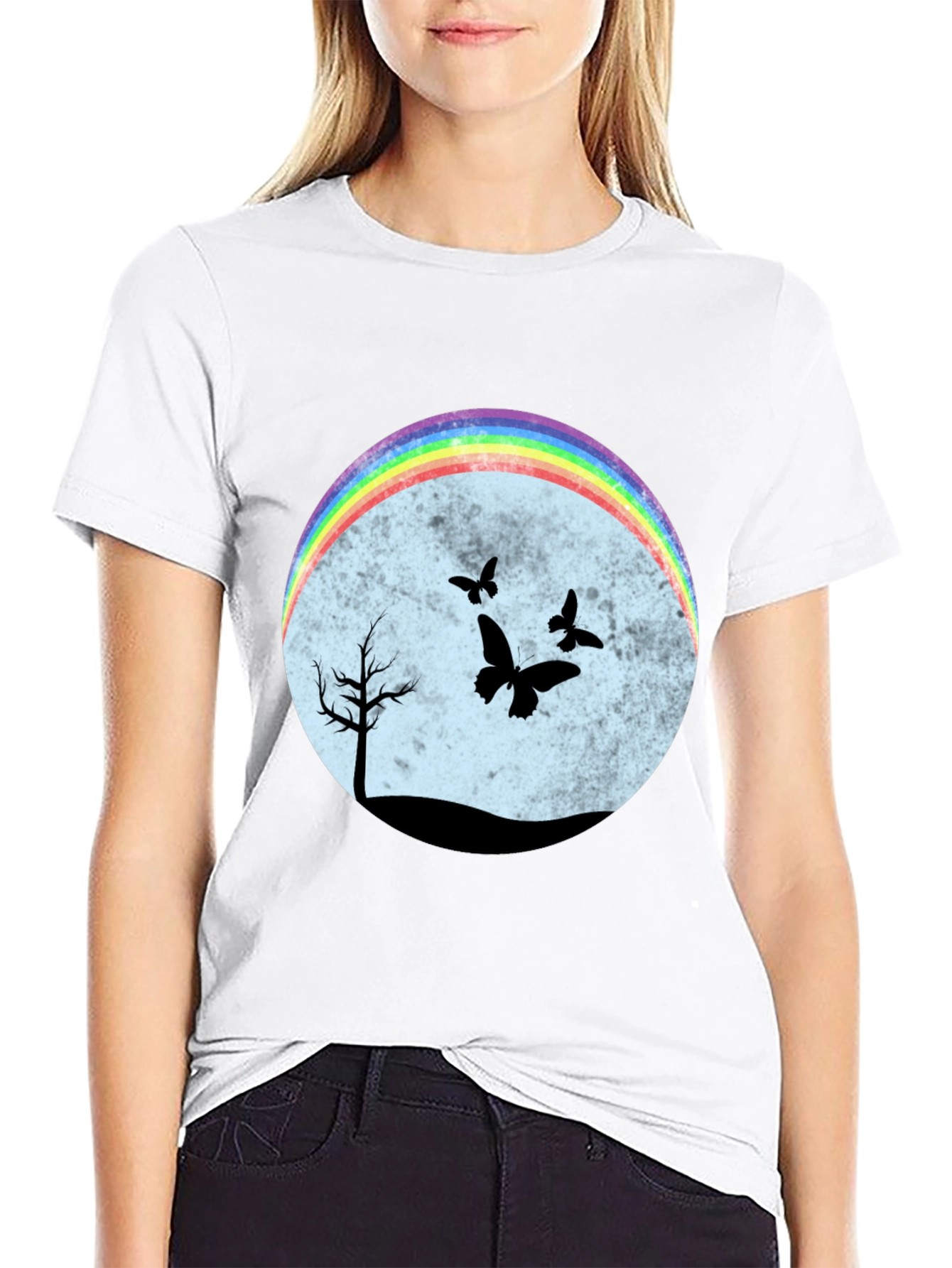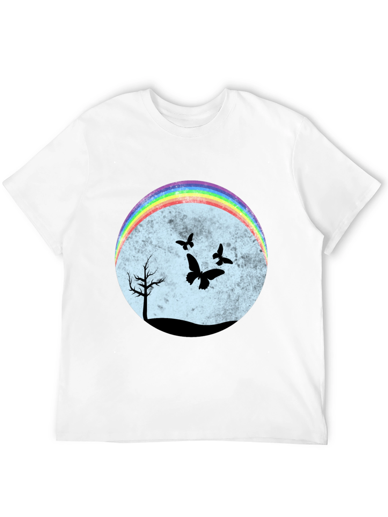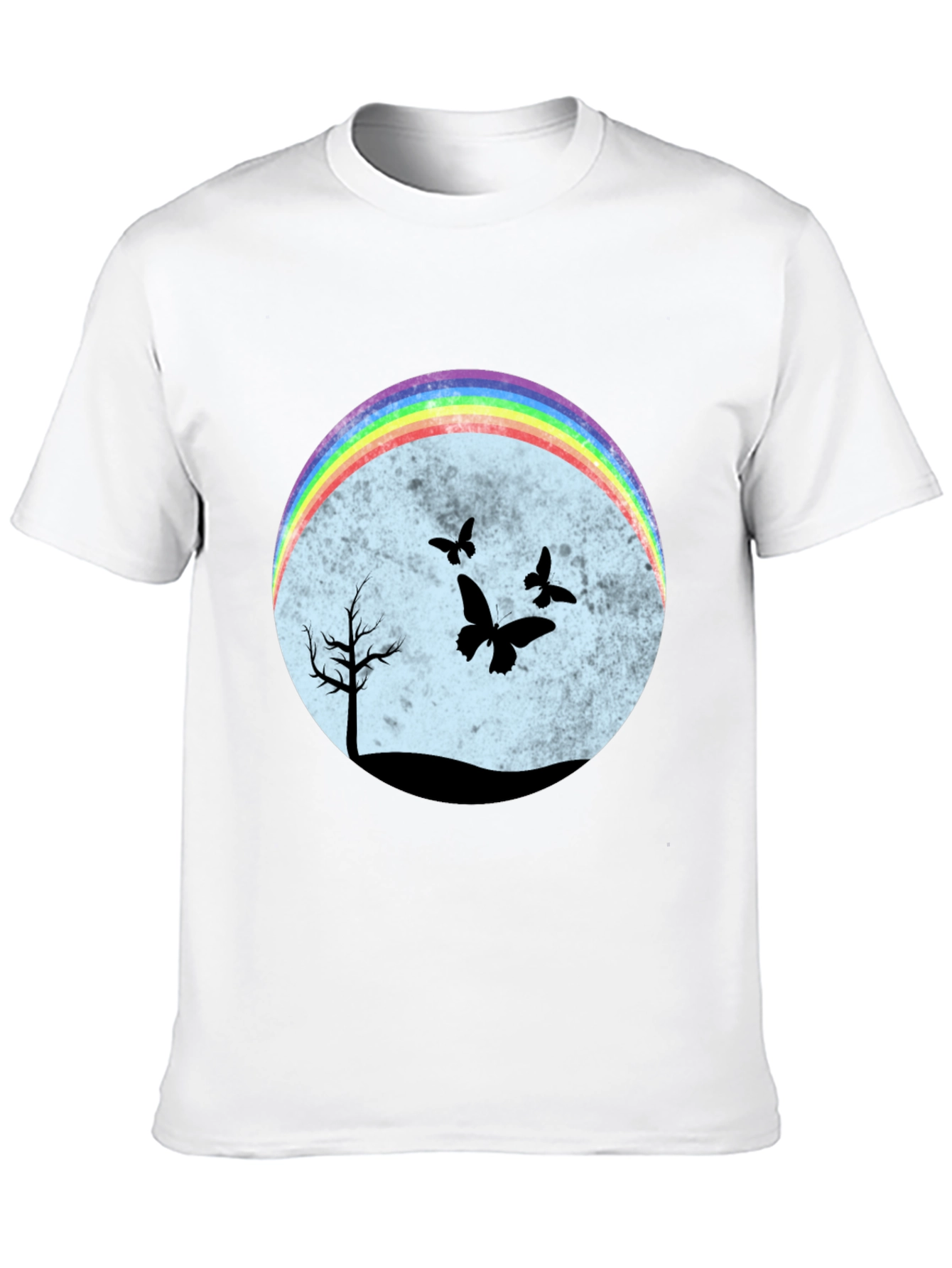 Esta camiseta negra presenta un diseño llamativo y original. En el centro, un círculo difuminado en tonos pastel sirve de fondo para una escena nocturna con siluetas negras de un árbol solitario y mariposas revoloteando. Un arcoíris brillante en la parte superior del círculo añade un toque de color y alegría al diseño. El corte clásico de la camiseta la hace ideal para un uso casual y cómodo. Perfecta para expresar tu individualidad y estilo único. Combínala con jeans, shorts o faldas para un look relajado pero con personalidad. Ideal para amantes de la naturaleza y la originalidad.