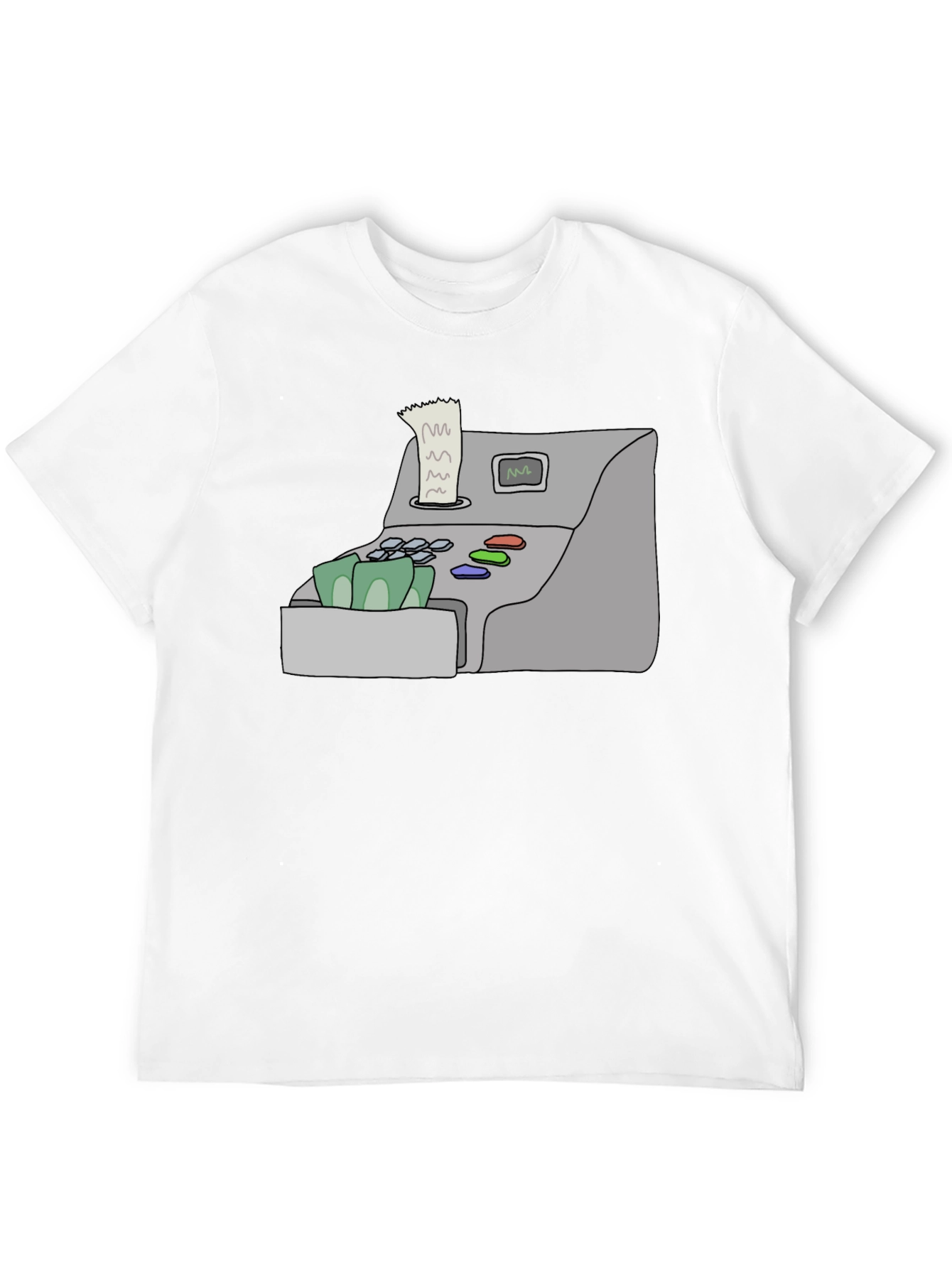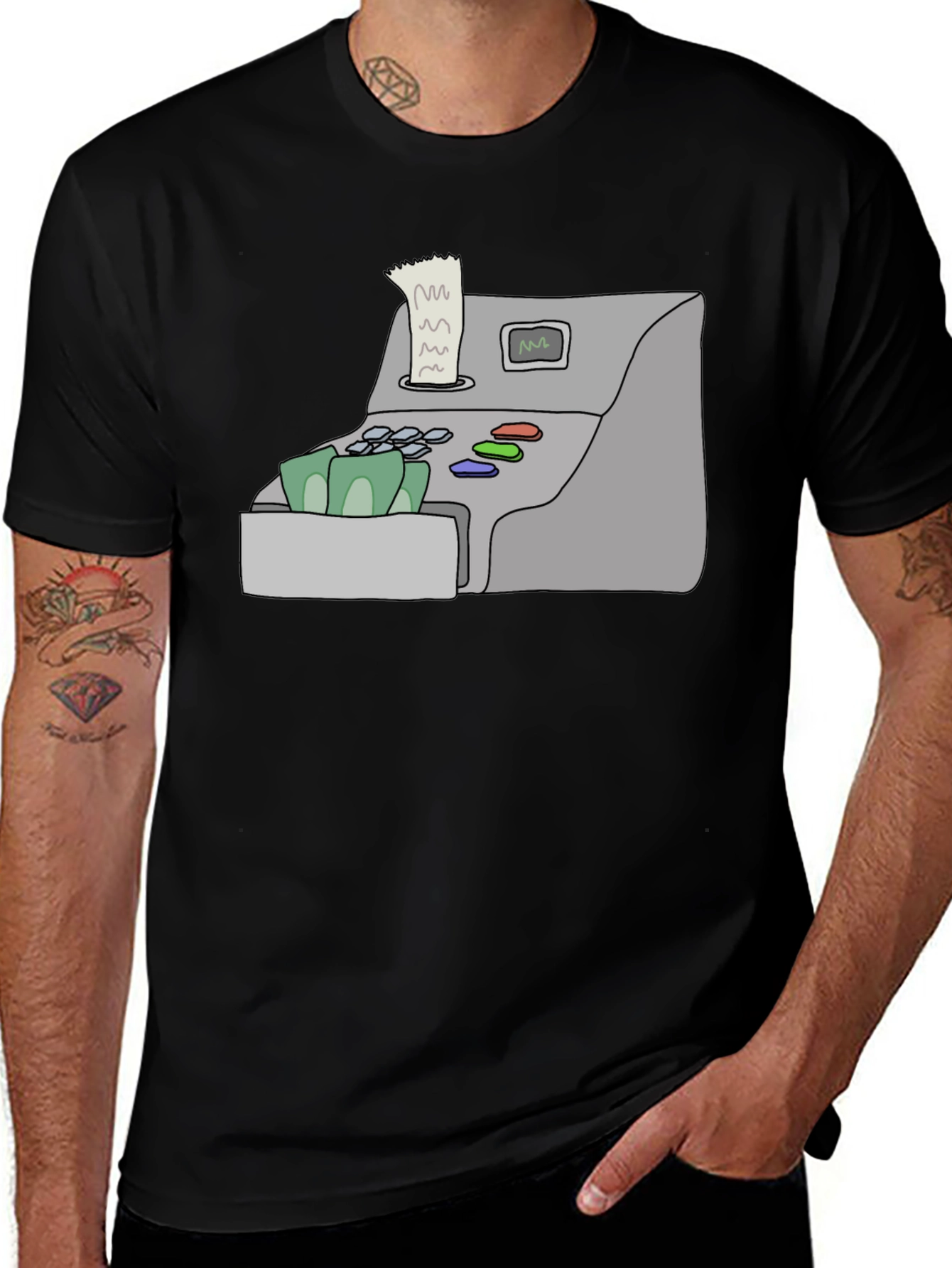 Esta camiseta negra de manga corta presenta un diseño único y llamativo: una caja registradora de estilo caricaturesco en tonos grises, verdes, azules y rojos. Fabricada con un tejido suave y cómodo, esta camiseta es perfecta para el uso diario. Su diseño moderno y original la convierte en una prenda ideal para expresar tu personalidad y destacar entre la multitud. Combínala con tus jeans favoritos para un look casual o úsala debajo de una chaqueta para un estilo más urbano. Ideal para amantes de la cultura pop y diseños originales.