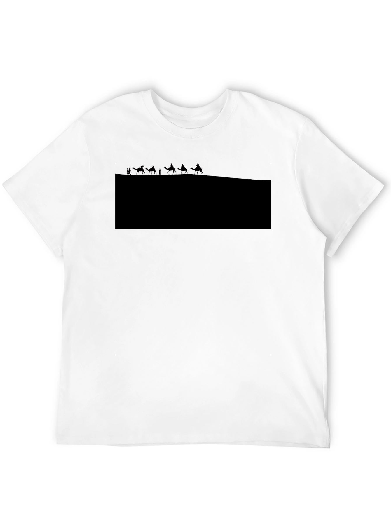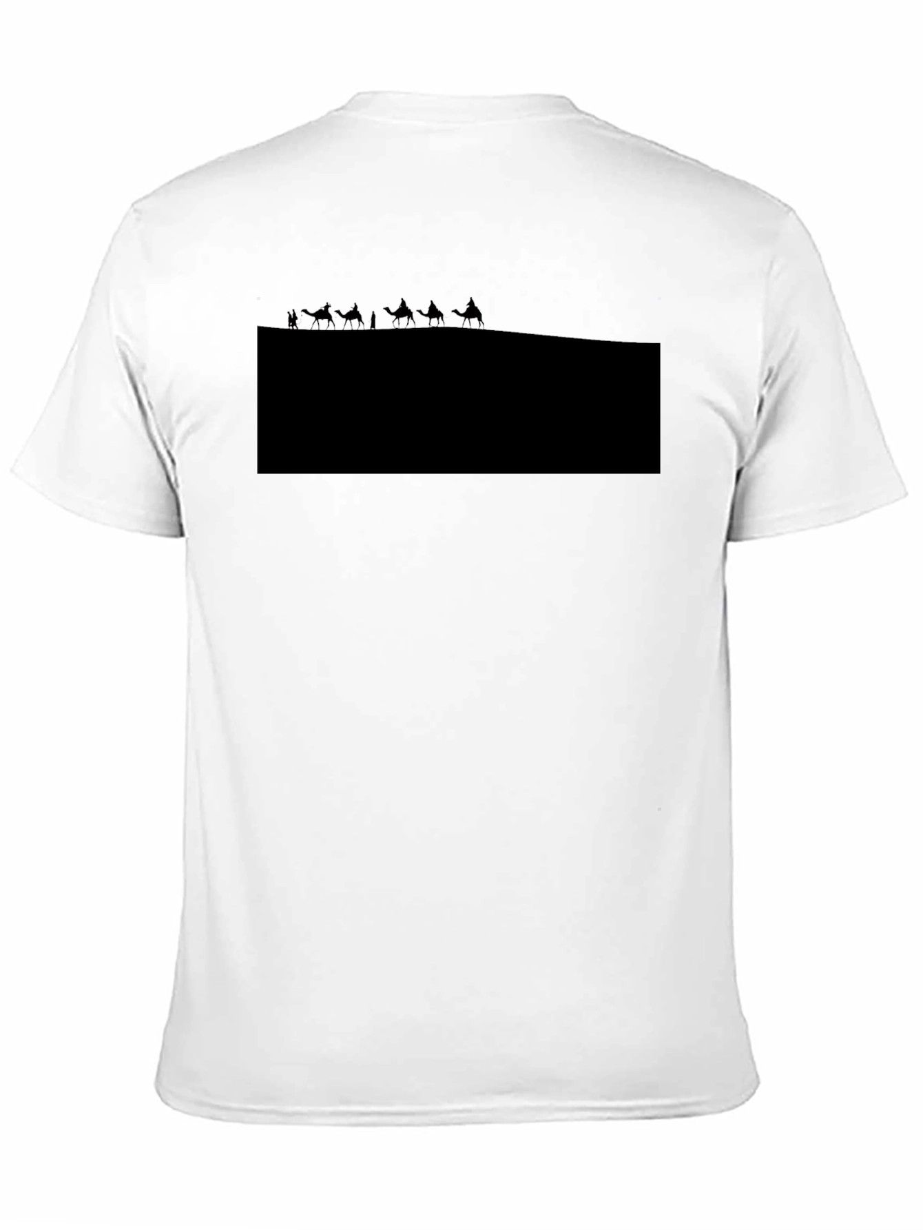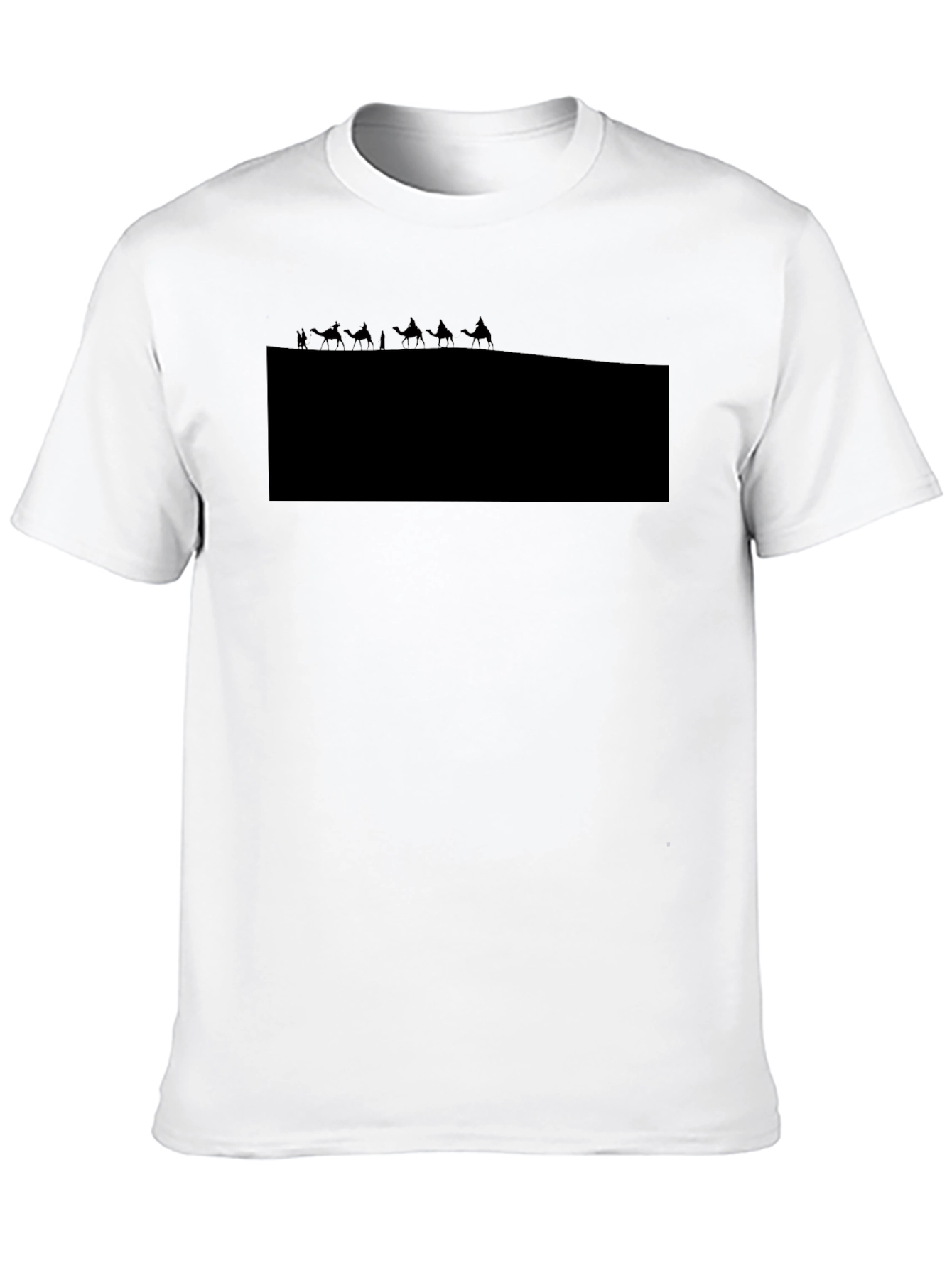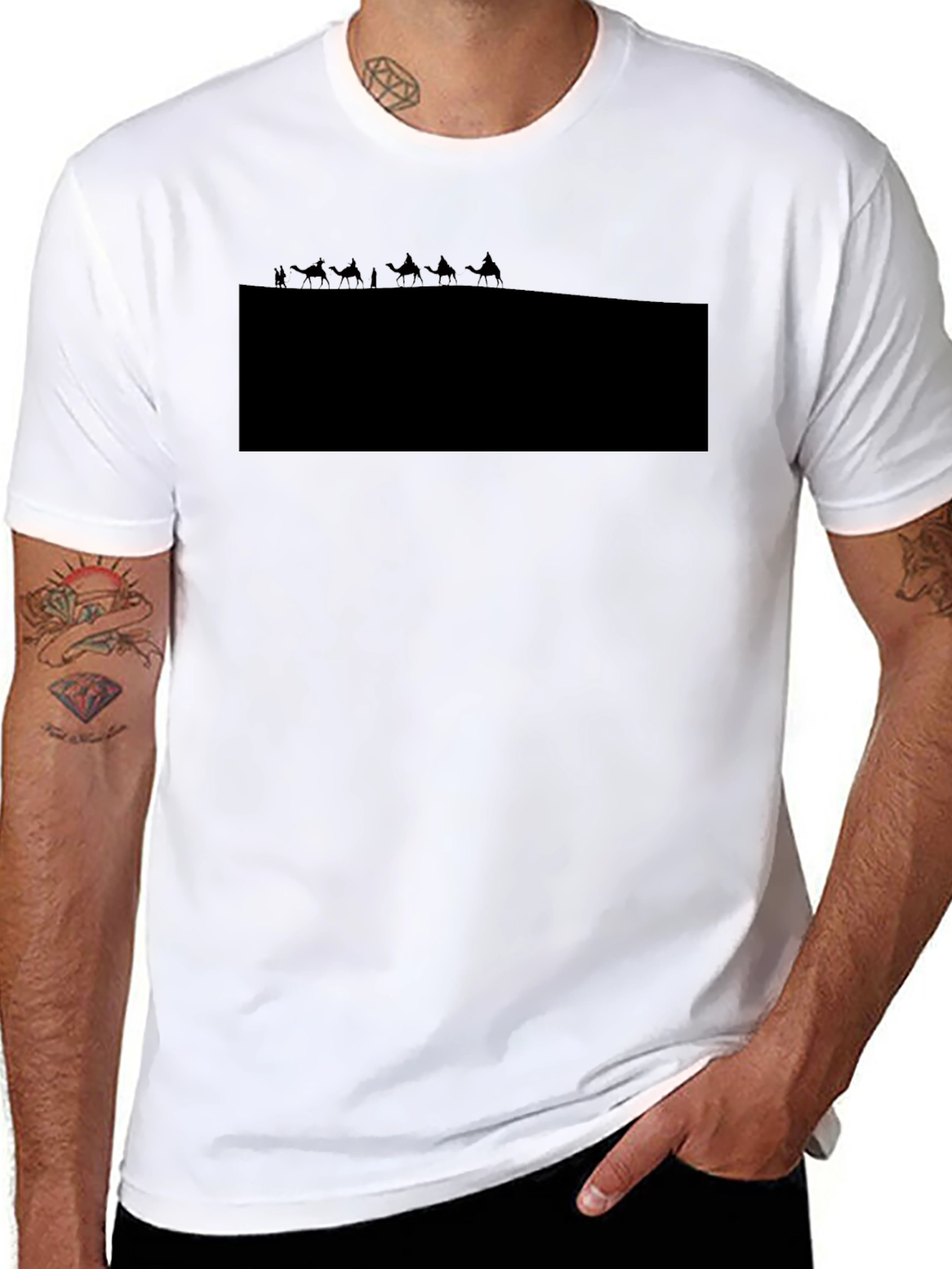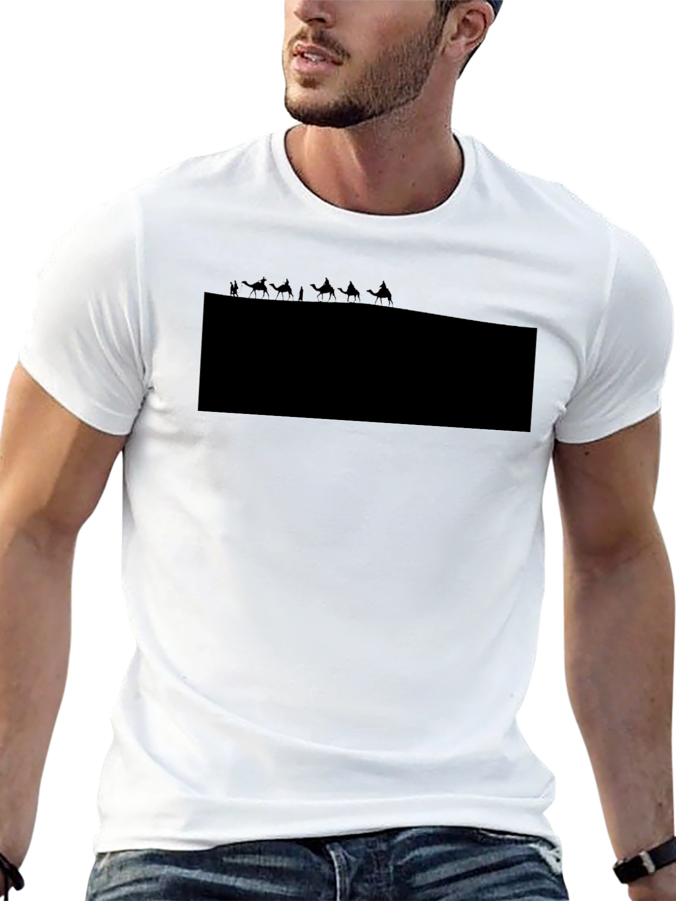 Descubre la elegancia y el misterio con esta camiseta negra de manga corta. Presenta un diseño único de una caravana de camellos silueteados en el desierto, evocando aventuras exóticas. Perfecta para aquellos que buscan un estilo distintivo y original. Su tejido suave y cómodo la hace ideal para el uso diario, ya sea para una salida casual o para expresar tu individualidad. Combina esta camiseta con tus jeans favoritos o pantalones casuales para un look relajado pero con un toque de intriga. ¡Lleva contigo la magia del desierto!
