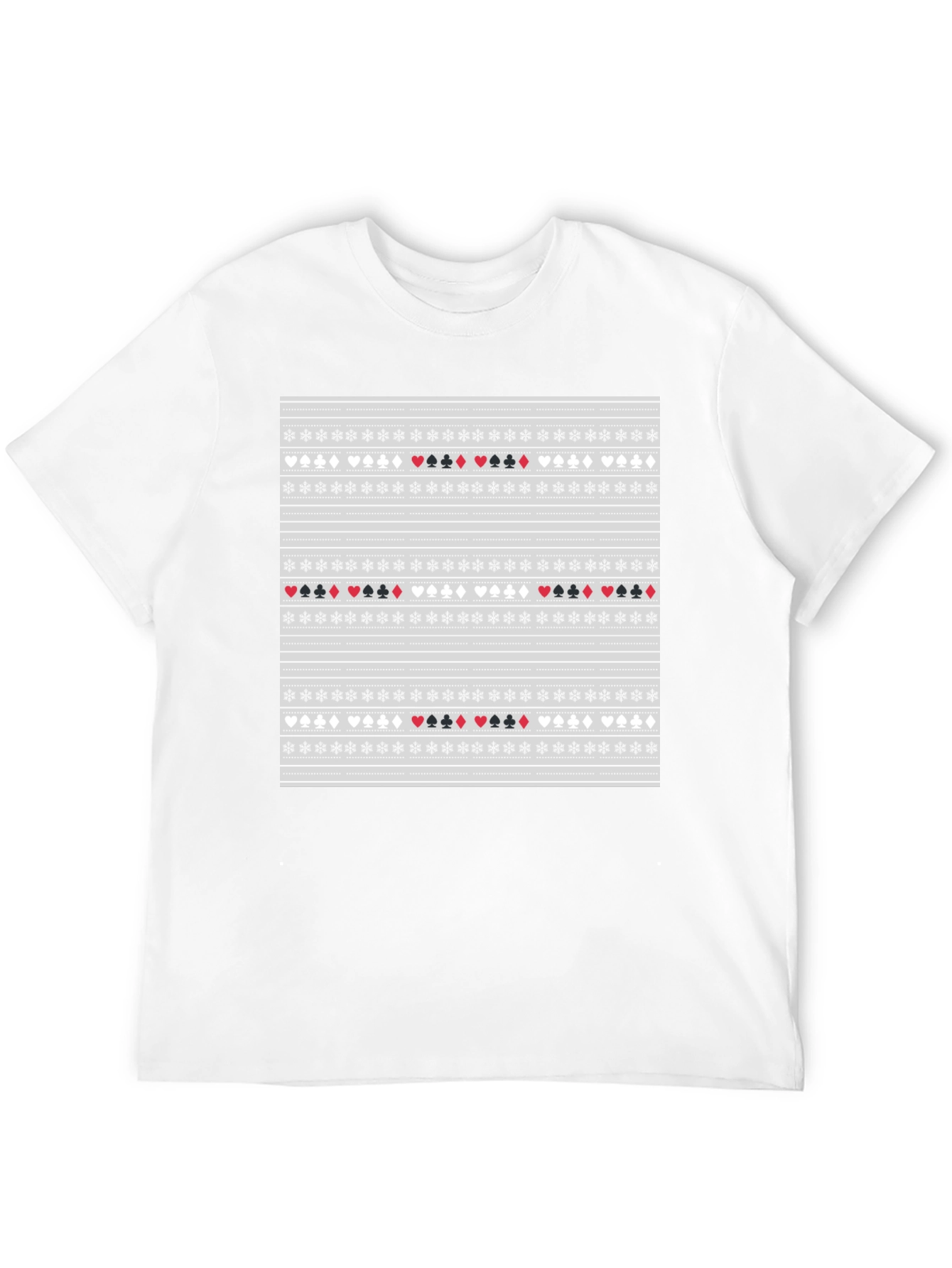 Luce esta original camiseta negra con un diseño único inspirado en las cartas de póker. El estampado presenta corazones, diamantes, tréboles y picas intercalados con motivos de copos de nieve, creando un patrón llamativo y distintivo. Ideal para amantes del juego y aquellos que buscan un toque diferente en su vestuario. Fabricada con materiales suaves y cómodos, esta camiseta de manga corta es perfecta para el uso diario, ya sea para una salida casual o para una noche de juegos con amigos. Destaca entre la multitud con este diseño divertido y elegante que seguro llamará la atención.