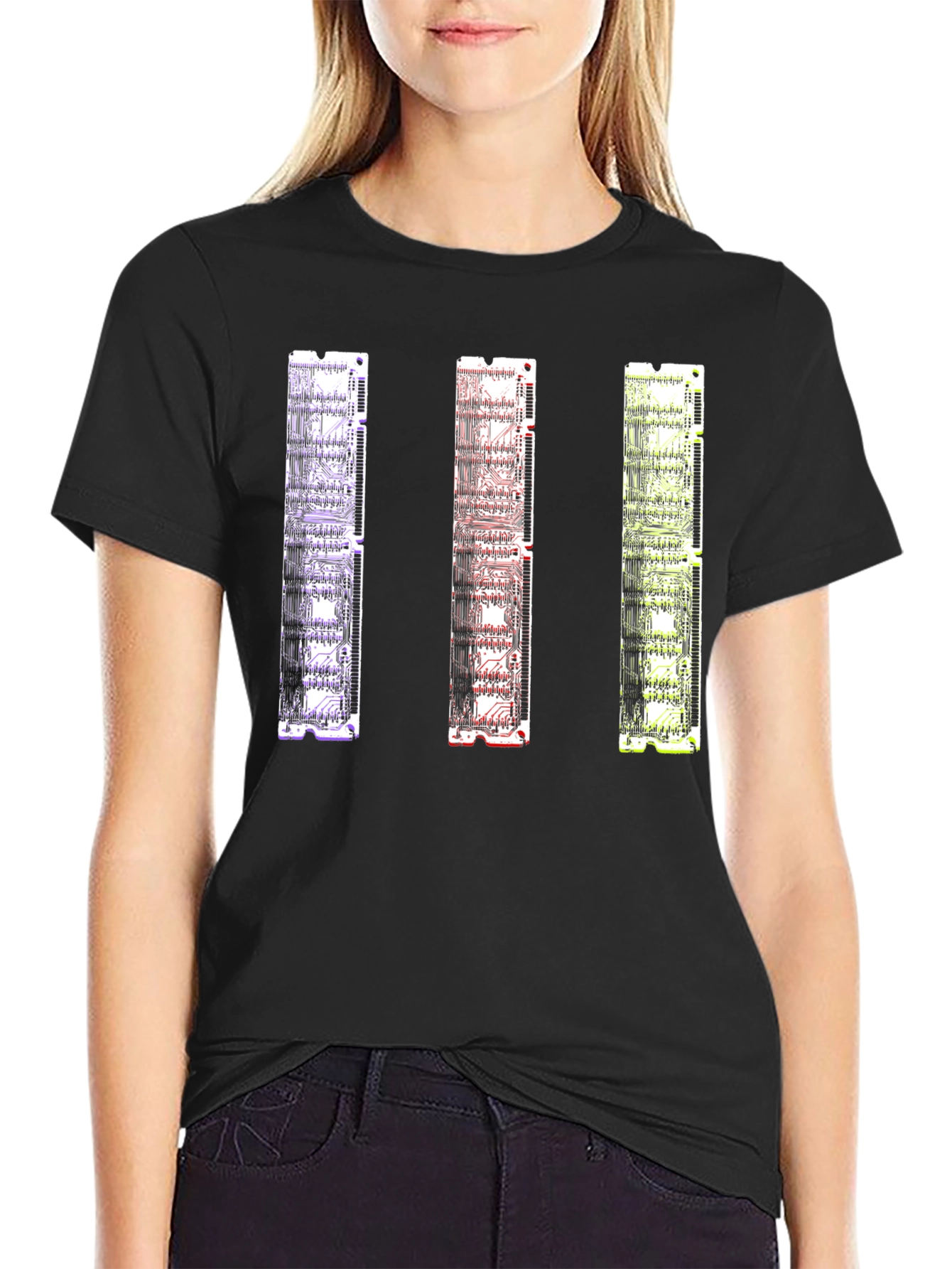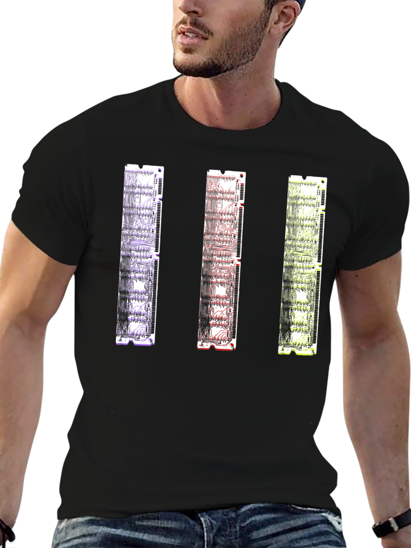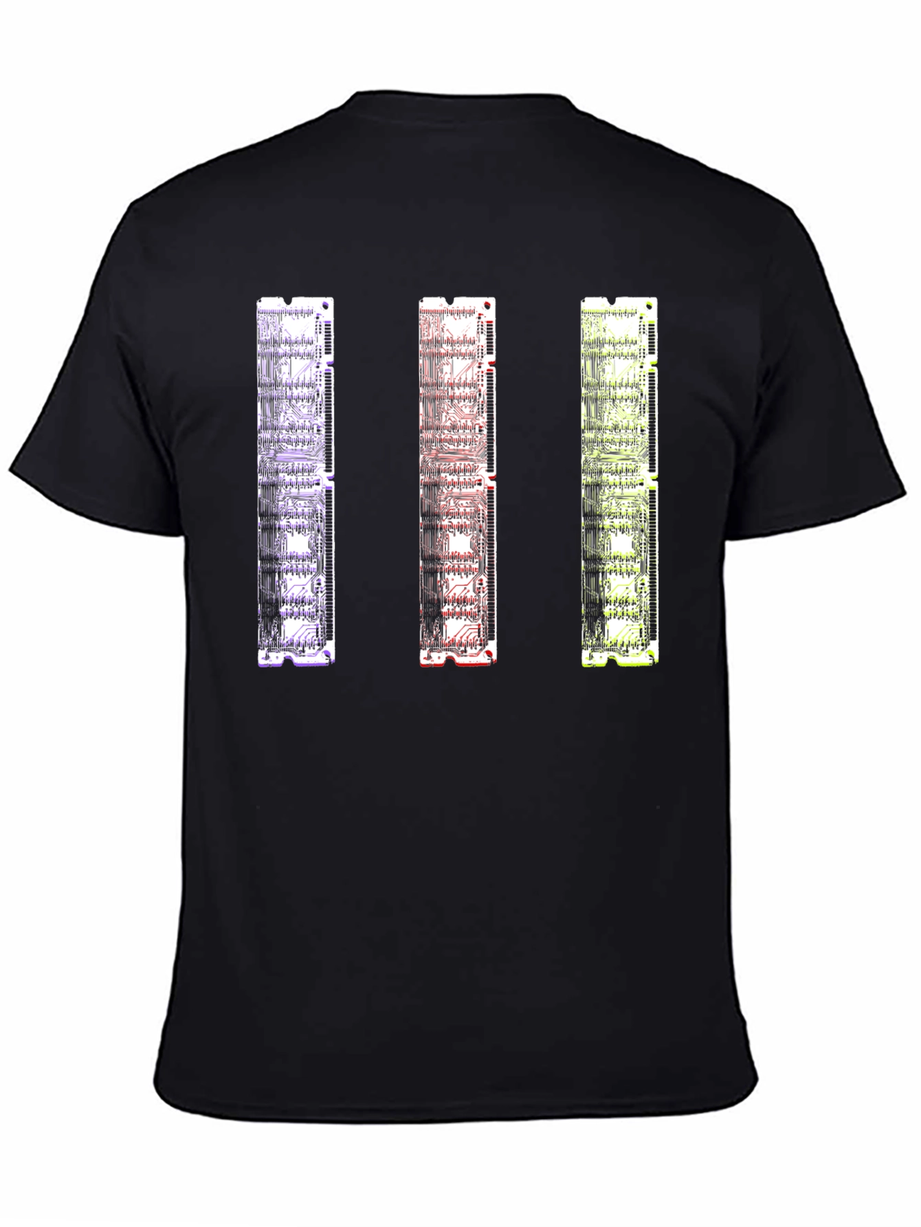 Esta camiseta negra presenta un diseño llamativo y moderno de tres módulos de memoria RAM abstractos y coloridos. Fabricada con un tejido suave y cómodo, esta camiseta de corte clásico es perfecta para el uso diario y es ideal para los amantes de la tecnología y la informática. Su diseño único la convierte en una prenda que llamará la atención y mostrará tu pasión por el mundo digital. Combínala con tus jeans favoritos o úsala para eventos informales. Un regalo perfecto para programadores, ingenieros y gamers.