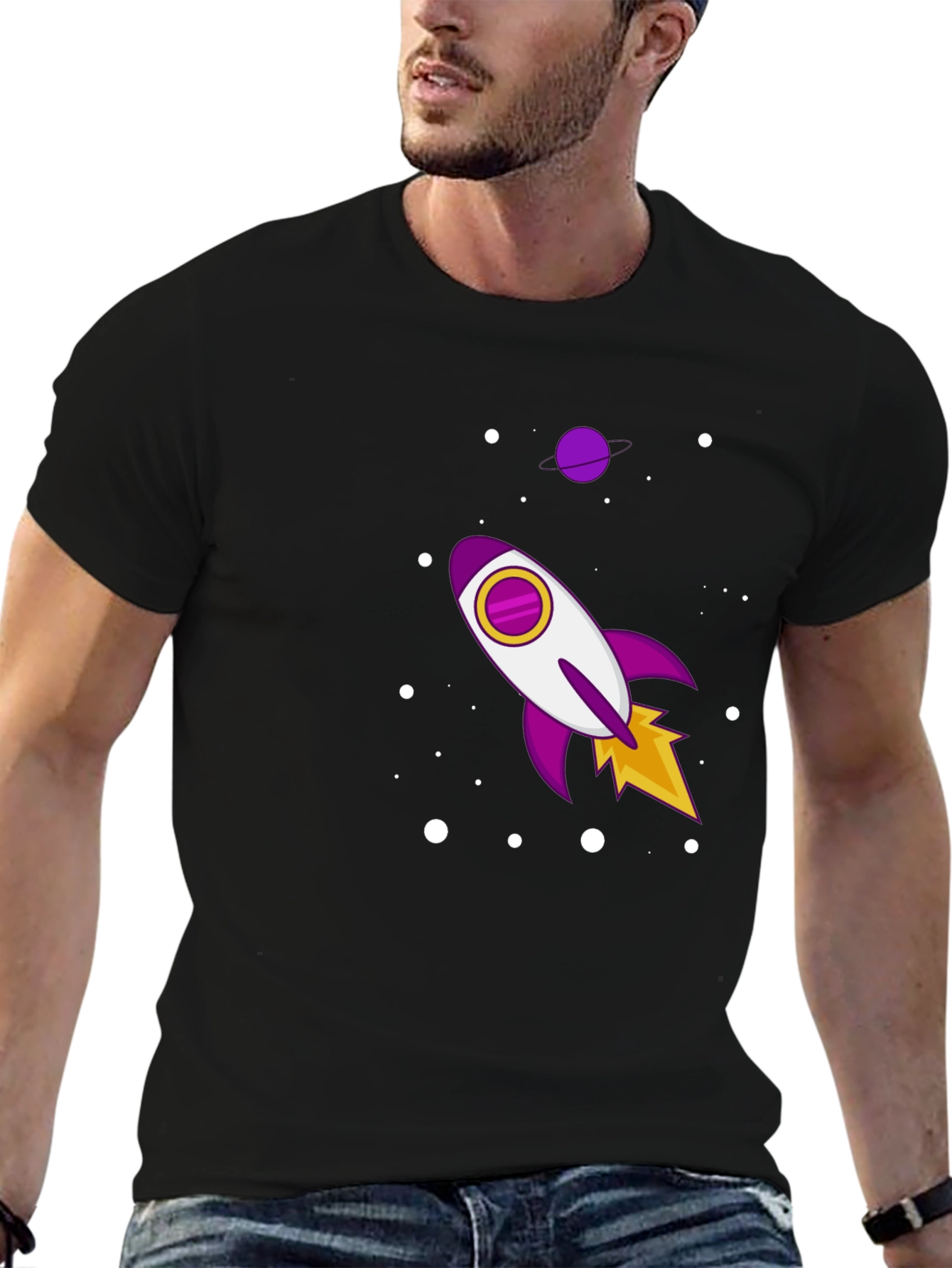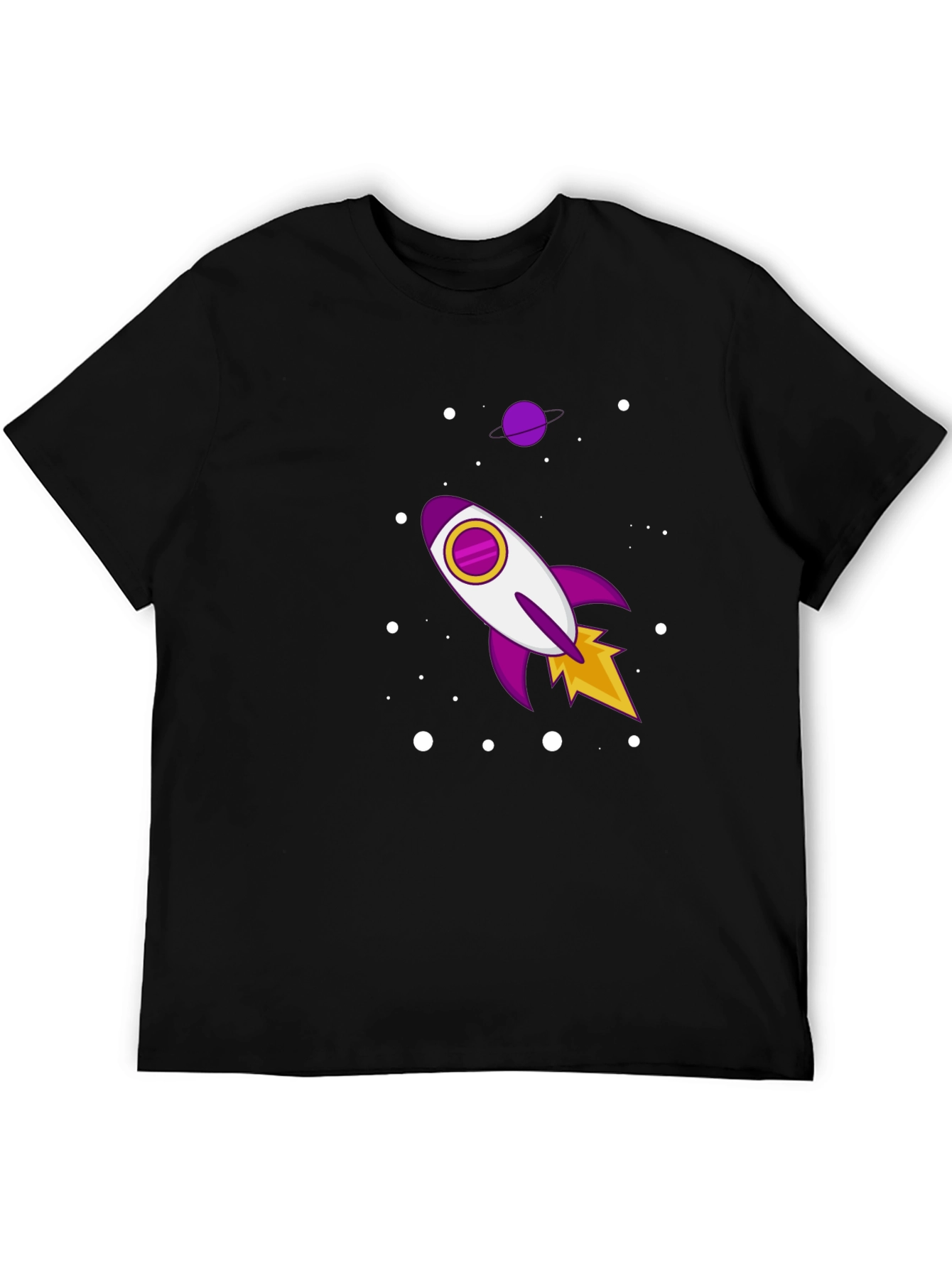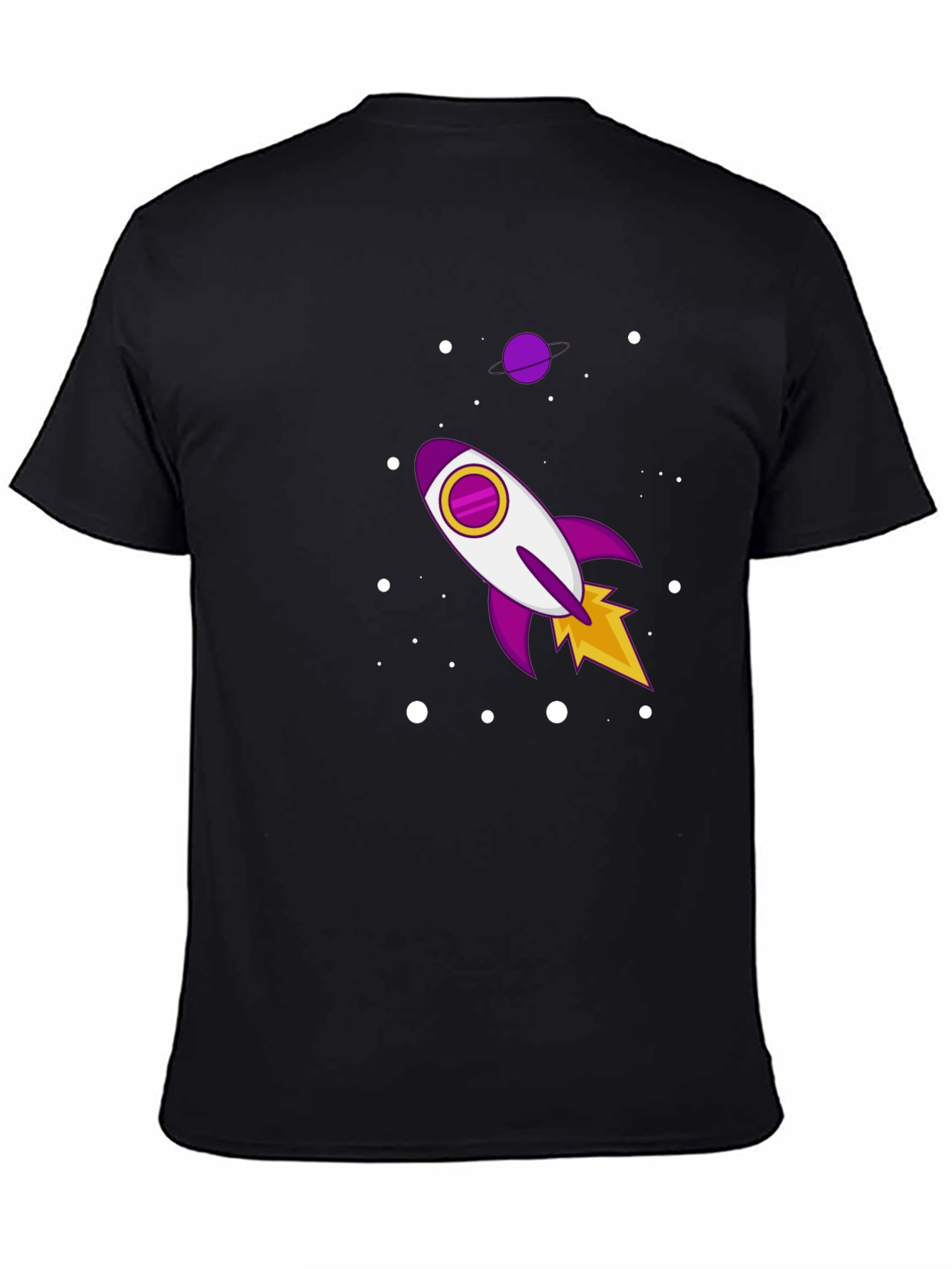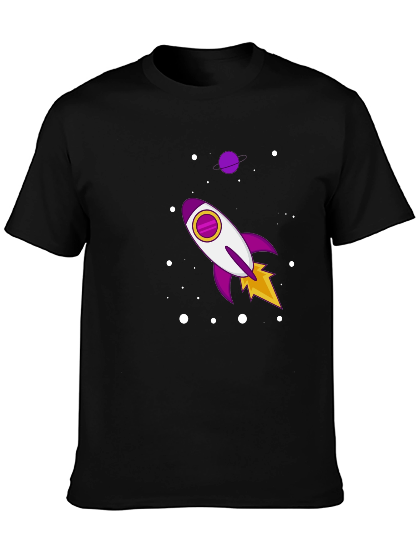 Eleva tu estilo con esta camiseta negra de manga corta. Confeccionada en tela suave al tacto, esta camiseta presenta un diseño llamativo de un cohete espacial en tonos morados, blancos y amarillos, rodeado de puntos blancos que simulan estrellas. Perfecta para los amantes del espacio y la moda, esta camiseta casual es ideal para usar a diario, ya sea para salir con amigos o simplemente relajarte en casa. Su diseño único te permitirá destacar y expresar tu personalidad de manera divertida y original. ¡Atrévete a lucir diferente con esta prenda!