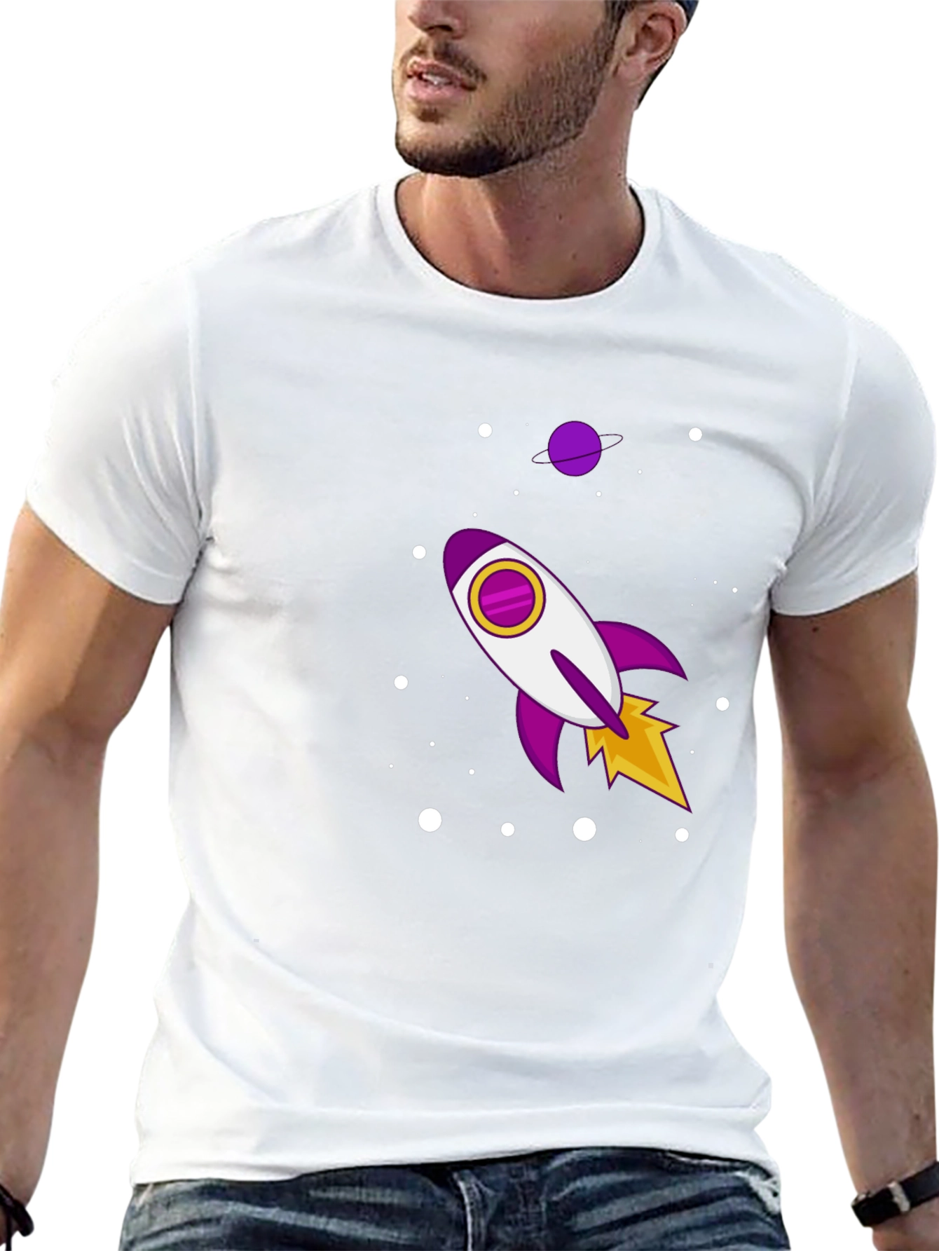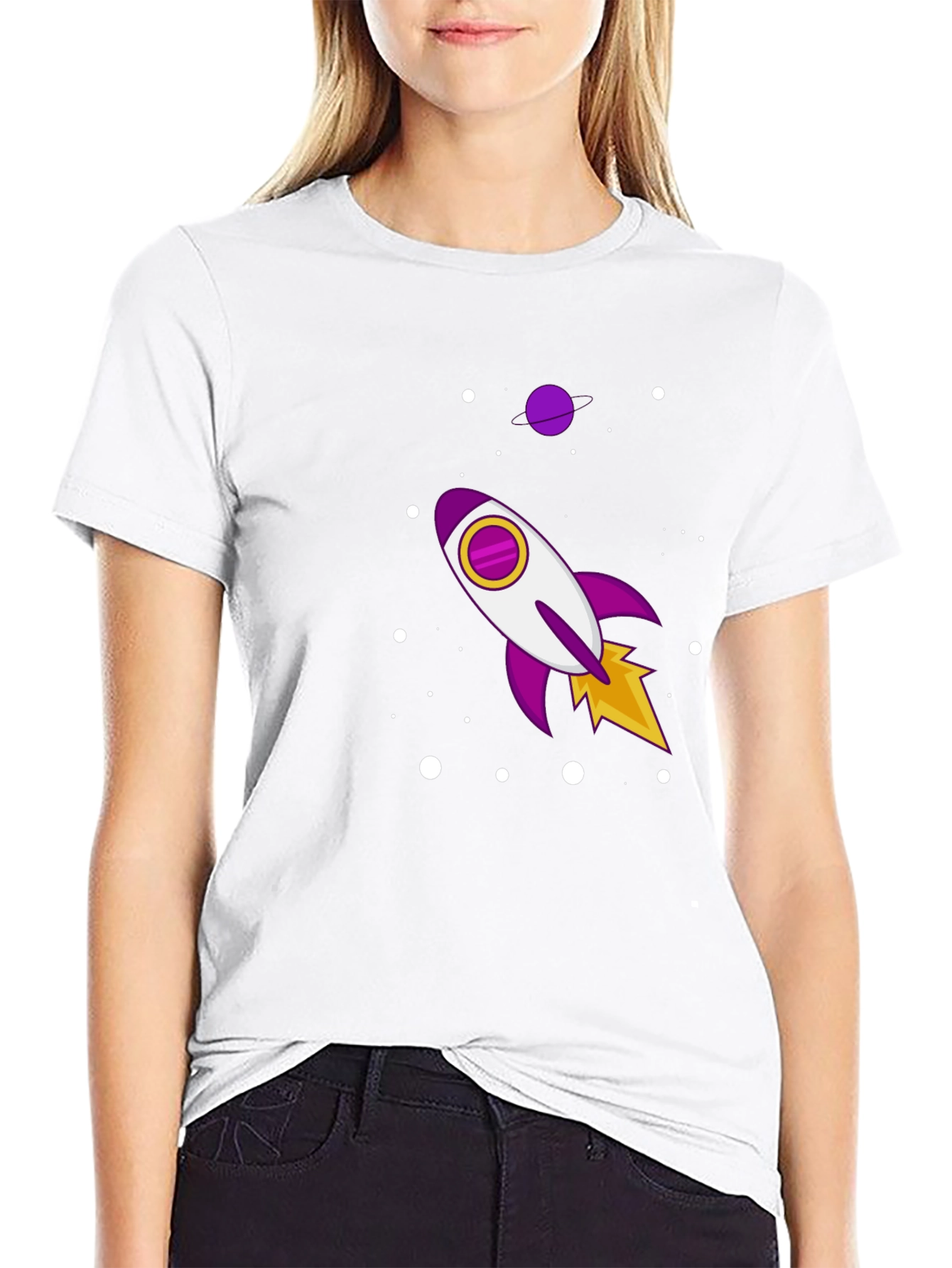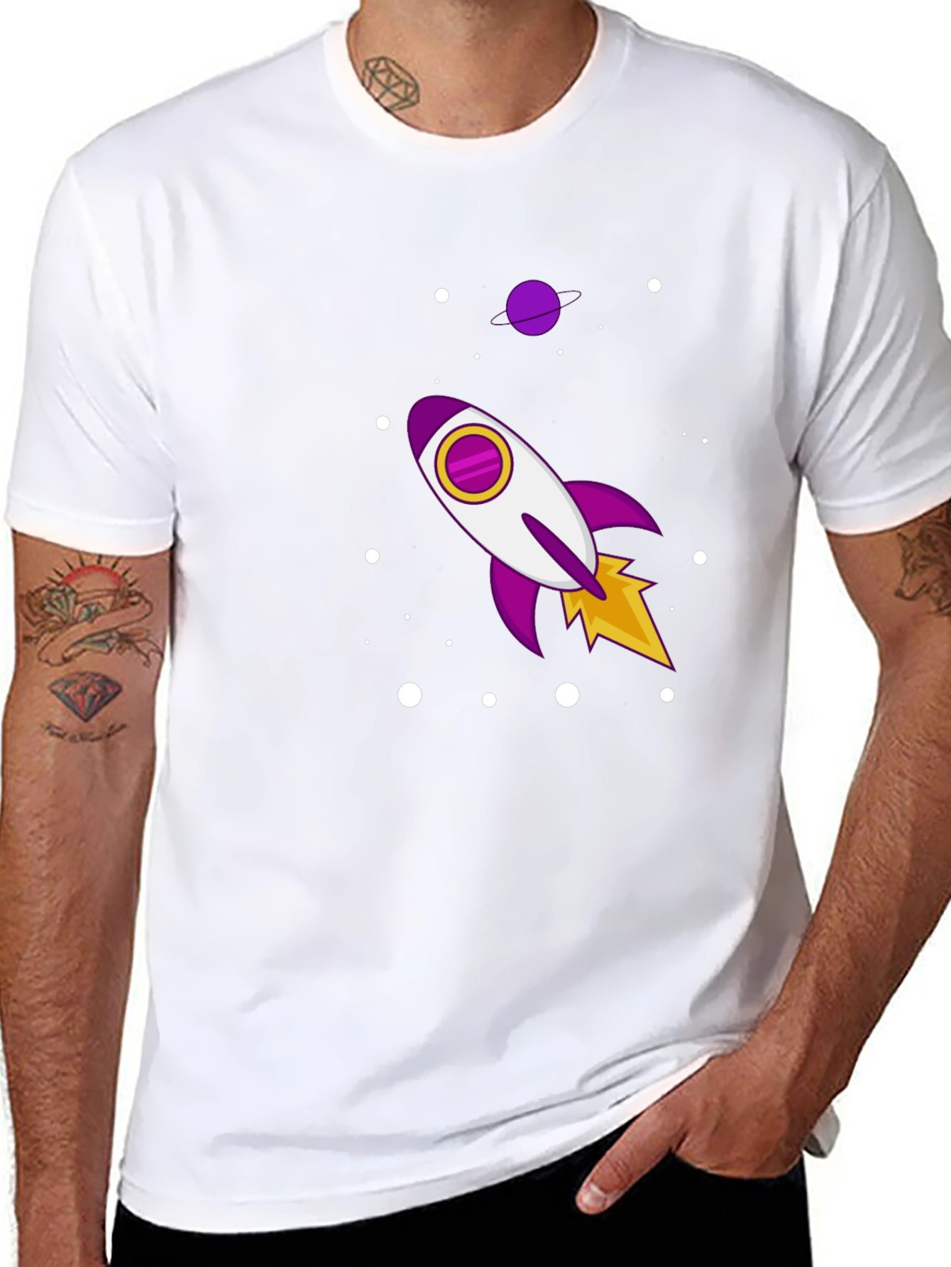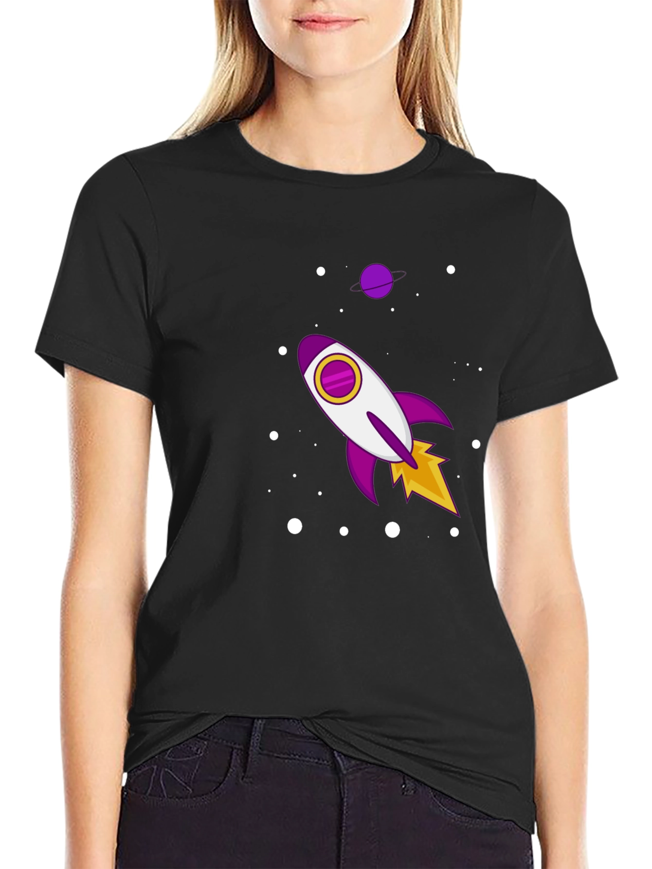 Eleva tu estilo con esta camiseta negra de manga corta. Confeccionada en tela suave al tacto, esta camiseta presenta un diseño llamativo de un cohete espacial en tonos morados, blancos y amarillos, rodeado de puntos blancos que simulan estrellas. Perfecta para los amantes del espacio y la moda, esta camiseta casual es ideal para usar a diario, ya sea para salir con amigos o simplemente relajarte en casa. Su diseño único te permitirá destacar y expresar tu personalidad de manera divertida y original. ¡Atrévete a lucir diferente con esta prenda!