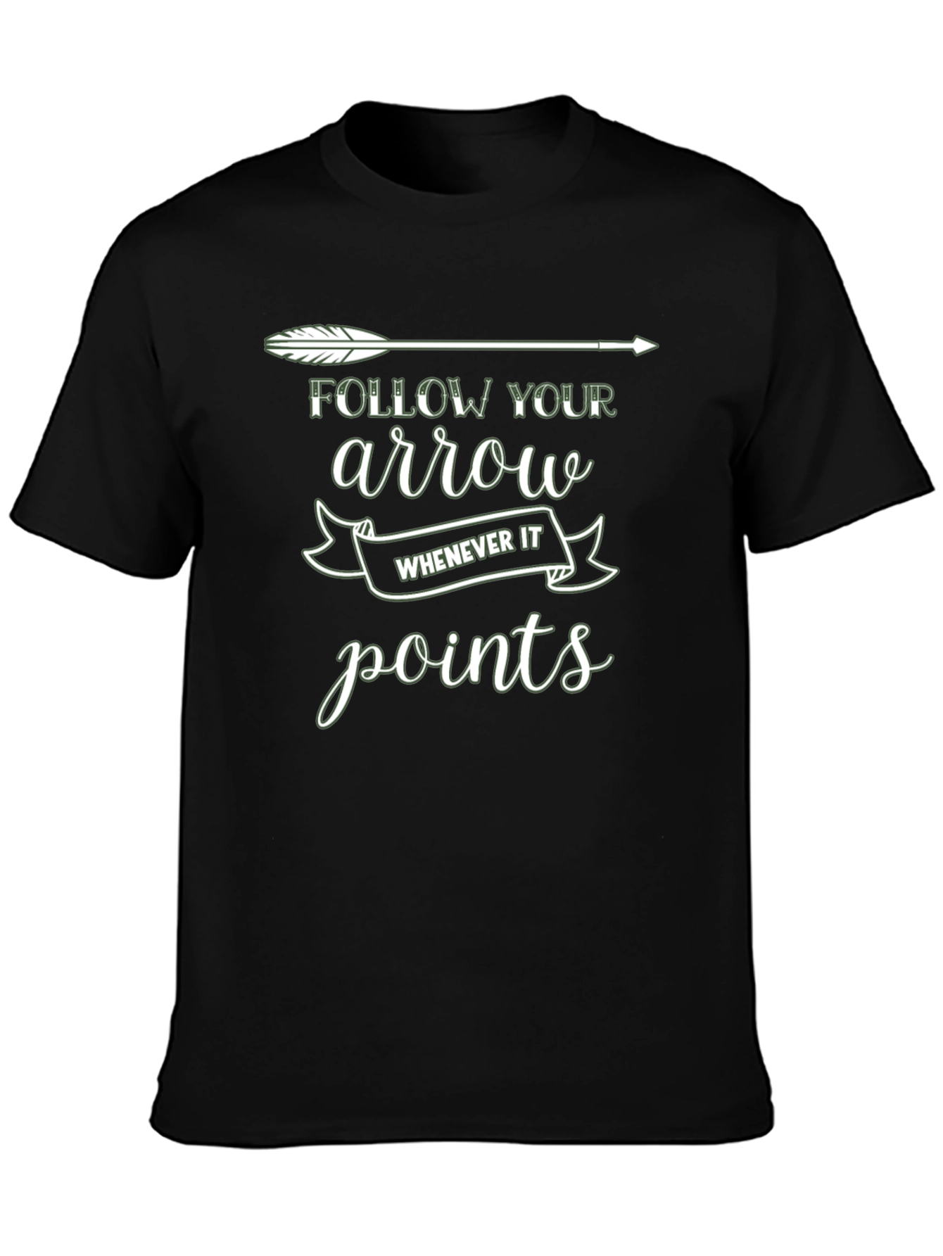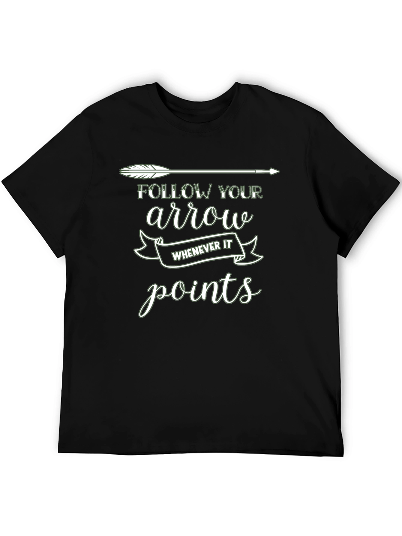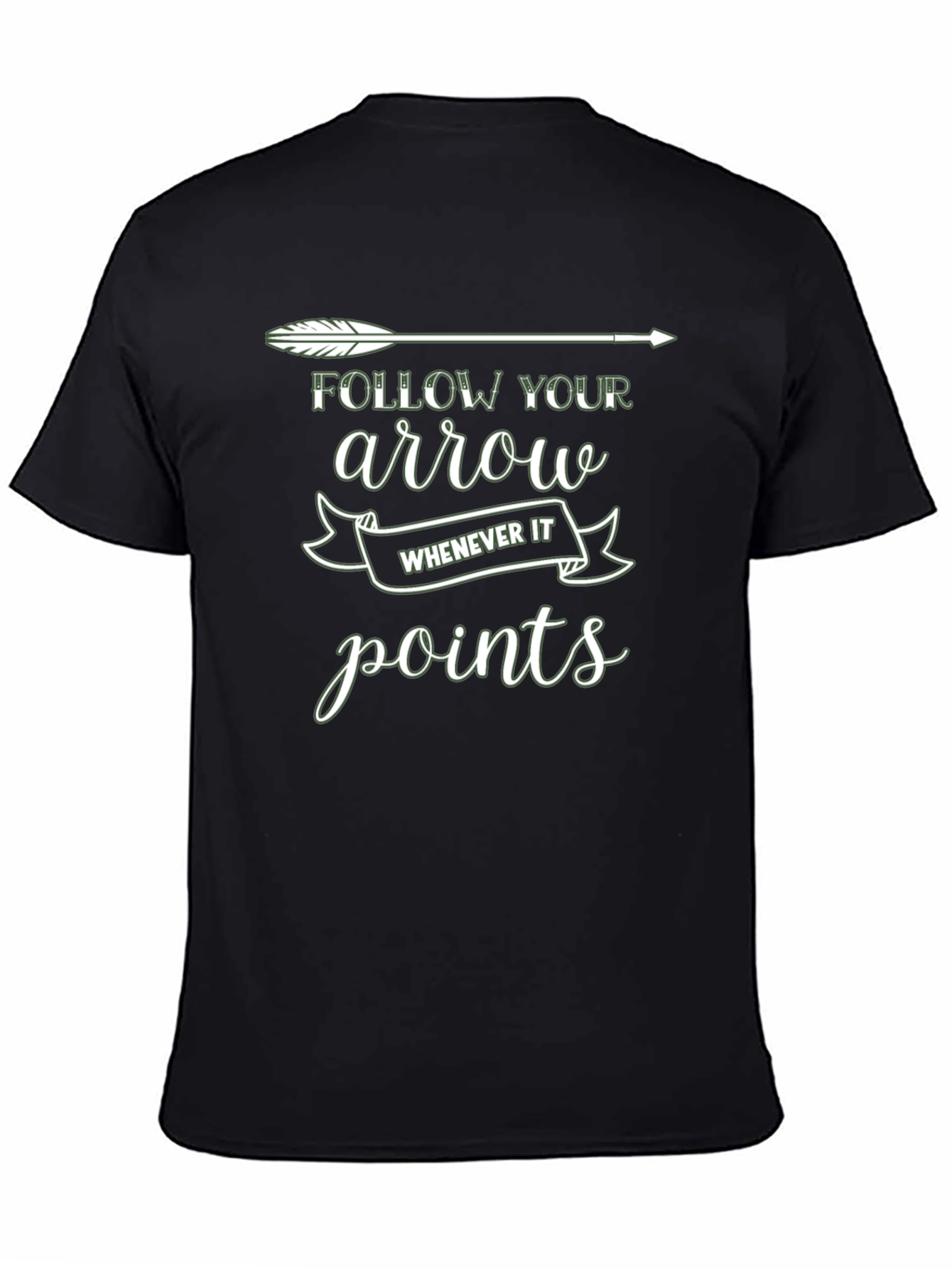 Luce esta elegante camiseta negra con un diseño único y motivador. La camiseta presenta una flecha blanca estilizada en la parte superior, acompañada del texto "FOLLOW YOUR arrow WHENEVER IT points" en una tipografía moderna y atractiva. El diseño inspira a seguir tu propio camino y a tomar decisiones audaces. Fabricada con materiales suaves y cómodos, esta camiseta es perfecta para el uso diario, ya sea para salir con amigos, ir al gimnasio o simplemente relajarte en casa. Su corte clásico y versátil se adapta a cualquier estilo. ¡Añade un toque de inspiración a tu armario con esta camiseta única!