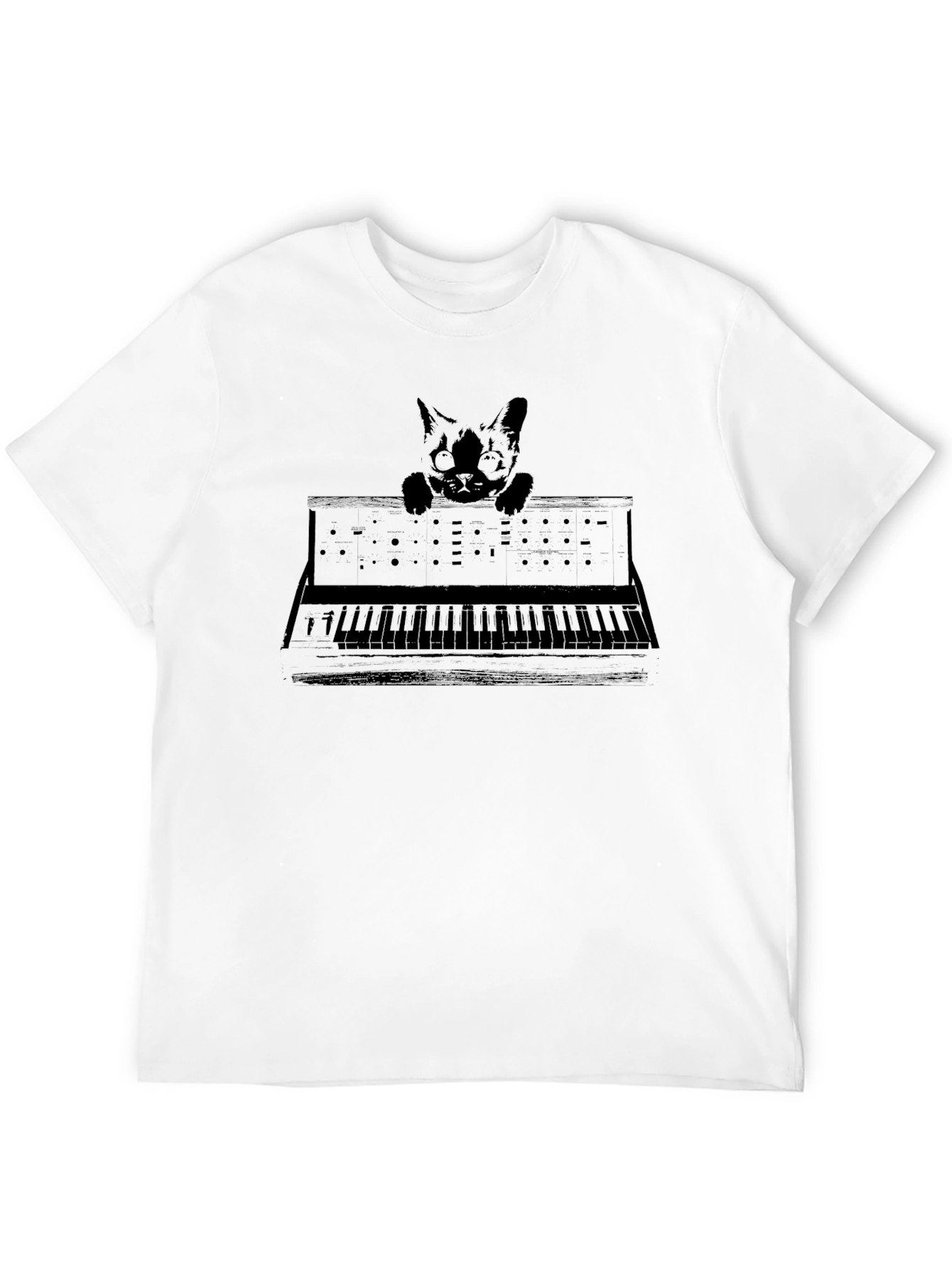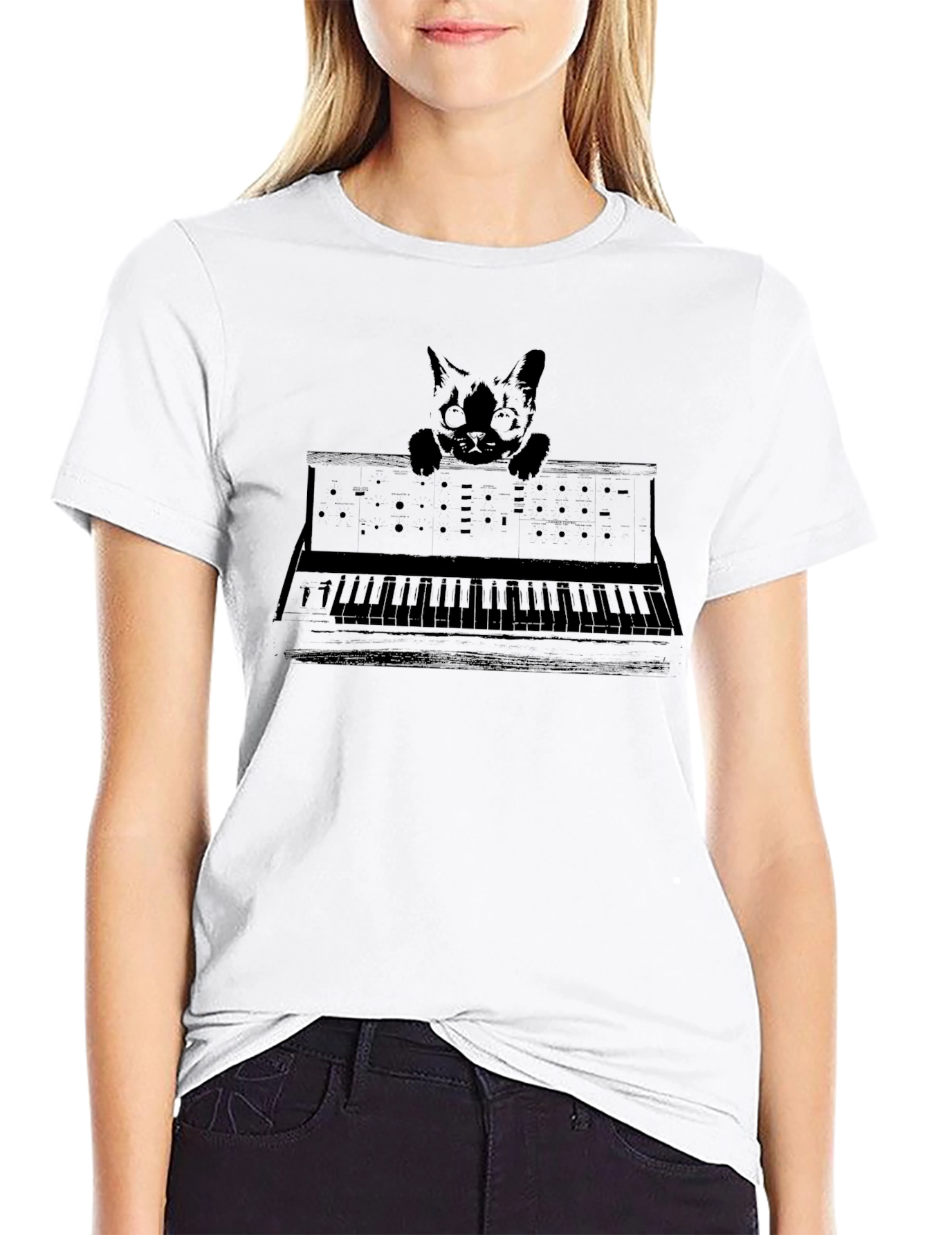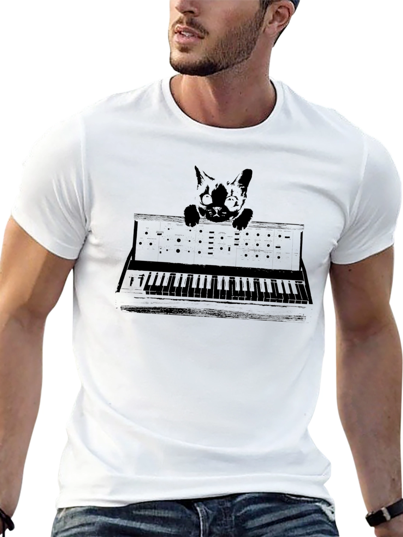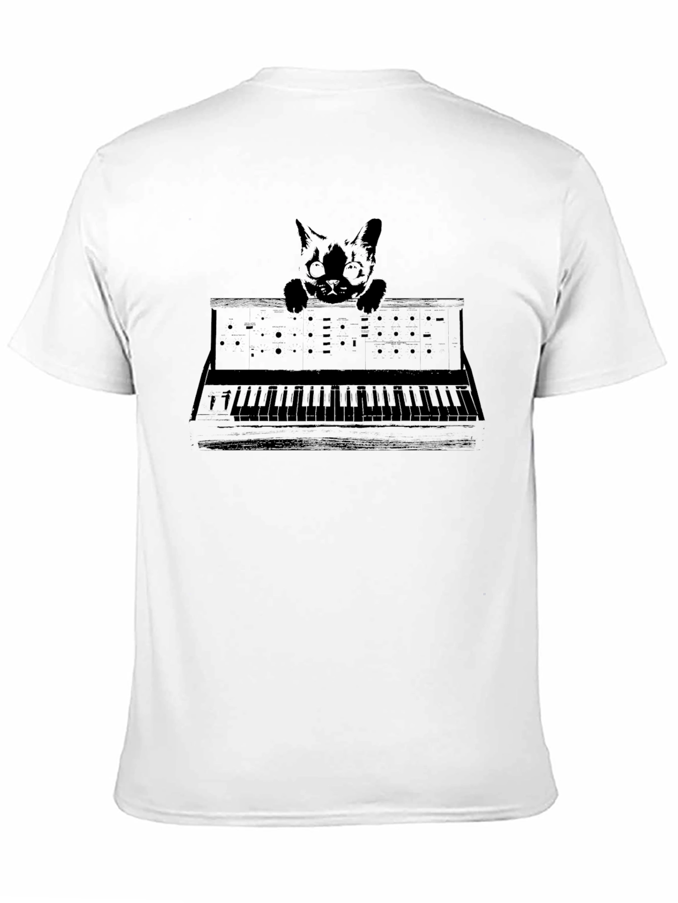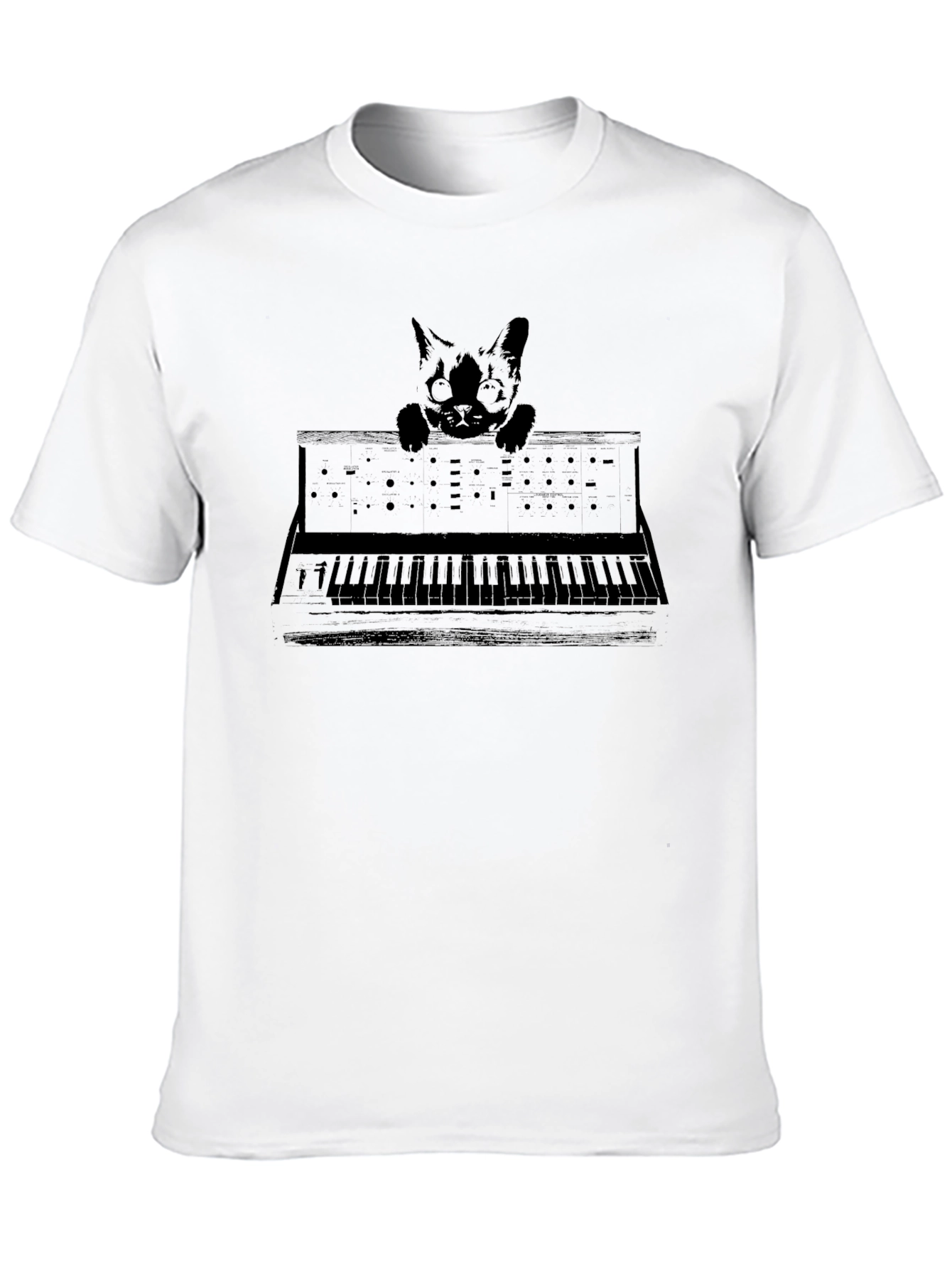 Camiseta Negra con Diseño de Gato y Sintetizador
