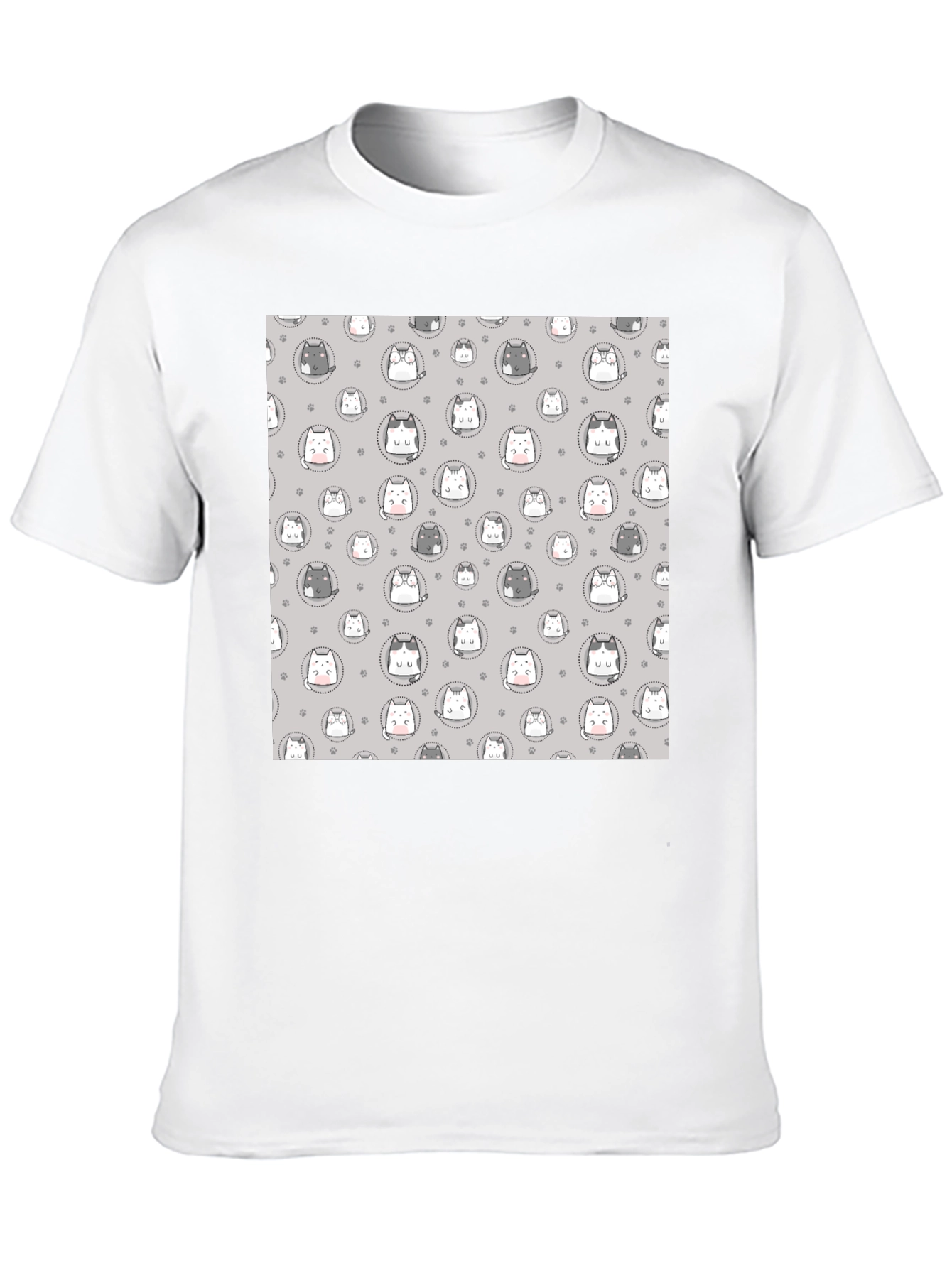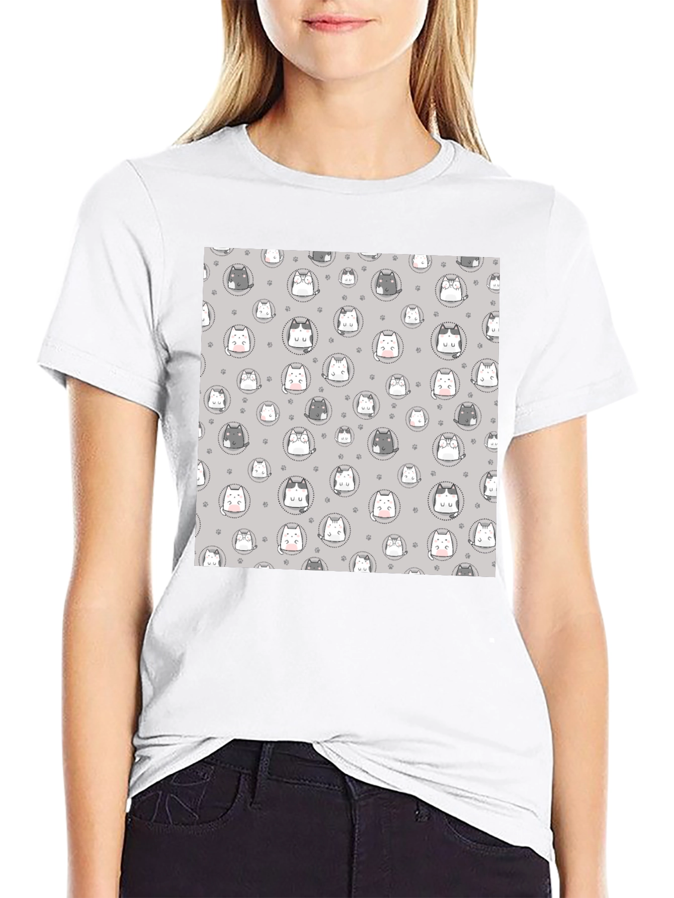 Luce esta adorable camiseta negra con un divertido diseño de gatos kawaii. La camiseta presenta un estampado repetitivo de caras de gatos estilizadas en tonos grises, blancos y rosados, sobre un fondo gris claro. Cada gato está encerrado en un círculo, creando un patrón encantador y juguetón. Confeccionada con materiales suaves y cómodos, esta camiseta es perfecta para el uso diario, ya sea para relajarse en casa, salir con amigos o mostrar tu amor por los felinos. Añade un toque de ternura y originalidad a tu vestuario con esta prenda única. Ideal para jóvenes y adultos que buscan un estilo casual y divertido.