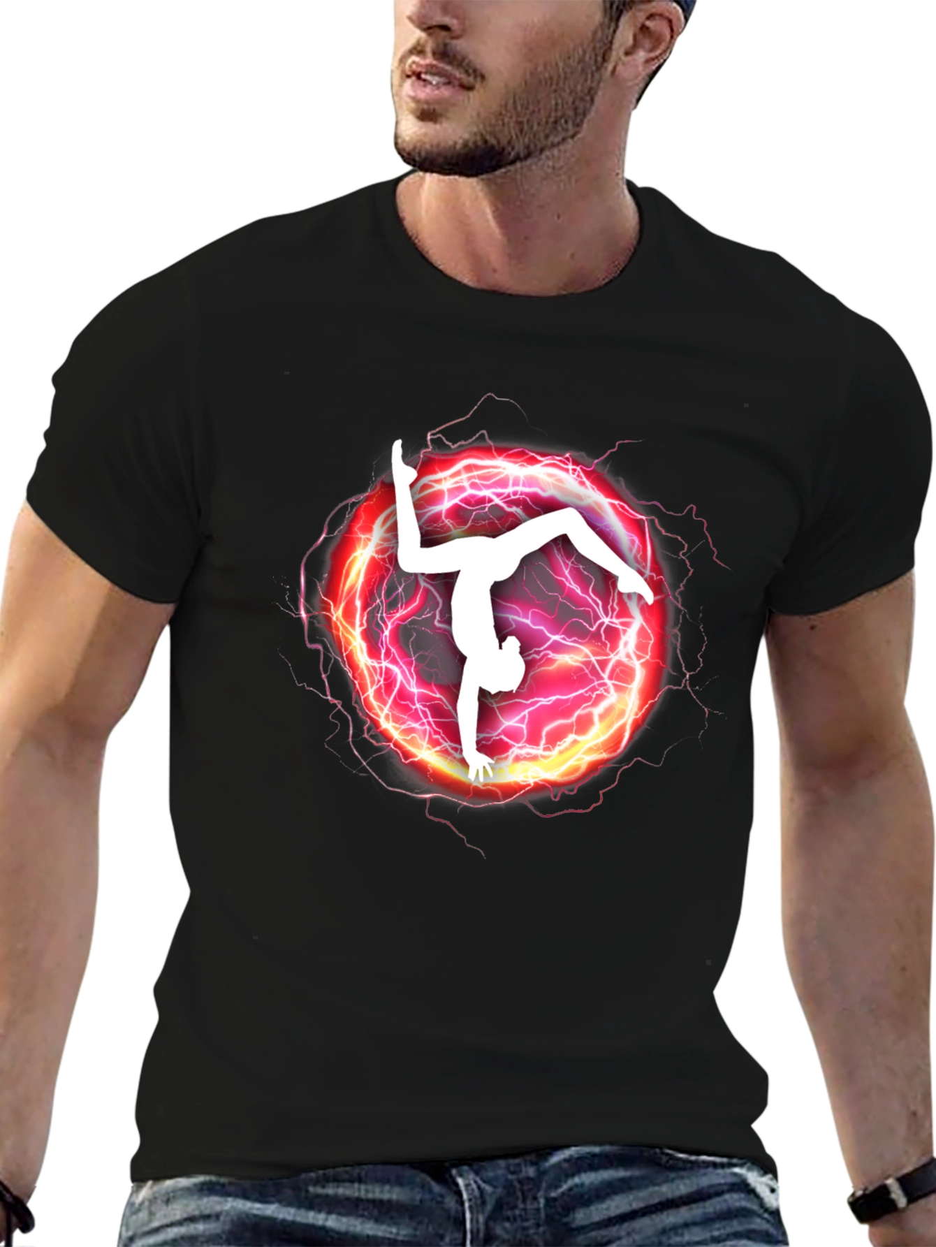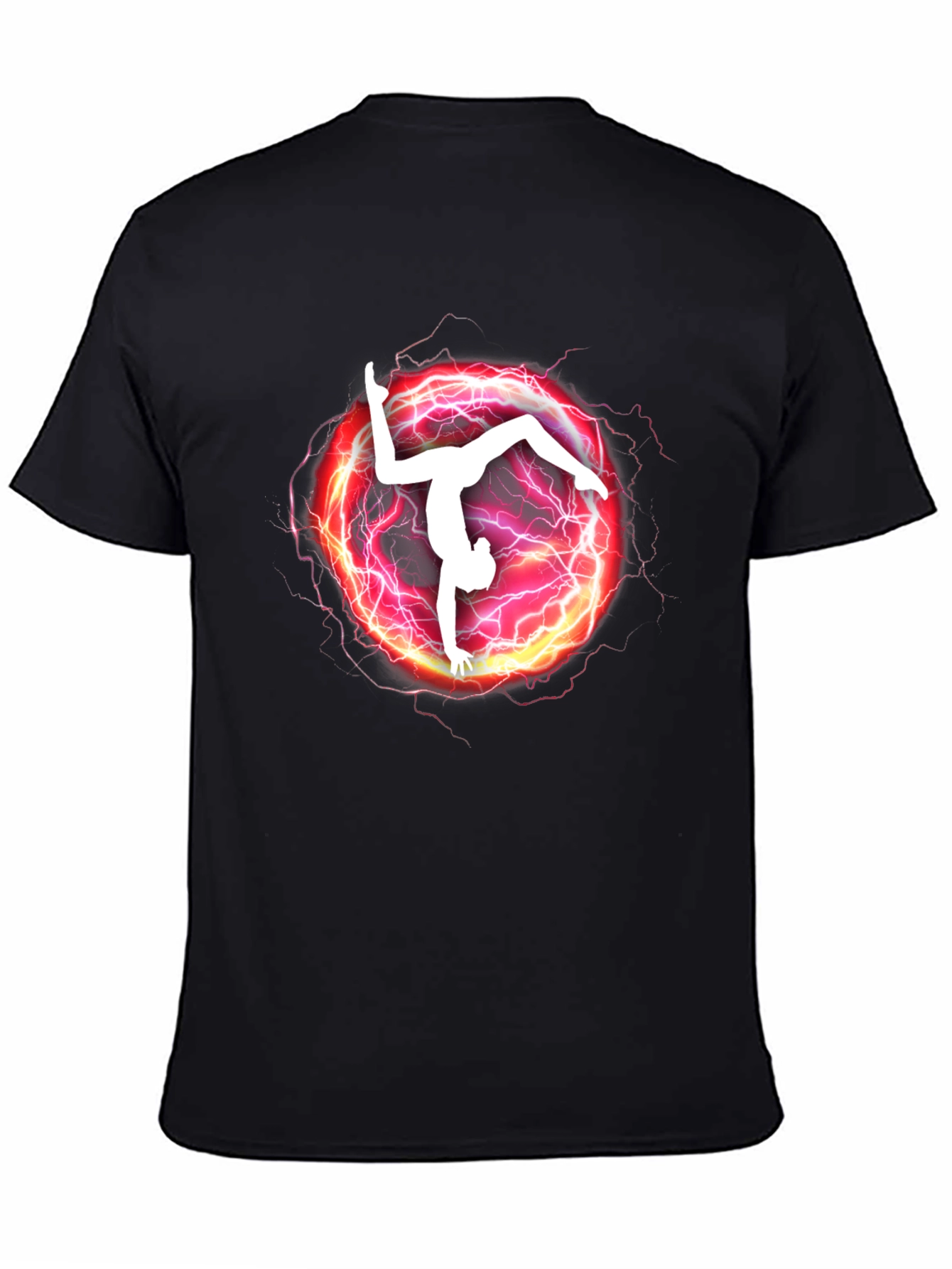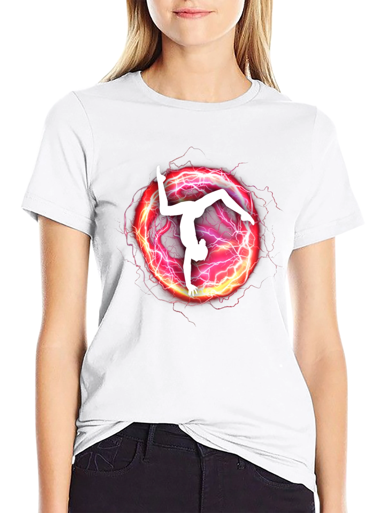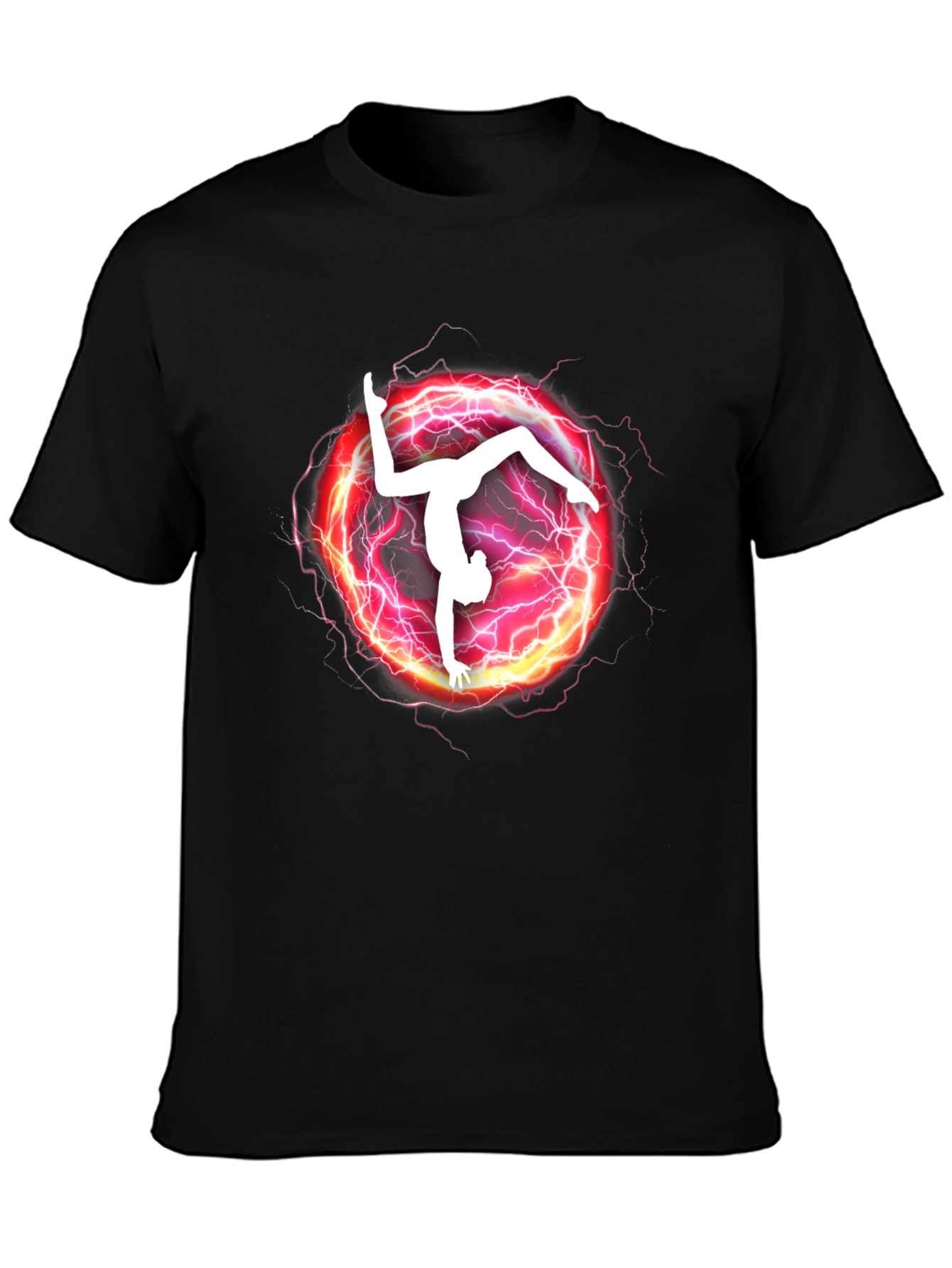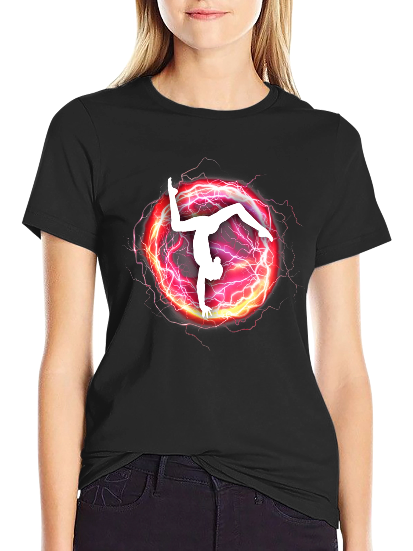 Destaca con esta camiseta negra de manga corta. Presenta un diseño audaz de una gimnasta blanca en una pose dinámica, envuelta en un círculo de energía eléctrica roja y blanca. La camiseta parece estar confeccionada en un material suave y cómodo, ideal para el uso diario o para actividades deportivas ligeras. Su diseño único la convierte en una prenda llamativa y perfecta para expresar tu pasión por la gimnasia o simplemente para añadir un toque original a tu vestuario. Combínala con tus jeans o shorts favoritos para un look casual y moderno.