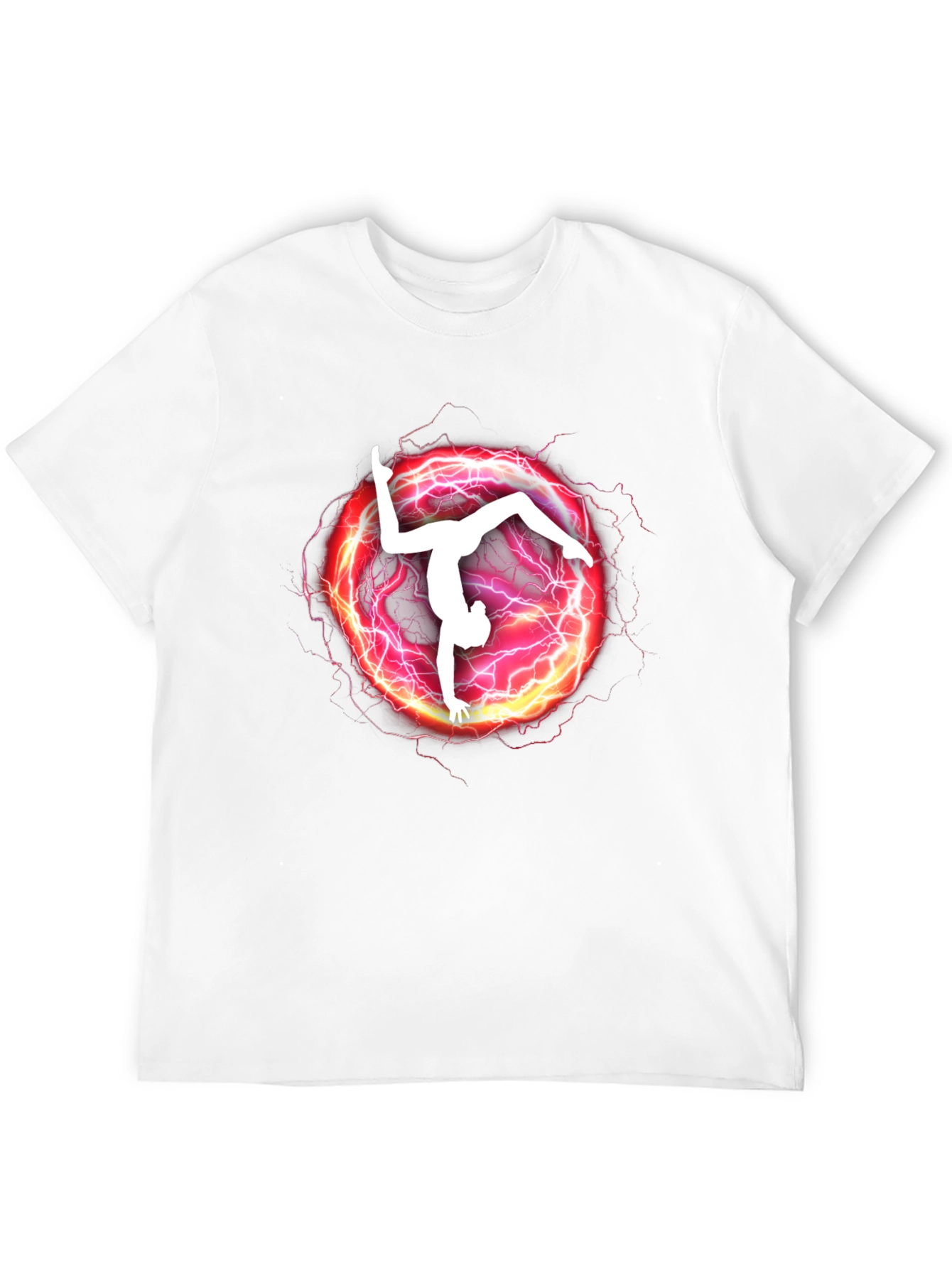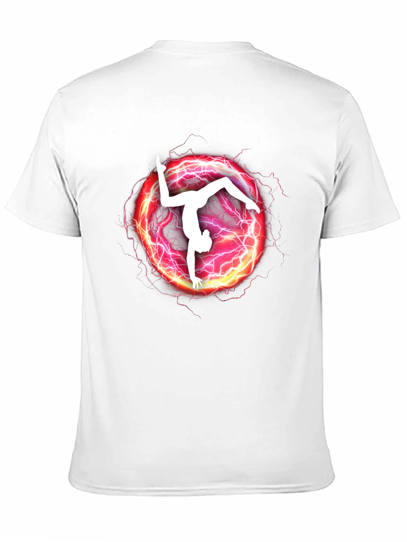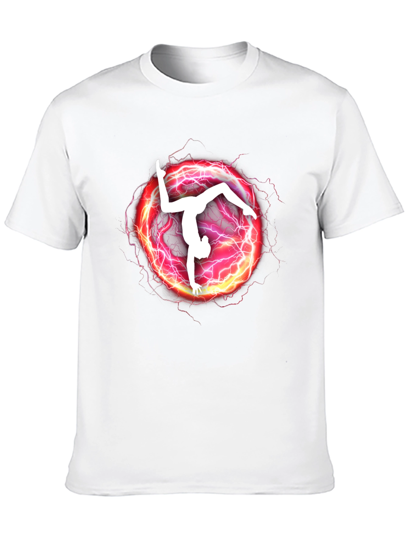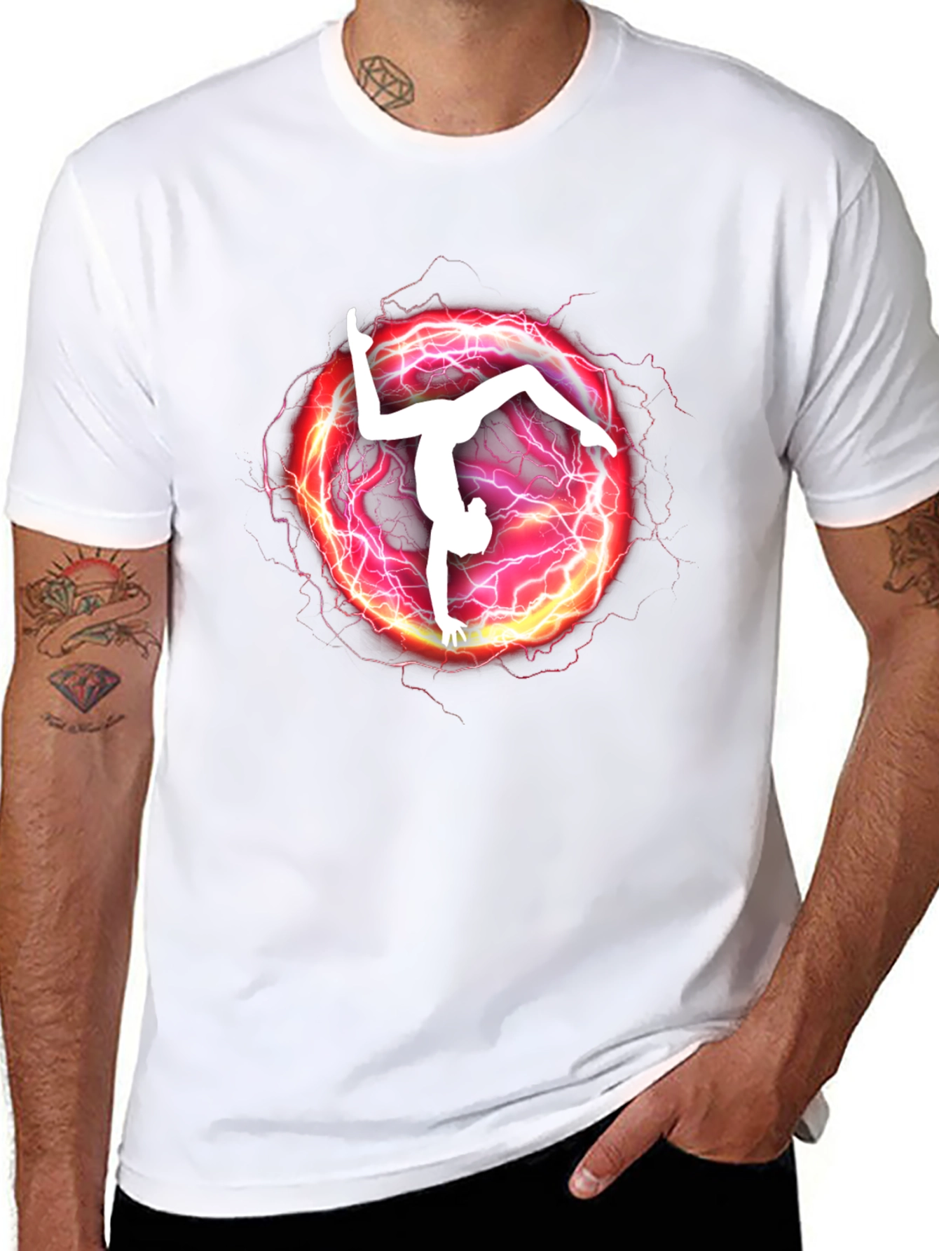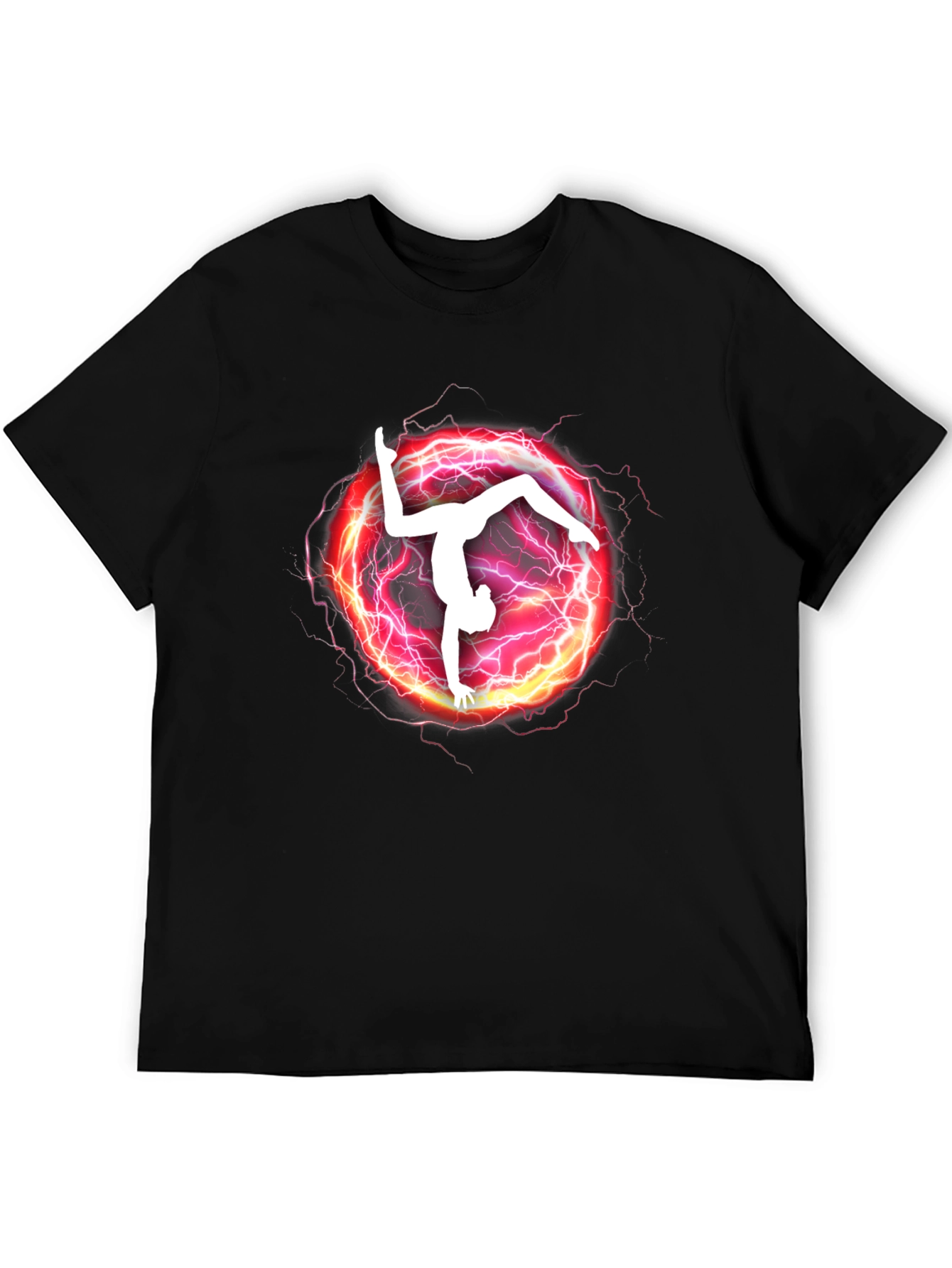 Destaca con esta camiseta negra de manga corta. Presenta un diseño audaz de una gimnasta blanca en una pose dinámica, envuelta en un círculo de energía eléctrica roja y blanca. La camiseta parece estar confeccionada en un material suave y cómodo, ideal para el uso diario o para actividades deportivas ligeras. Su diseño único la convierte en una prenda llamativa y perfecta para expresar tu pasión por la gimnasia o simplemente para añadir un toque original a tu vestuario. Combínala con tus jeans o shorts favoritos para un look casual y moderno.