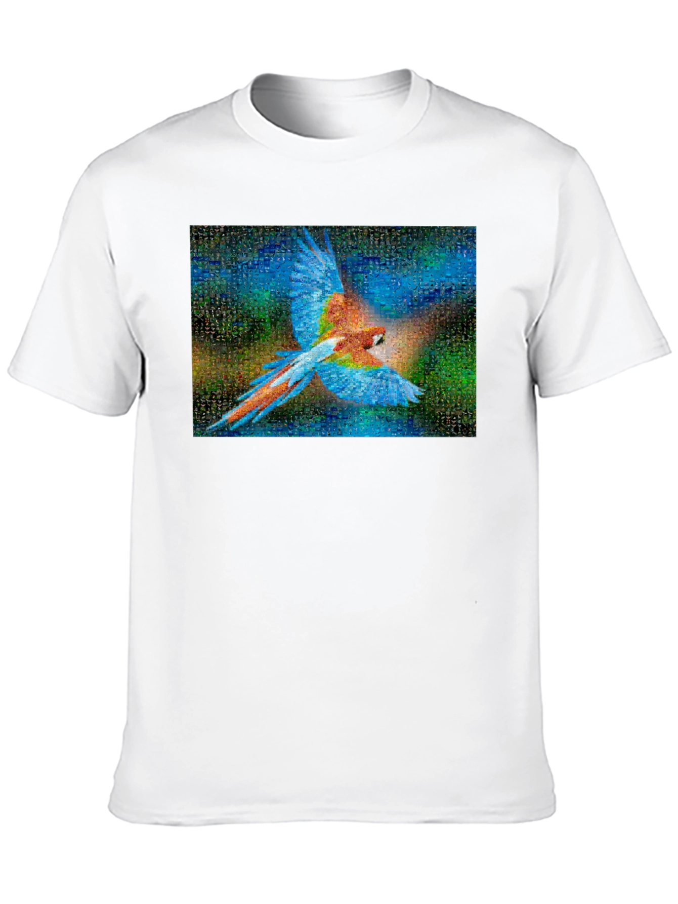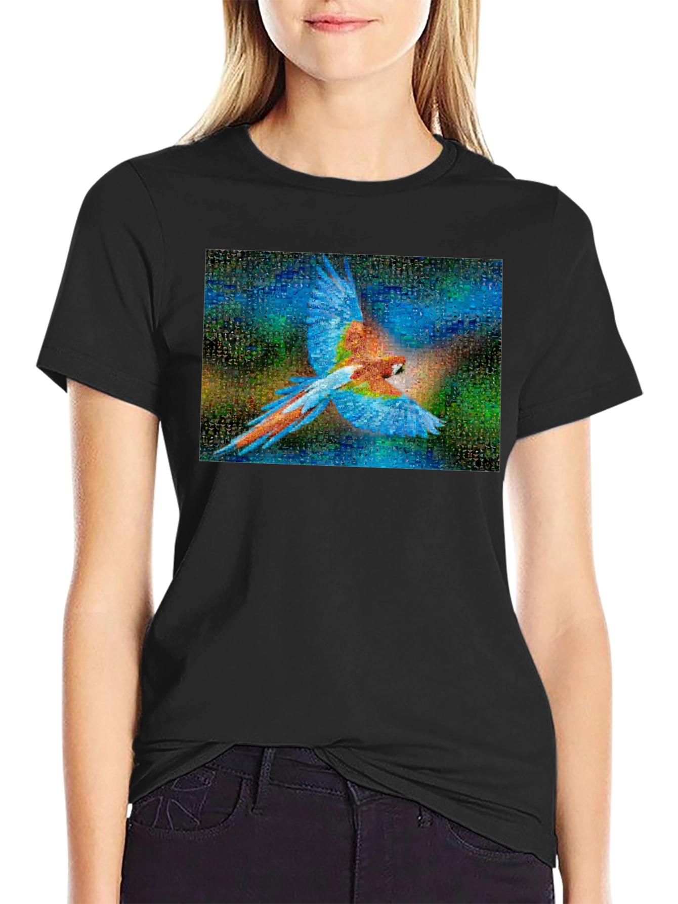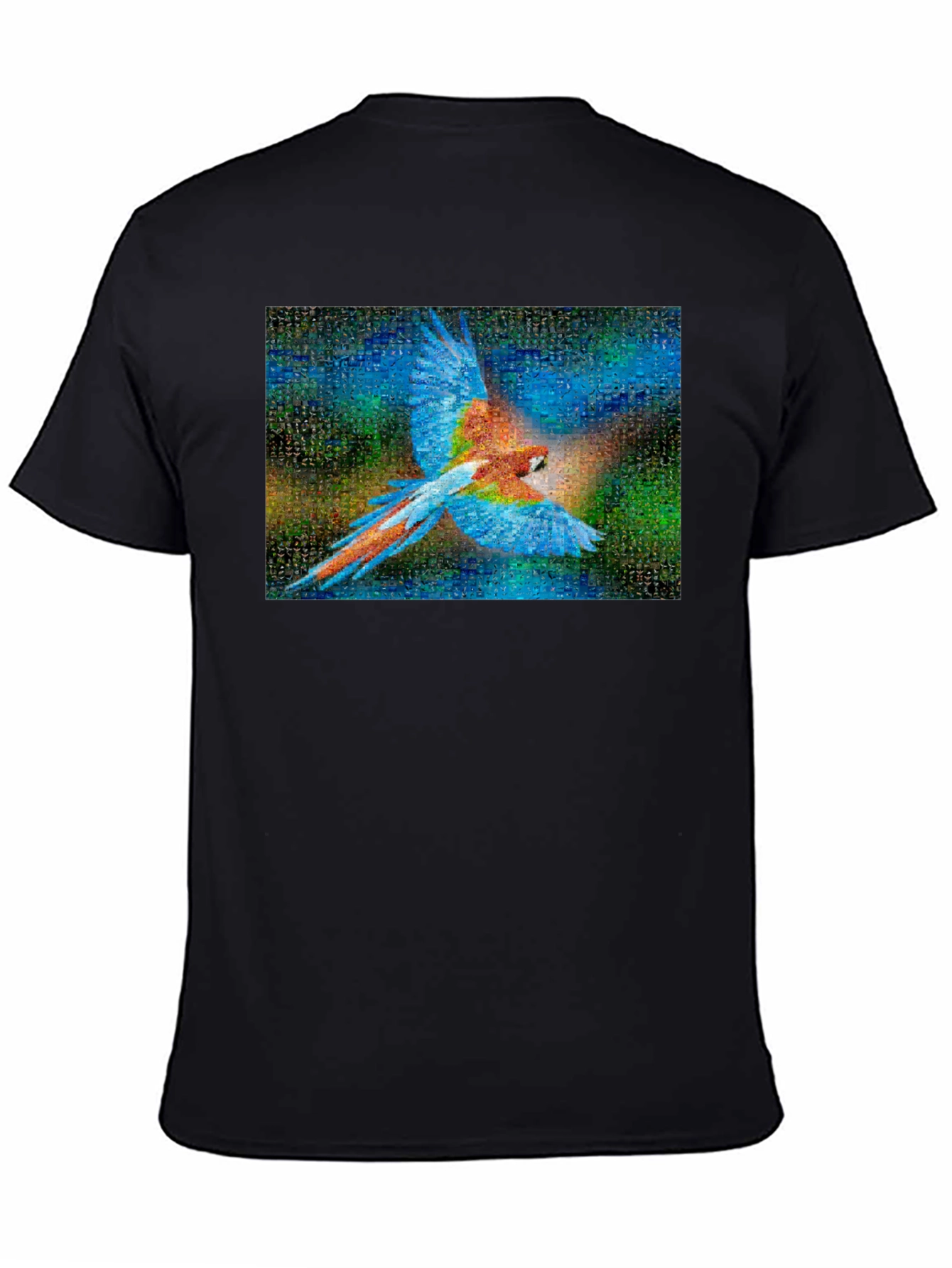 Luce esta llamativa camiseta negra con un diseño vibrante de un guacamayo en vuelo. La camiseta presenta un estampado artístico que captura la belleza y el colorido de esta ave exótica. Hecha de un tejido suave y cómodo, esta camiseta es perfecta para el uso diario o para destacar en eventos casuales. El diseño detallado y la impresión de alta calidad hacen de esta camiseta una pieza única y atractiva. Combínala con tus jeans favoritos o pantalones cortos para un look relajado pero con estilo. Ideal para amantes de la naturaleza y la moda original.