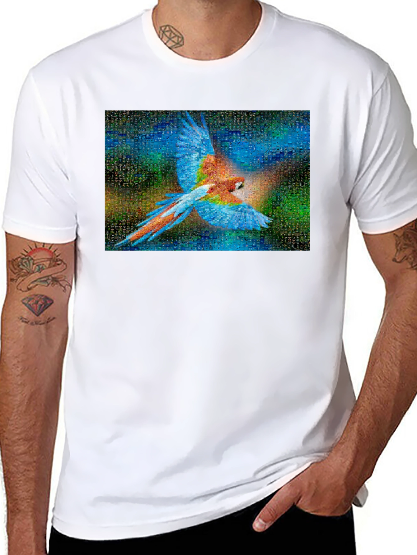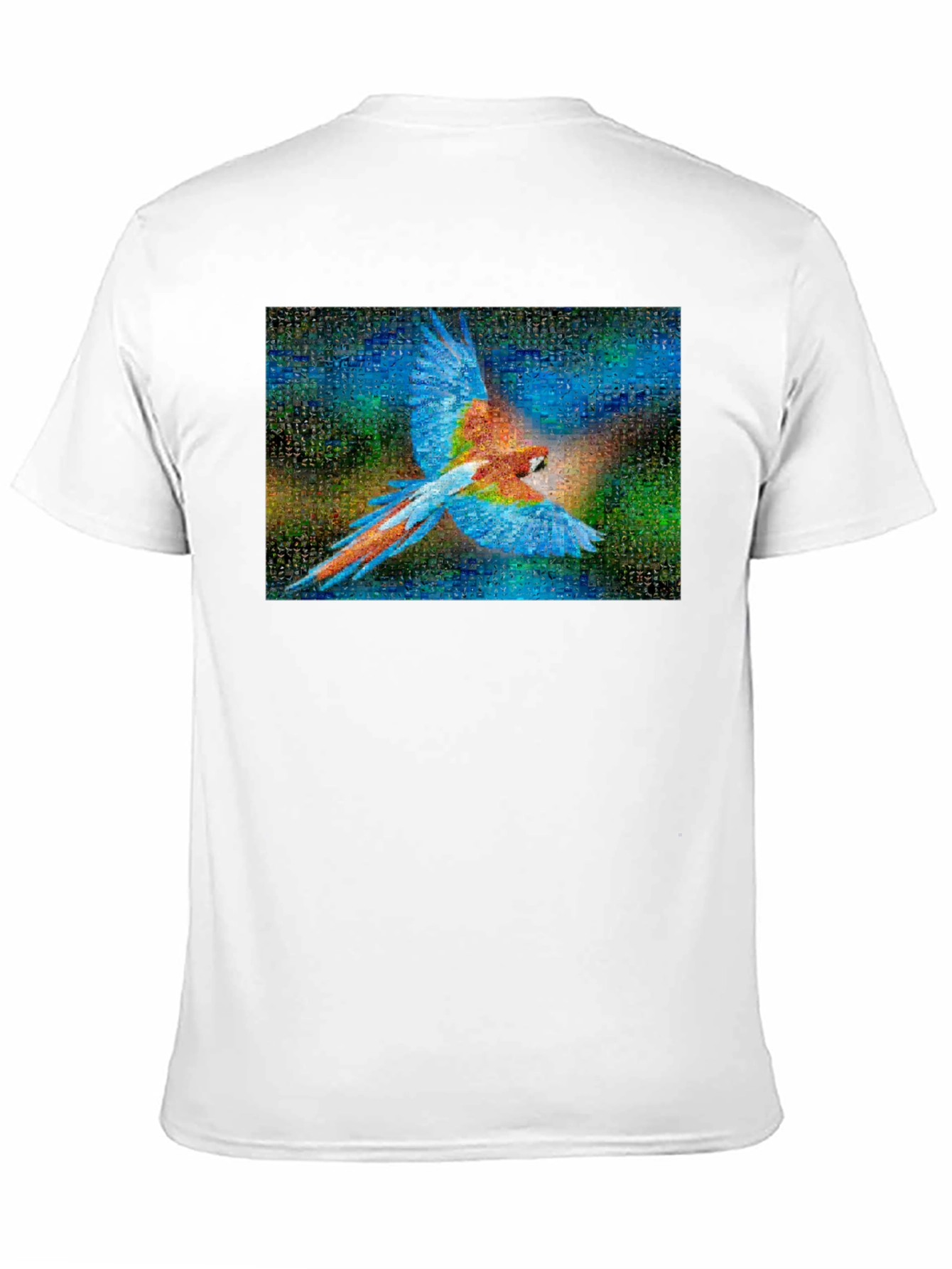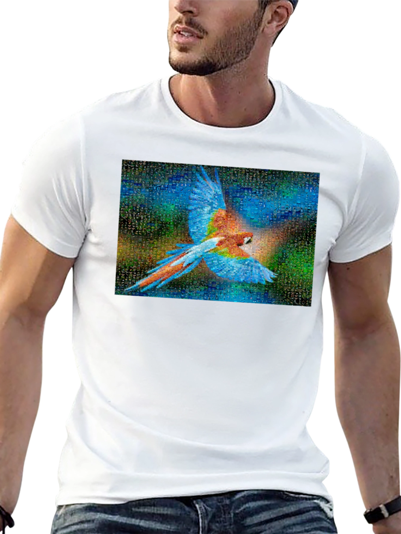 Luce esta llamativa camiseta negra con un diseño vibrante de un guacamayo en vuelo. La camiseta presenta un estampado artístico que captura la belleza y el colorido de esta ave exótica. Hecha de un tejido suave y cómodo, esta camiseta es perfecta para el uso diario o para destacar en eventos casuales. El diseño detallado y la impresión de alta calidad hacen de esta camiseta una pieza única y atractiva. Combínala con tus jeans favoritos o pantalones cortos para un look relajado pero con estilo. Ideal para amantes de la naturaleza y la moda original.