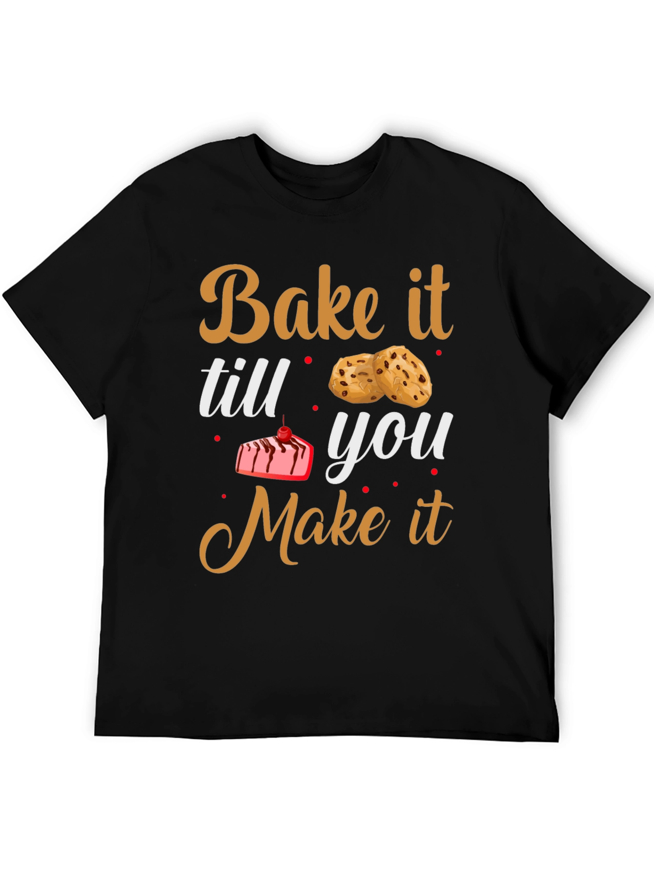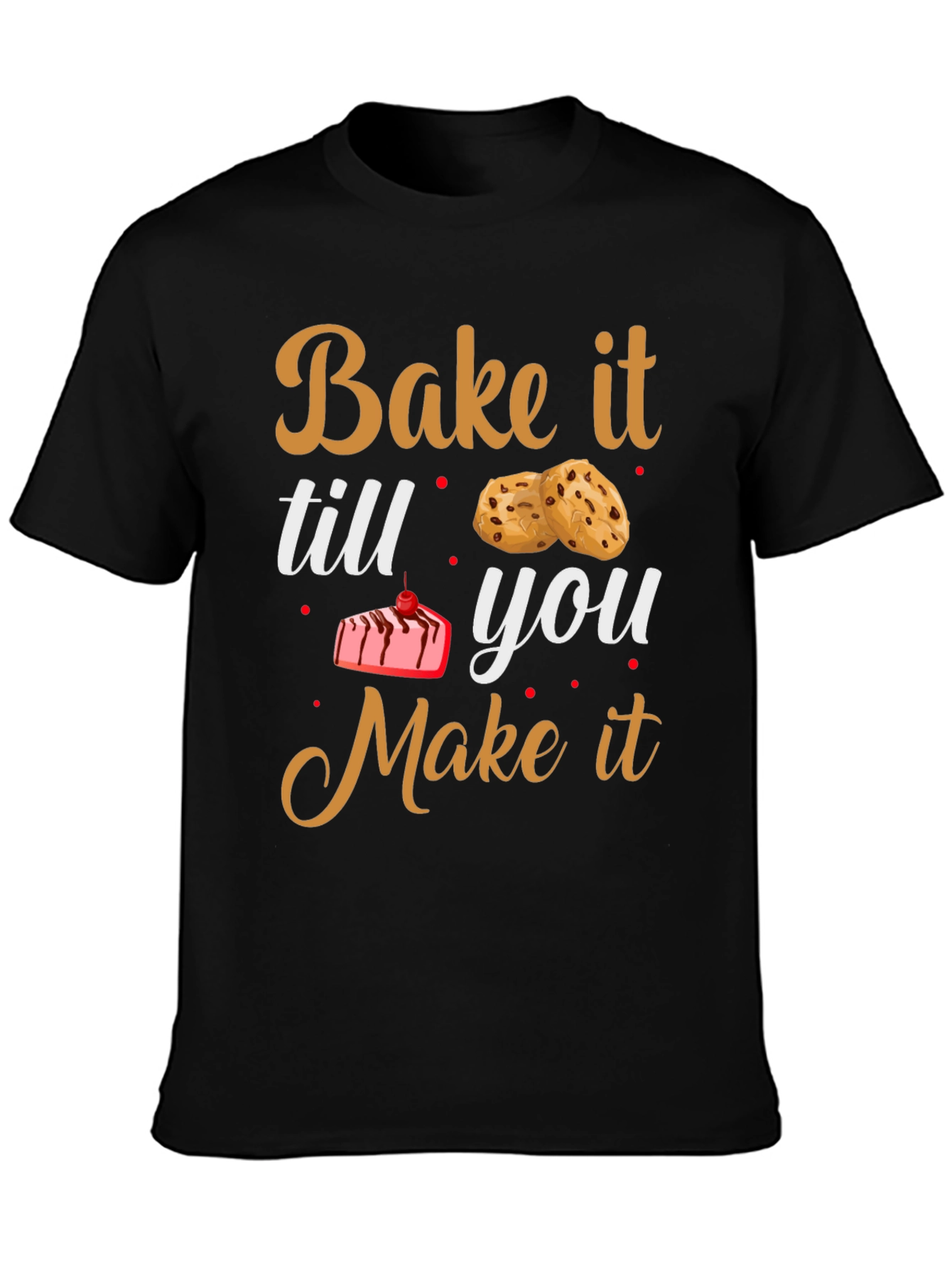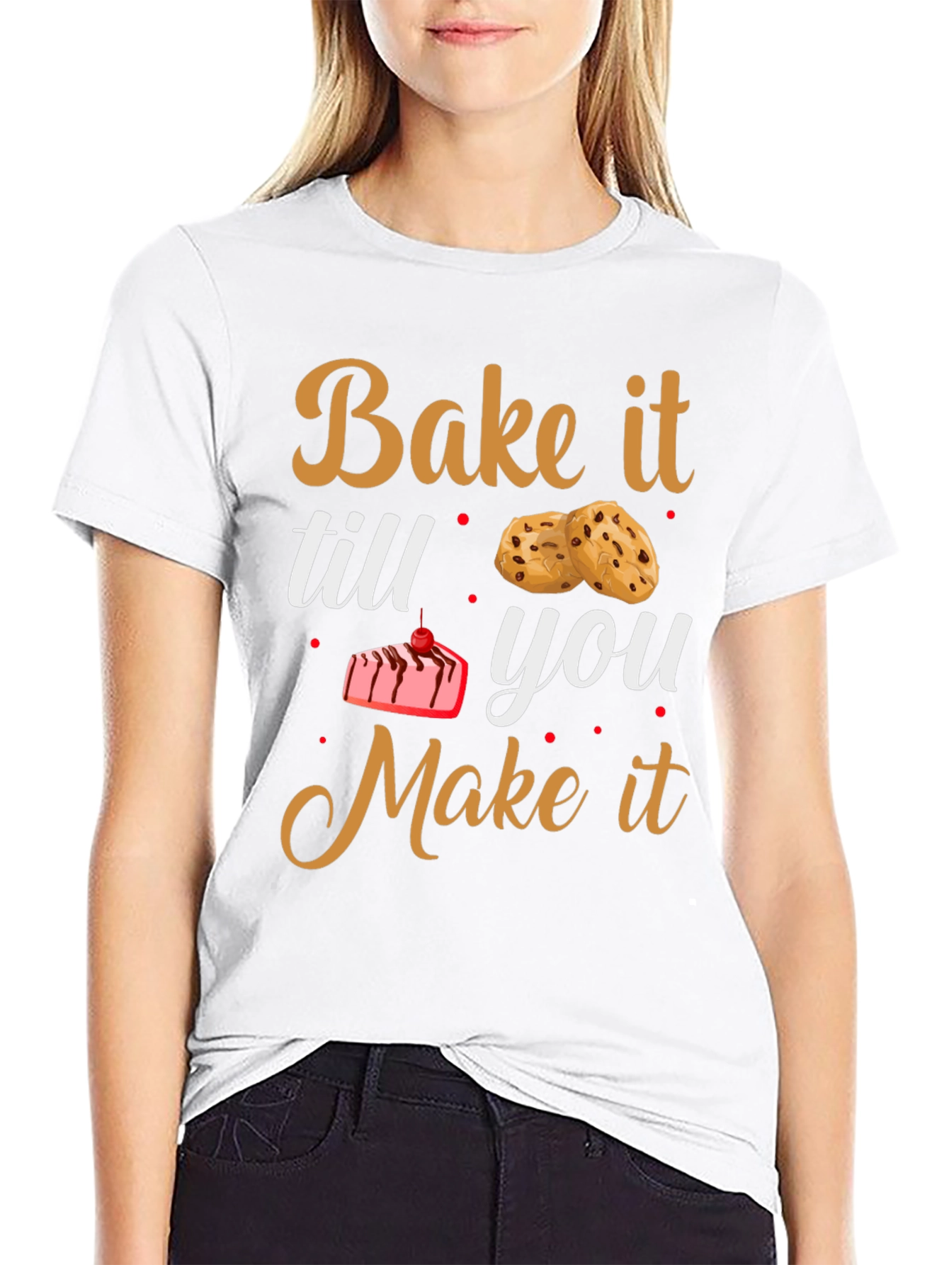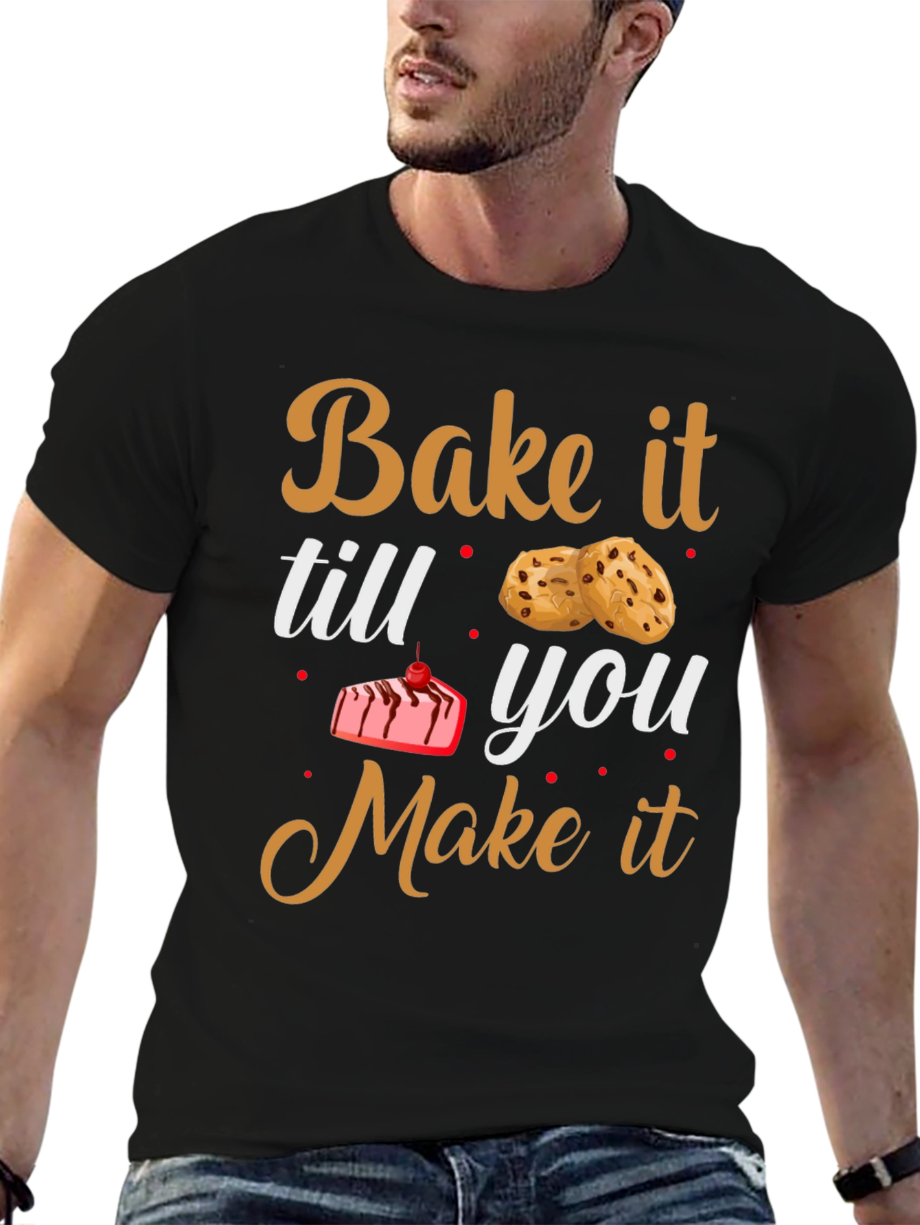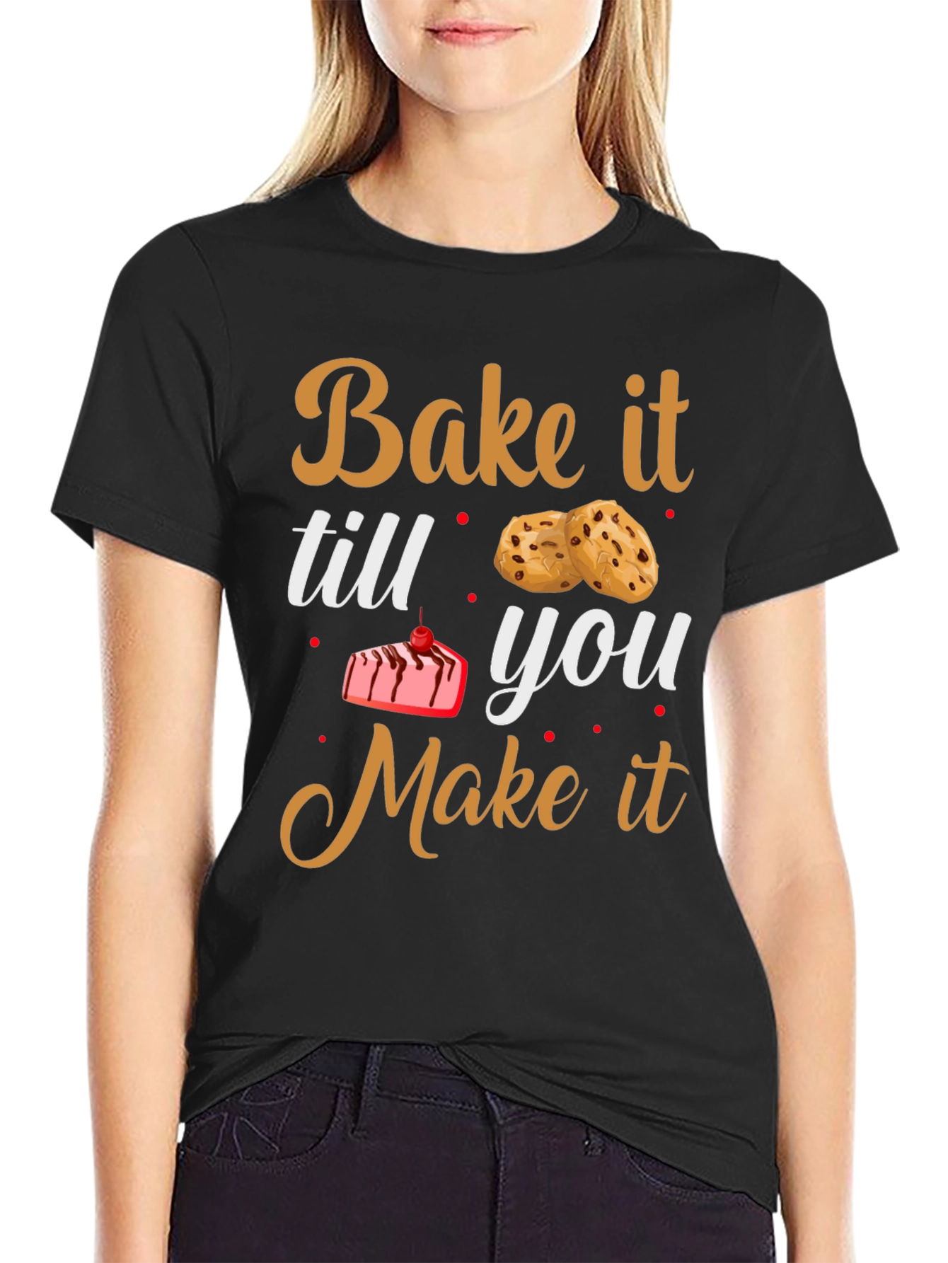 Esta camiseta negra presenta un diseño divertido y original para los amantes de la repostería. Con la frase "Bake it till you Make it" (hornearlo hasta lograrlo) con una tipografía atractiva y detalles de galletas y un pastel con cereza. Ideal para usar en la cocina o para mostrar tu pasión por el horneado. Fabricada con materiales suaves y cómodos, esta camiseta es perfecta para el uso diario. Luce tu amor por la repostería con esta prenda única y llamativa. Perfecta para regalar a panaderos y reposteros.