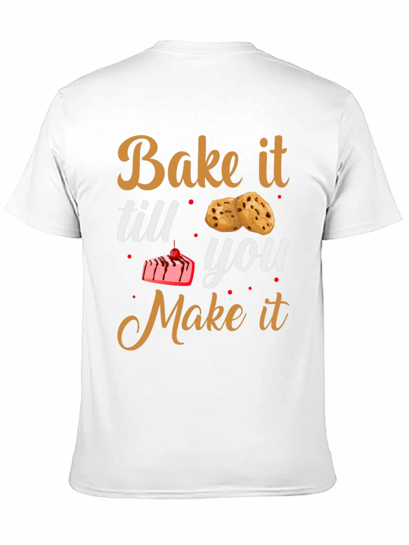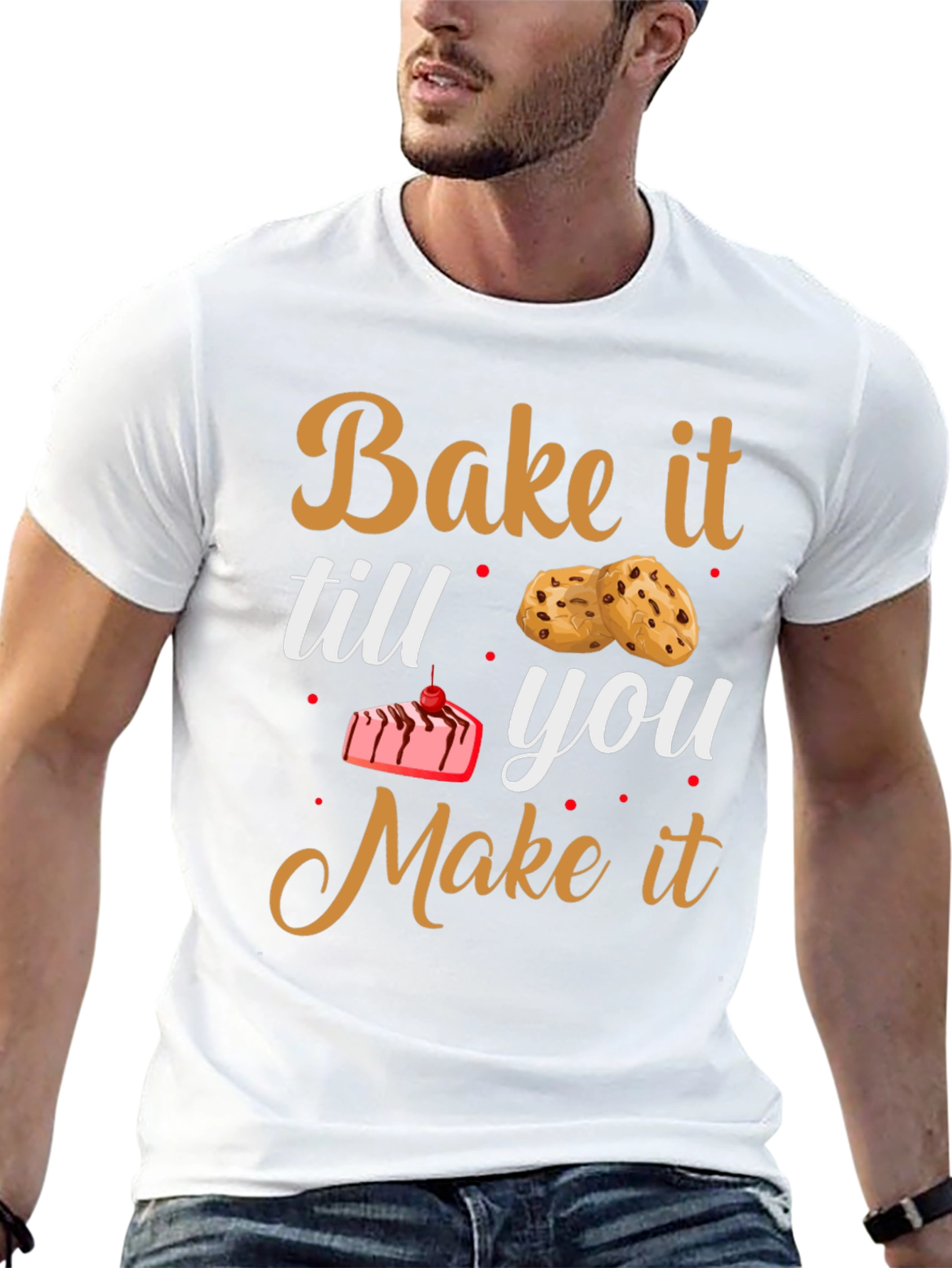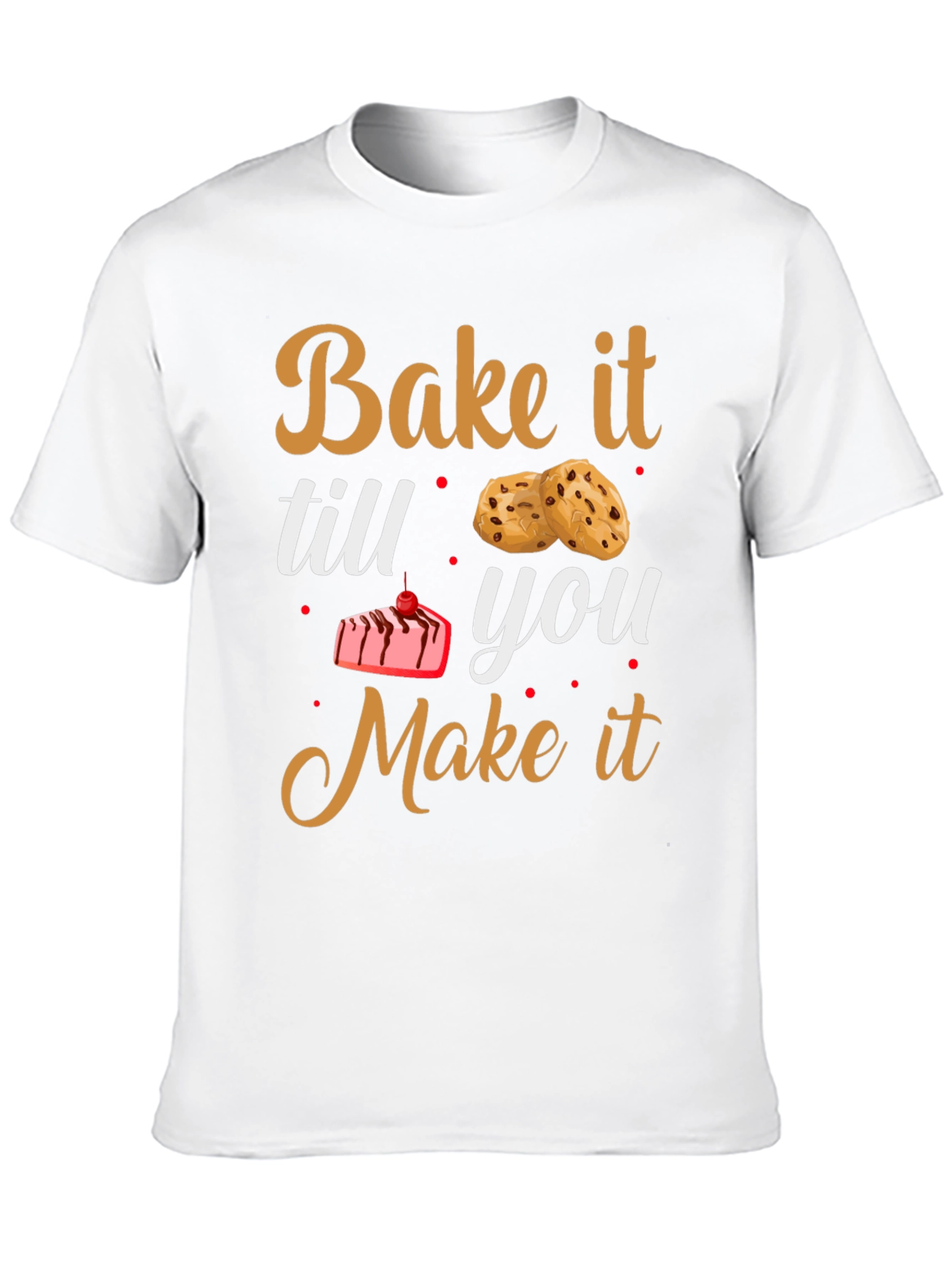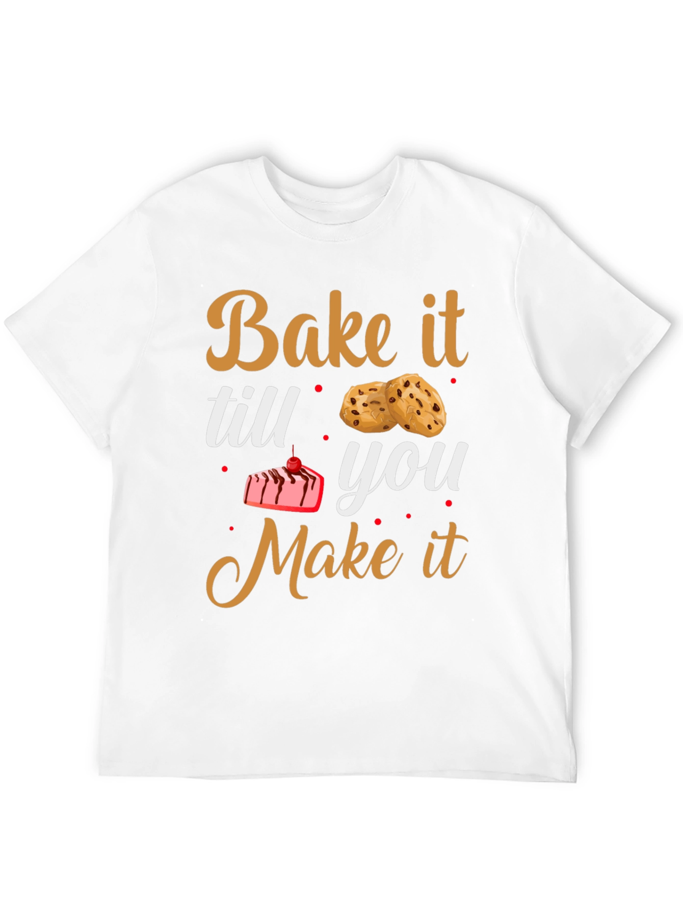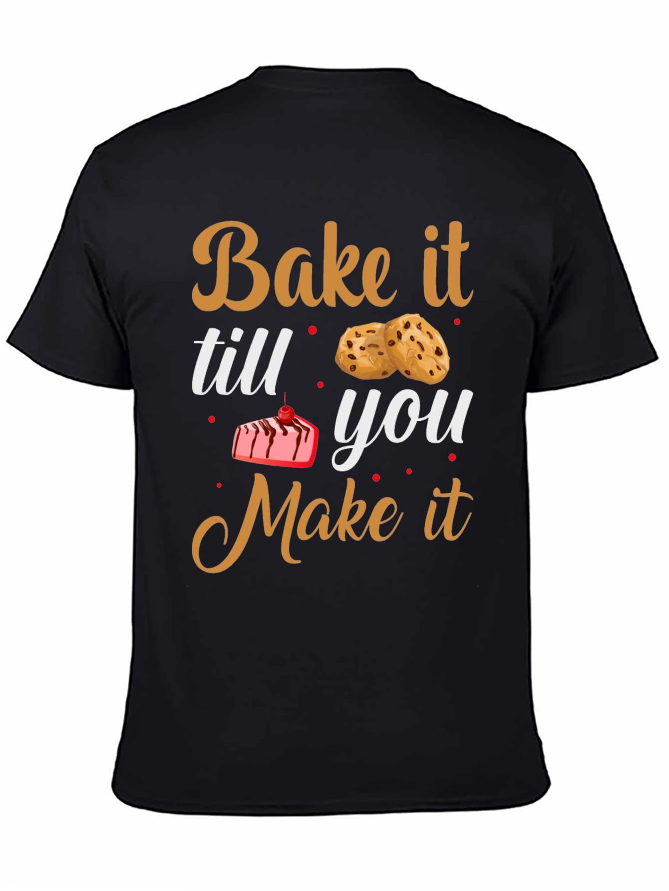 Esta camiseta negra presenta un diseño divertido y original para los amantes de la repostería. Con la frase "Bake it till you Make it" (hornearlo hasta lograrlo) con una tipografía atractiva y detalles de galletas y un pastel con cereza. Ideal para usar en la cocina o para mostrar tu pasión por el horneado. Fabricada con materiales suaves y cómodos, esta camiseta es perfecta para el uso diario. Luce tu amor por la repostería con esta prenda única y llamativa. Perfecta para regalar a panaderos y reposteros.