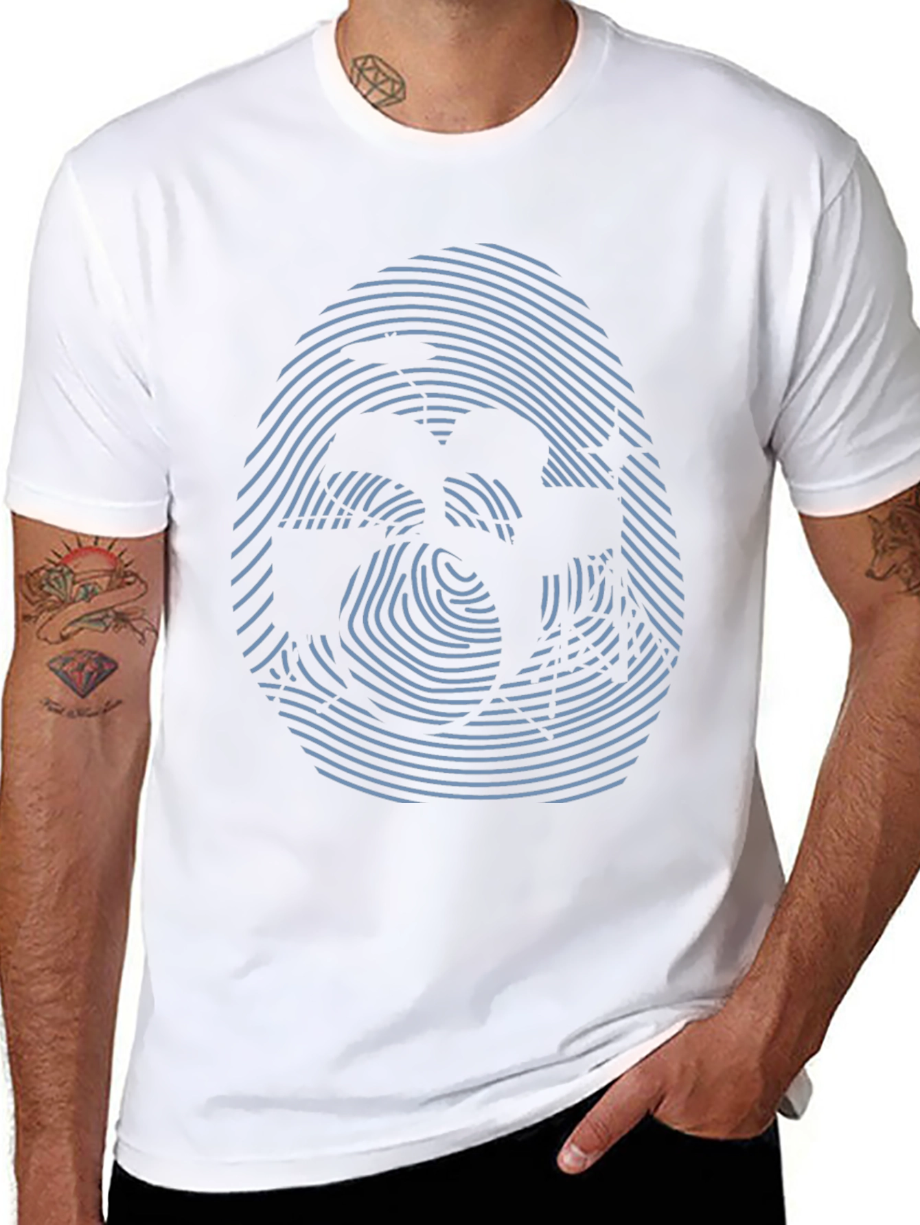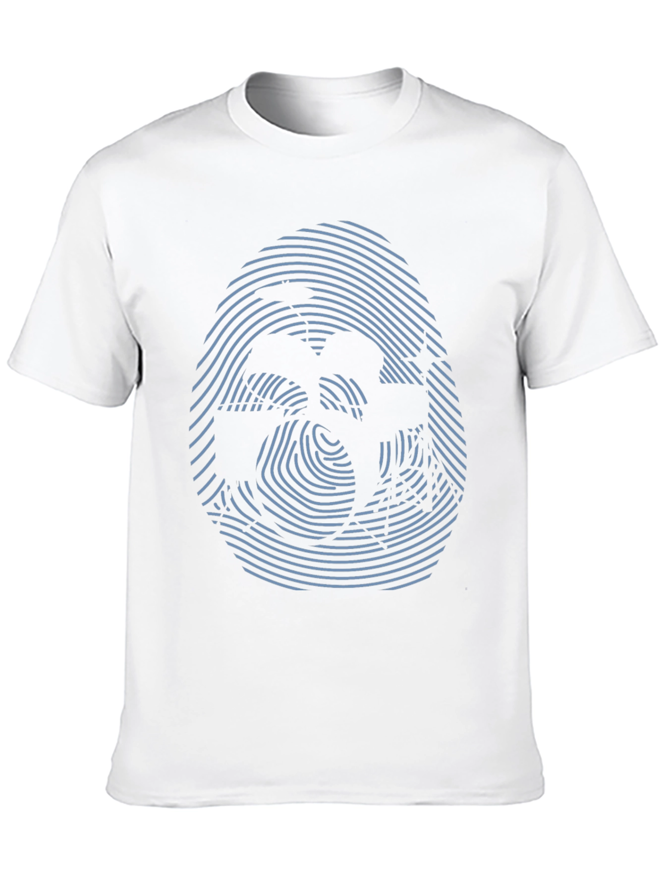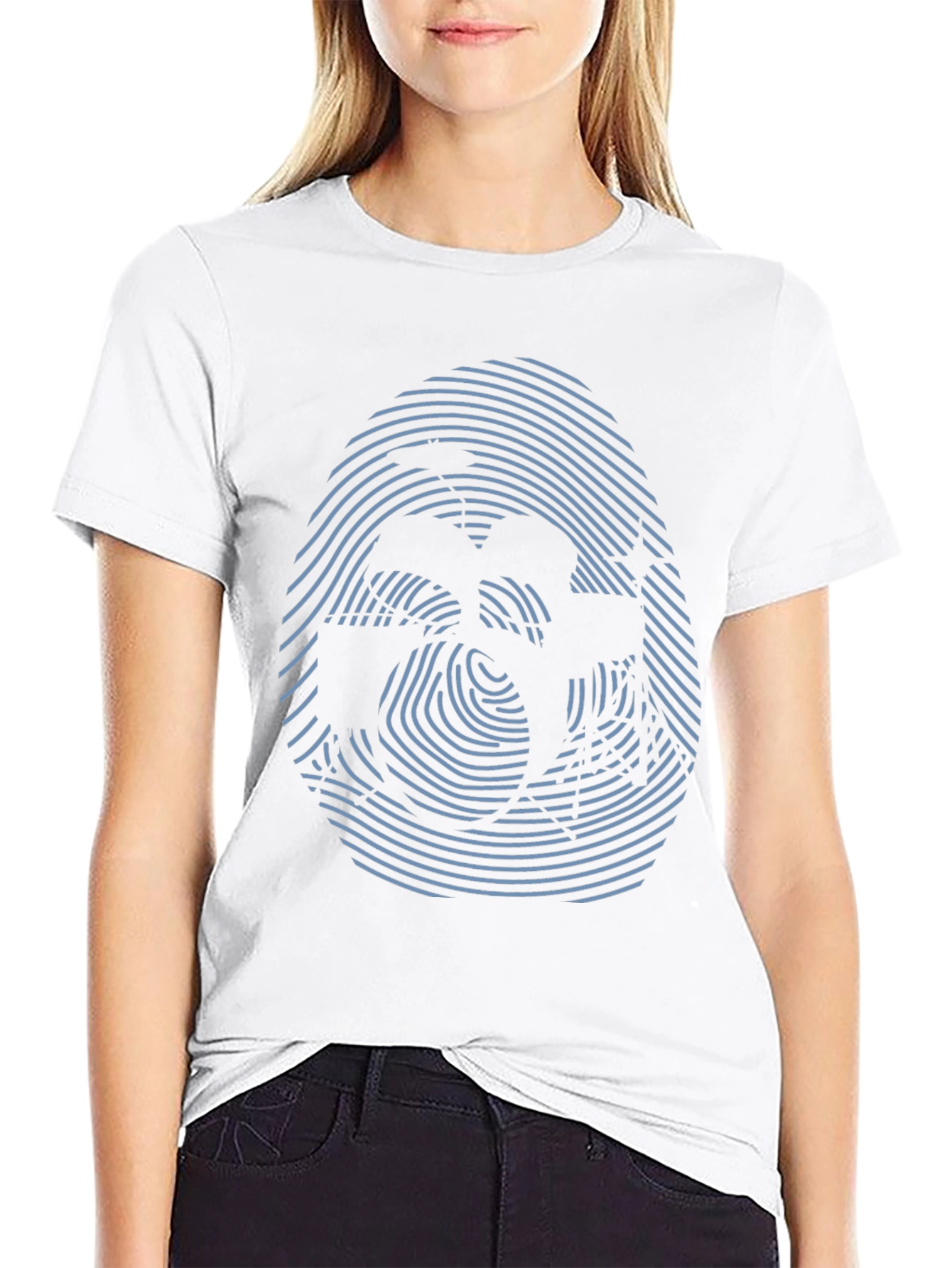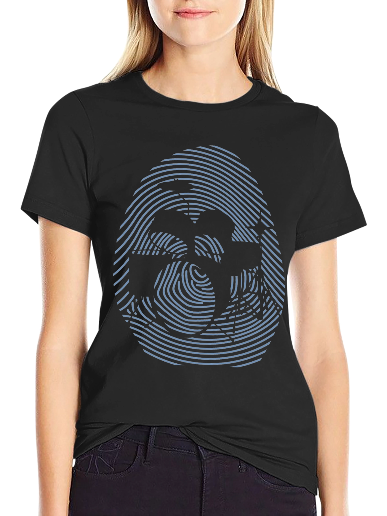 Eleva tu estilo con esta camiseta negra de manga corta que presenta un intrigante diseño abstracto. El llamativo estampado simula una huella digital en tonos azulados, creando una ilusión óptica cautivadora. Fabricada en un tejido suave y cómodo, esta camiseta ofrece un ajuste relajado ideal para el uso diario. Perfecta para expresar tu individualidad y añadir un toque moderno a tu guardarropa casual. Combínala con jeans, pantalones cortos o faldas para un look versátil y con estilo. Haz una declaración de moda única con esta prenda distintiva.