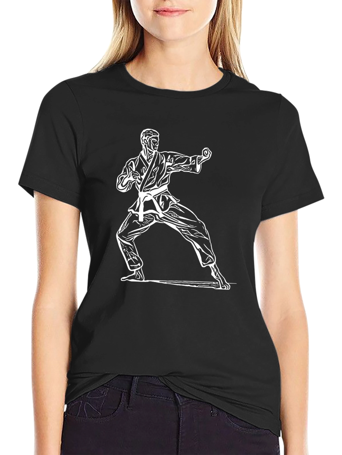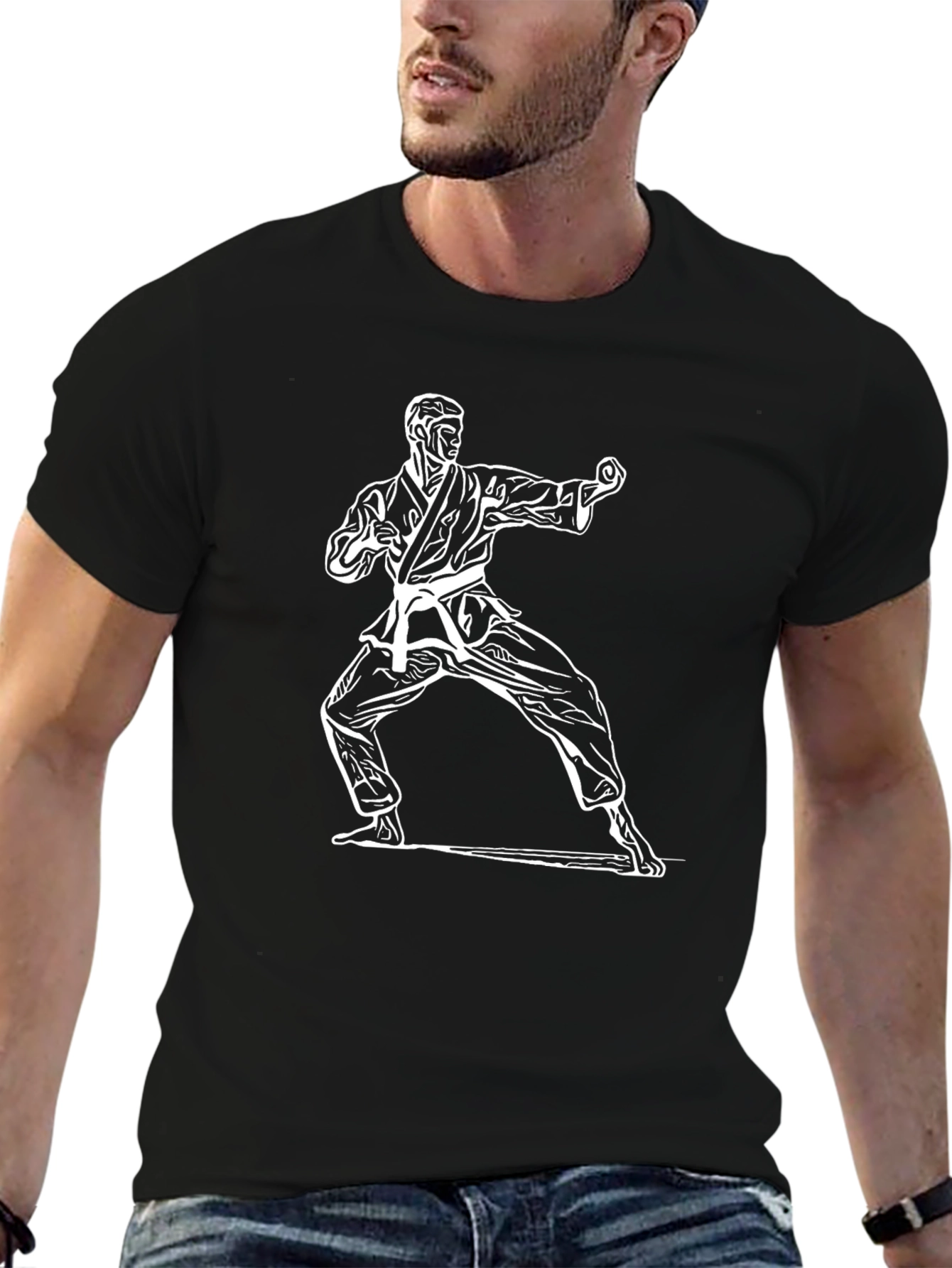 Esta camiseta negra presenta un diseño artístico de un karateca en acción. El diseño blanco destaca sobre el fondo negro, creando un contraste llamativo y moderno. Fabricada con un tejido suave y cómodo, esta camiseta es perfecta para el uso diario, ya sea para practicar deportes, salir con amigos o simplemente relajarse en casa. El diseño único la convierte en una excelente opción para los amantes de las artes marciales y aquellos que buscan un estilo original y casual. Su corte clásico y ajuste cómodo la hacen ideal para cualquier ocasión informal.