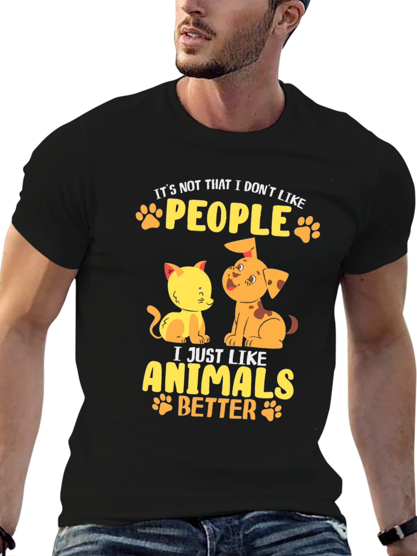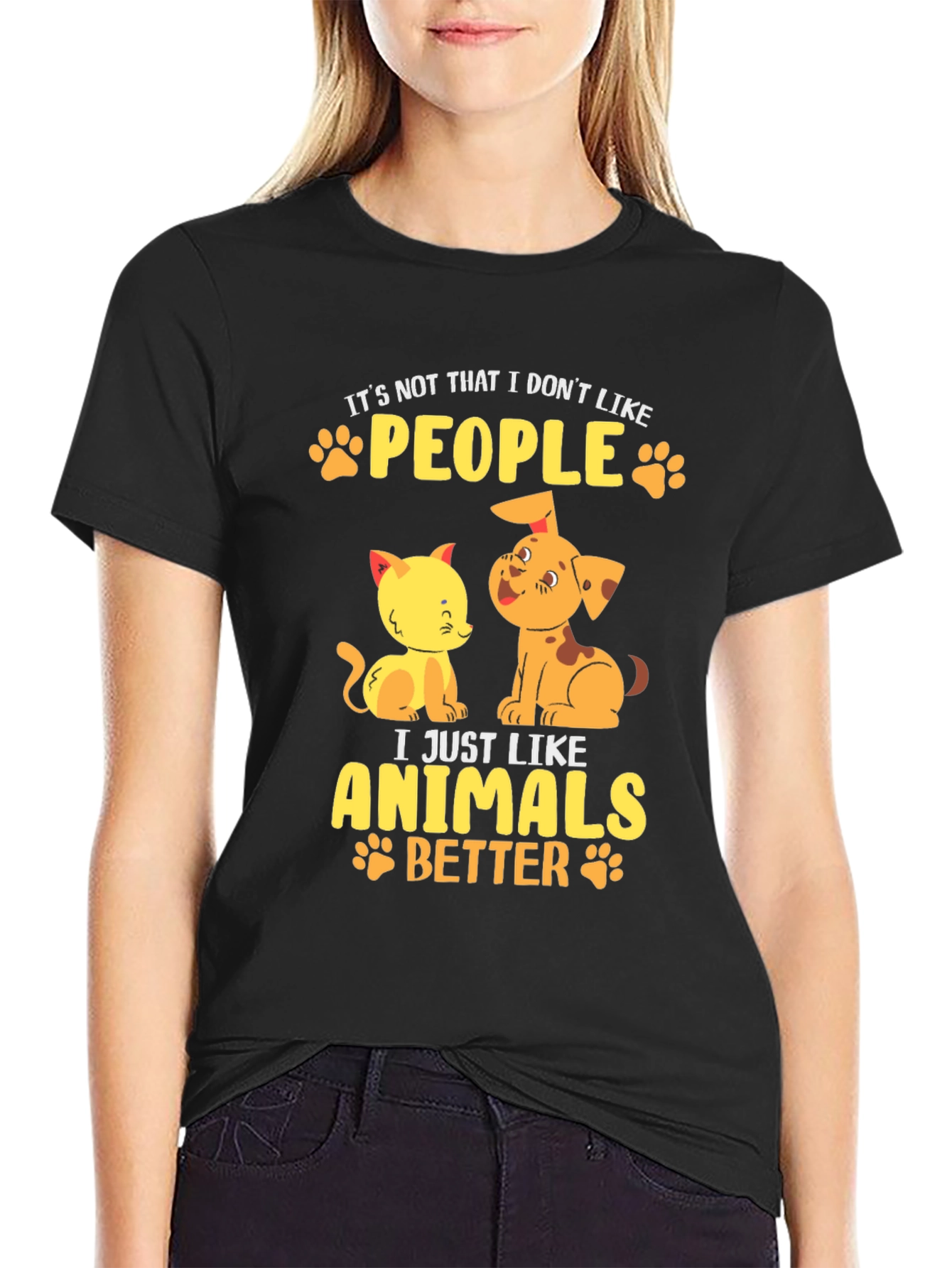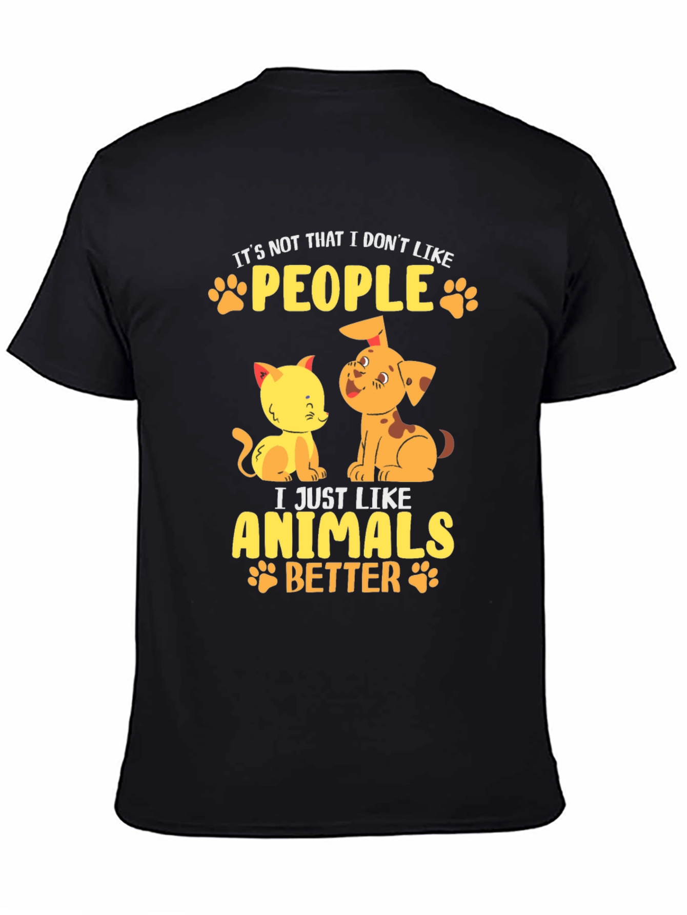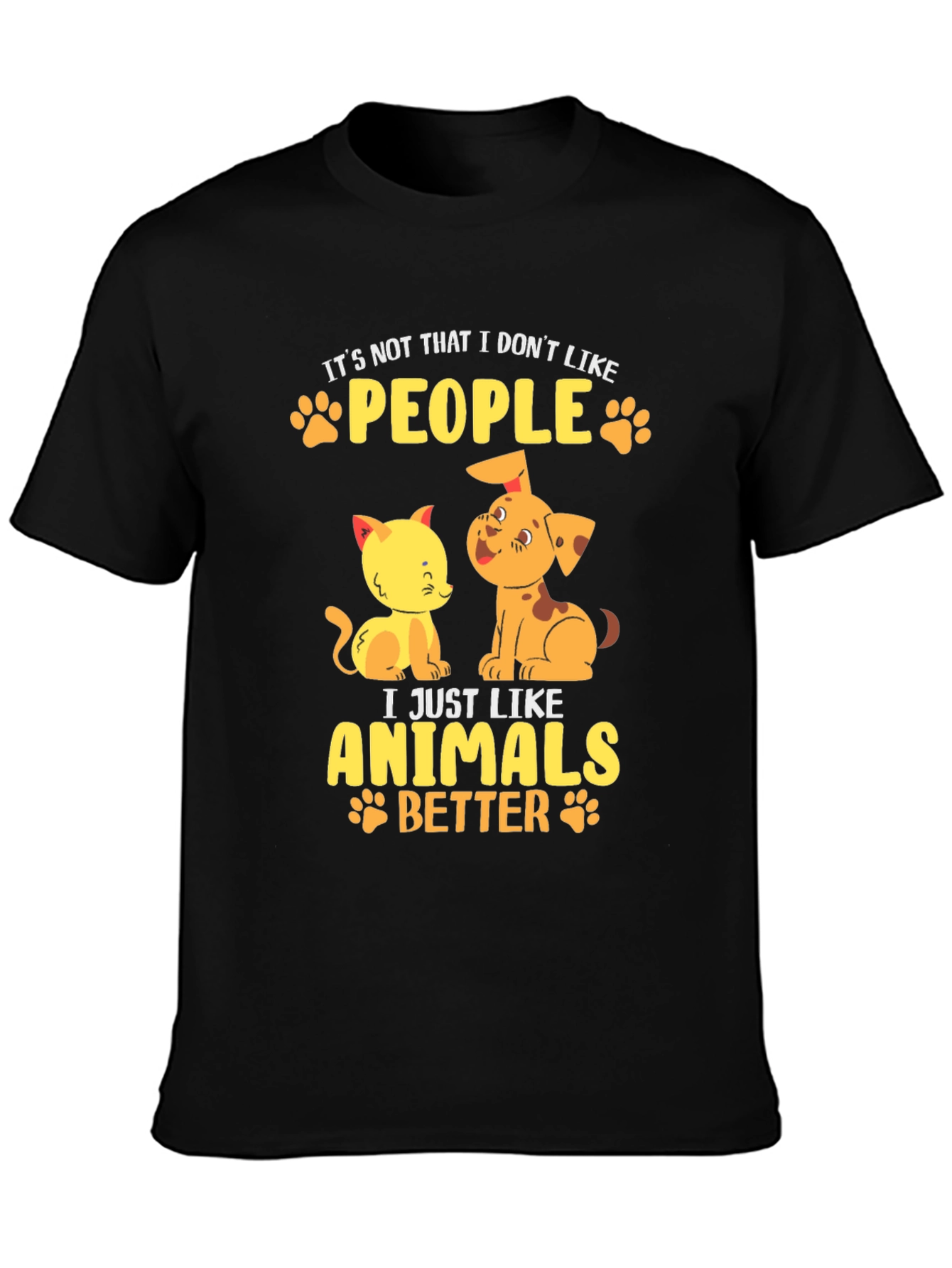 Esta camiseta negra de manga corta presenta un diseño adorable y divertido para los amantes de los animales. Confeccionada en un material que parece ser de algodón suave, ofrece comodidad y estilo. El estampado muestra un tierno gato y un perro de color amarillo y naranja, acompañados de la frase "It's not that I don't like PEOPLE, I just like ANIMALS BETTER", en letras amarillas adornadas con huellas de patitas. Ideal para llevar a diario, expresar tu amor por las mascotas y destacar con un toque original. Perfecta para un look casual y relajado.