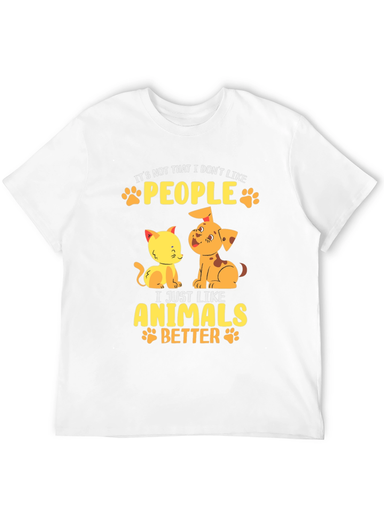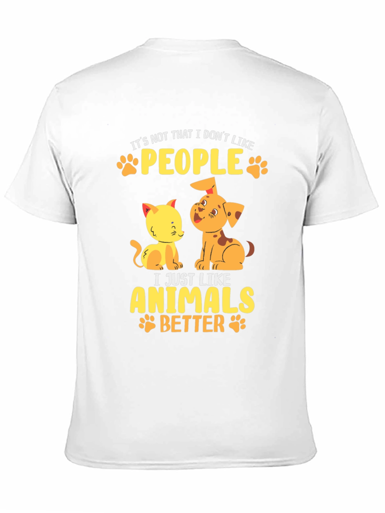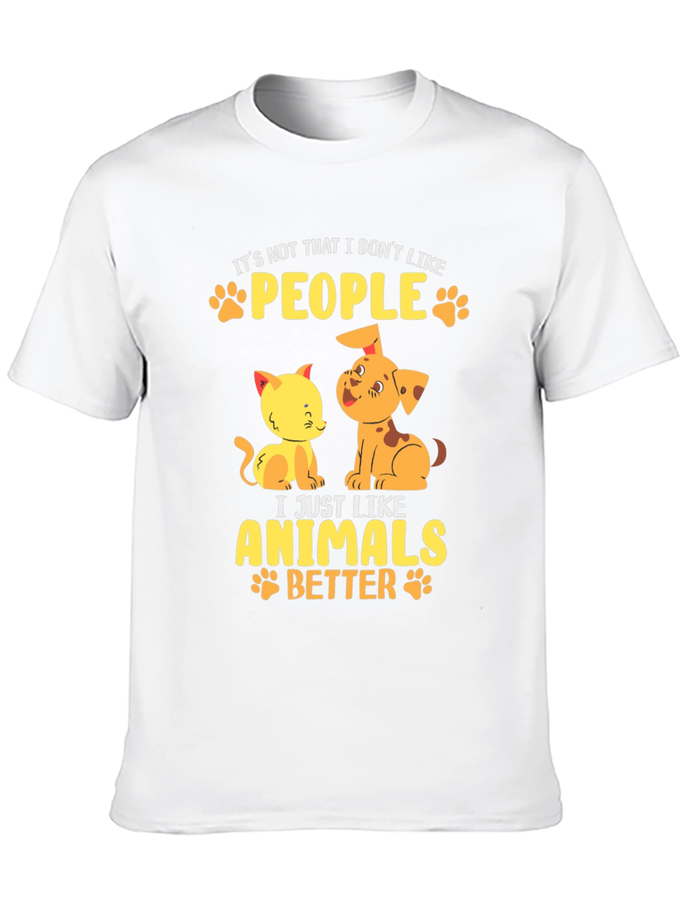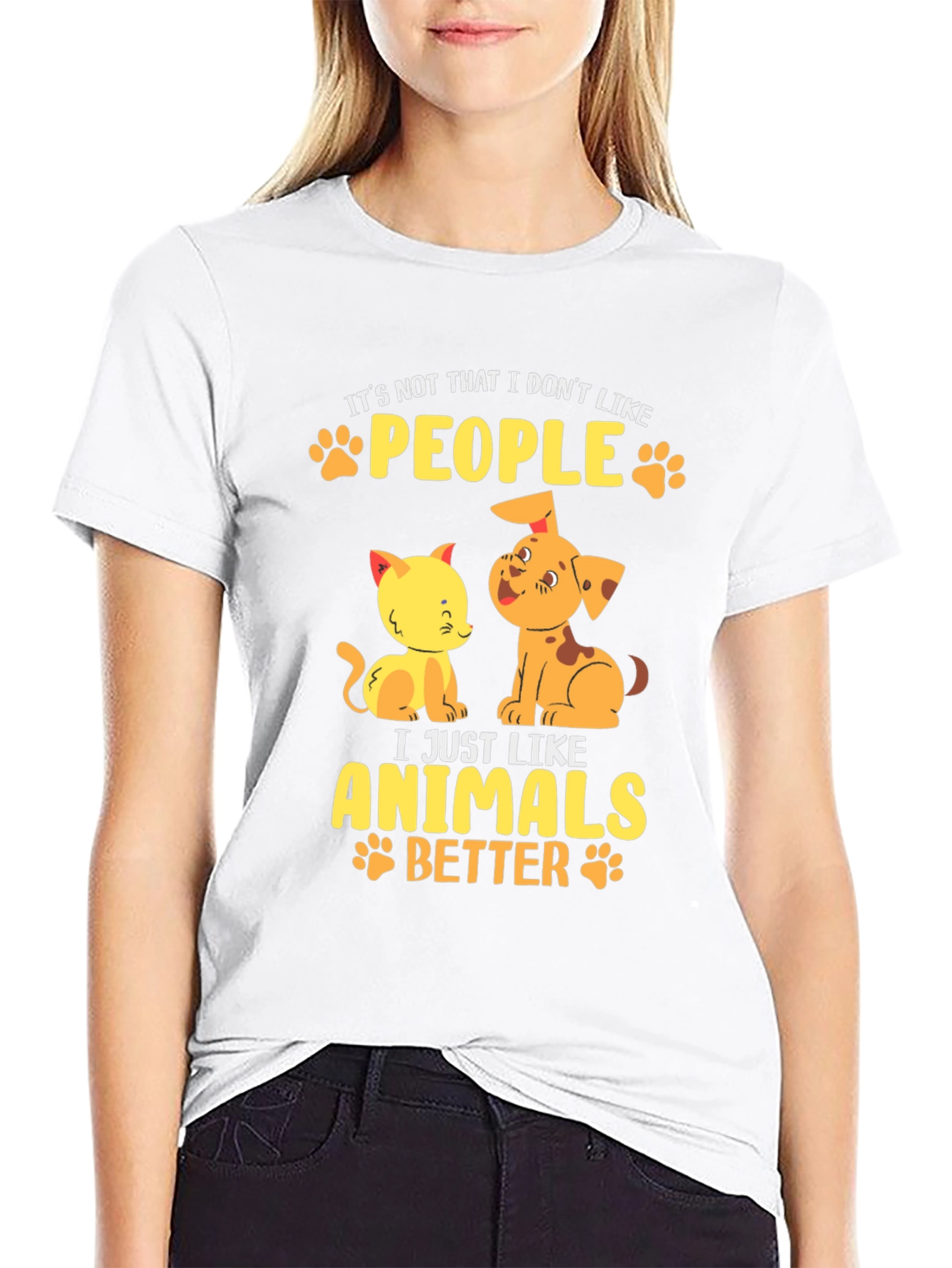 Esta camiseta negra de manga corta presenta un diseño adorable y divertido para los amantes de los animales. Confeccionada en un material que parece ser de algodón suave, ofrece comodidad y estilo. El estampado muestra un tierno gato y un perro de color amarillo y naranja, acompañados de la frase "It's not that I don't like PEOPLE, I just like ANIMALS BETTER", en letras amarillas adornadas con huellas de patitas. Ideal para llevar a diario, expresar tu amor por las mascotas y destacar con un toque original. Perfecta para un look casual y relajado.