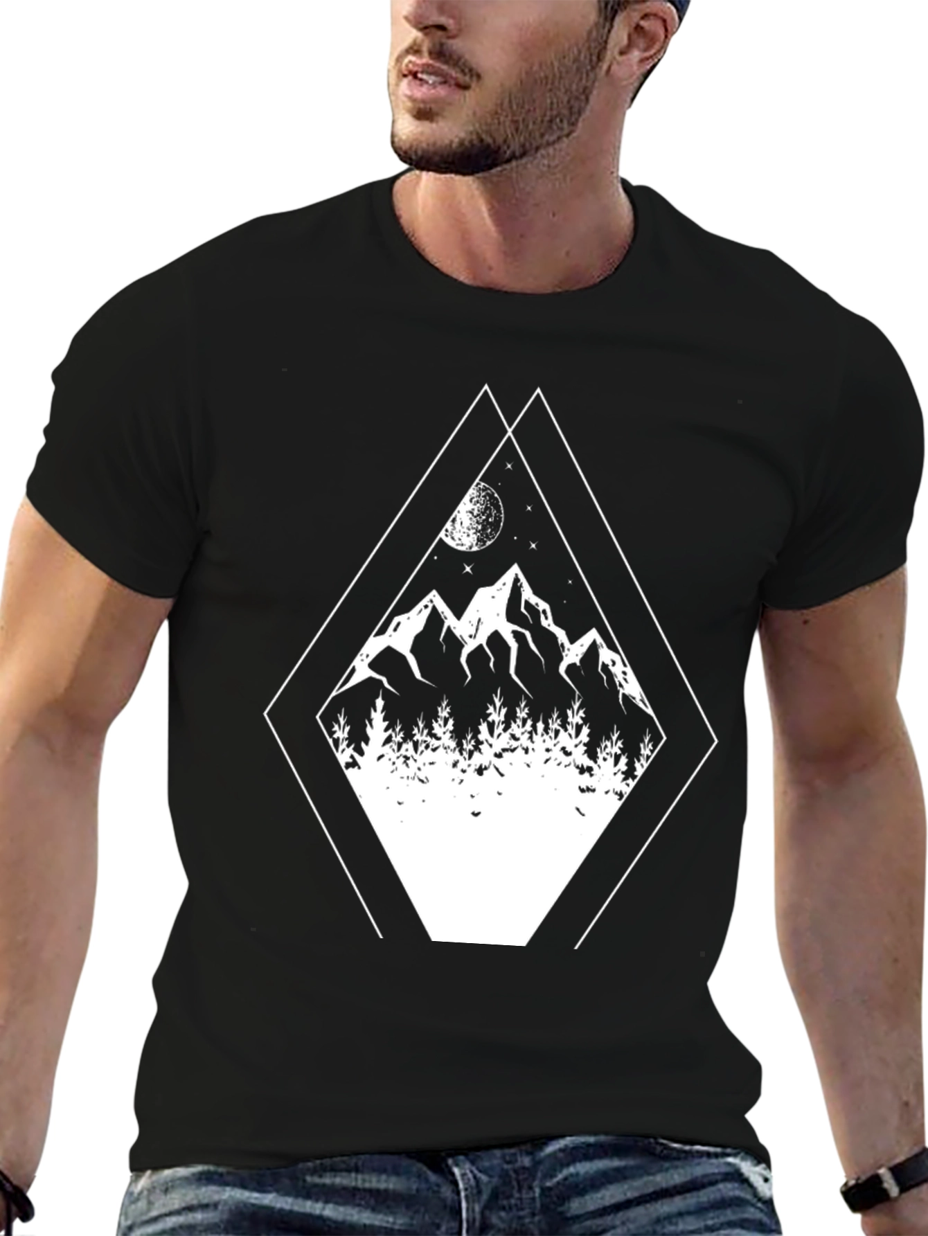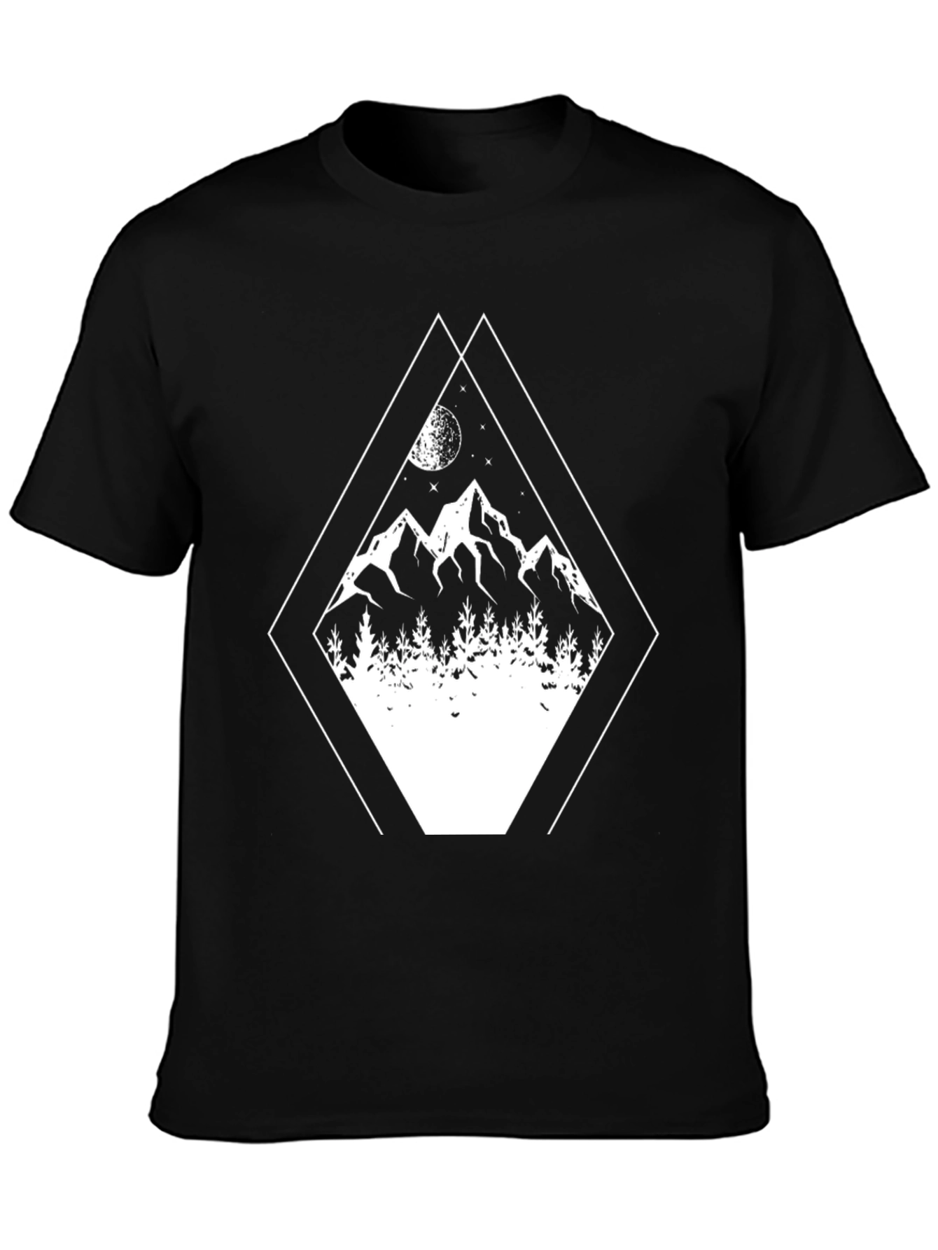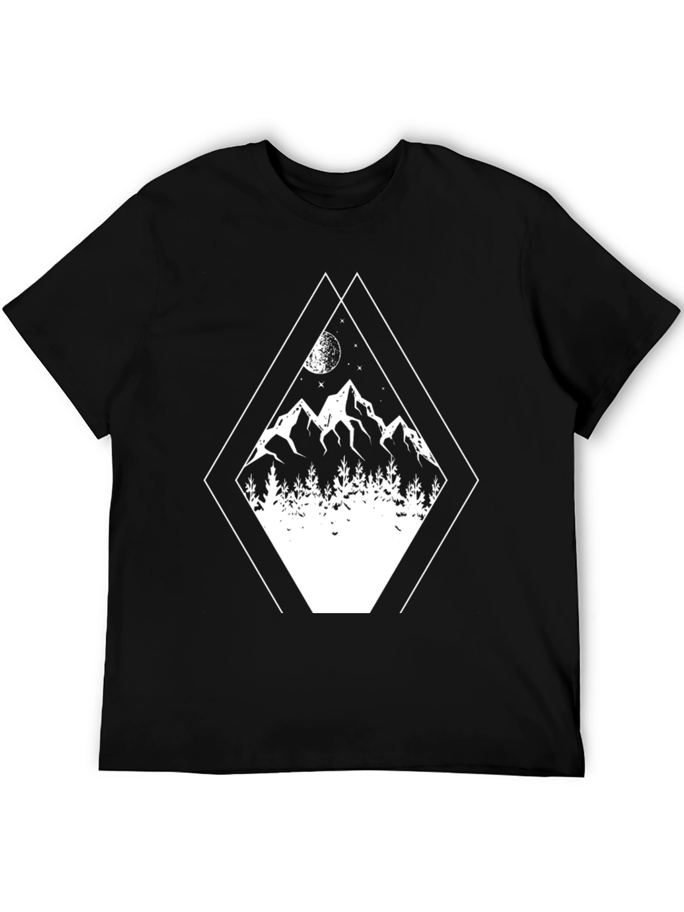 Luce esta elegante camiseta negra de manga corta con un impresionante diseño gráfico en el centro. El diseño presenta montañas nevadas bajo una luna llena estrellada, enmarcado por dos rombos blancos que le dan un toque moderno y minimalista. Perfecta para los amantes de la naturaleza y el aire libre, esta camiseta combina estilo y comodidad. Ideal para usar a diario, ya sea para una salida casual o para expresar tu pasión por la aventura. Su diseño único te hará destacar y mostrar tu personalidad. Una prenda esencial para tu guardarropa.
