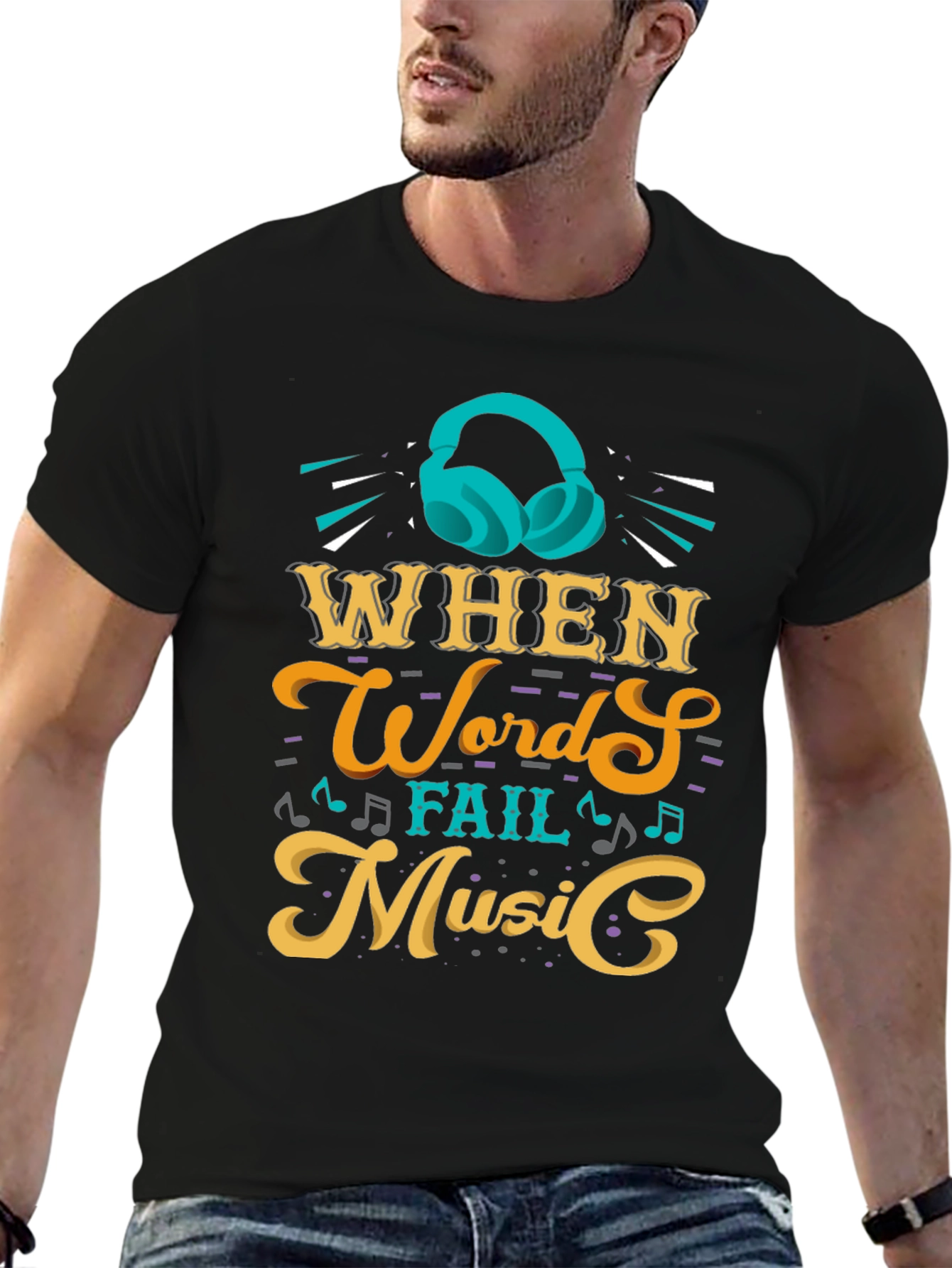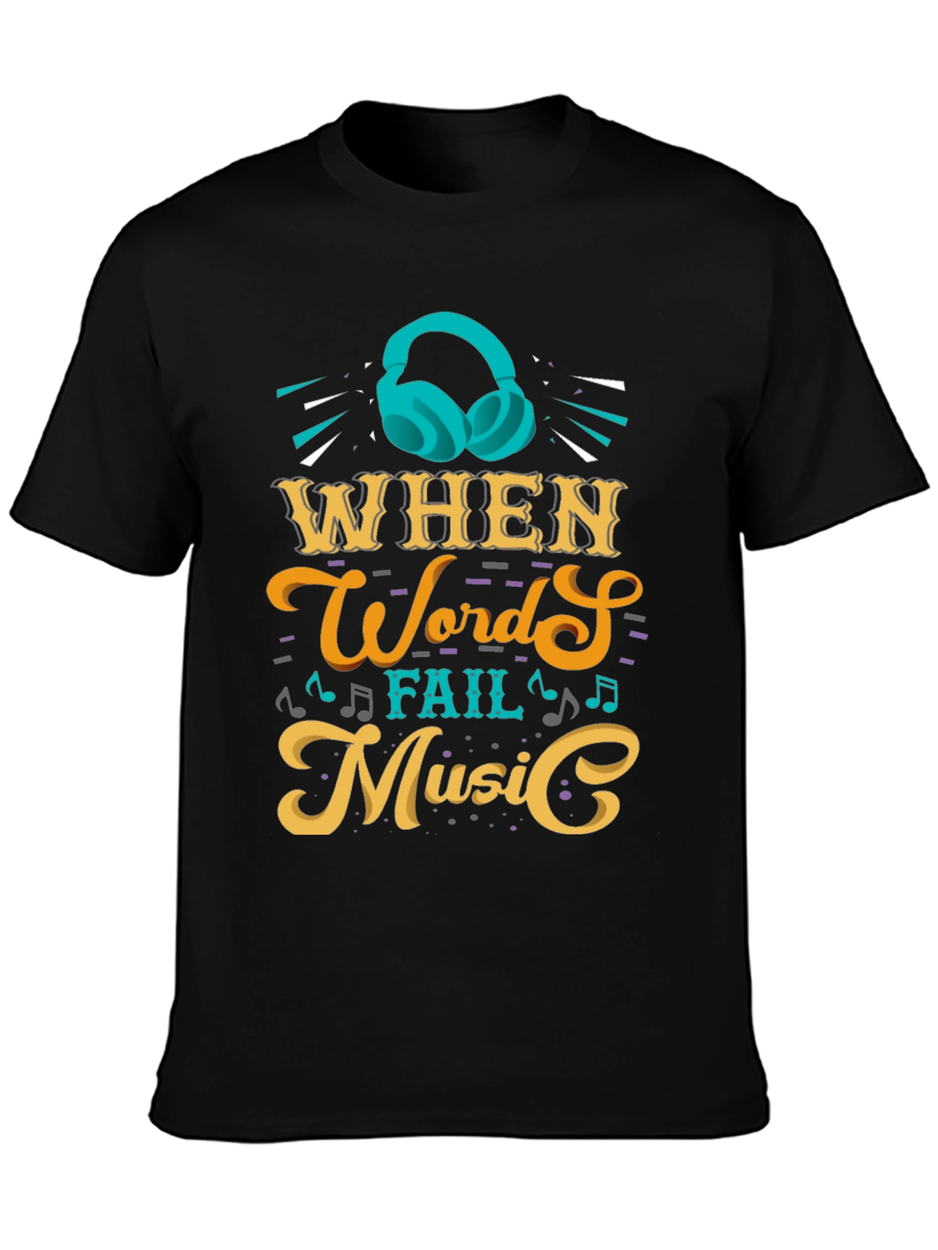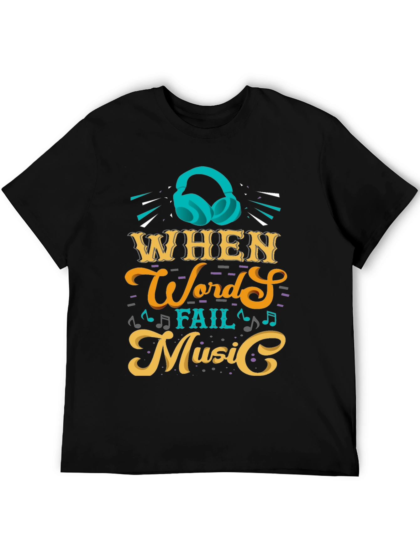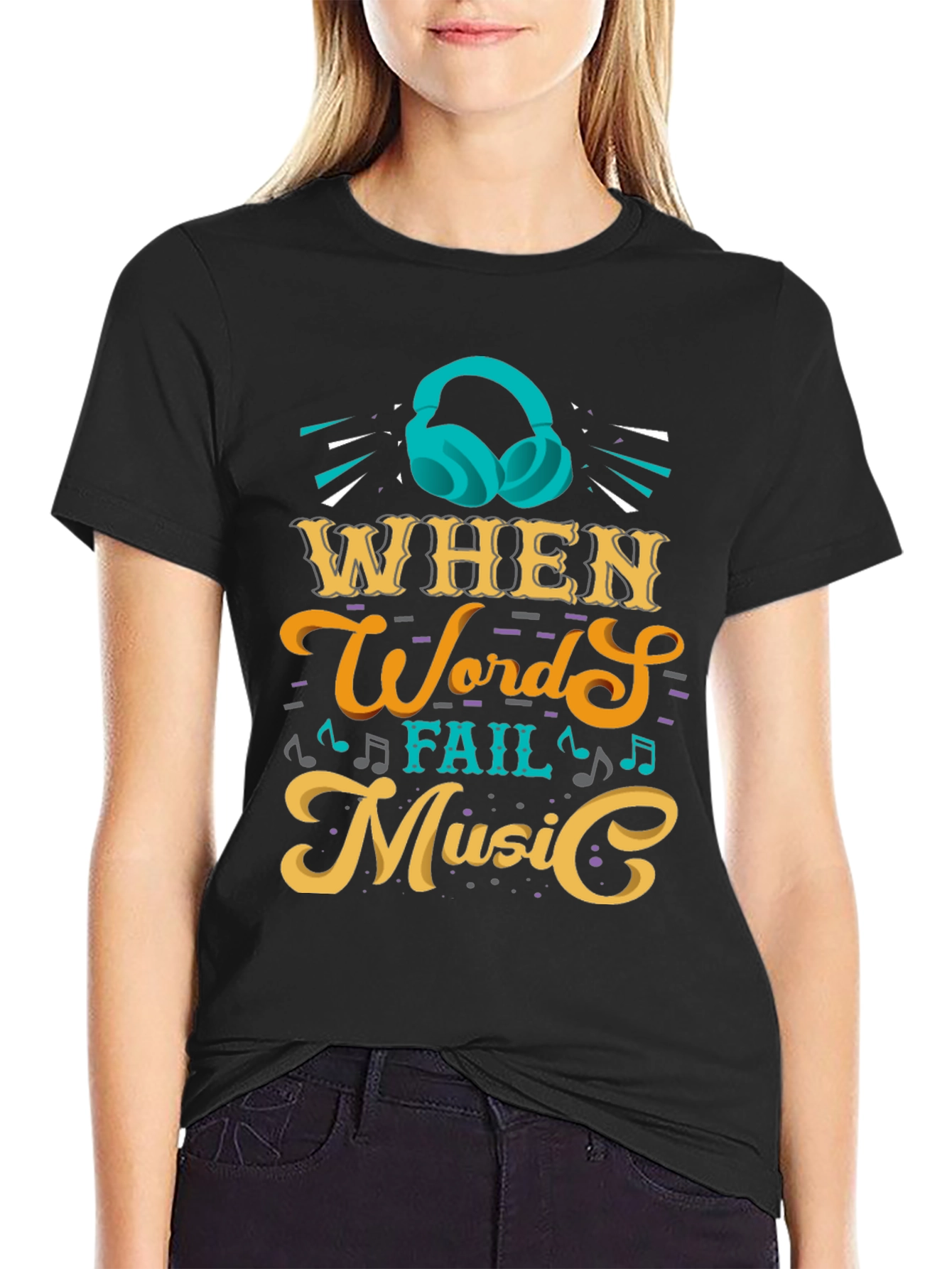 Esta moderna camiseta negra presenta un diseño llamativo ideal para los amantes de la música. El estampado colorido muestra unos audífonos y la frase "When Words Fail Music" (Cuando las Palabras Fallan, la Música). Perfecta para expresar tu pasión por la música con estilo. Su corte clásico y tejido suave ofrecen comodidad durante todo el día. Ideal para usar en conciertos, festivales o simplemente para el uso diario. Combina esta camiseta con jeans o shorts para un look casual y moderno. Un regalo perfecto para músicos y fanáticos de la música por igual. Añade un toque musical a tu guardarropa.