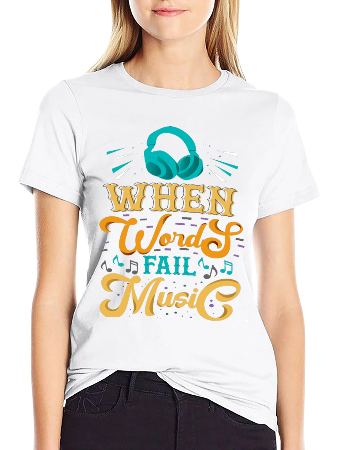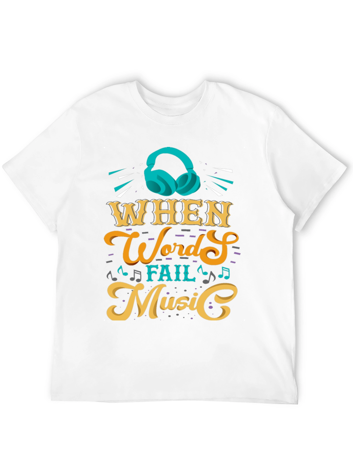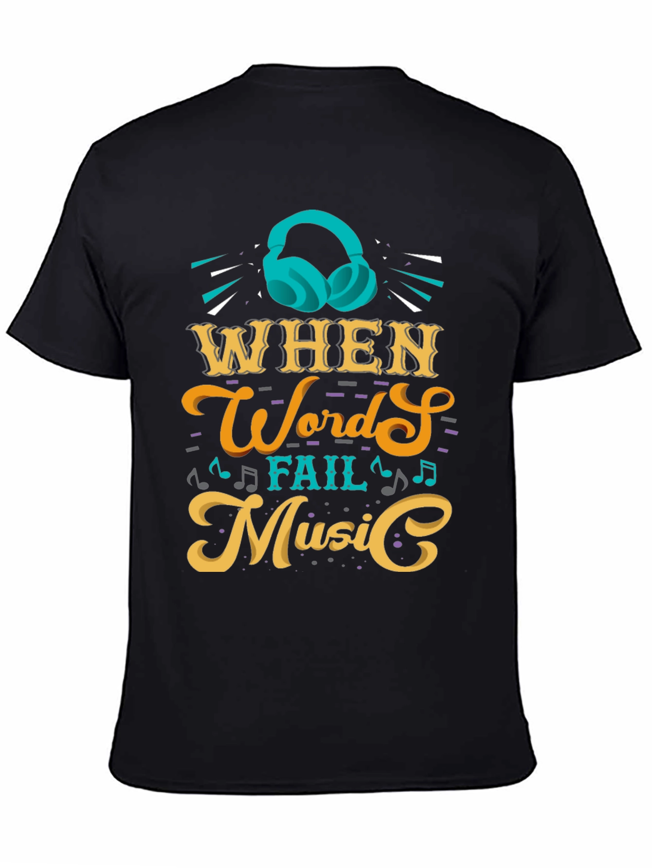 Esta moderna camiseta negra presenta un diseño llamativo ideal para los amantes de la música. El estampado colorido muestra unos audífonos y la frase "When Words Fail Music" (Cuando las Palabras Fallan, la Música). Perfecta para expresar tu pasión por la música con estilo. Su corte clásico y tejido suave ofrecen comodidad durante todo el día. Ideal para usar en conciertos, festivales o simplemente para el uso diario. Combina esta camiseta con jeans o shorts para un look casual y moderno. Un regalo perfecto para músicos y fanáticos de la música por igual. Añade un toque musical a tu guardarropa.