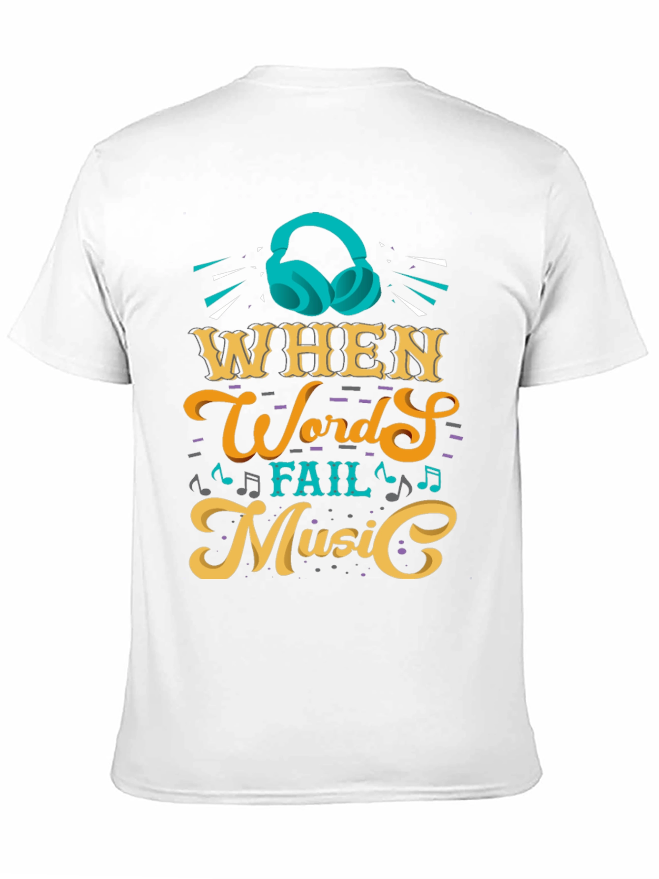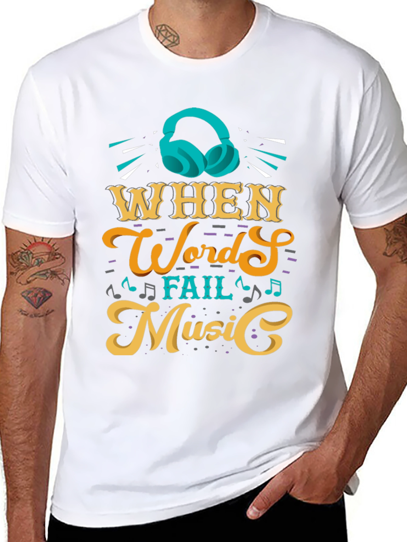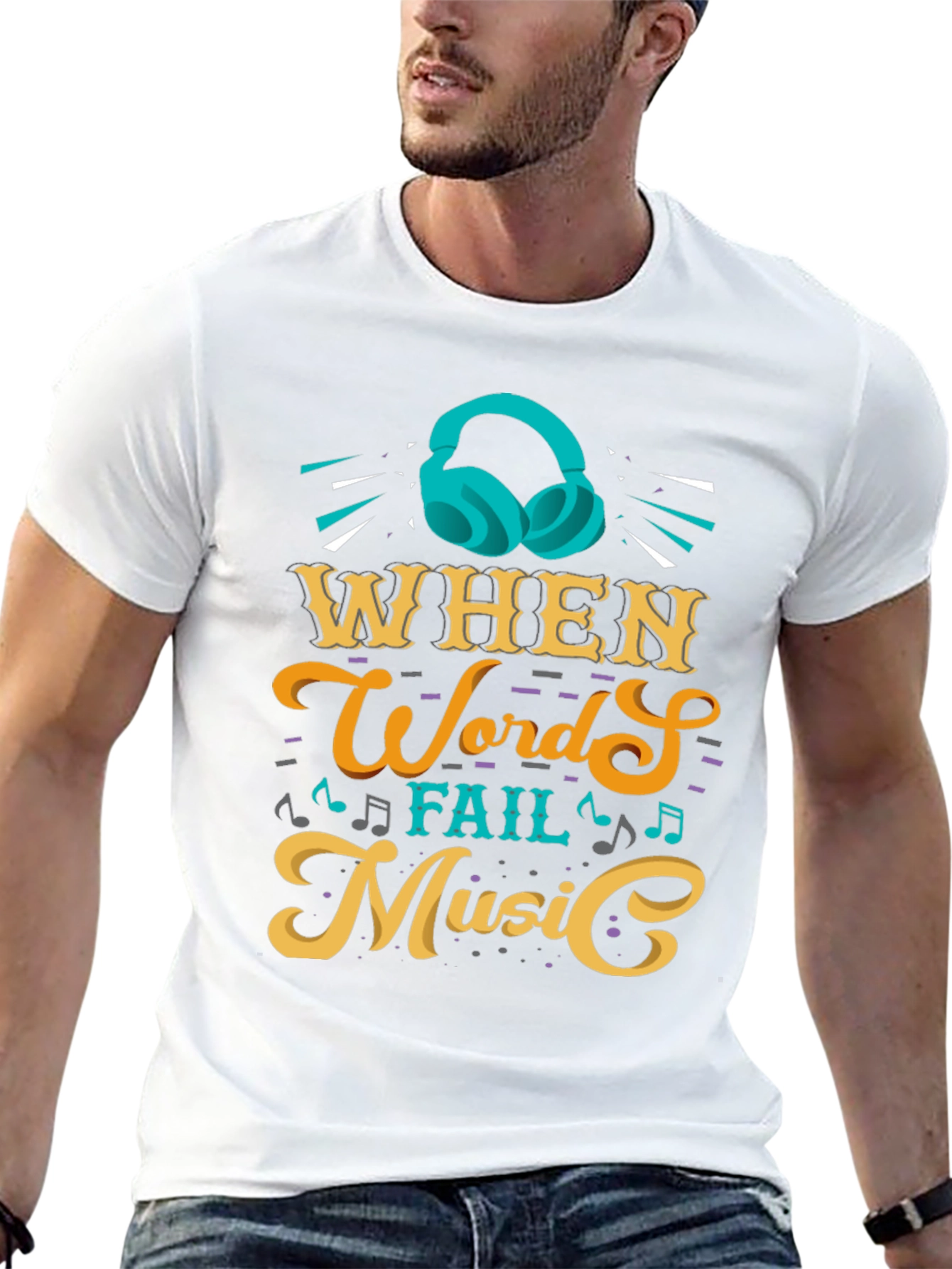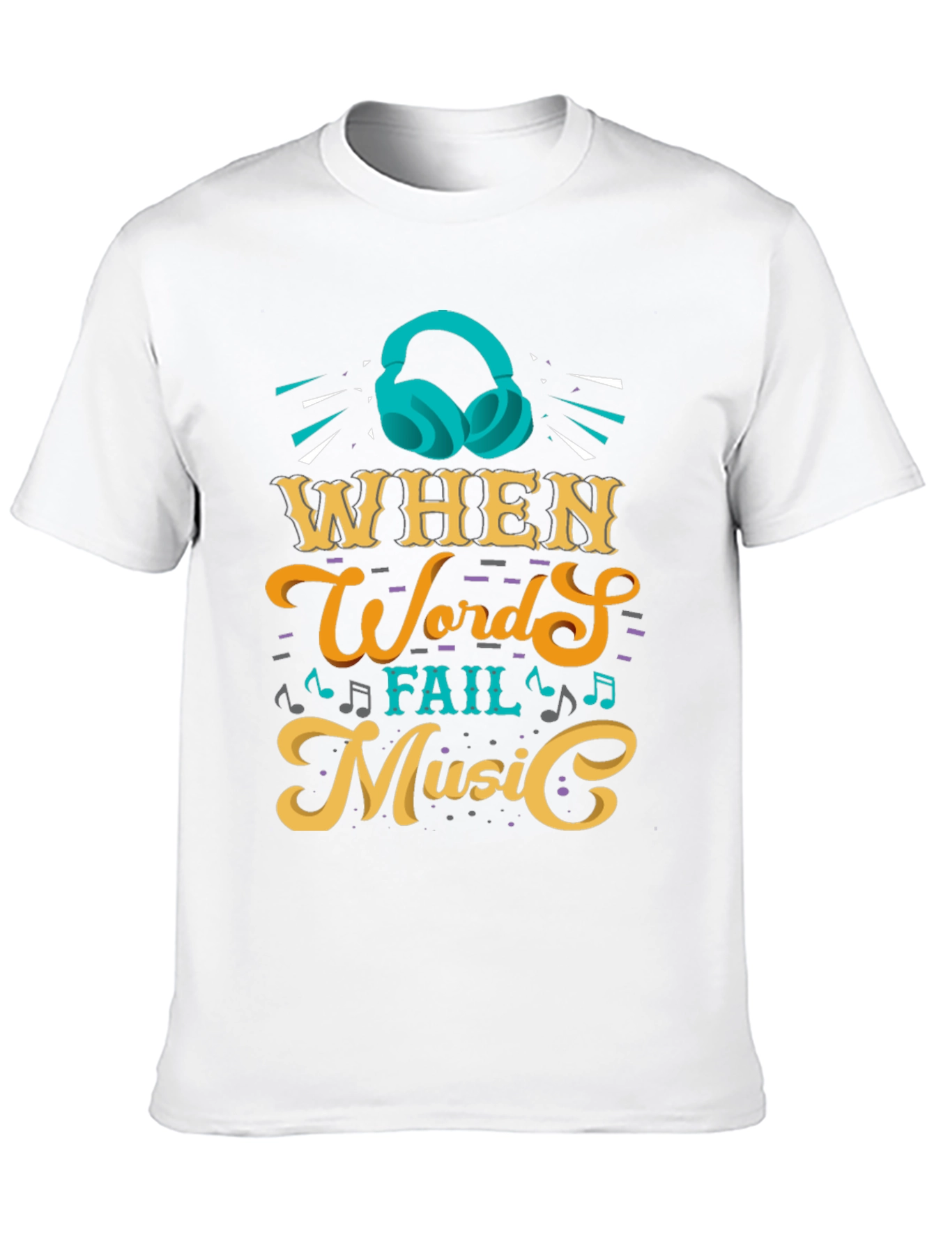Esta moderna camiseta negra presenta un diseño llamativo ideal para los amantes de la música. El estampado colorido muestra unos audífonos y la frase "When Words Fail Music" (Cuando las Palabras Fallan, la Música). Perfecta para expresar tu pasión por la música con estilo. Su corte clásico y tejido suave ofrecen comodidad durante todo el día. Ideal para usar en conciertos, festivales o simplemente para el uso diario. Combina esta camiseta con jeans o shorts para un look casual y moderno. Un regalo perfecto para músicos y fanáticos de la música por igual. Añade un toque musical a tu guardarropa.