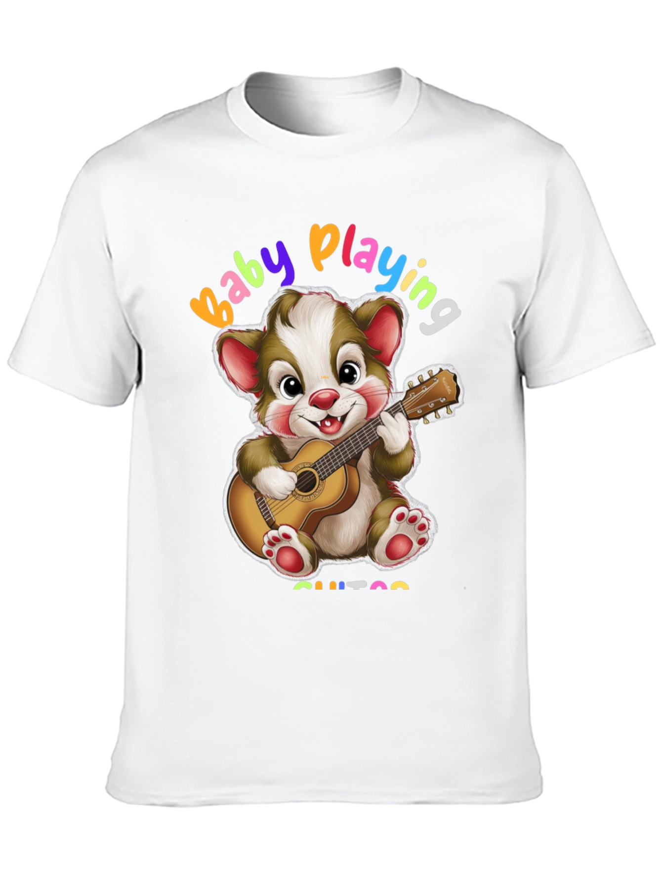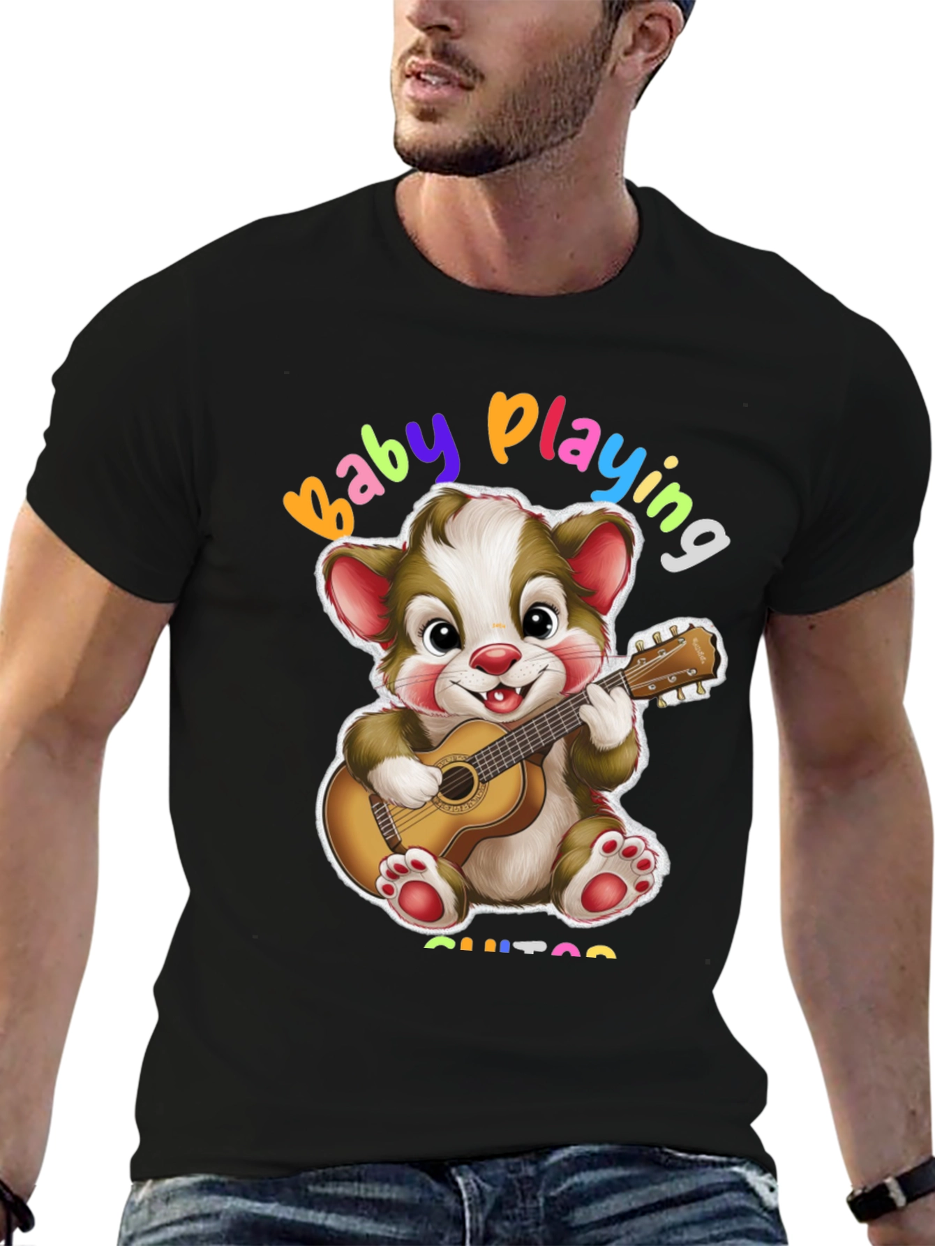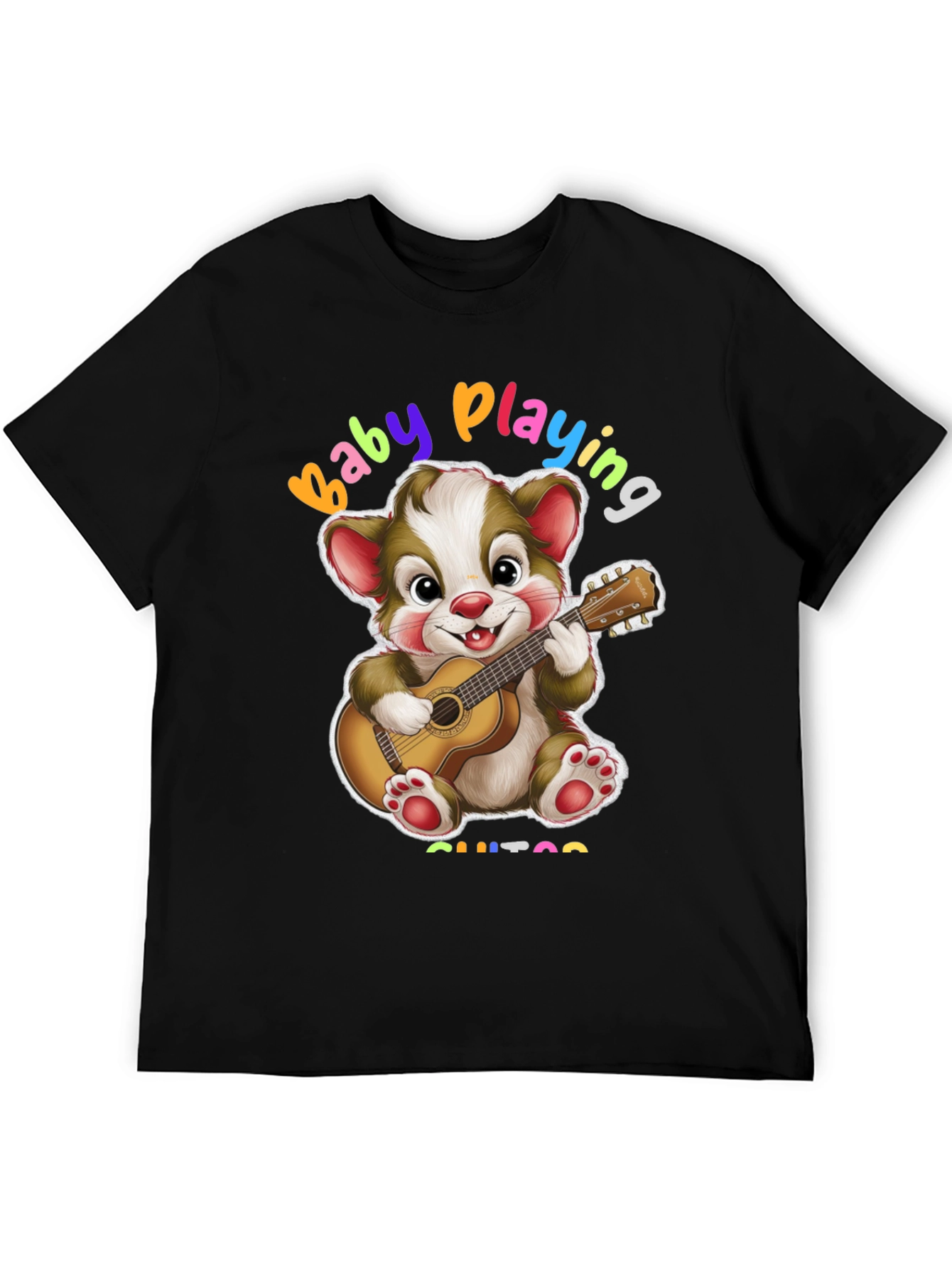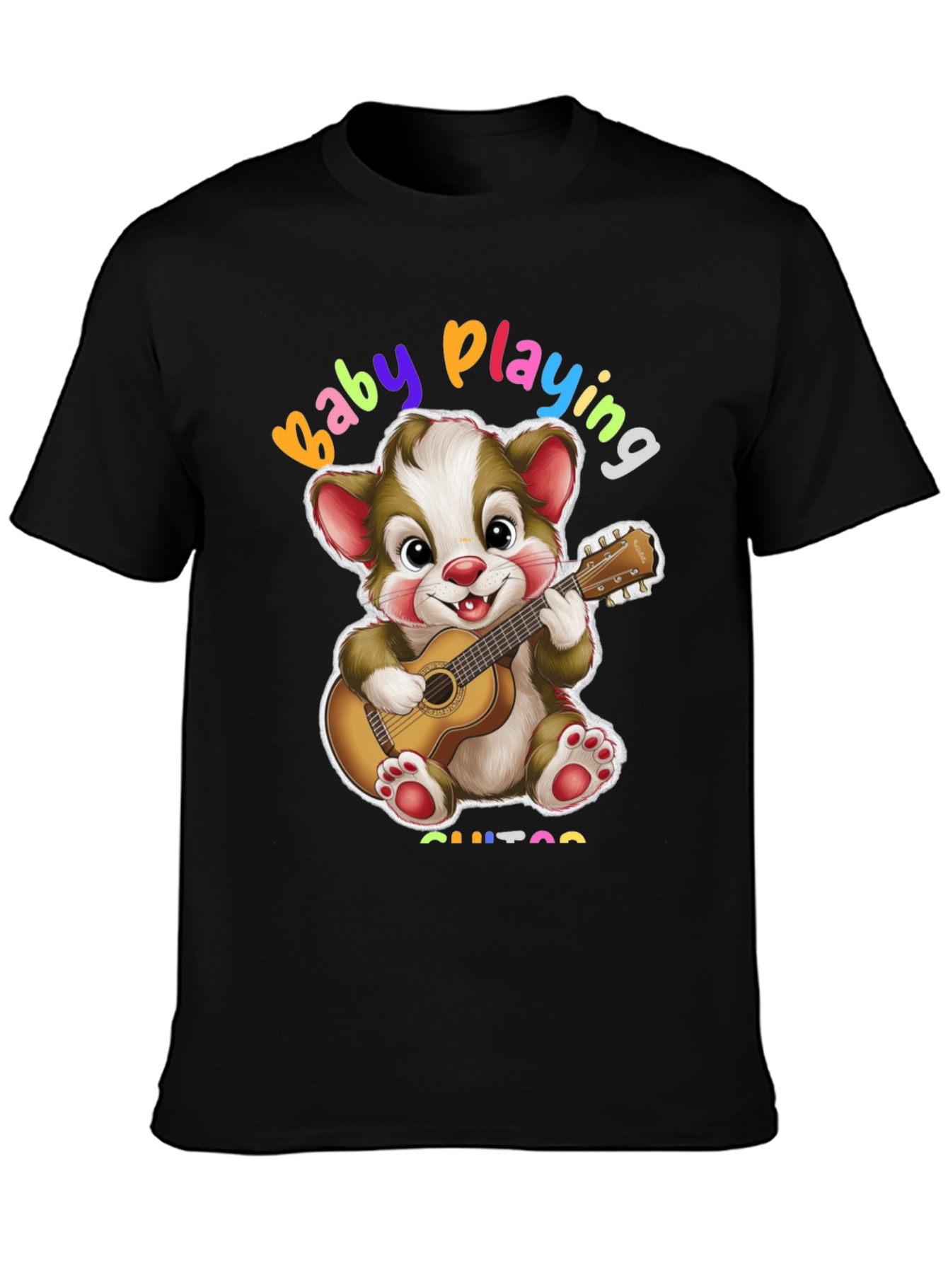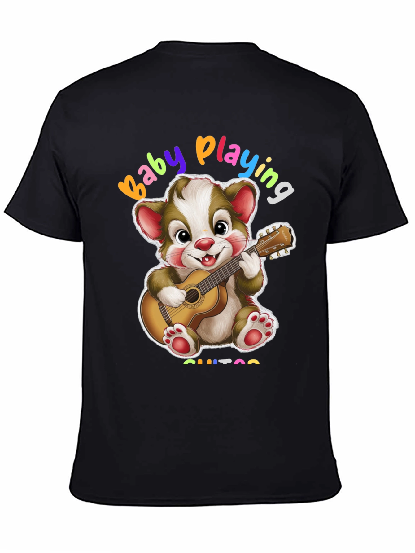 Esta camiseta negra presenta un adorable diseño de un oso de dibujos animados tocando la guitarra. Con la frase "Baby Playing Guitar" en colores vibrantes, es perfecta para los amantes de la música y los diseños divertidos. Fabricada con un tejido suave y cómodo, es ideal para el uso diario. Su diseño único y alegre la convierte en una prenda llamativa y original. Combínala con jeans o pantalones cortos para un look casual y moderno. Esta camiseta es perfecta para expresar tu personalidad y tu amor por la música de una manera única y divertida. ¡Añade un toque de alegría a tu guardarropa con esta encantadora camiseta!