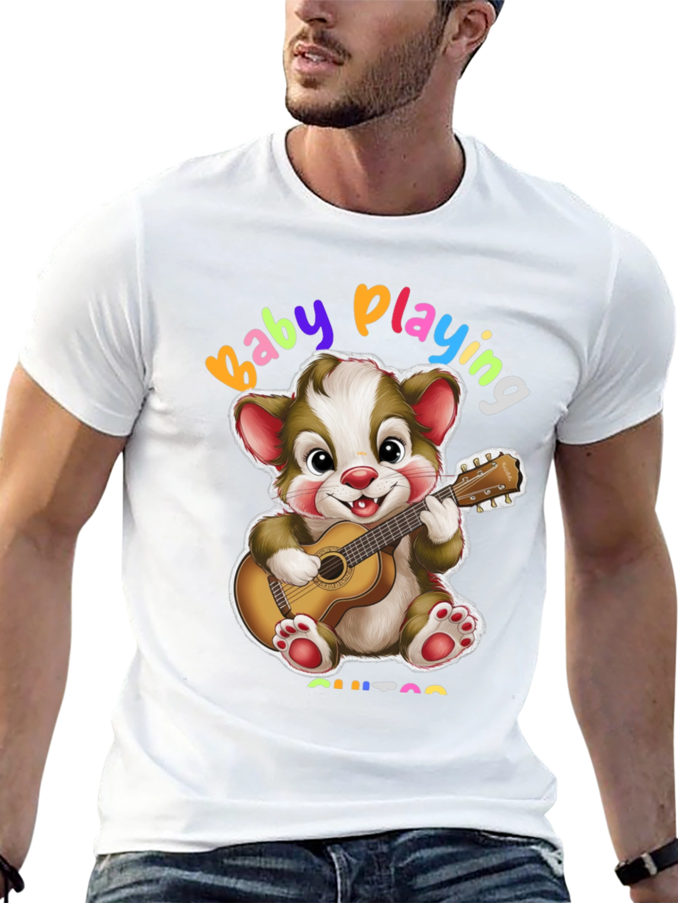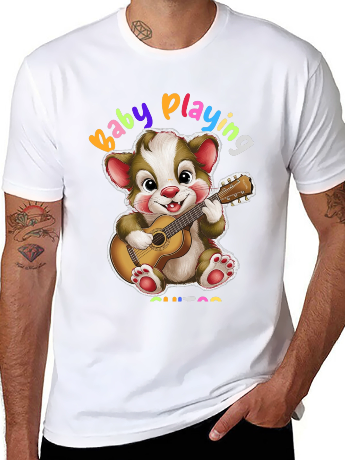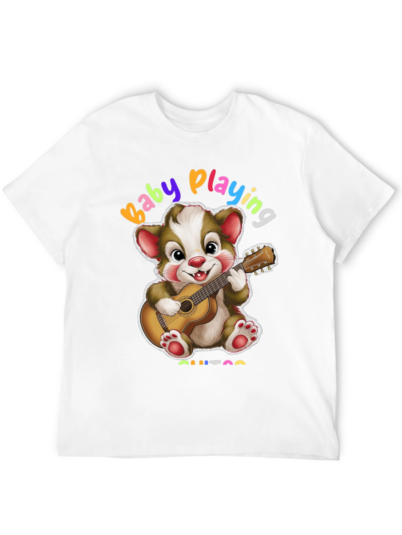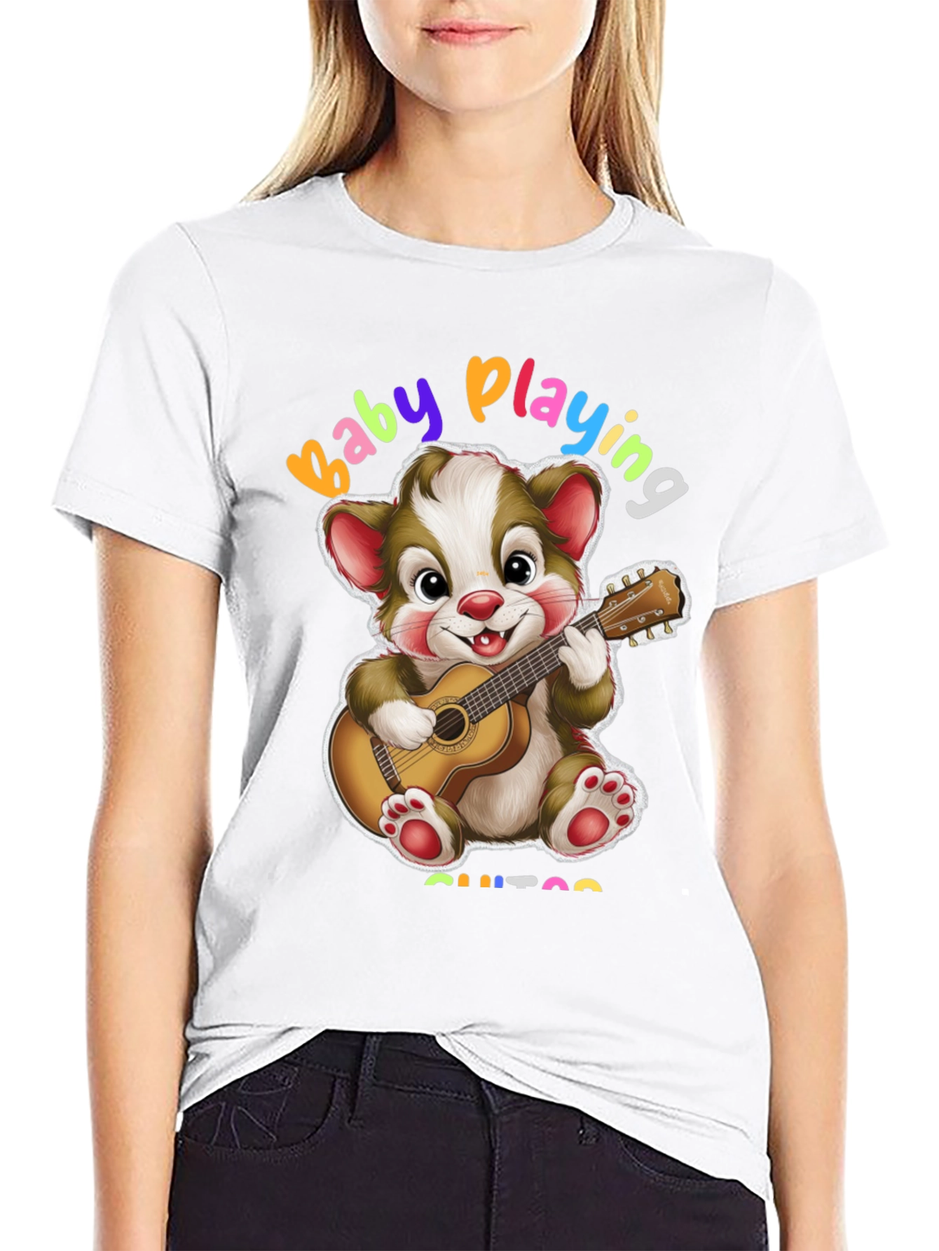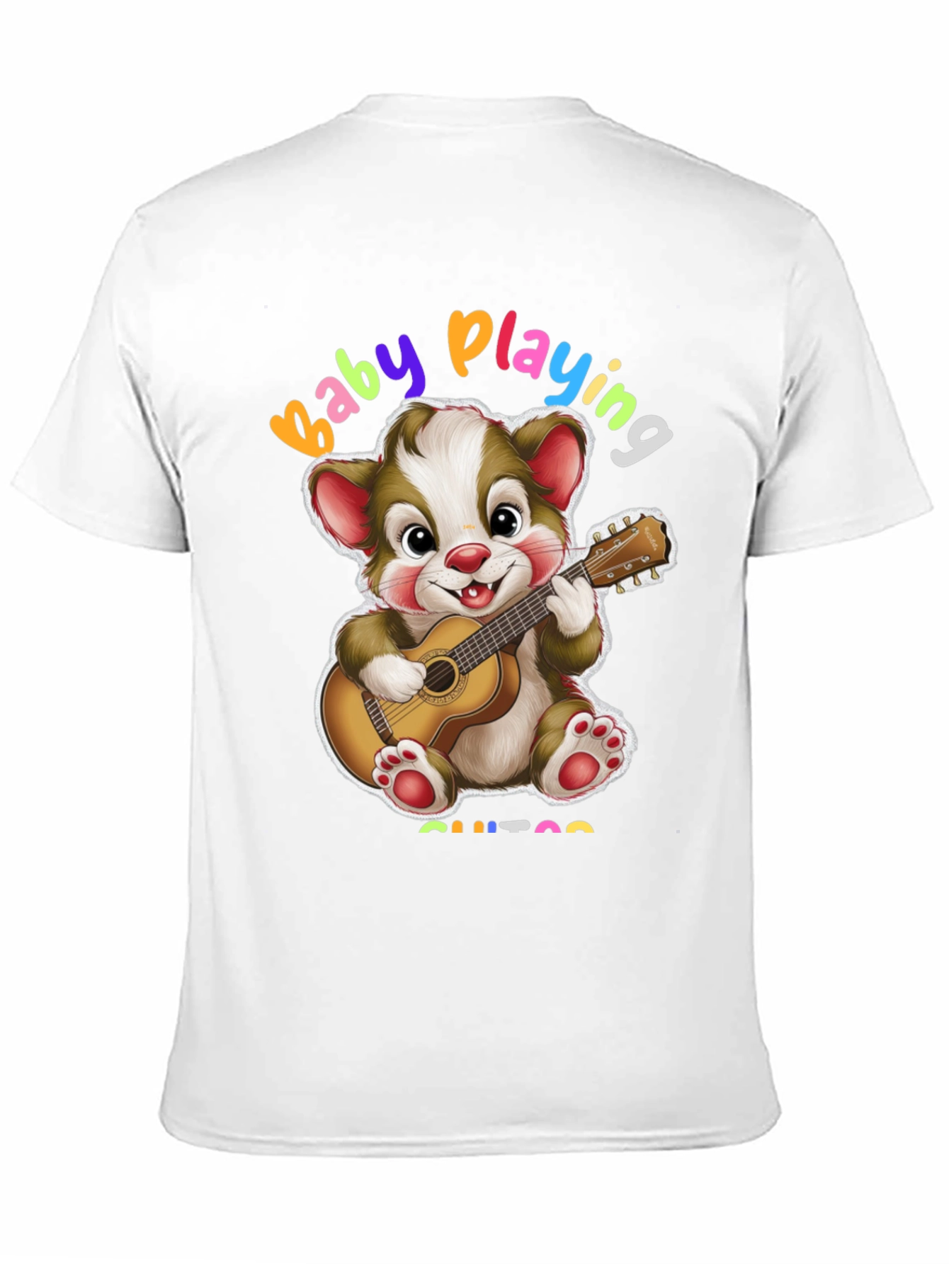 Esta camiseta negra presenta un adorable diseño de un oso de dibujos animados tocando la guitarra. Con la frase "Baby Playing Guitar" en colores vibrantes, es perfecta para los amantes de la música y los diseños divertidos. Fabricada con un tejido suave y cómodo, es ideal para el uso diario. Su diseño único y alegre la convierte en una prenda llamativa y original. Combínala con jeans o pantalones cortos para un look casual y moderno. Esta camiseta es perfecta para expresar tu personalidad y tu amor por la música de una manera única y divertida. ¡Añade un toque de alegría a tu guardarropa con esta encantadora camiseta!