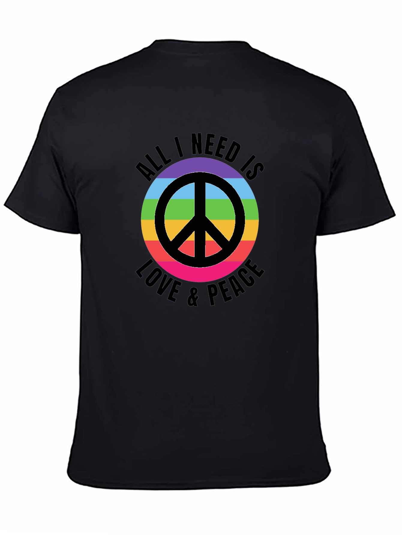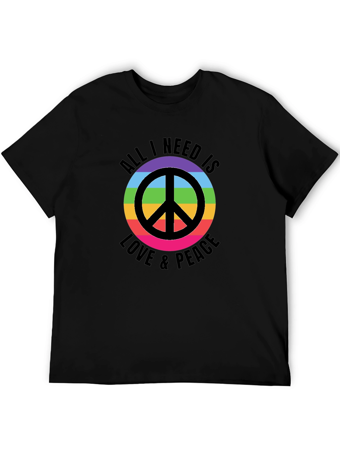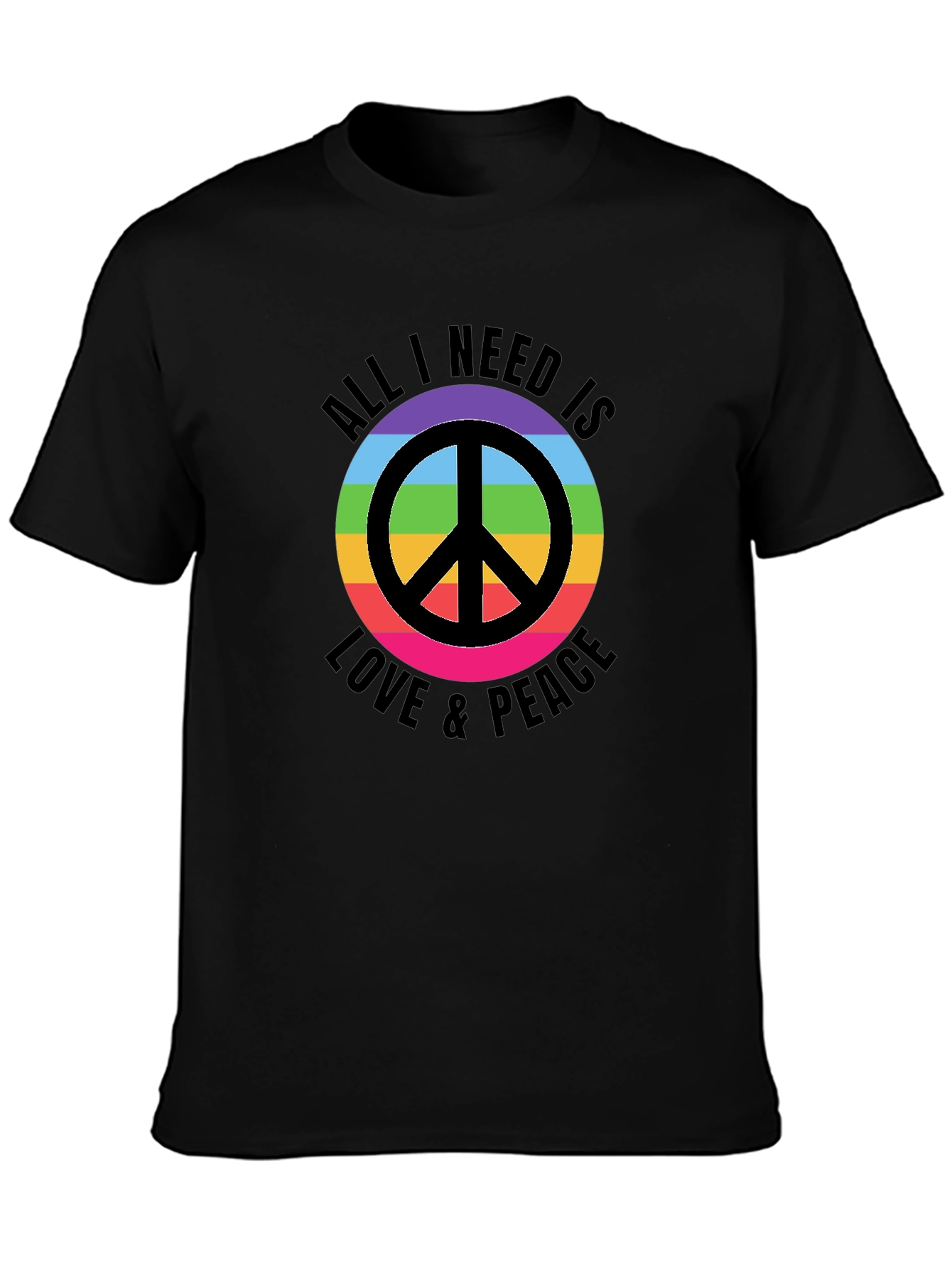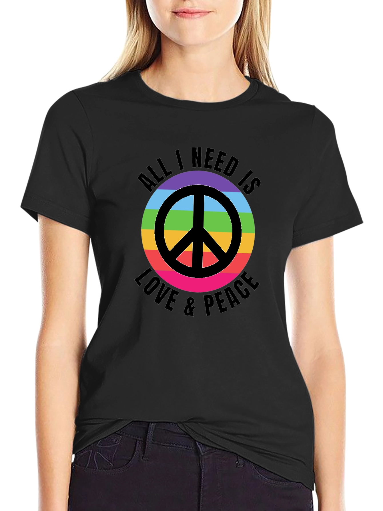 Expresa tu espíritu libre con esta camiseta negra de manga corta. Presenta un llamativo diseño circular con los colores del arcoíris y el símbolo de la paz en negro, rodeado por la frase "All I Need Is Love & Peace". Fabricada con un tejido suave y cómodo, esta camiseta es ideal para lucir un look casual y relajado. Perfecta para festivales, conciertos o simplemente para el día a día, esta prenda transmite un mensaje positivo y promueve la armonía. Combínala con jeans, pantalones cortos o faldas para un estilo único y lleno de buena vibra. ¡Muestra tu amor por la paz con esta camiseta!