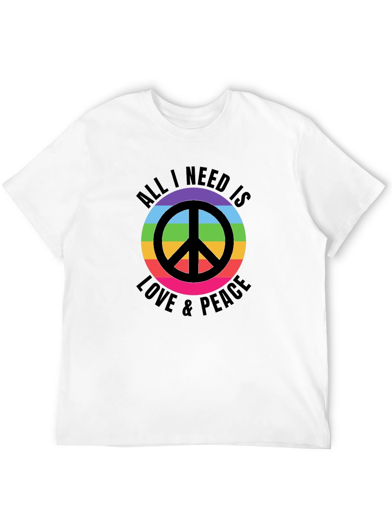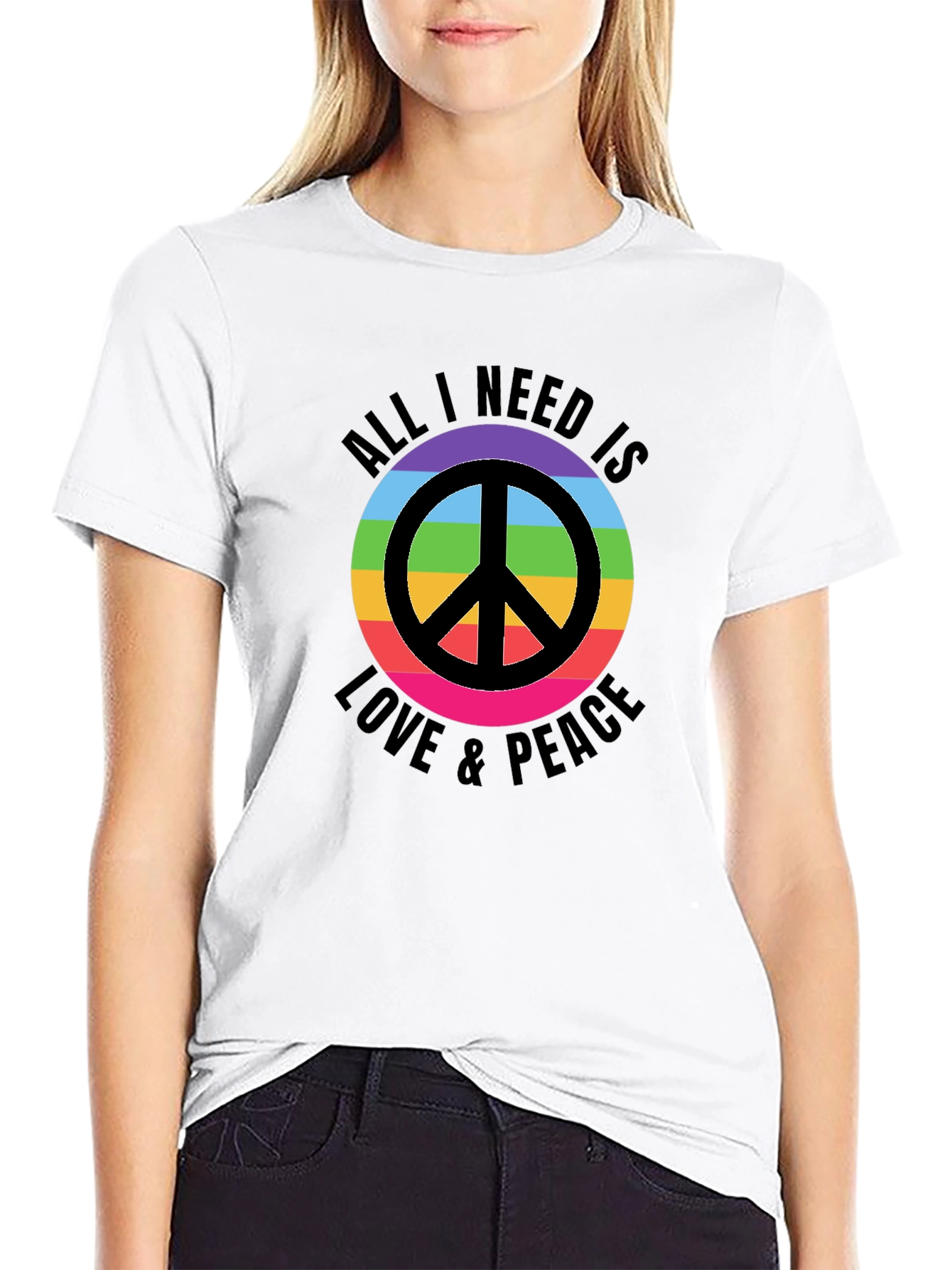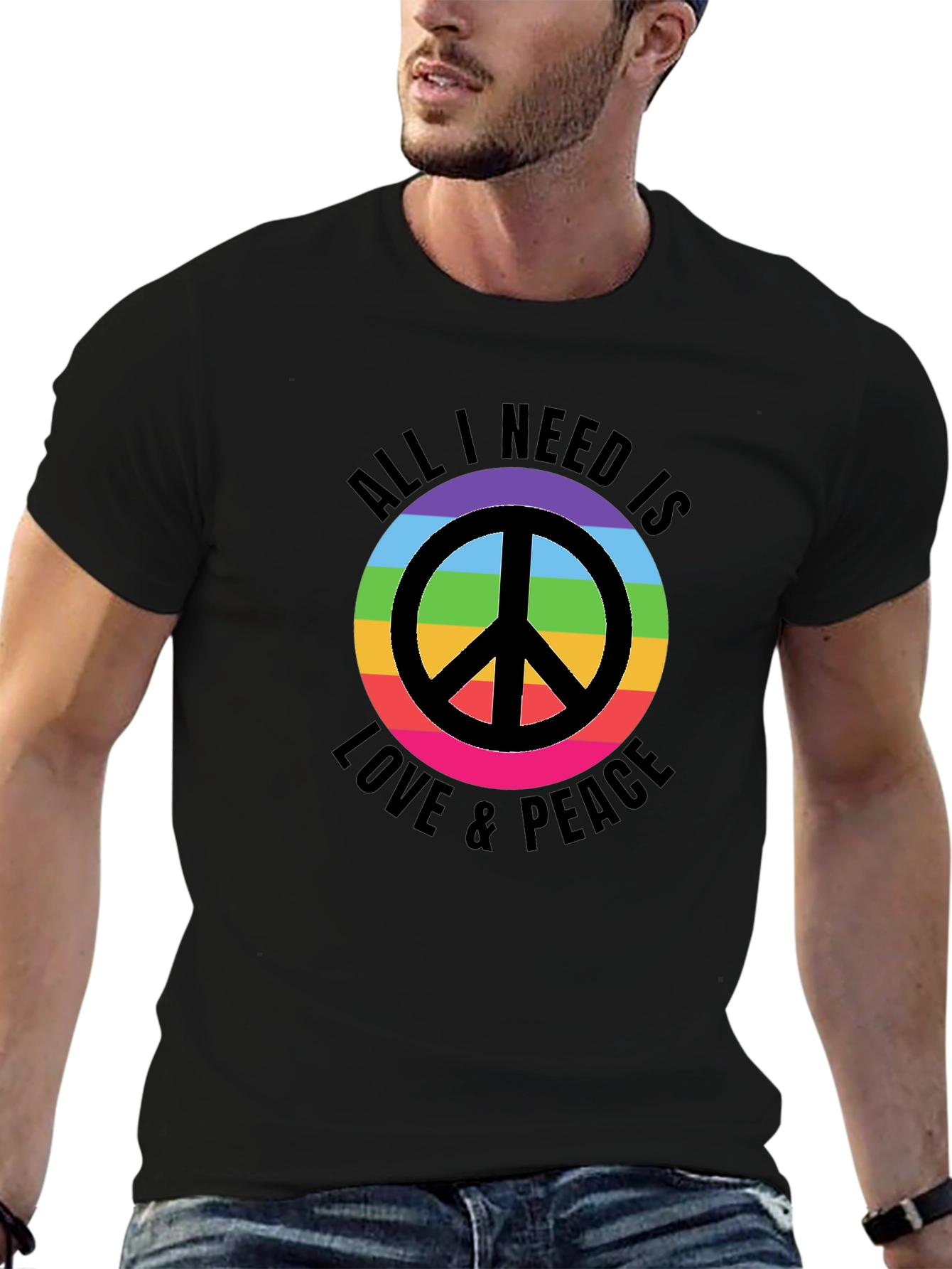 Expresa tu espíritu libre con esta camiseta negra de manga corta. Presenta un llamativo diseño circular con los colores del arcoíris y el símbolo de la paz en negro, rodeado por la frase "All I Need Is Love & Peace". Fabricada con un tejido suave y cómodo, esta camiseta es ideal para lucir un look casual y relajado. Perfecta para festivales, conciertos o simplemente para el día a día, esta prenda transmite un mensaje positivo y promueve la armonía. Combínala con jeans, pantalones cortos o faldas para un estilo único y lleno de buena vibra. ¡Muestra tu amor por la paz con esta camiseta!