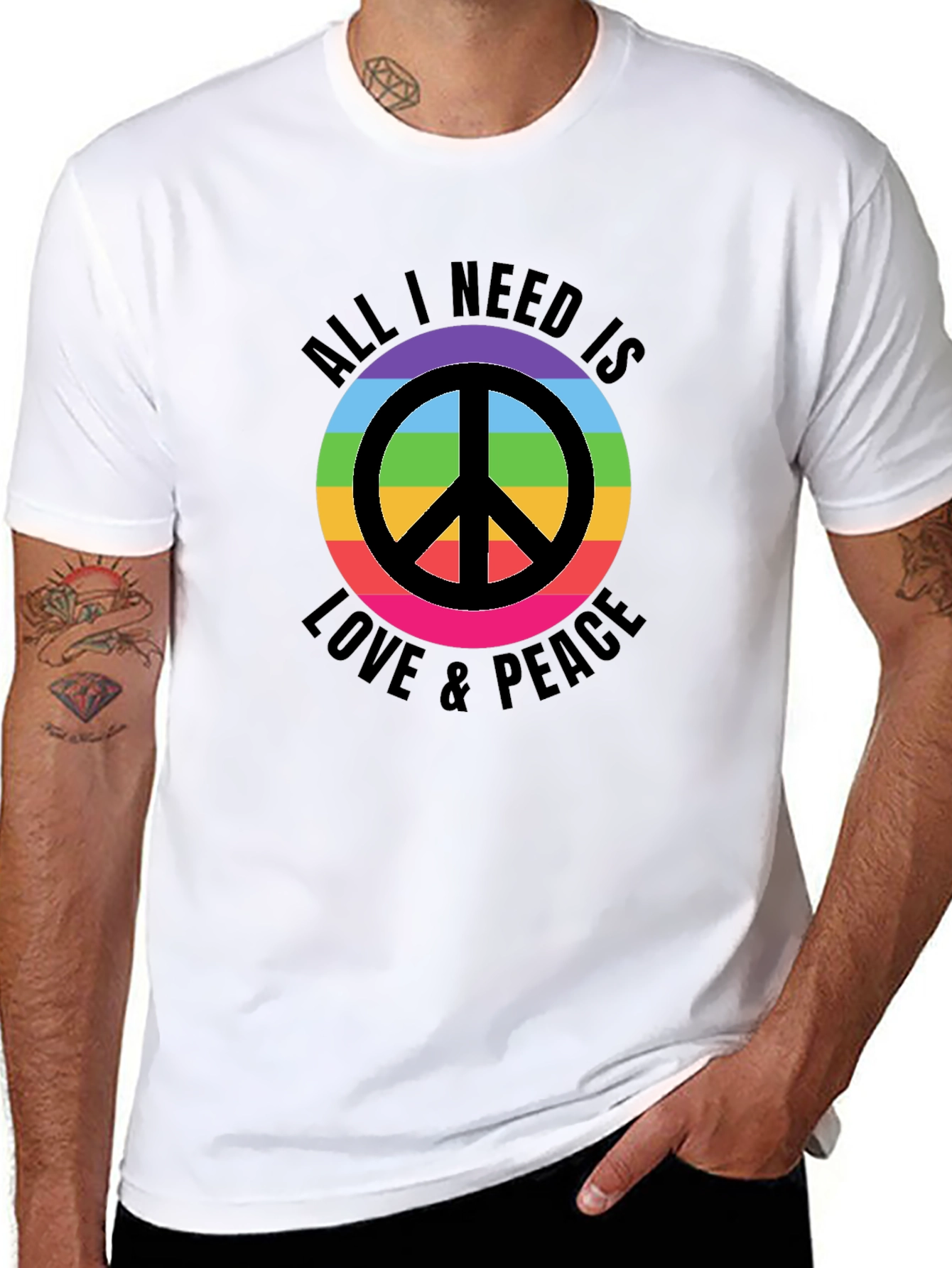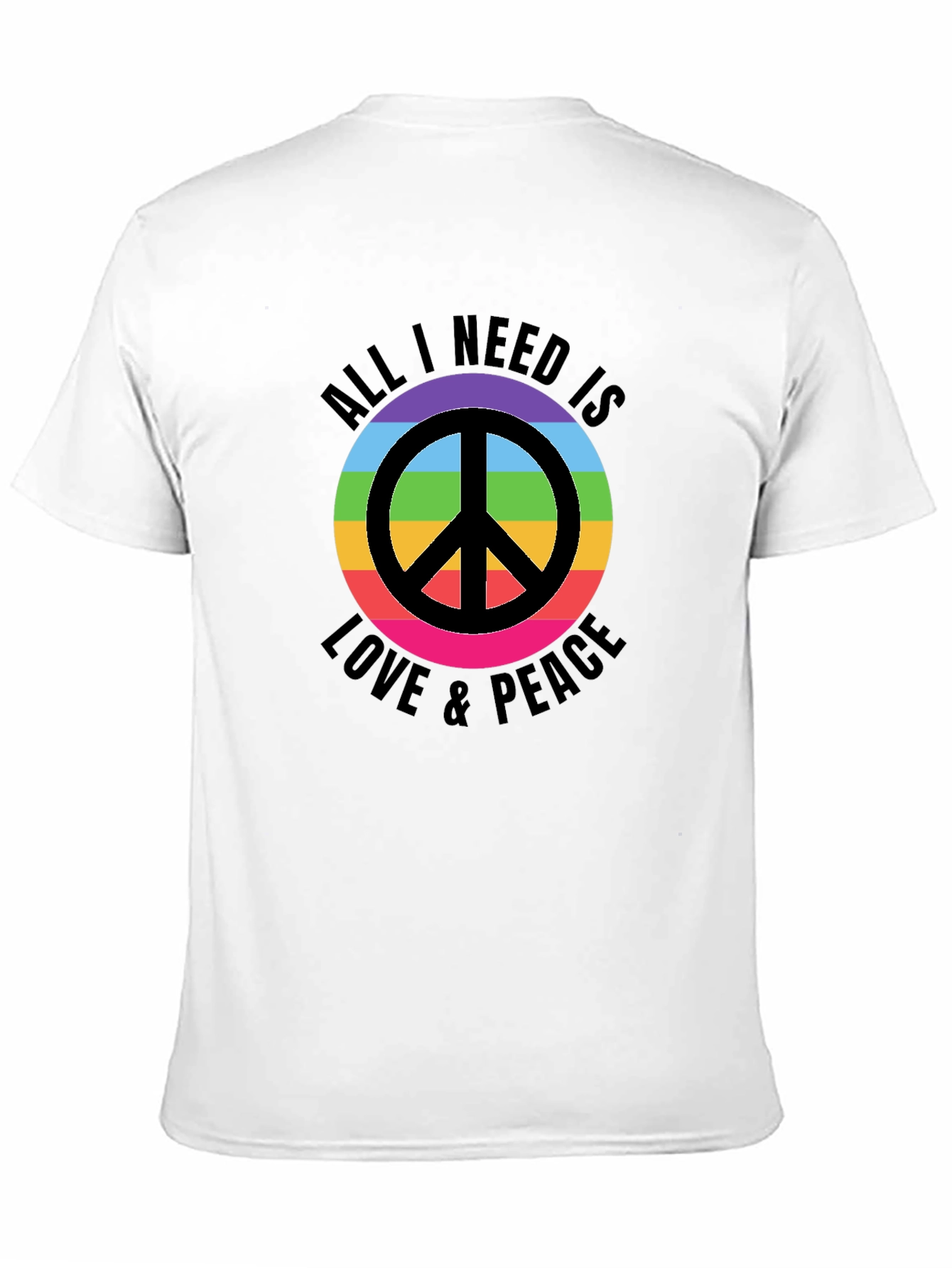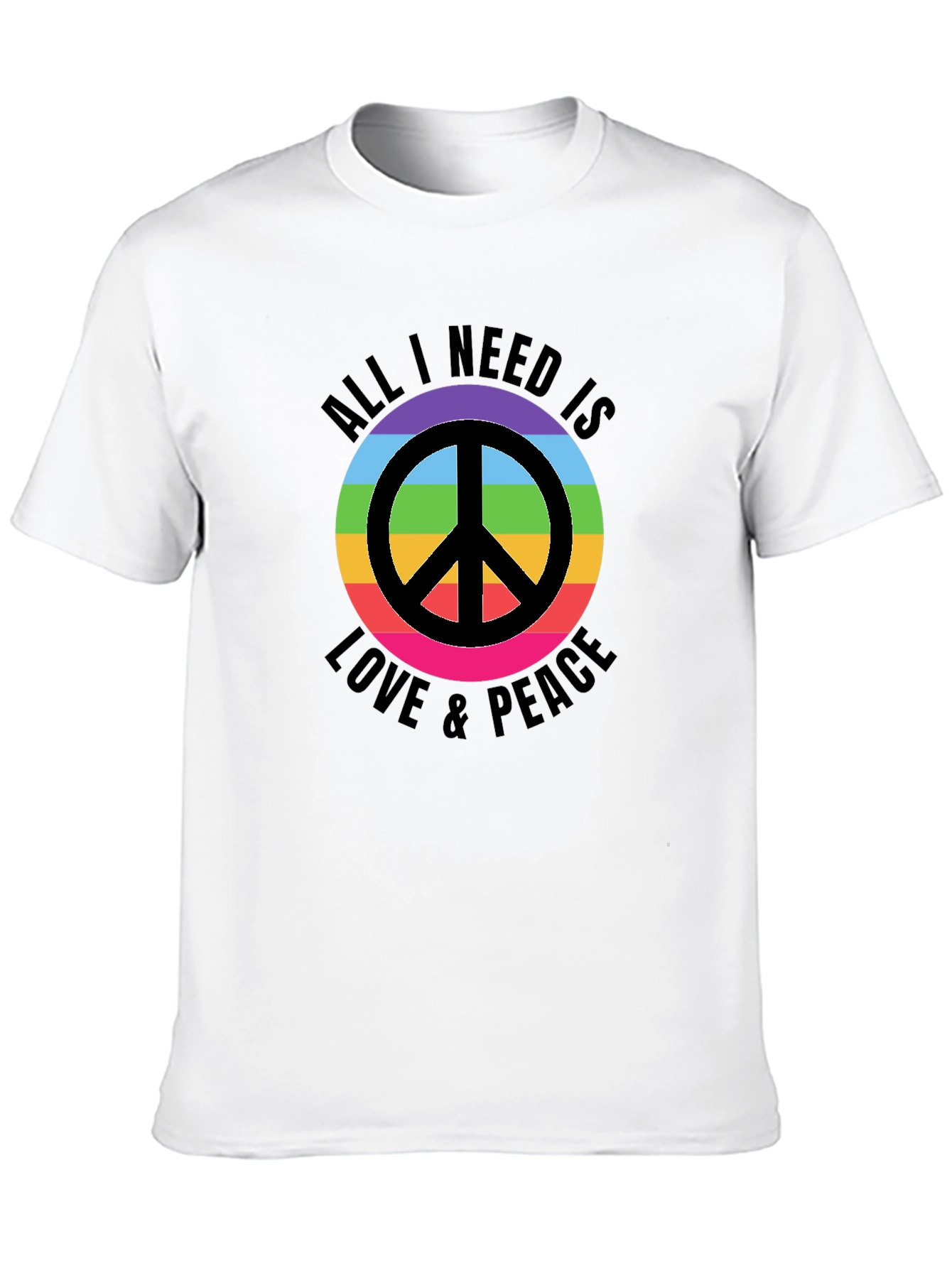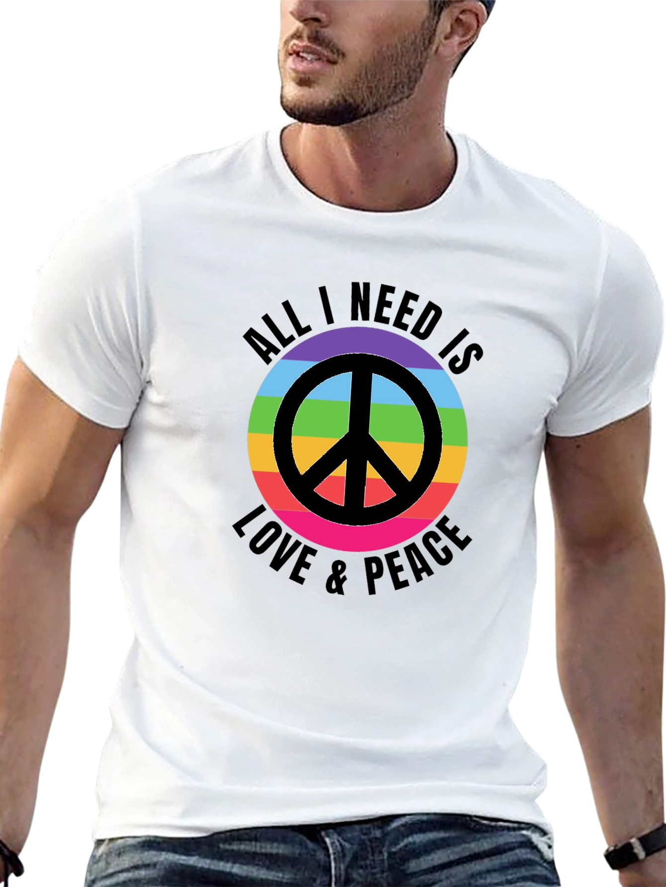 Expresa tu espíritu libre con esta camiseta negra de manga corta. Presenta un llamativo diseño circular con los colores del arcoíris y el símbolo de la paz en negro, rodeado por la frase "All I Need Is Love & Peace". Fabricada con un tejido suave y cómodo, esta camiseta es ideal para lucir un look casual y relajado. Perfecta para festivales, conciertos o simplemente para el día a día, esta prenda transmite un mensaje positivo y promueve la armonía. Combínala con jeans, pantalones cortos o faldas para un estilo único y lleno de buena vibra. ¡Muestra tu amor por la paz con esta camiseta!