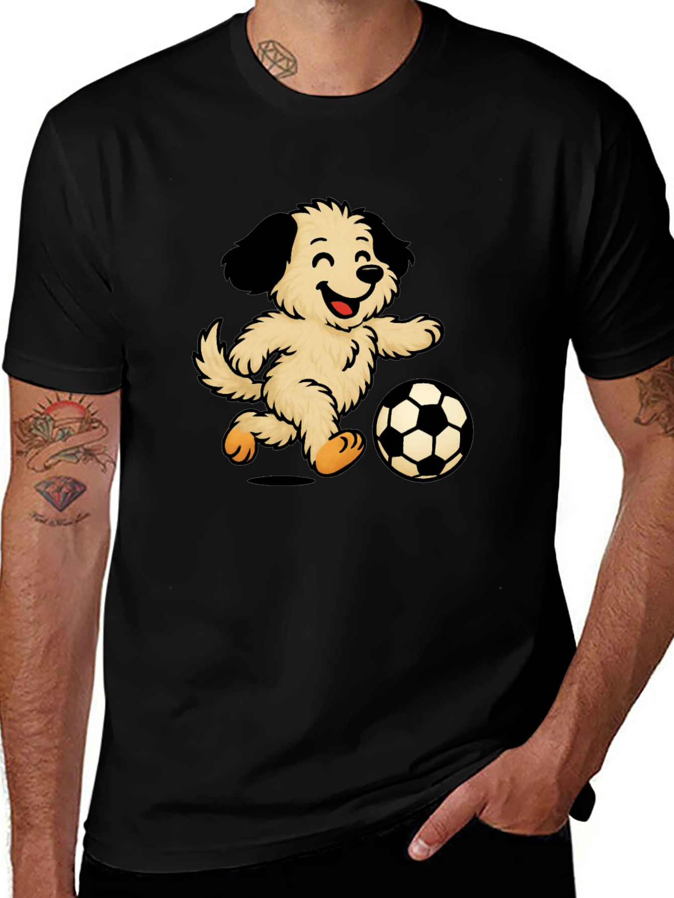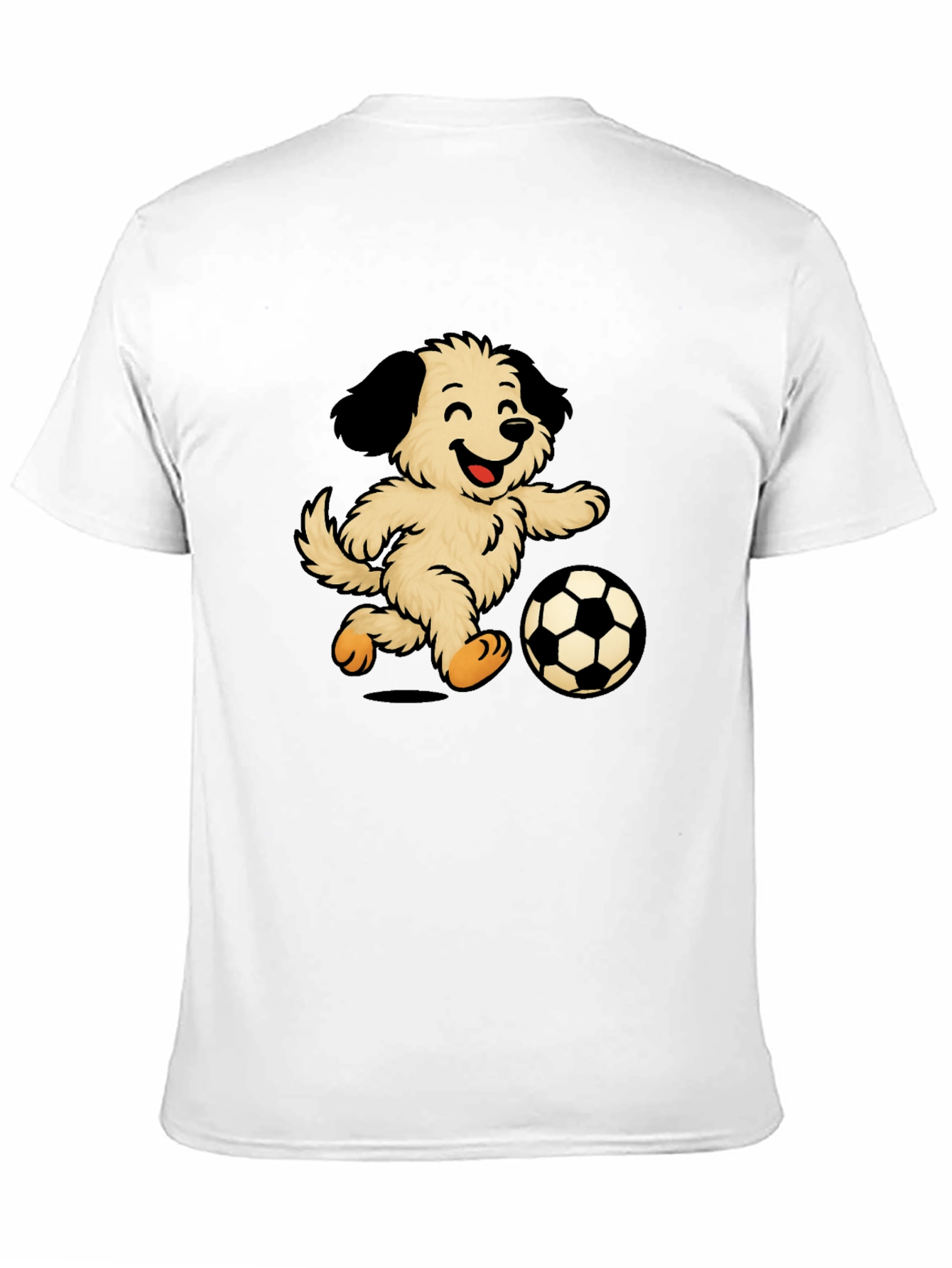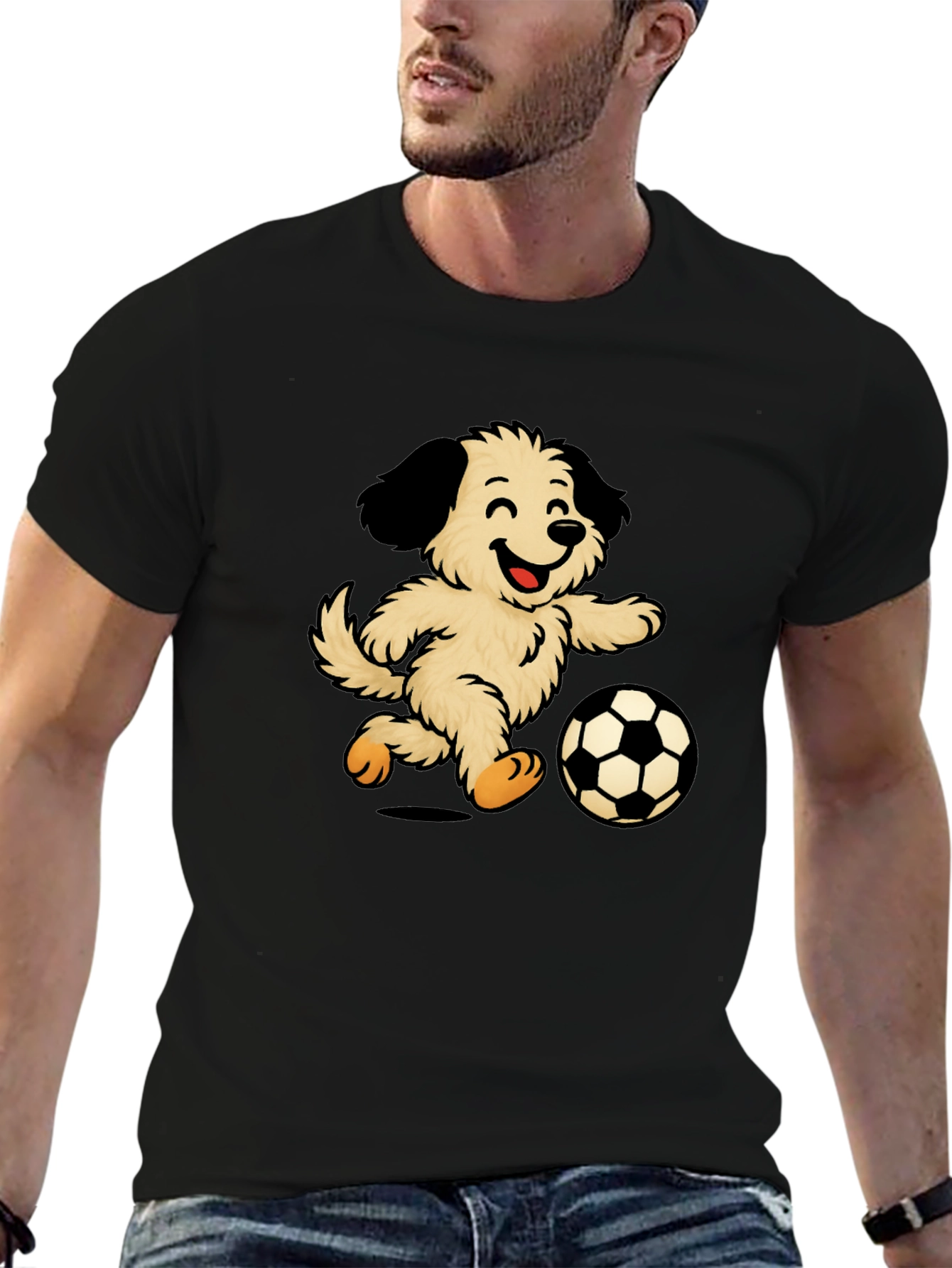 Esta divertida camiseta negra presenta un adorable diseño de un perro peludo y sonriente jugando al fútbol. La ilustración vibrante y llamativa destaca sobre el fondo oscuro de la camiseta, creando un contraste atractivo. Fabricada con un tejido suave y cómodo, esta camiseta es perfecta para el uso diario, ya sea para salir con amigos, practicar deportes o simplemente relajarse en casa. Su diseño único la convierte en una excelente opción para los amantes de los perros y los fanáticos del fútbol. Ideal para un estilo casual y relajado, esta camiseta seguramente será un éxito. ¡Muestra tu amor por los perros y el fútbol con esta prenda original y divertida!