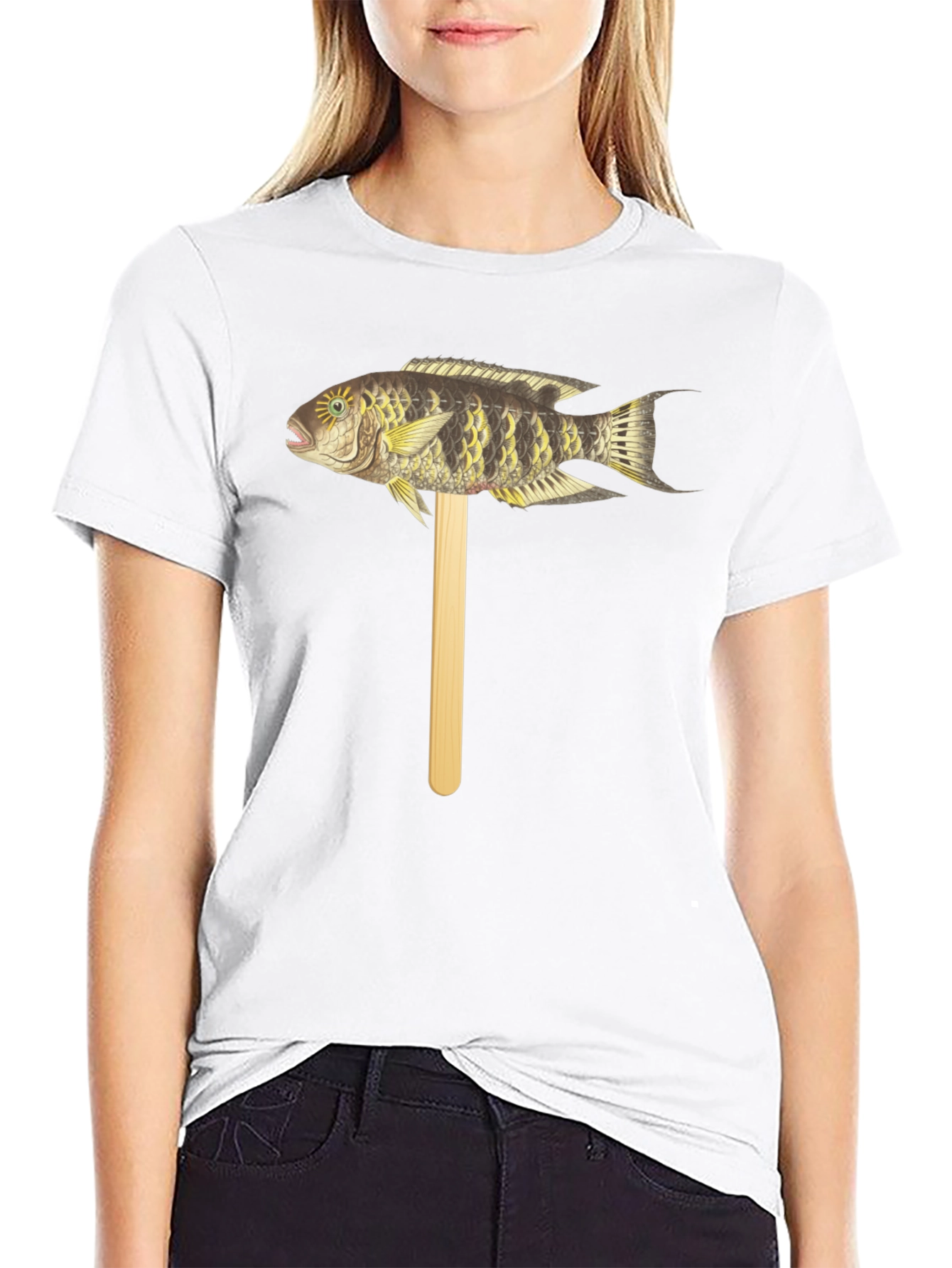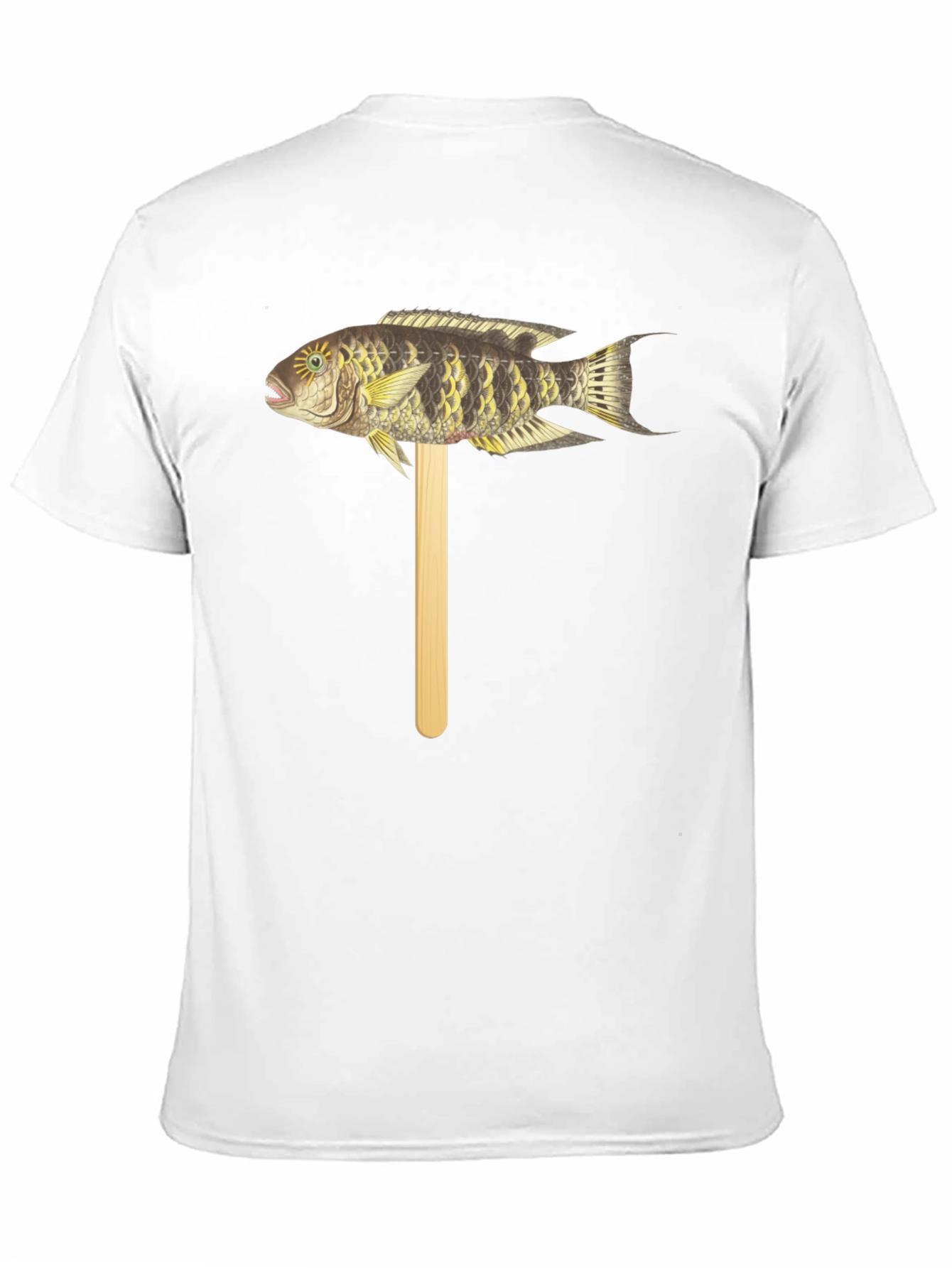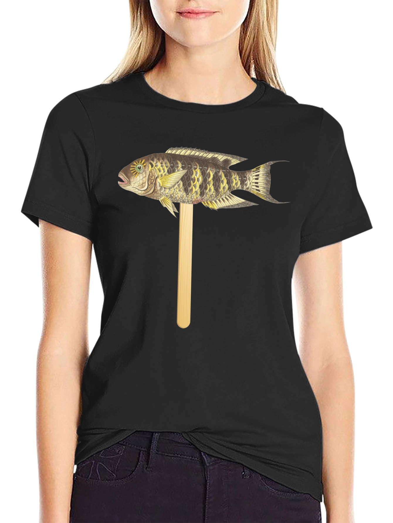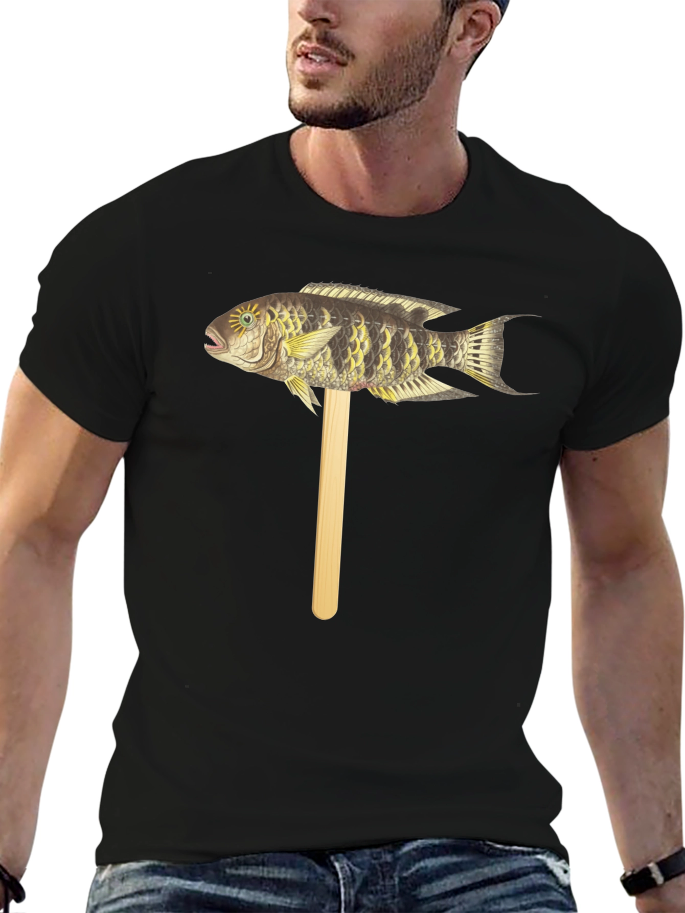 Camiseta Negra con Diseño de Pez Tropical en Palo