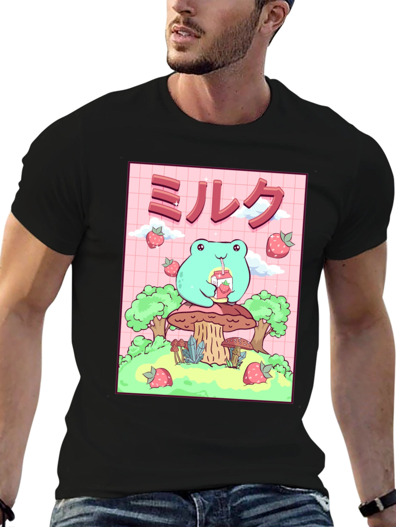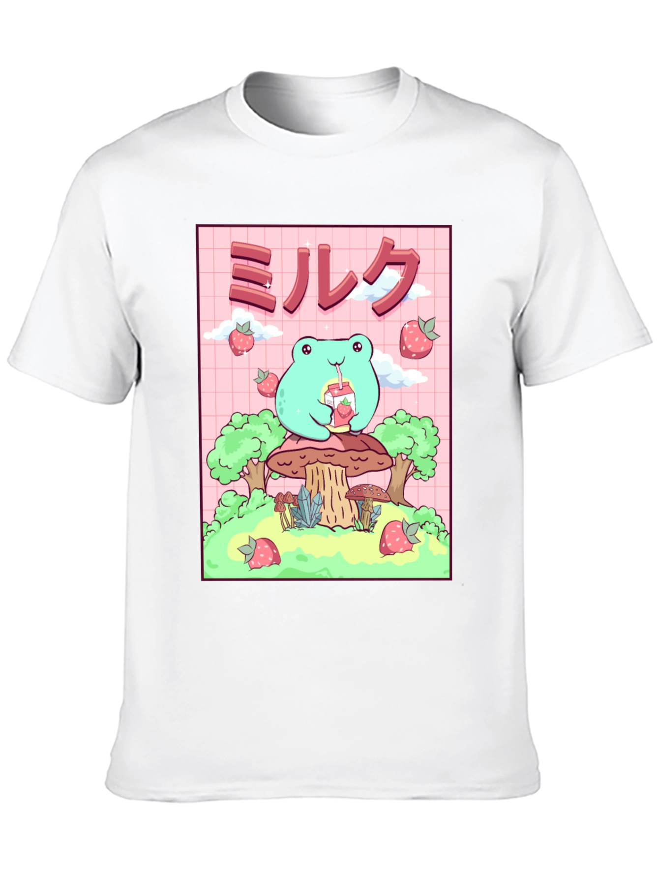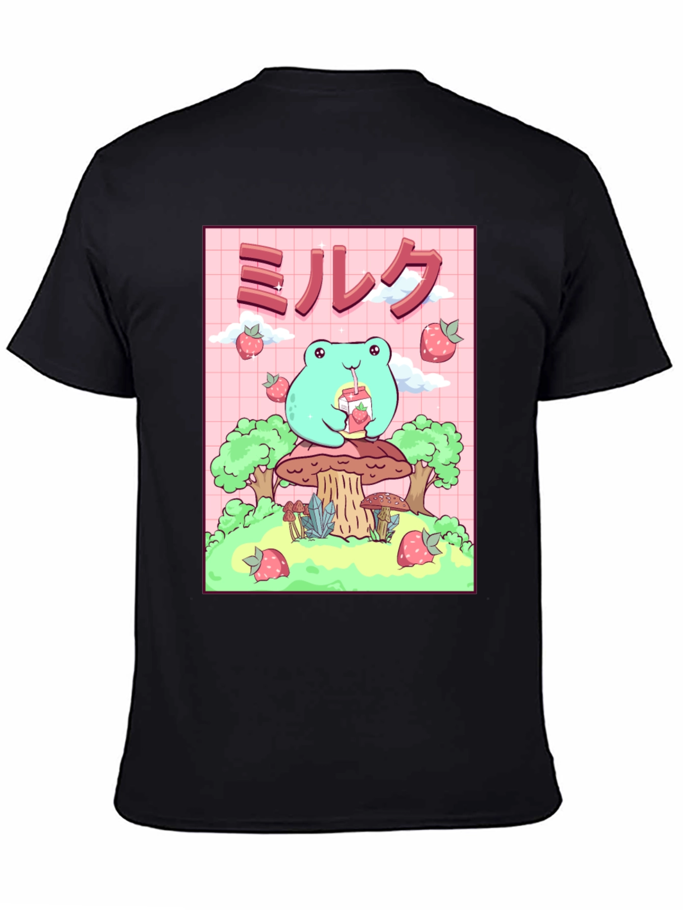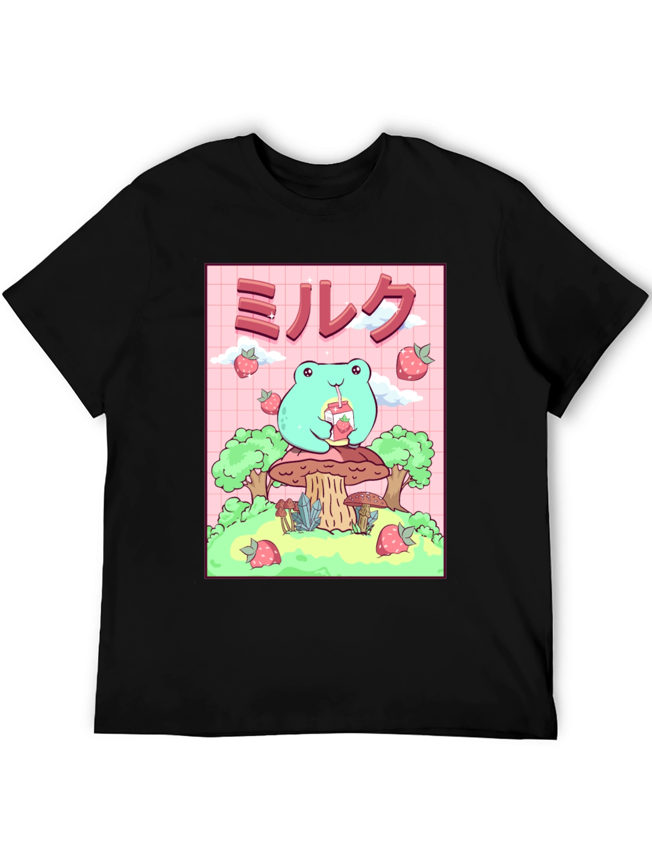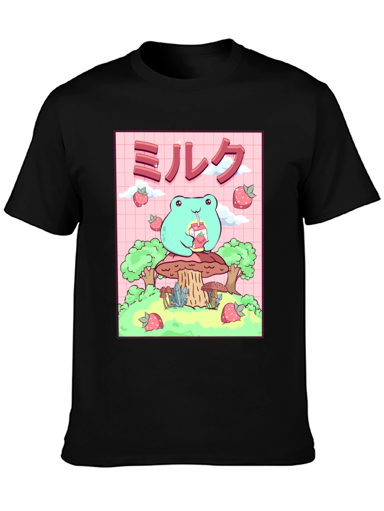 Esta camiseta negra presenta un adorable diseño de rana de estilo kawaii. La rana, de color verde claro, está sentada sobre un hongo y bebe leche de fresa. El diseño incluye fresas flotantes y árboles estilizados. El fondo es de color rosa con un patrón de cuadrícula. Esta camiseta es ideal para los amantes del estilo kawaii, el anime y la cultura japonesa. Perfecta para usar a diario, expresar tu personalidad y agregar un toque divertido a tu guardarropa. ¡Consigue esta prenda única y presume de estilo!