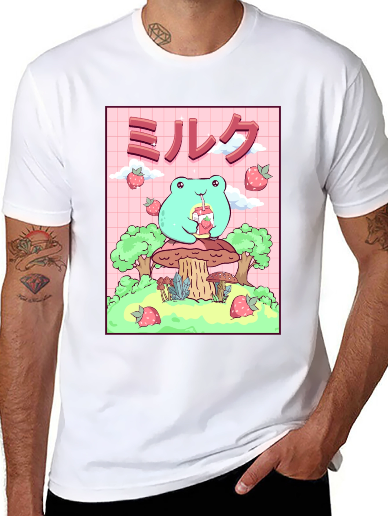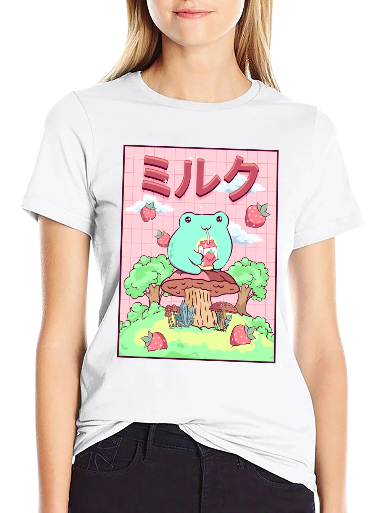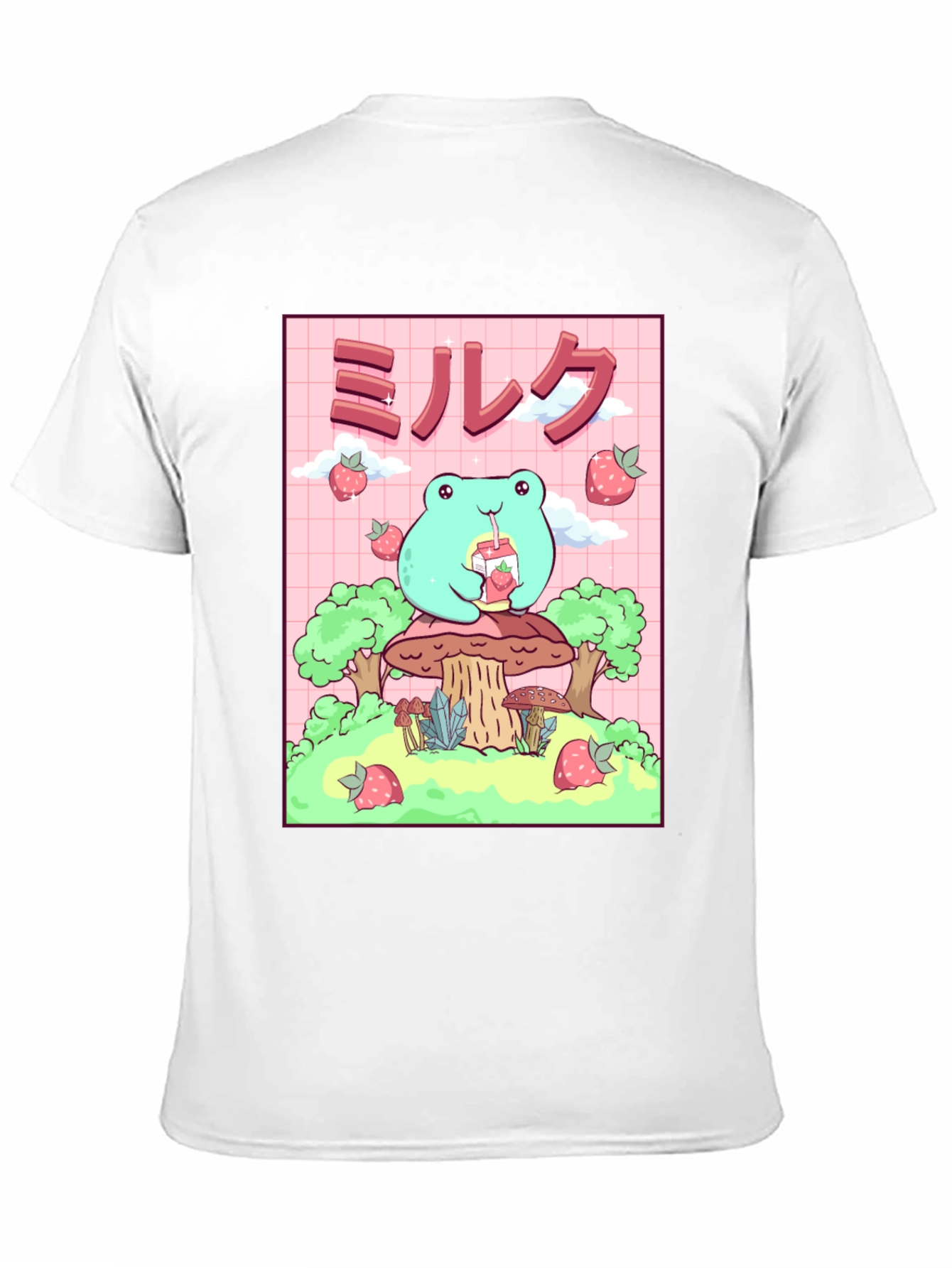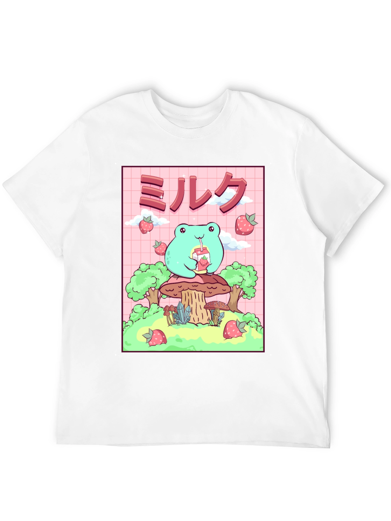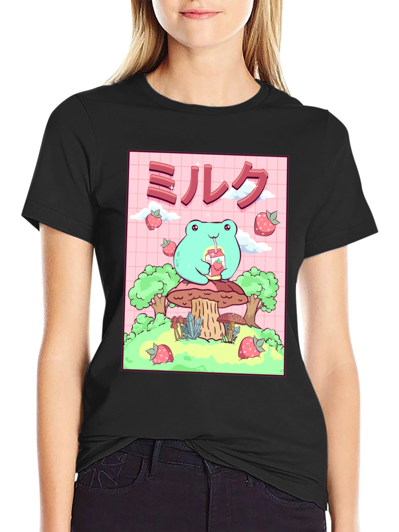 Esta camiseta negra presenta un adorable diseño de rana de estilo kawaii. La rana, de color verde claro, está sentada sobre un hongo y bebe leche de fresa. El diseño incluye fresas flotantes y árboles estilizados. El fondo es de color rosa con un patrón de cuadrícula. Esta camiseta es ideal para los amantes del estilo kawaii, el anime y la cultura japonesa. Perfecta para usar a diario, expresar tu personalidad y agregar un toque divertido a tu guardarropa. ¡Consigue esta prenda única y presume de estilo!