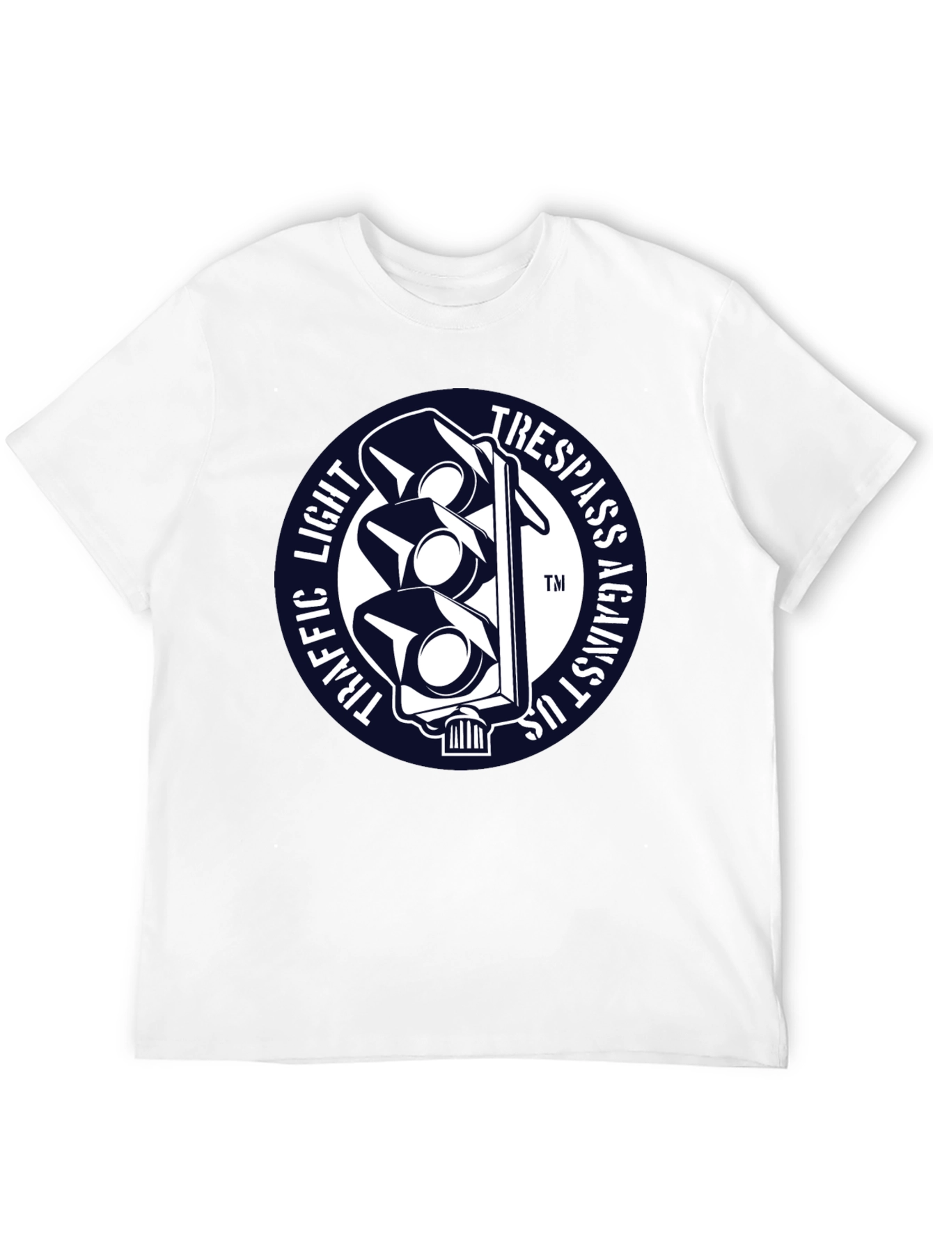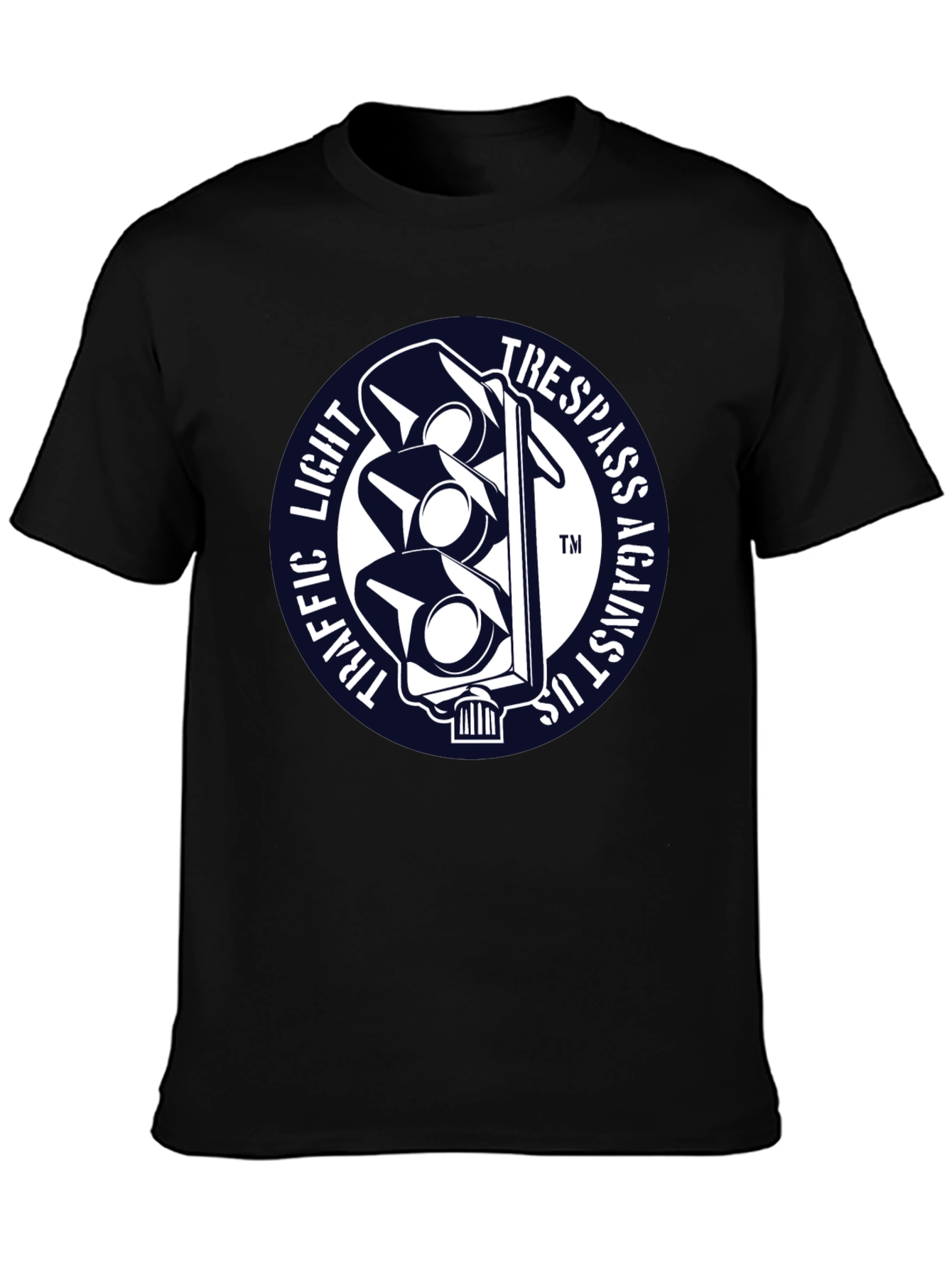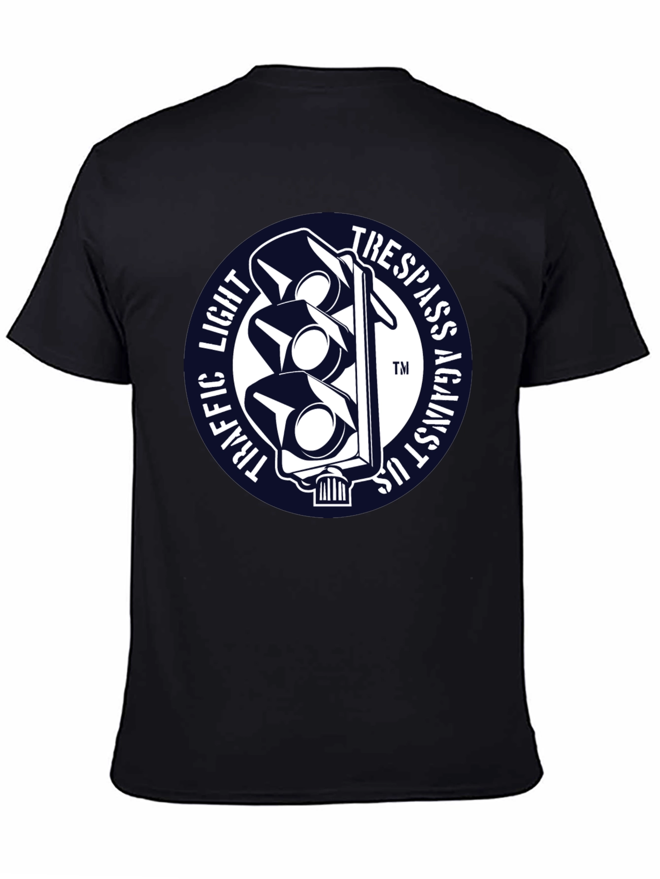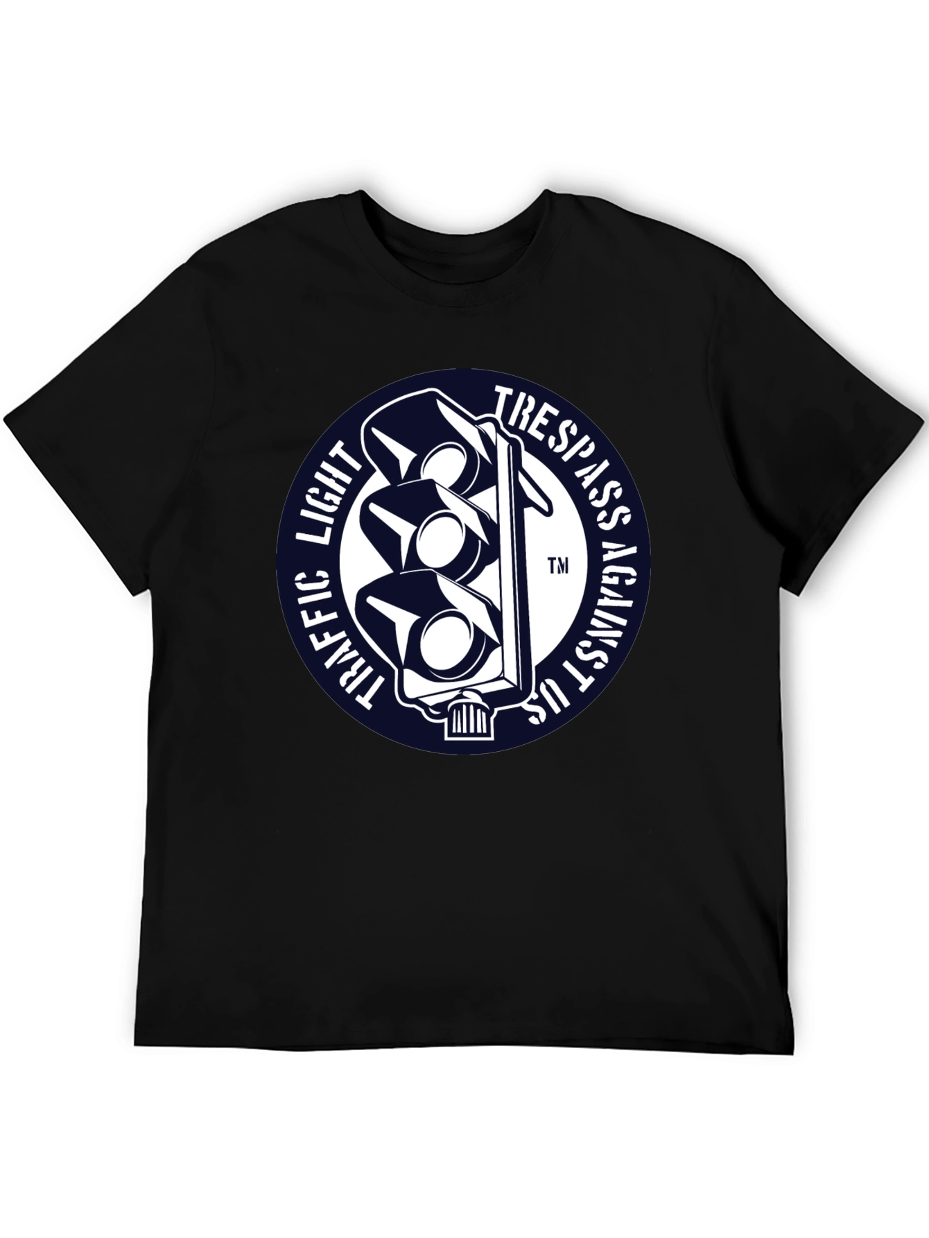 Luce esta llamativa camiseta negra con un diseño único. Presenta un distintivo gráfico circular con un semáforo estilizado en blanco sobre un fondo azul marino. Las palabras "TRAFFIC LIGHT" y "TRESPASS AGAINST US" rodean el semáforo, creando un efecto visual impactante. Fabricada con un tejido suave y confortable, esta camiseta de manga corta es perfecta para expresar tu individualidad con estilo. Ideal para uso diario, conciertos, eventos informales o simplemente para destacar entre la multitud. Agrega un toque de originalidad a tu guardarropa con esta prenda única y versátil.