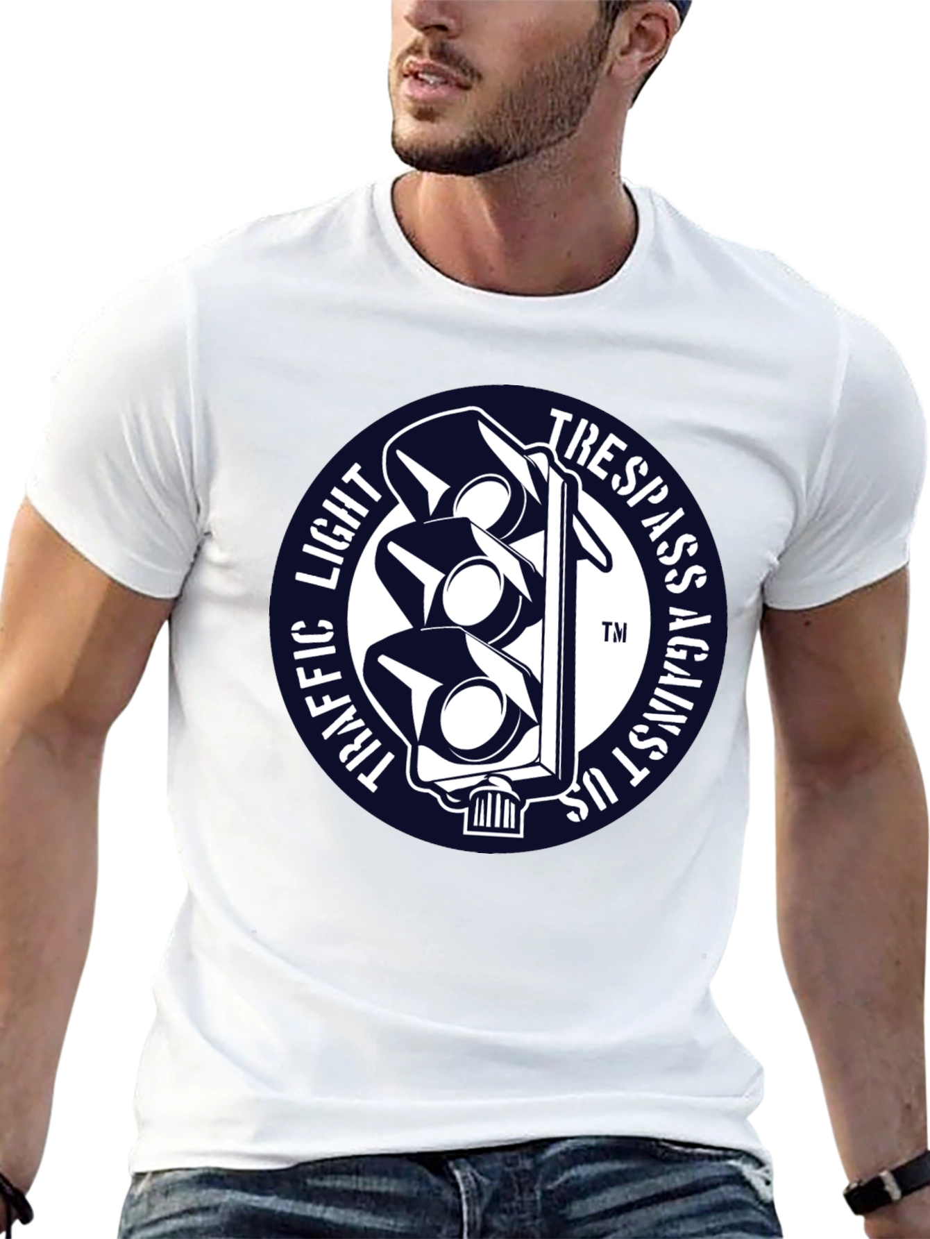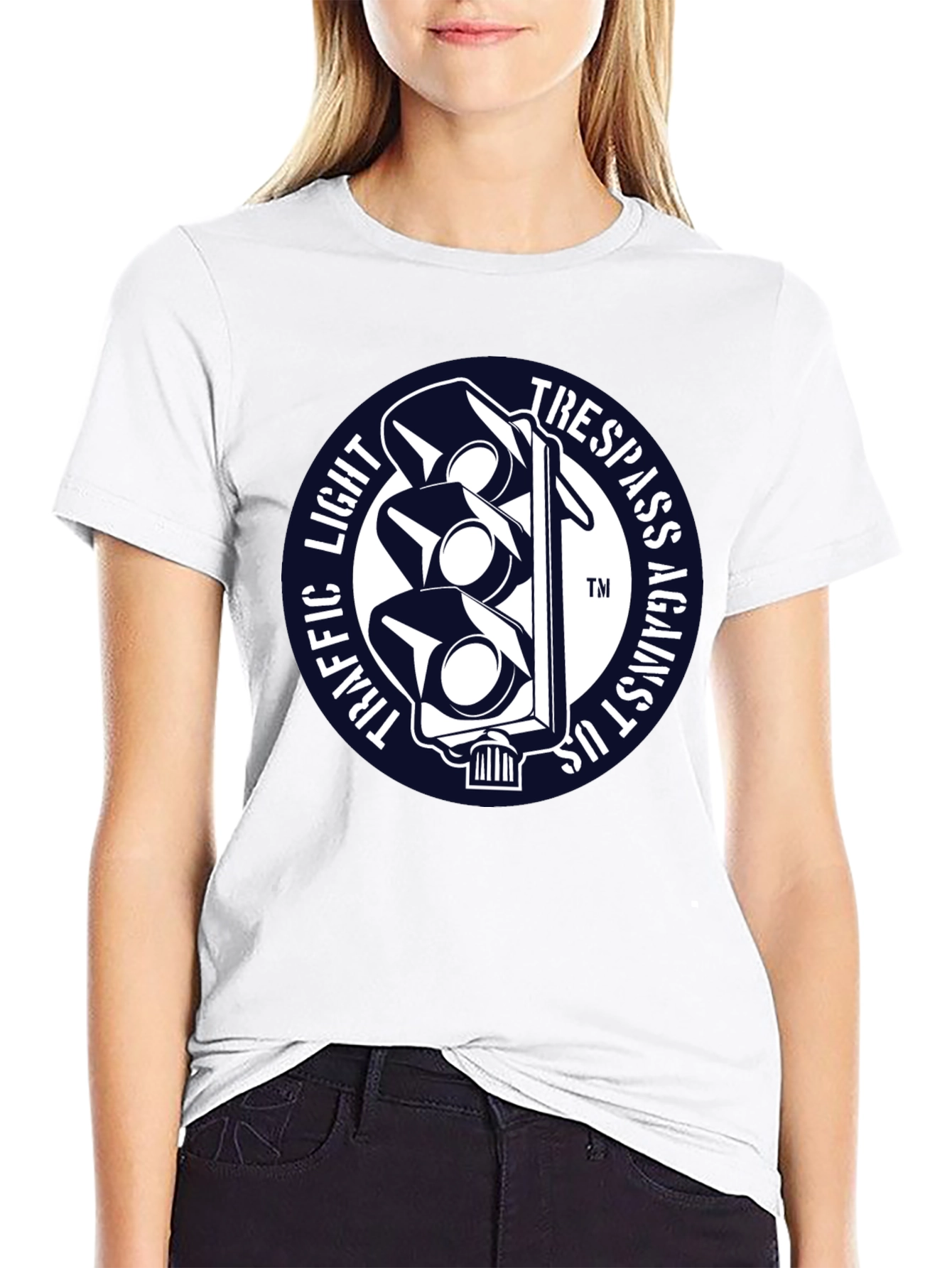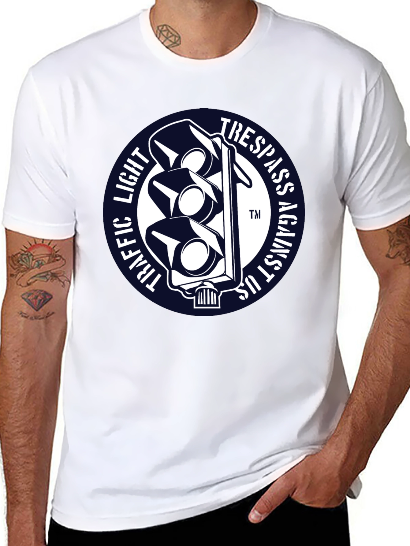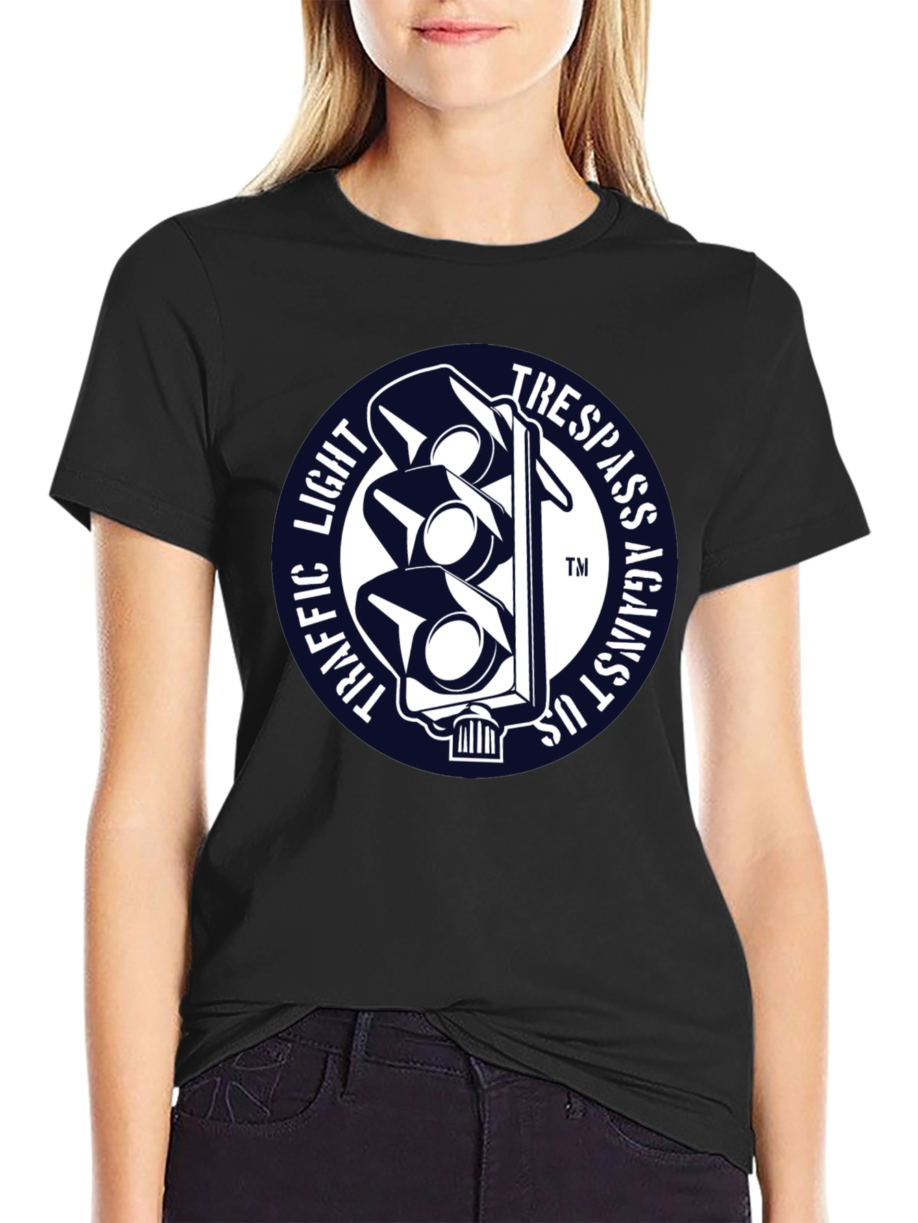 Luce esta llamativa camiseta negra con un diseño único. Presenta un distintivo gráfico circular con un semáforo estilizado en blanco sobre un fondo azul marino. Las palabras "TRAFFIC LIGHT" y "TRESPASS AGAINST US" rodean el semáforo, creando un efecto visual impactante. Fabricada con un tejido suave y confortable, esta camiseta de manga corta es perfecta para expresar tu individualidad con estilo. Ideal para uso diario, conciertos, eventos informales o simplemente para destacar entre la multitud. Agrega un toque de originalidad a tu guardarropa con esta prenda única y versátil.