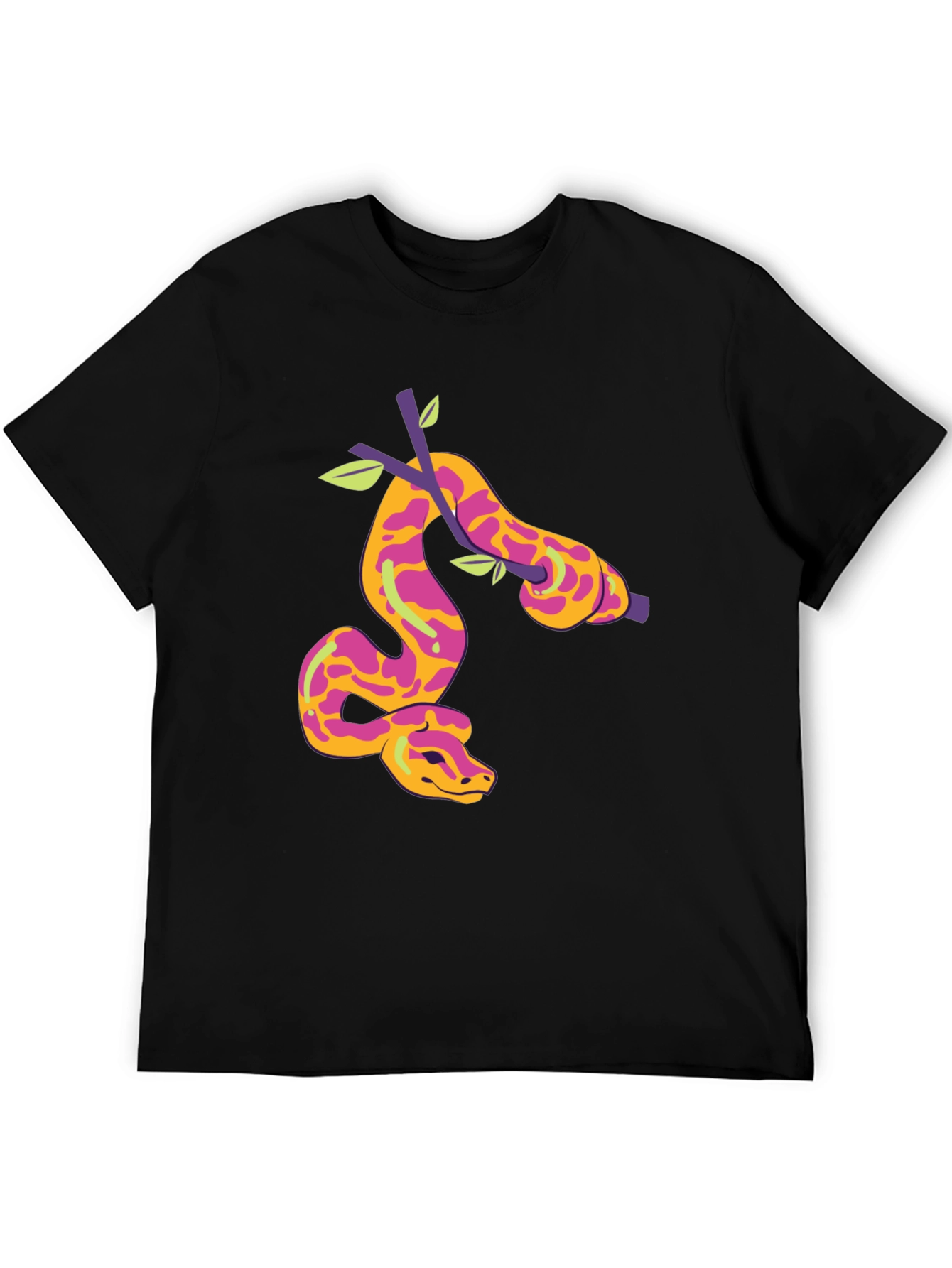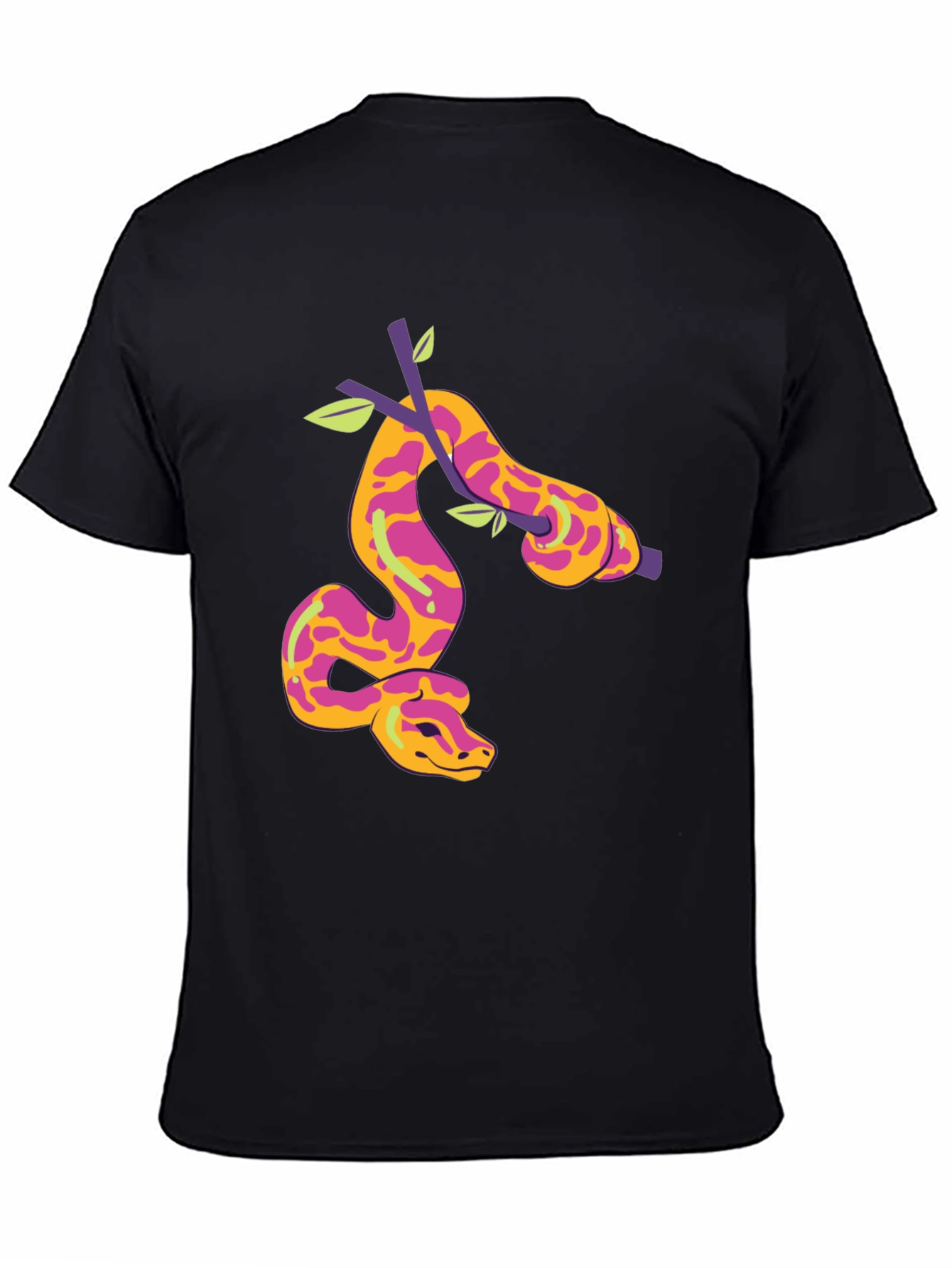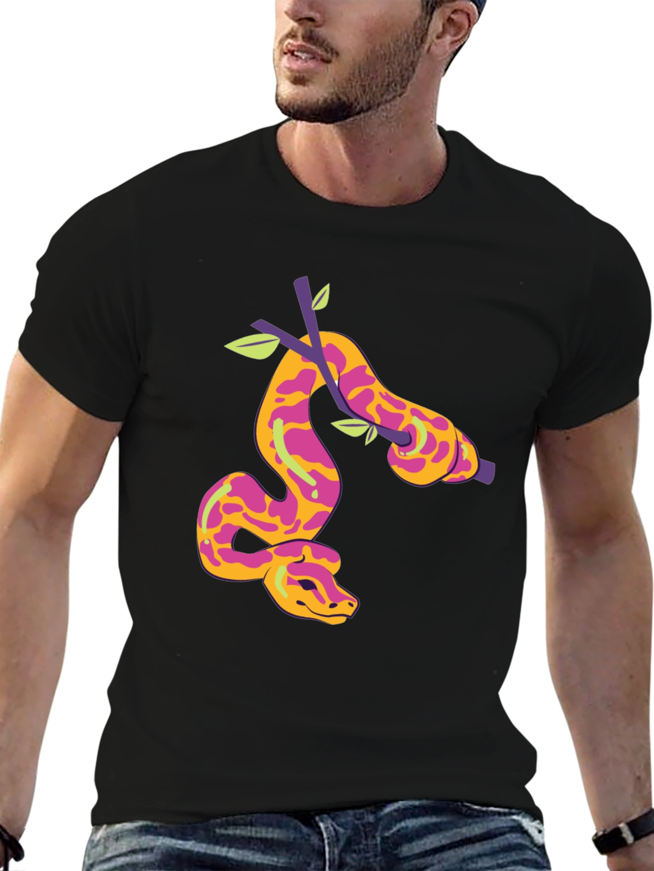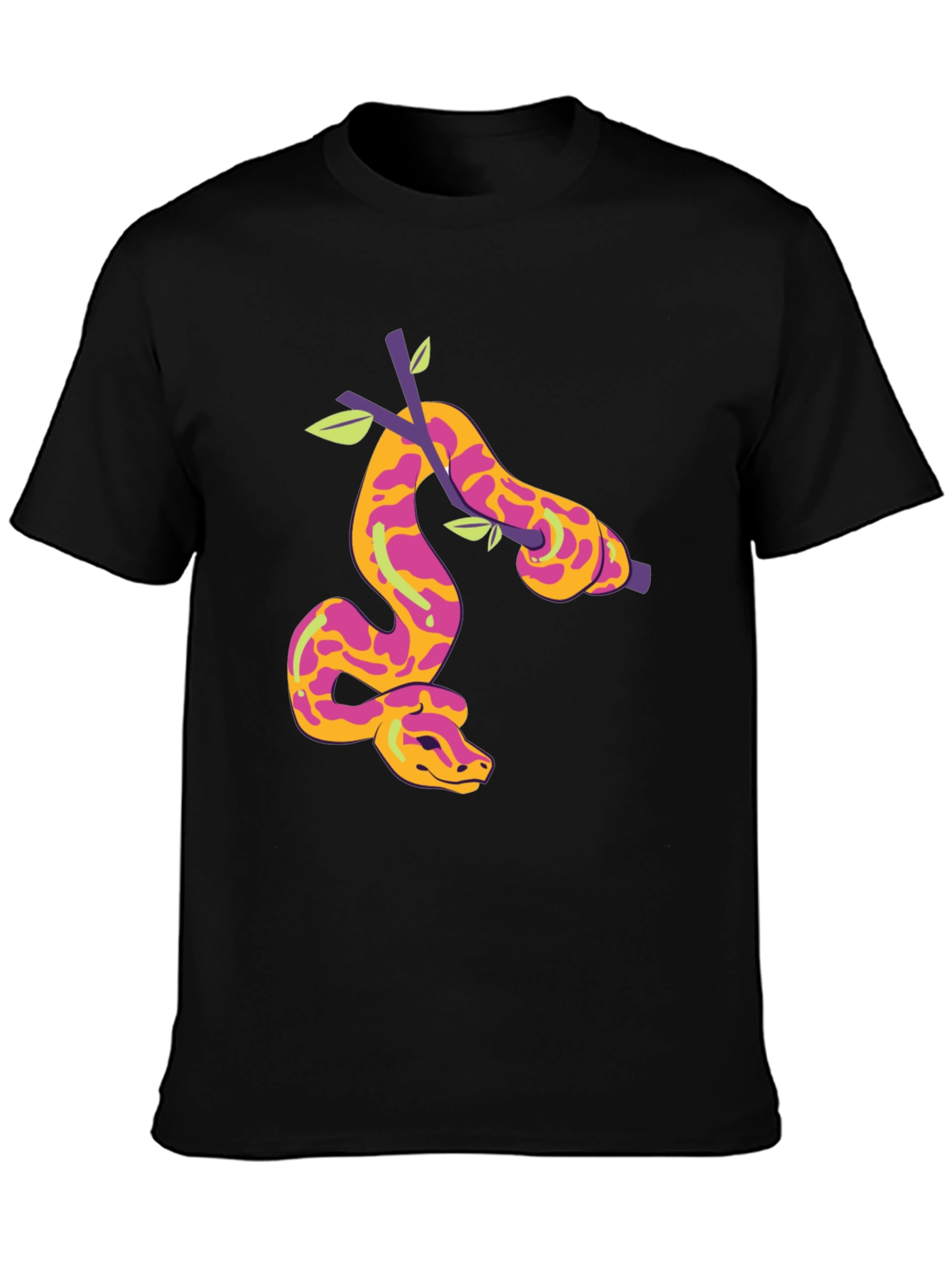 Luce esta llamativa camiseta negra con un diseño único. Presenta una serpiente estilizada en colores vibrantes como amarillo y rosa, enrollada alrededor de una rama morada con hojas verdes. El diseño llamativo y moderno añade un toque artístico y original a tu vestuario. Perfecta para quienes buscan una prenda casual con un toque de personalidad. Ideal para combinar con jeans o pantalones casuales para un look relajado pero con estilo. Muestra tu lado más audaz con esta camiseta que seguro llamará la atención.