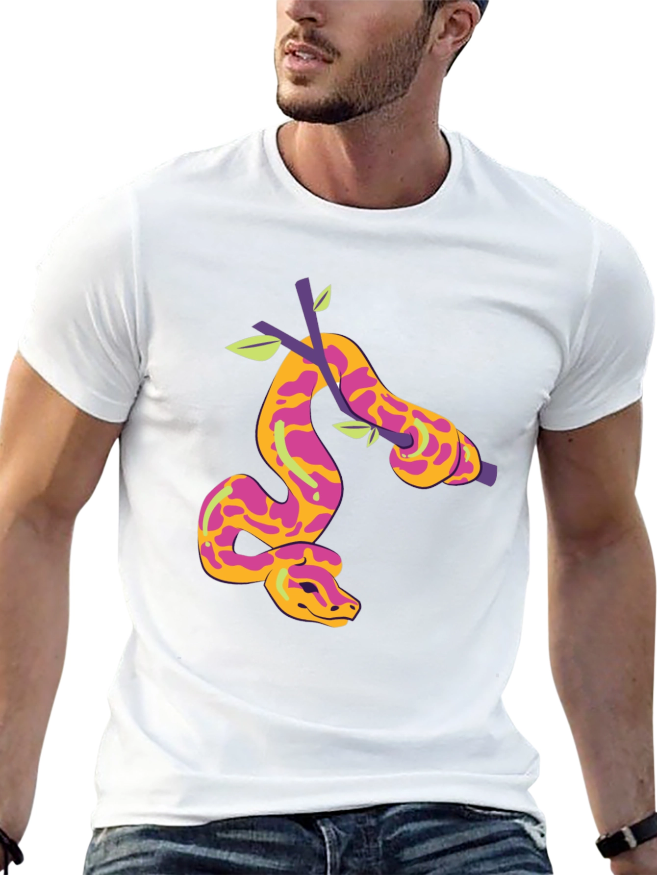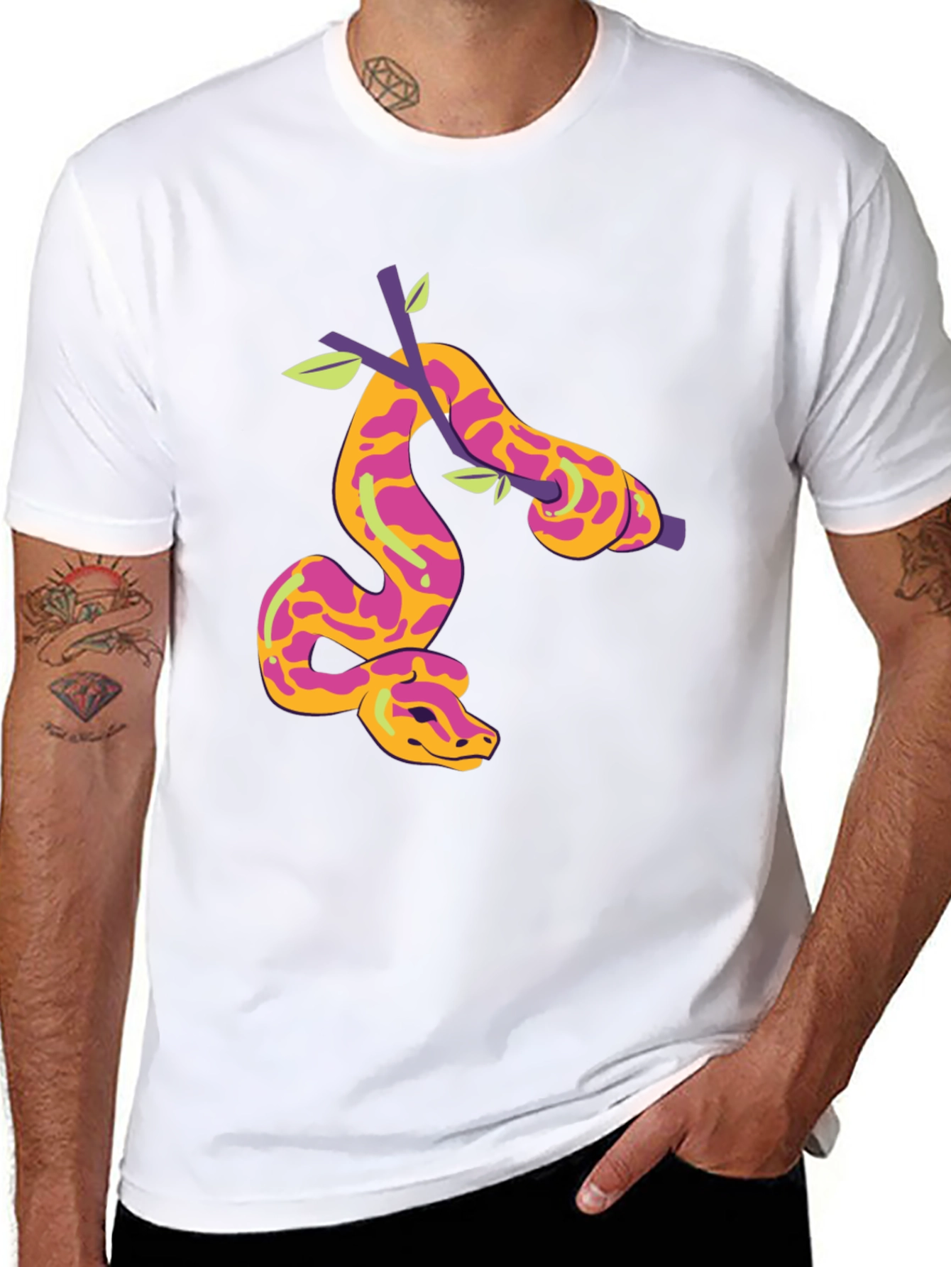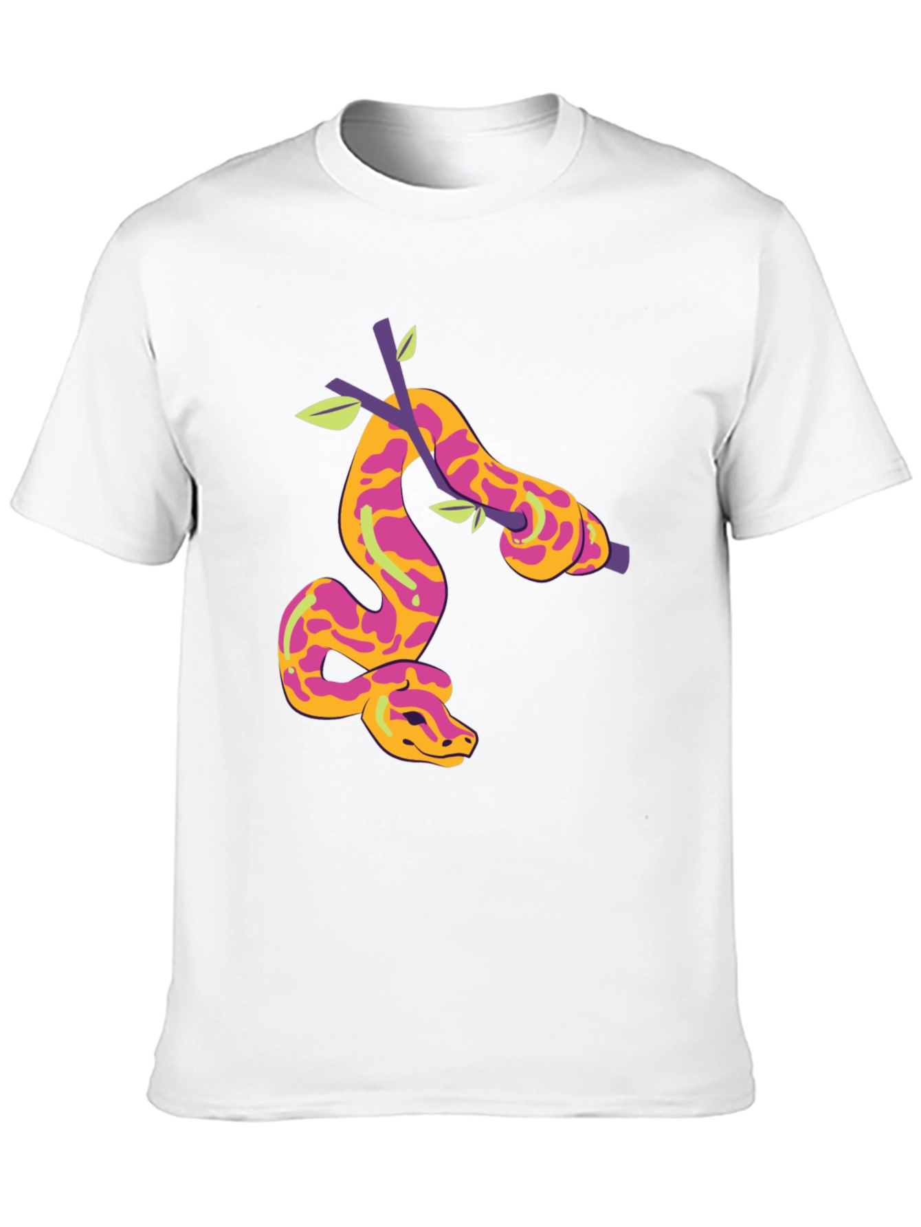 Luce esta llamativa camiseta negra con un diseño único. Presenta una serpiente estilizada en colores vibrantes como amarillo y rosa, enrollada alrededor de una rama morada con hojas verdes. El diseño llamativo y moderno añade un toque artístico y original a tu vestuario. Perfecta para quienes buscan una prenda casual con un toque de personalidad. Ideal para combinar con jeans o pantalones casuales para un look relajado pero con estilo. Muestra tu lado más audaz con esta camiseta que seguro llamará la atención.